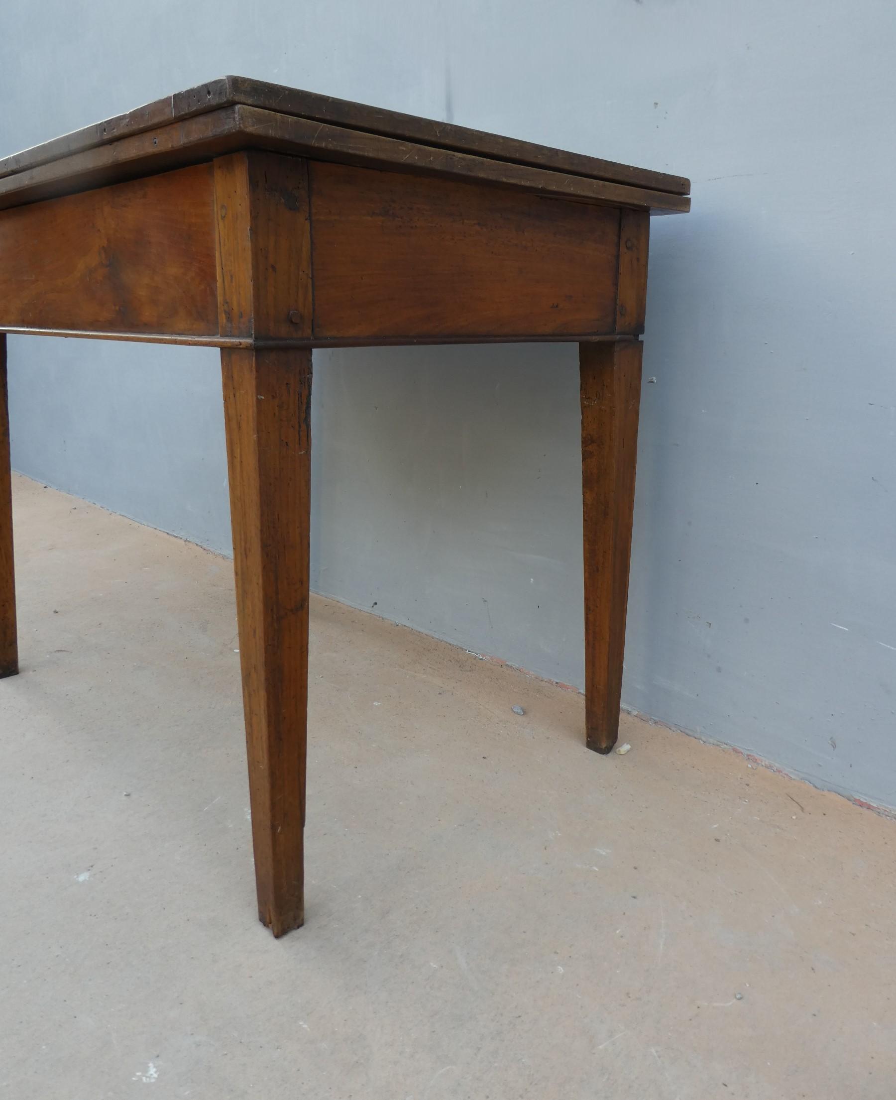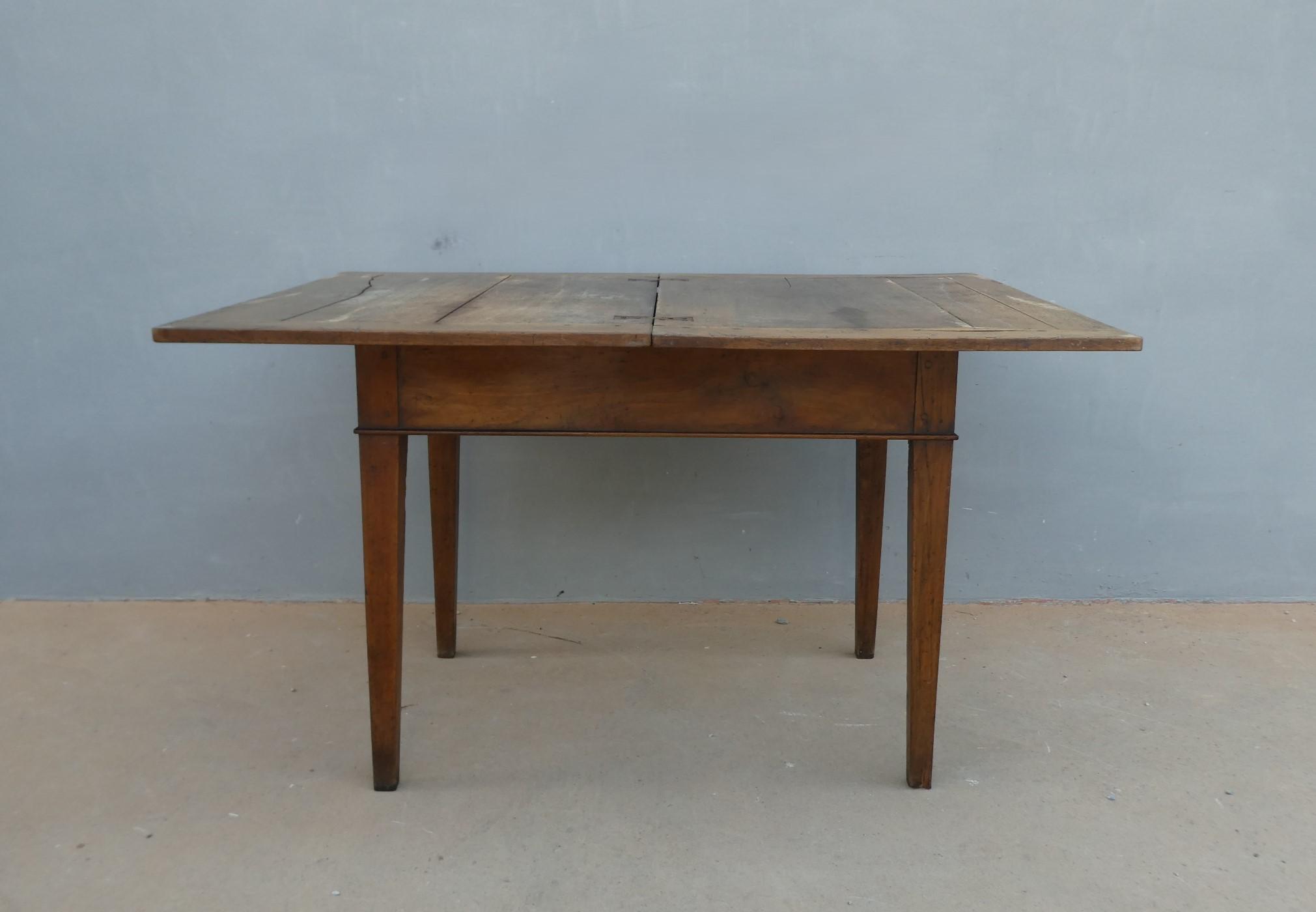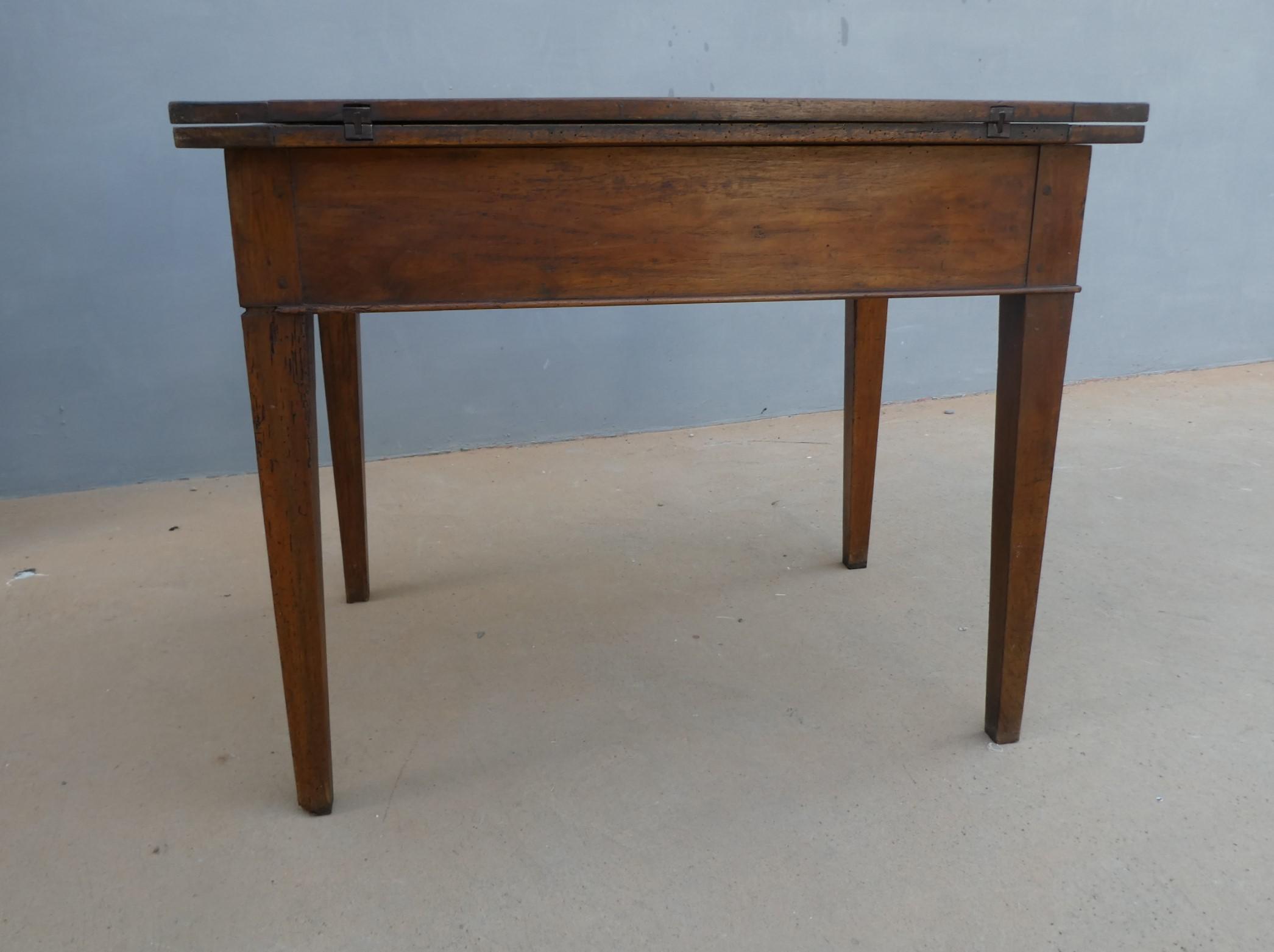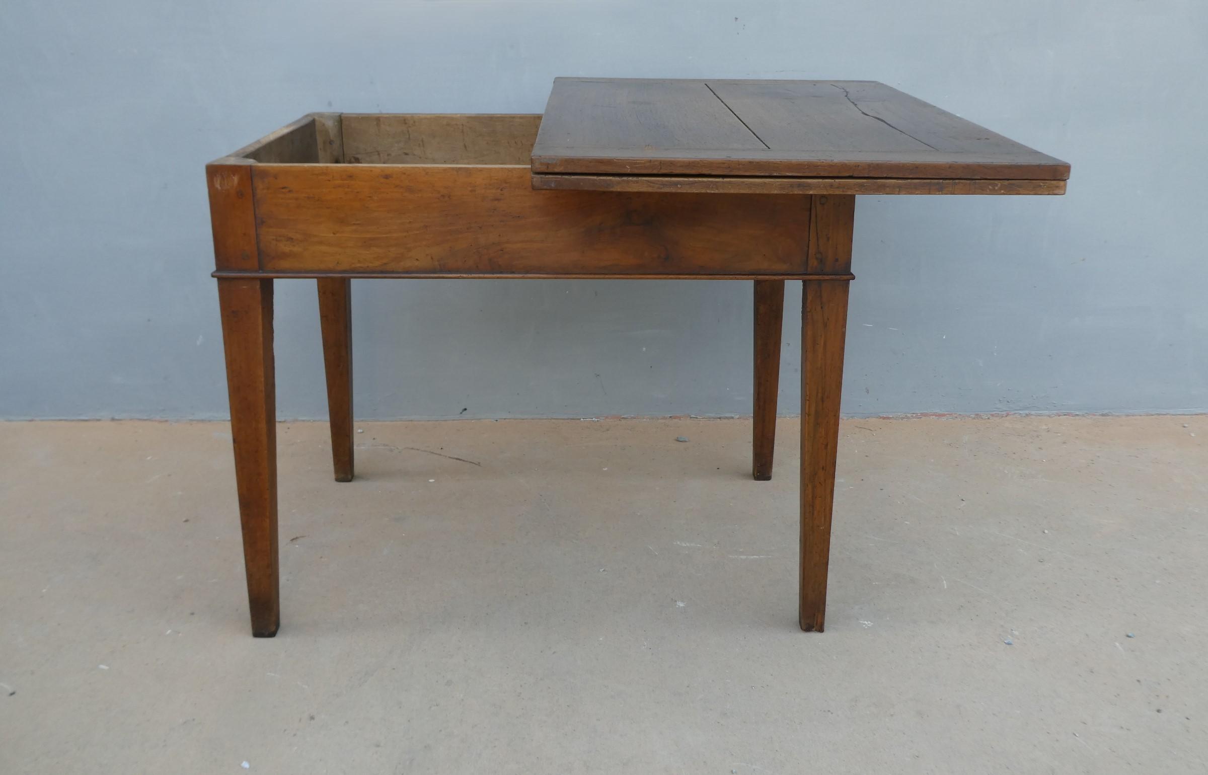Tavolo tavolino st.Luigi XVI rettangolare doppio con apertura a libro, realizzato in noce massello ed appartenente d’epoca all’800. Il mobile è studiato in modo tale che, ruotando la plancia (vedi foto), e aprendola fino a farla appoggiare alla base sottostante, si allunghi raddoppiando in larghezza la superficie d’appoggio. Necessita di alcuni interventi di restauro – sono presenti fori di tarlo.
