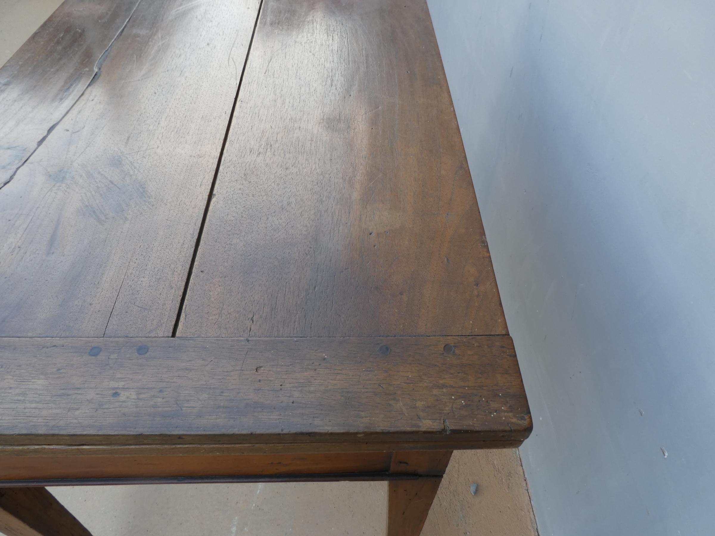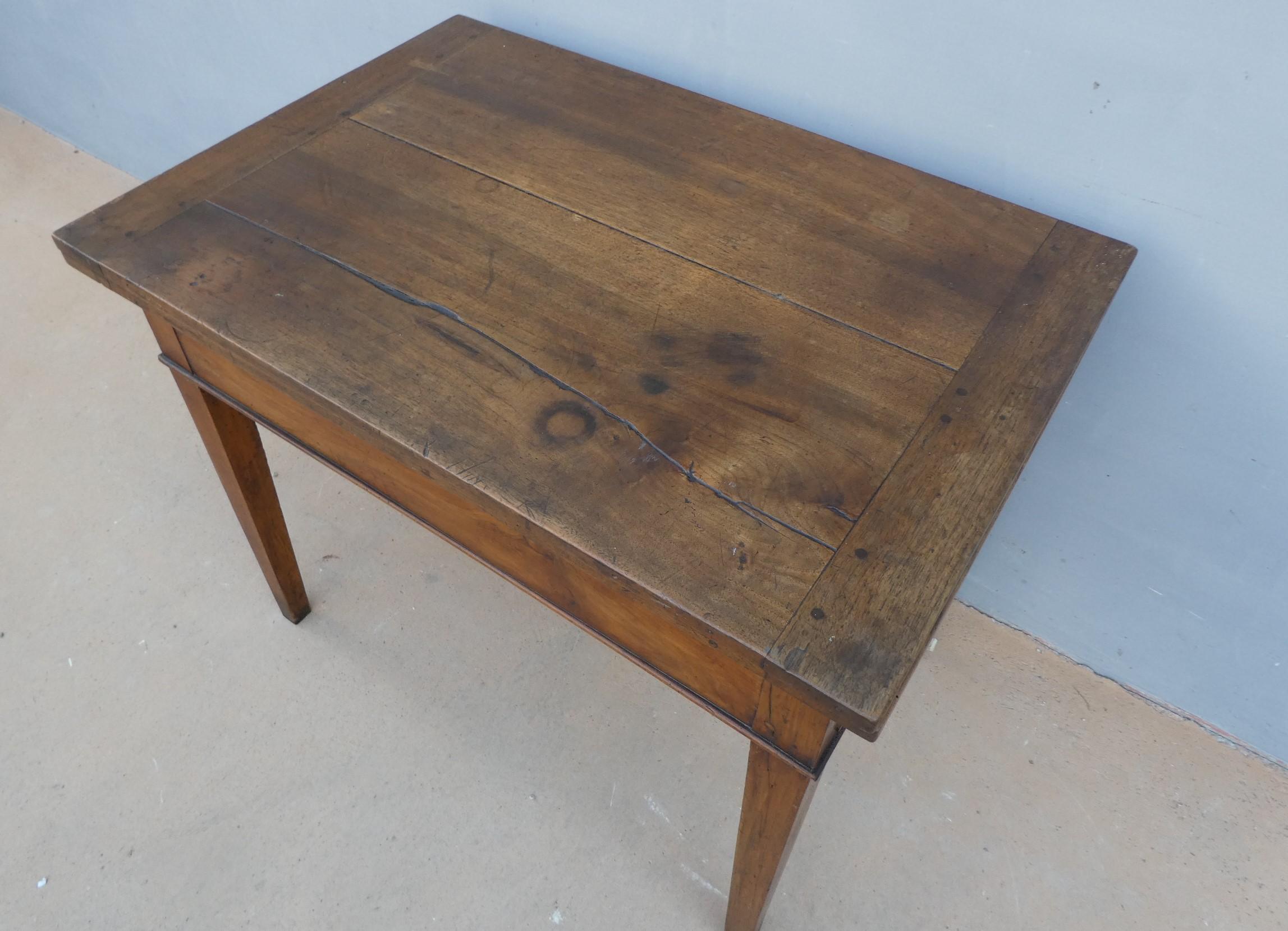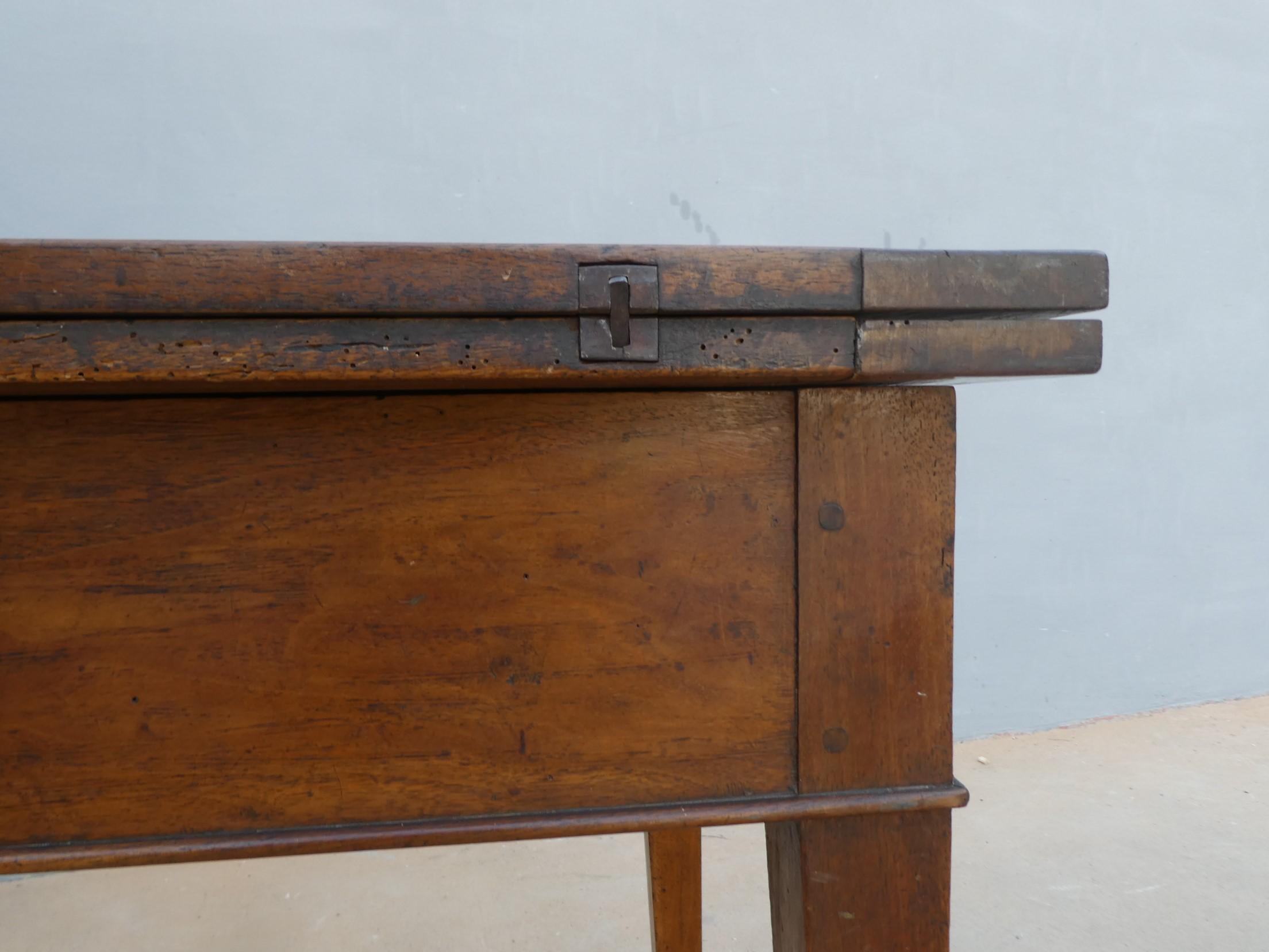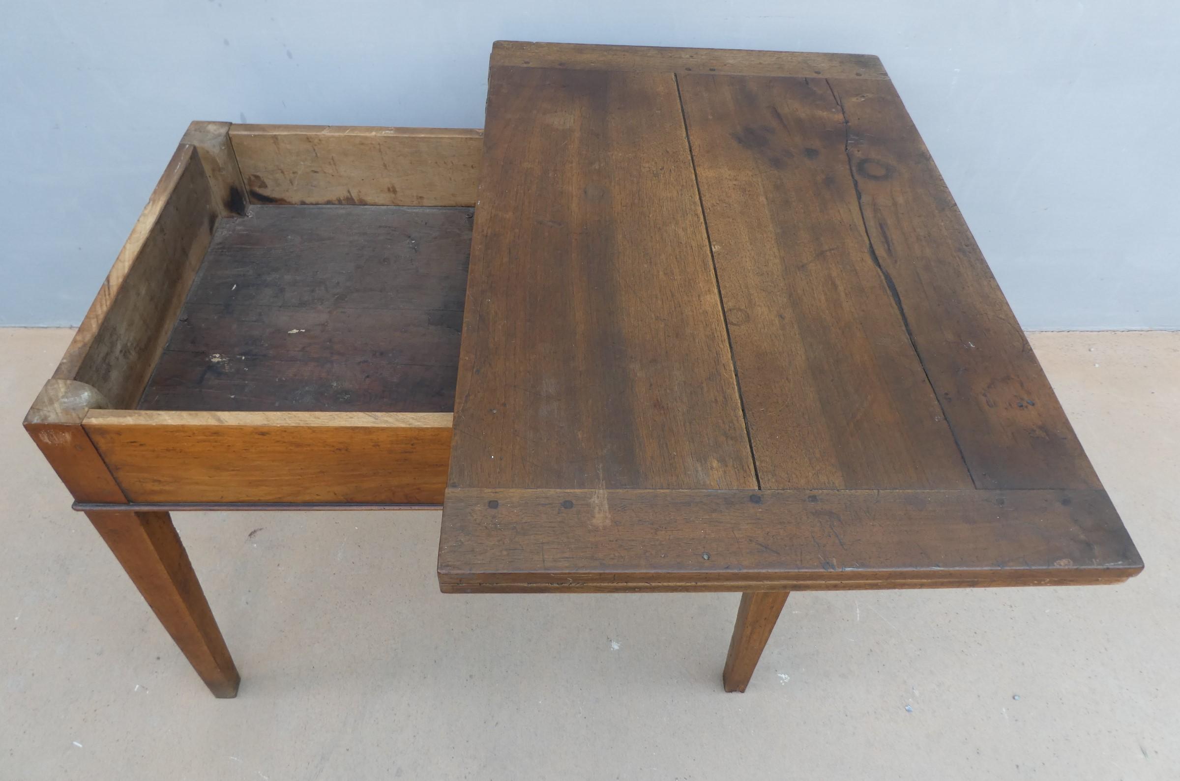 Tavolo tavolino st.Luigi XVI rettangolare doppio con apertura a libro, realizzato in noce massello ed appartenente d’epoca all’800. Il mobile è studiato in modo tale che, ruotando la plancia (vedi foto), e aprendola fino a farla appoggiare alla base sottostante, si allunghi raddoppiando in larghezza la superficie d’appoggio. Necessita di alcuni interventi di restauro – sono presenti fori di tarlo.