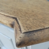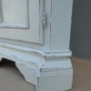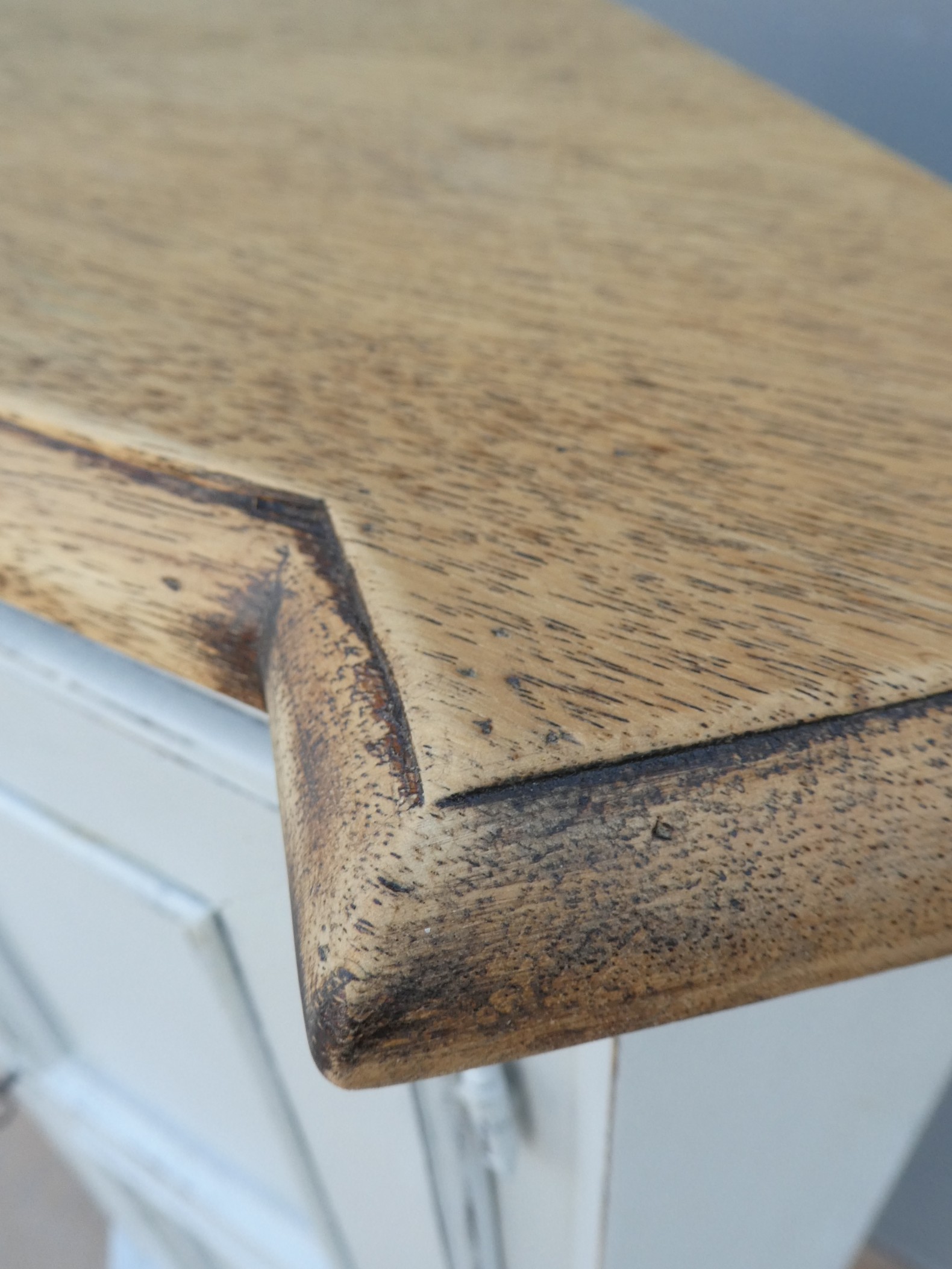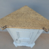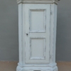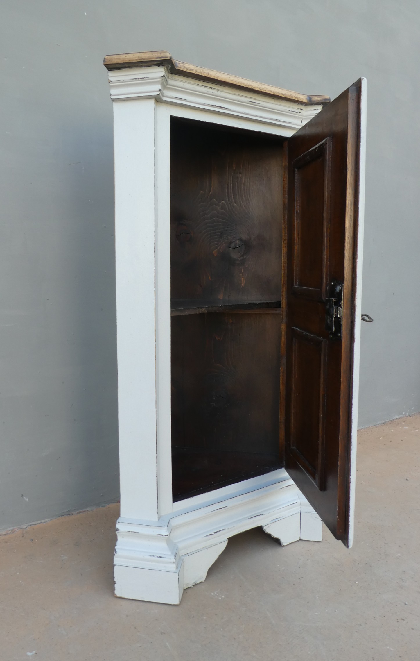 Angoliera mobile ad angolo ad un’anta realizzata con il top a legno naturale e la base laccata e rifinita con la tecnica “Shabby Chic”. La semplice struttura conferisce una sobria eleganza. La ricerca di un decoro essenziale si riflette anche sulla scelta dei montanti, privi di elementi decorativi. All’interno dispone di un ripiano. Appartenente d’epoca alla seconda metà del ‘900.