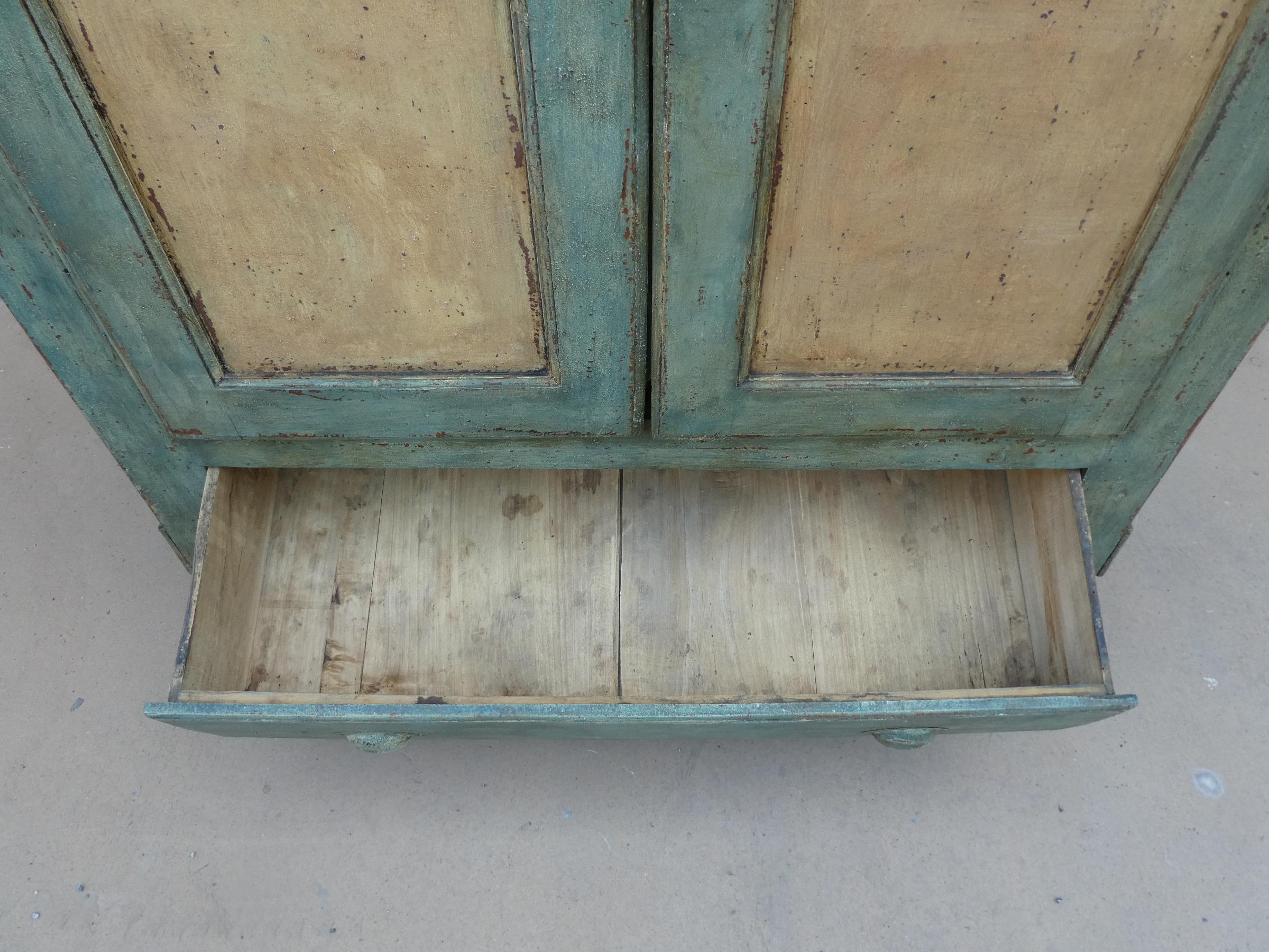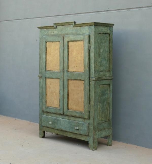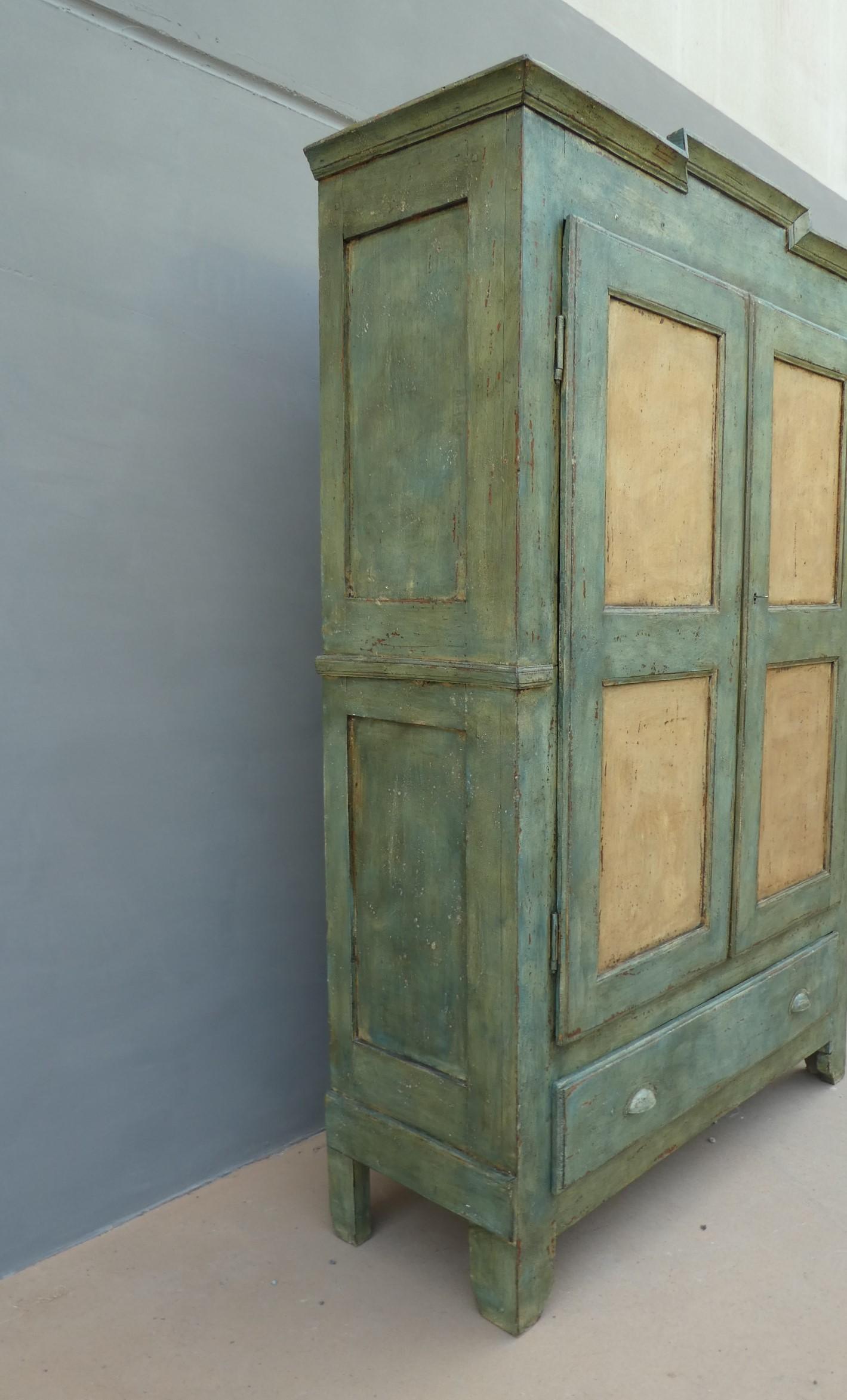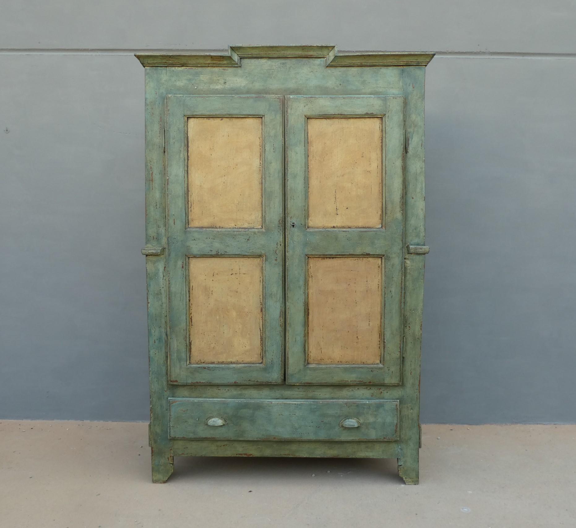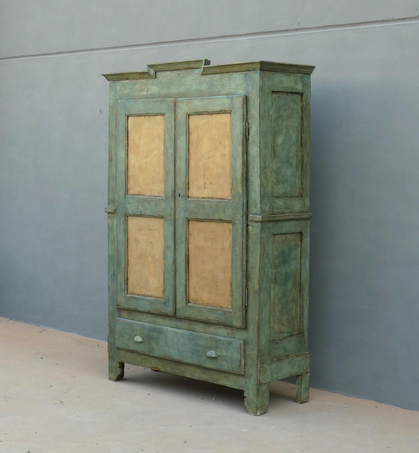 Antico armadio stipo piemontese fornito di due ante ed un cassetto frontale, realizzato in legno massello e, recentemente, laccato bicolore e rifinito con la tecnica “Shabby Chic”. La semplice e lineare struttura conferisce una sobria eleganza. La ricerca di un decoro essenziale si riflette anche sulla scelta dei montanti, privi di elementi decorativi. Divisibile in due corpi e all’interno dispone di una barra appendiabiti. Sono presenti fori di tarlo. Epoca metà ‘800.