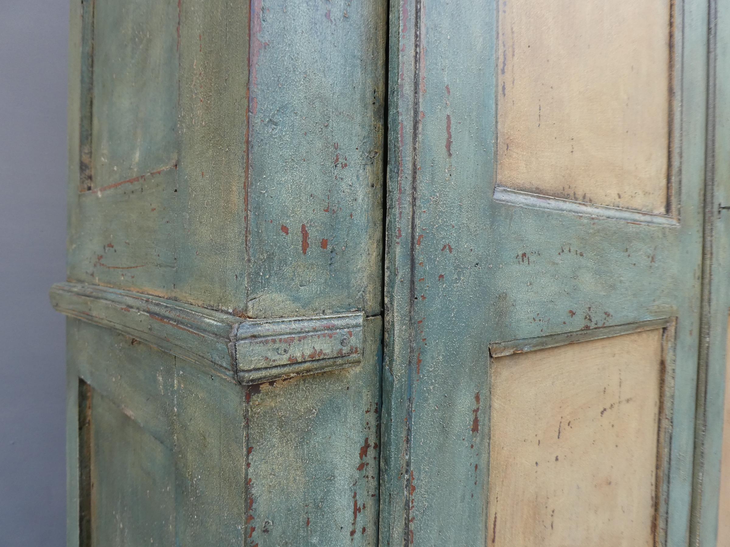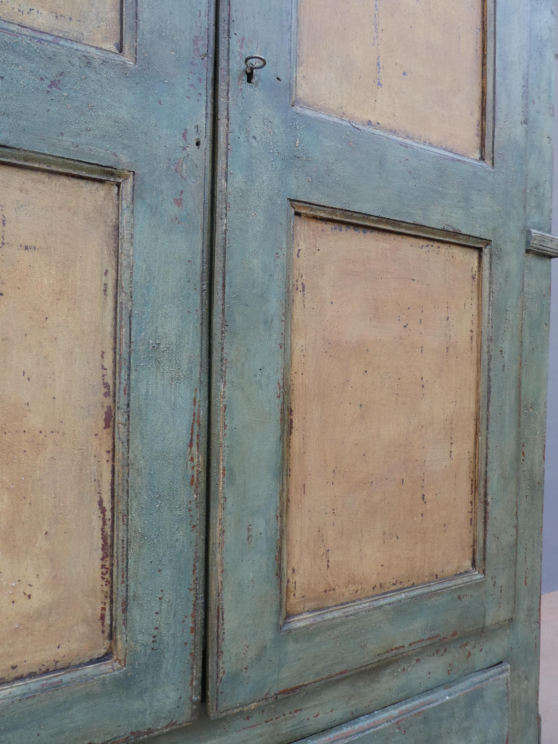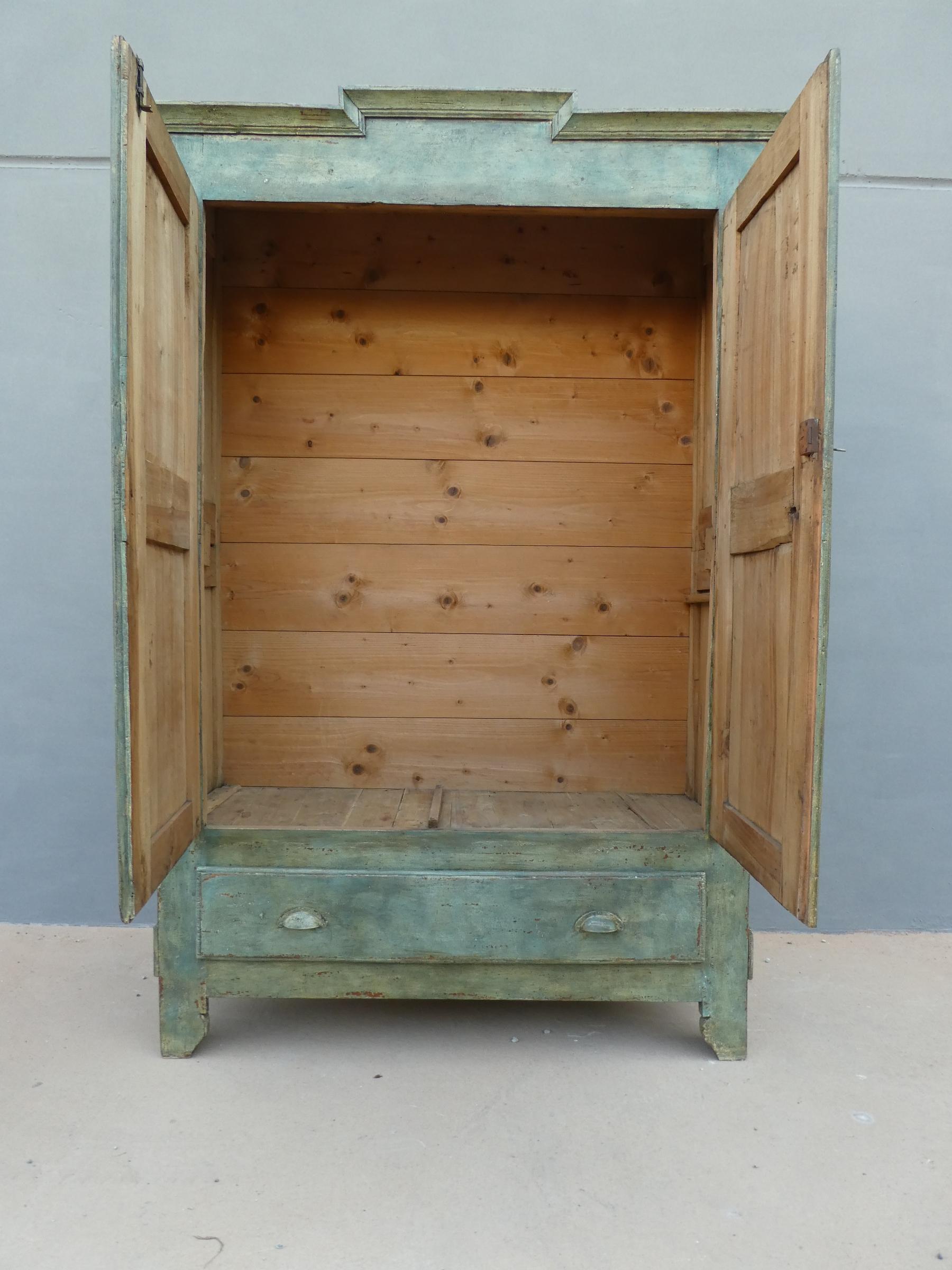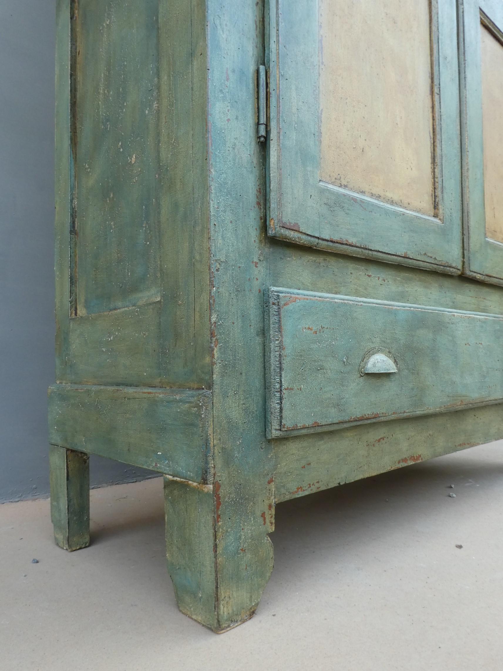 Antico armadio stipo piemontese fornito di due ante ed un cassetto frontale, realizzato in legno massello e, recentemente, laccato bicolore e rifinito con la tecnica “Shabby Chic”. La semplice e lineare struttura conferisce una sobria eleganza. La ricerca di un decoro essenziale si riflette anche sulla scelta dei montanti, privi di elementi decorativi. Divisibile in due corpi e all’interno dispone di una barra appendiabiti. Sono presenti fori di tarlo. Epoca metà ‘800.