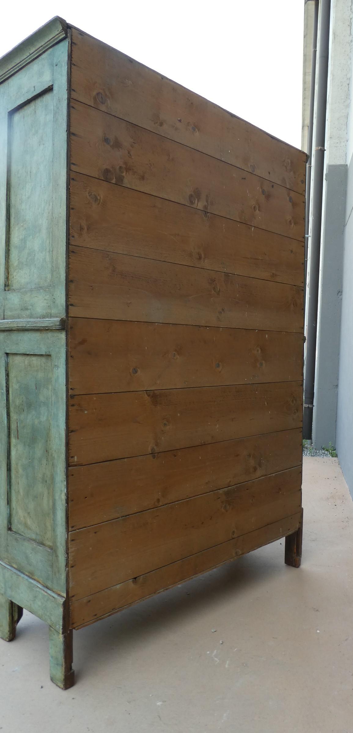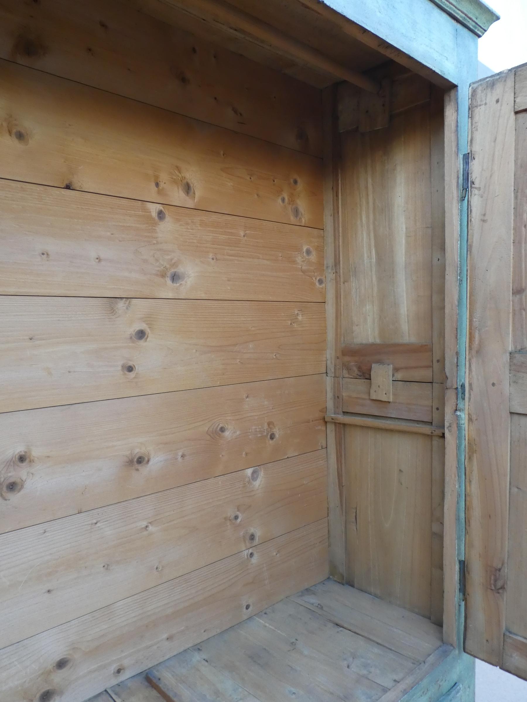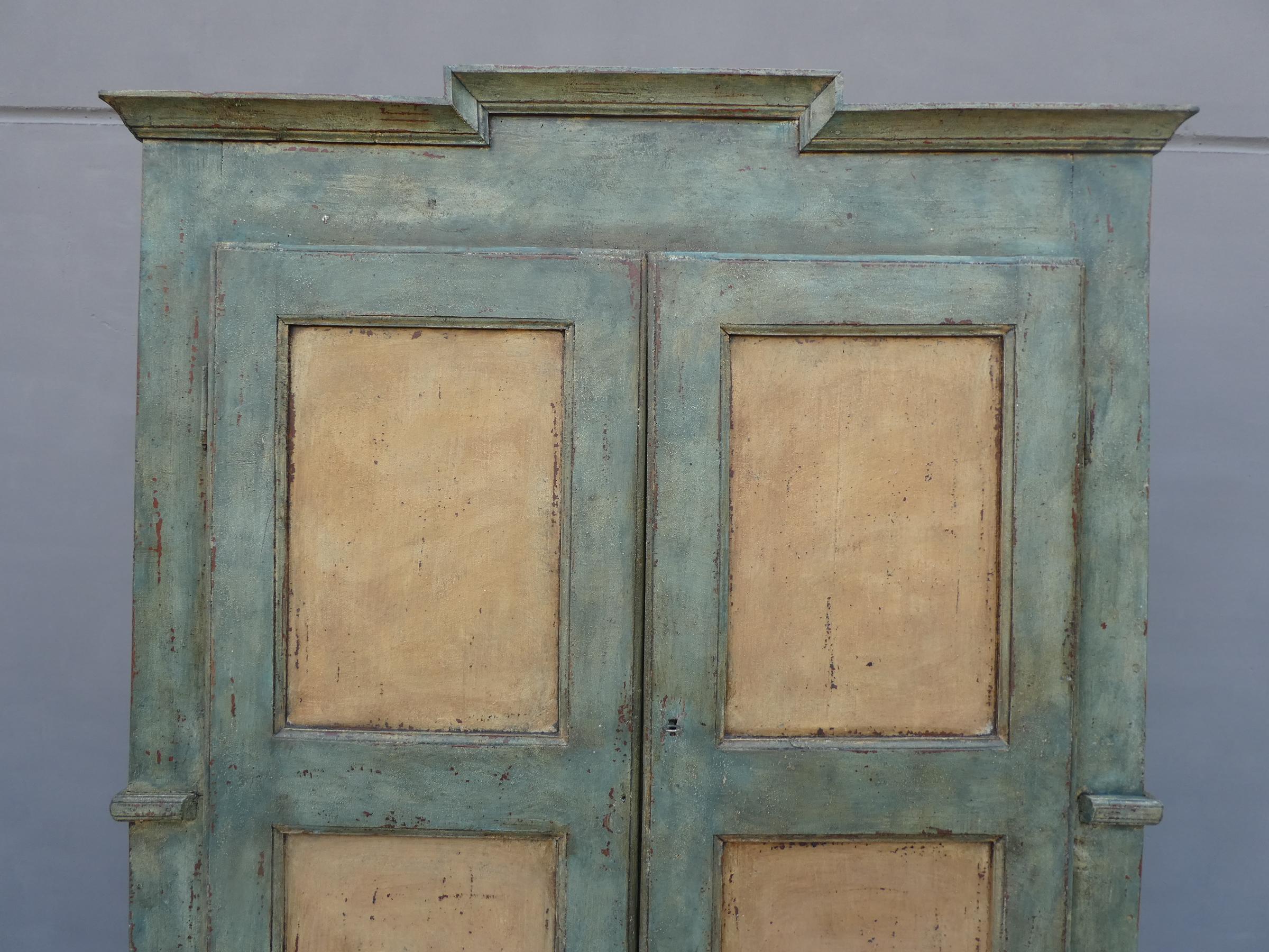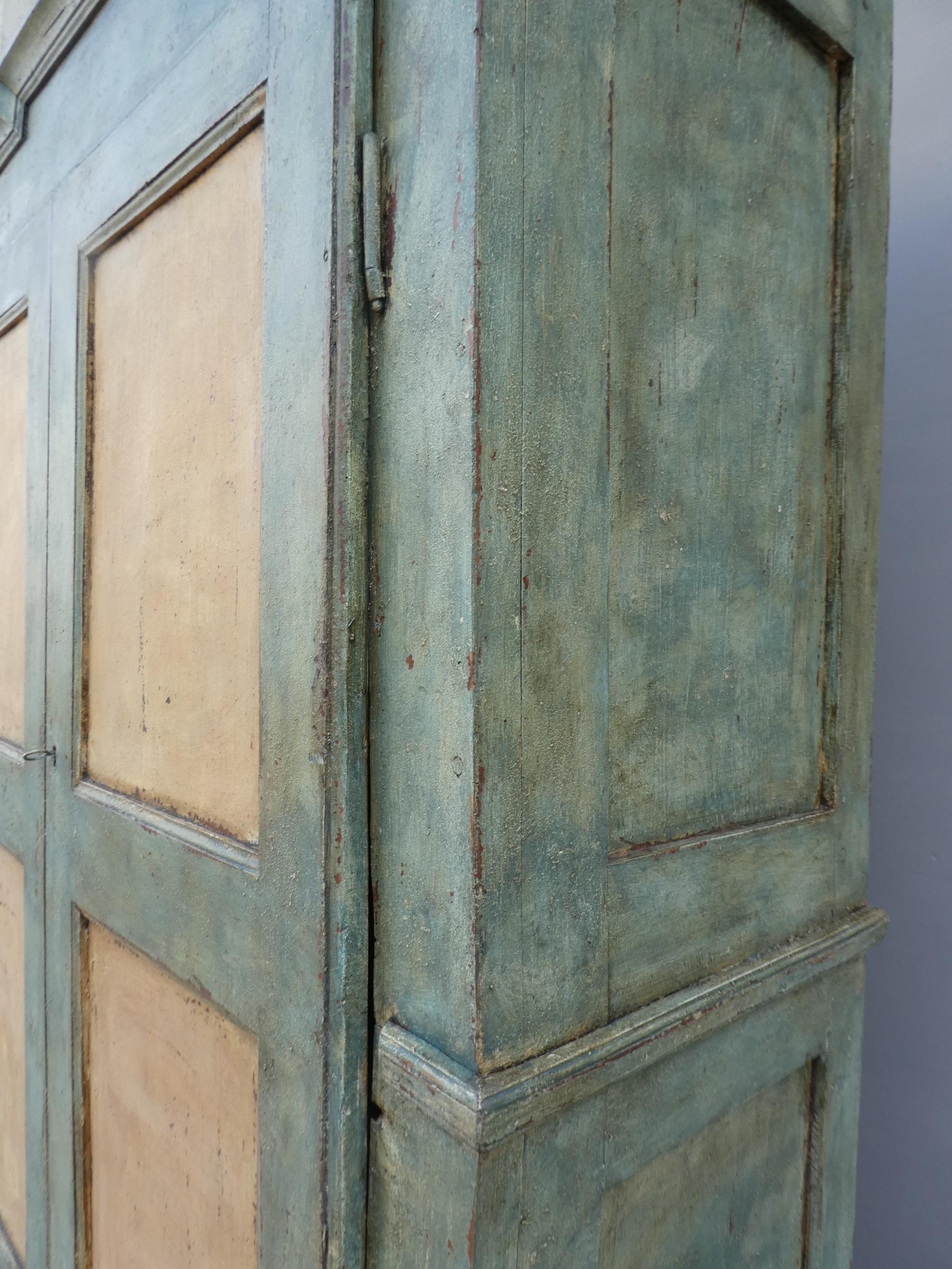 Antico armadio stipo piemontese fornito di due ante ed un cassetto frontale, realizzato in legno massello e, recentemente, laccato bicolore e rifinito con la tecnica “Shabby Chic”. La semplice e lineare struttura conferisce una sobria eleganza. La ricerca di un decoro essenziale si riflette anche sulla scelta dei montanti, privi di elementi decorativi. Divisibile in due corpi e all’interno dispone di una barra appendiabiti. Sono presenti fori di tarlo. Epoca metà ‘800.
