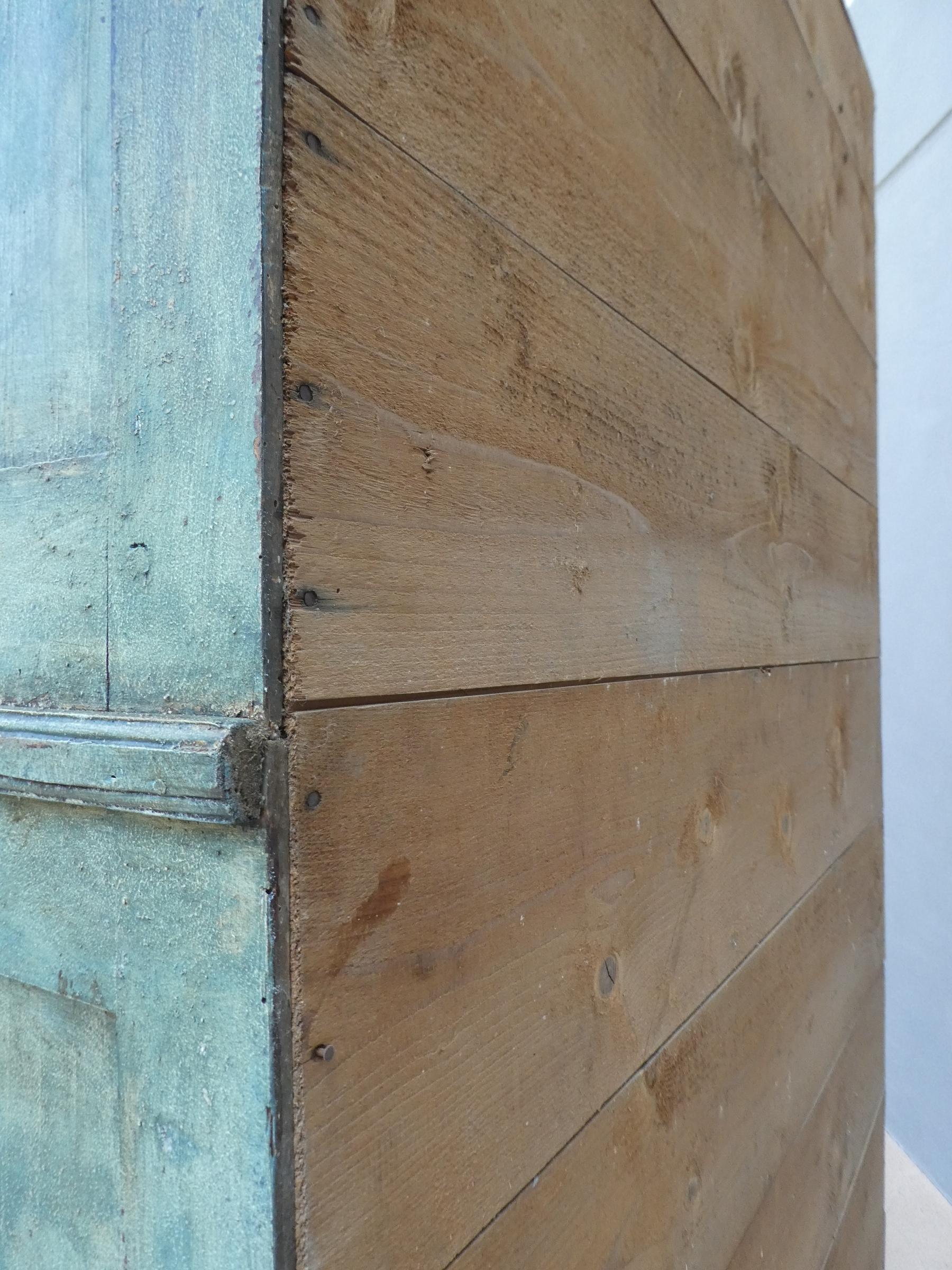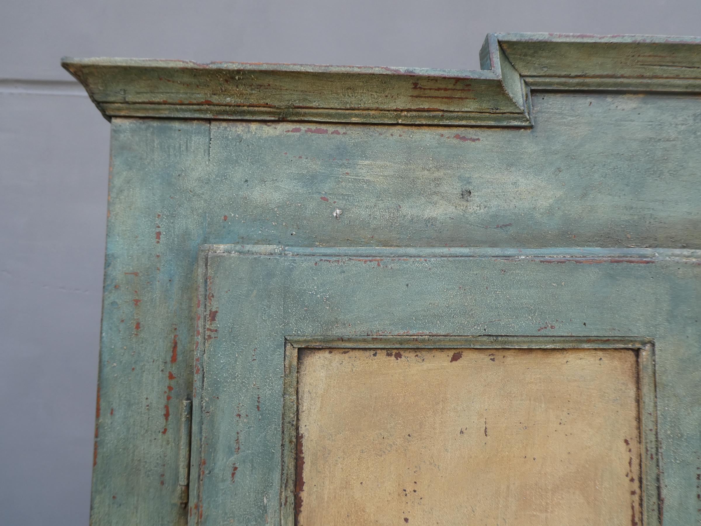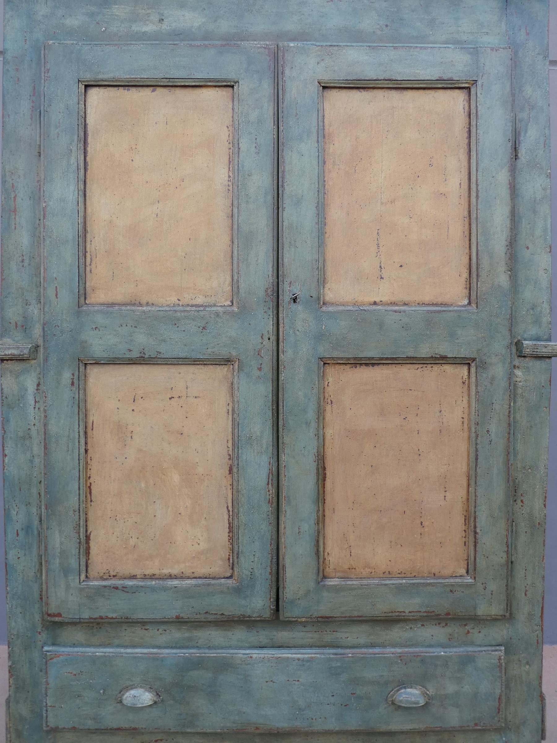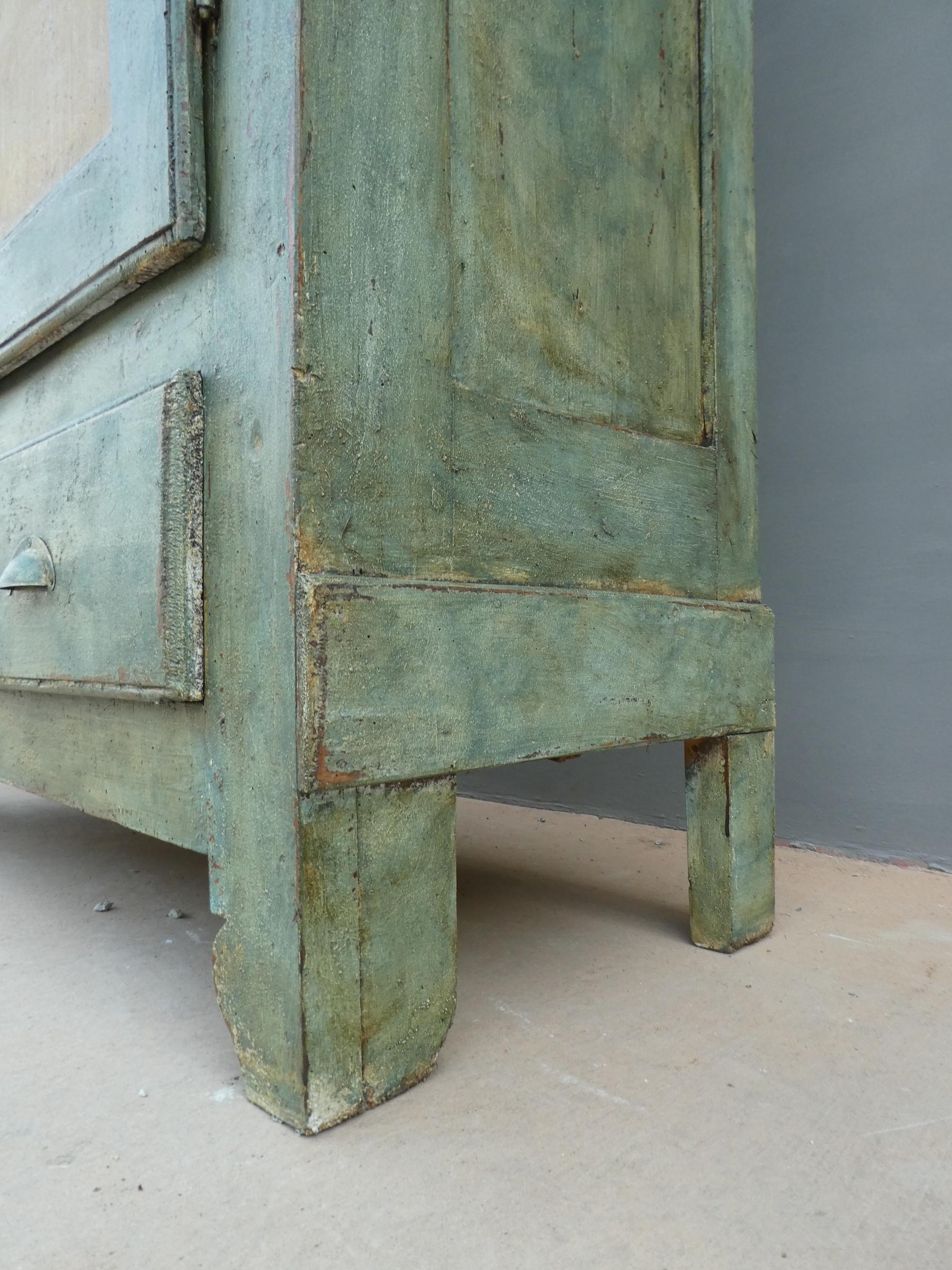 Antico armadio stipo piemontese fornito di due ante ed un cassetto frontale, realizzato in legno massello e, recentemente, laccato bicolore e rifinito con la tecnica “Shabby Chic”. La semplice e lineare struttura conferisce una sobria eleganza. La ricerca di un decoro essenziale si riflette anche sulla scelta dei montanti, privi di elementi decorativi. Divisibile in due corpi e all’interno dispone di una barra appendiabiti. Sono presenti fori di tarlo. Epoca metà ‘800.