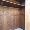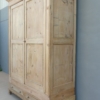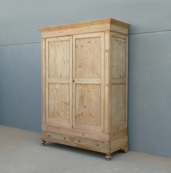 Armadio piemontese corredato da due ante e due cassetti frontali, realizzato in legno di abete ed appartenente d’epoca alla fine dell’800. La lineare e maestosa struttura conferisce una sobria eleganza. La ricerca di un decoro essenziale si riflette anche sui montanti, privi di elementi decorativi. All’interno dispone di una barra appendiabiti ed un ripiano. Interamente smontabile. Necessita di leggeri interventi di restauro e sono presenti piccoli fori di tarlo.
