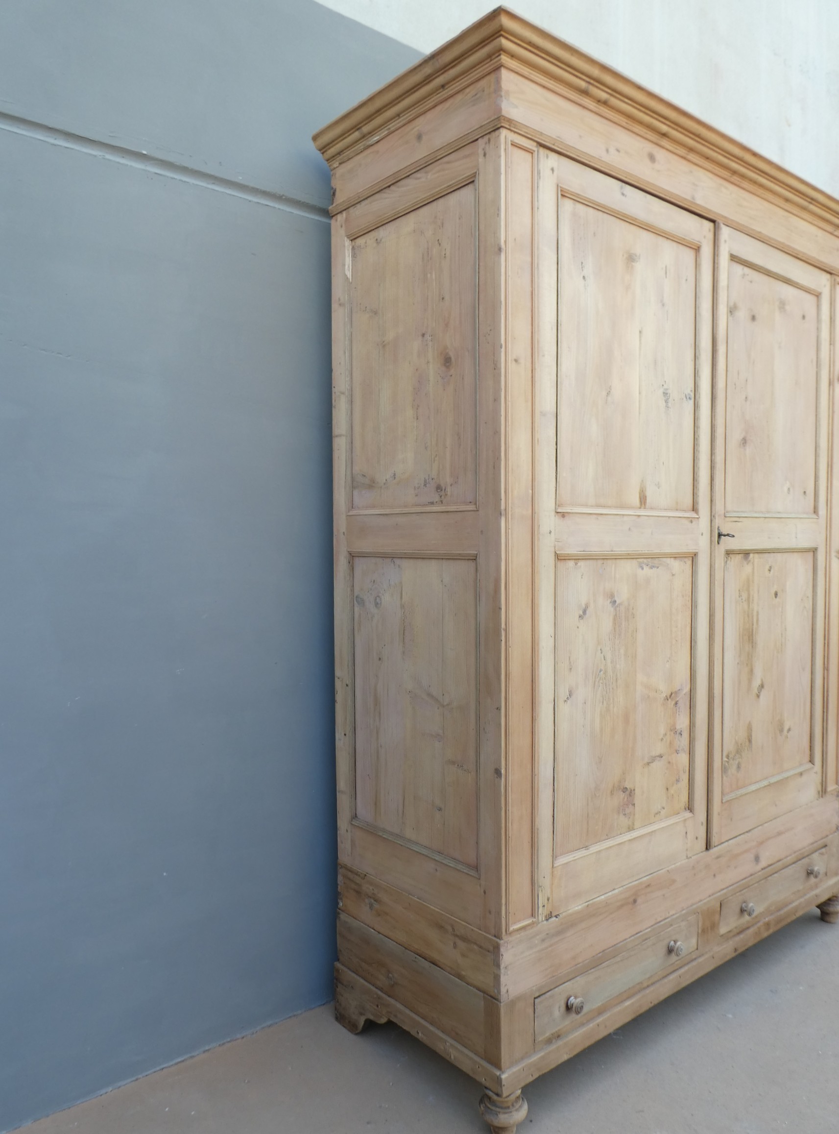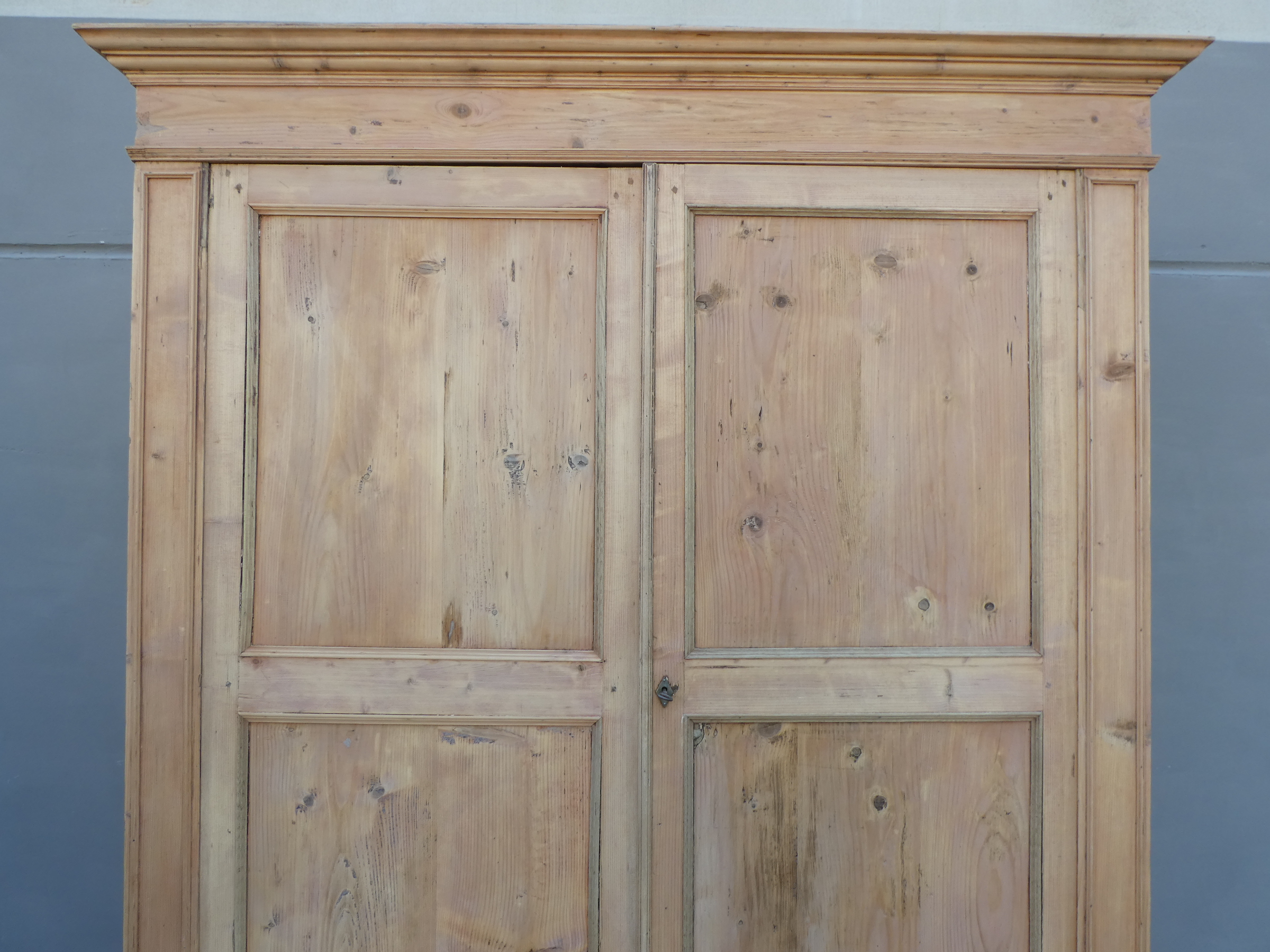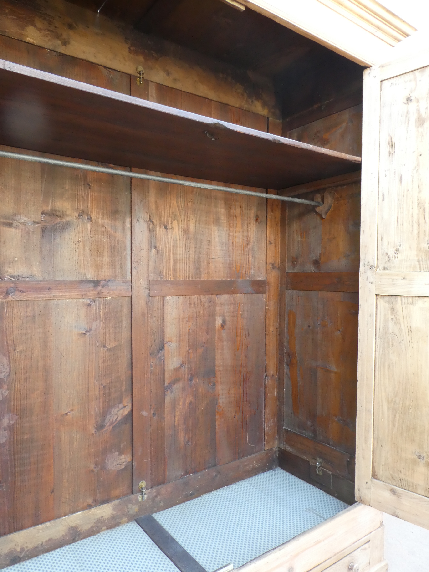 Armadio piemontese corredato da due ante e due cassetti frontali, realizzato in legno di abete ed appartenente d’epoca alla fine dell’800. La lineare e maestosa struttura conferisce una sobria eleganza. La ricerca di un decoro essenziale si riflette anche sui montanti, privi di elementi decorativi. All’interno dispone di una barra appendiabiti ed un ripiano. Interamente smontabile. Necessita di leggeri interventi di restauro e sono presenti piccoli fori di tarlo.