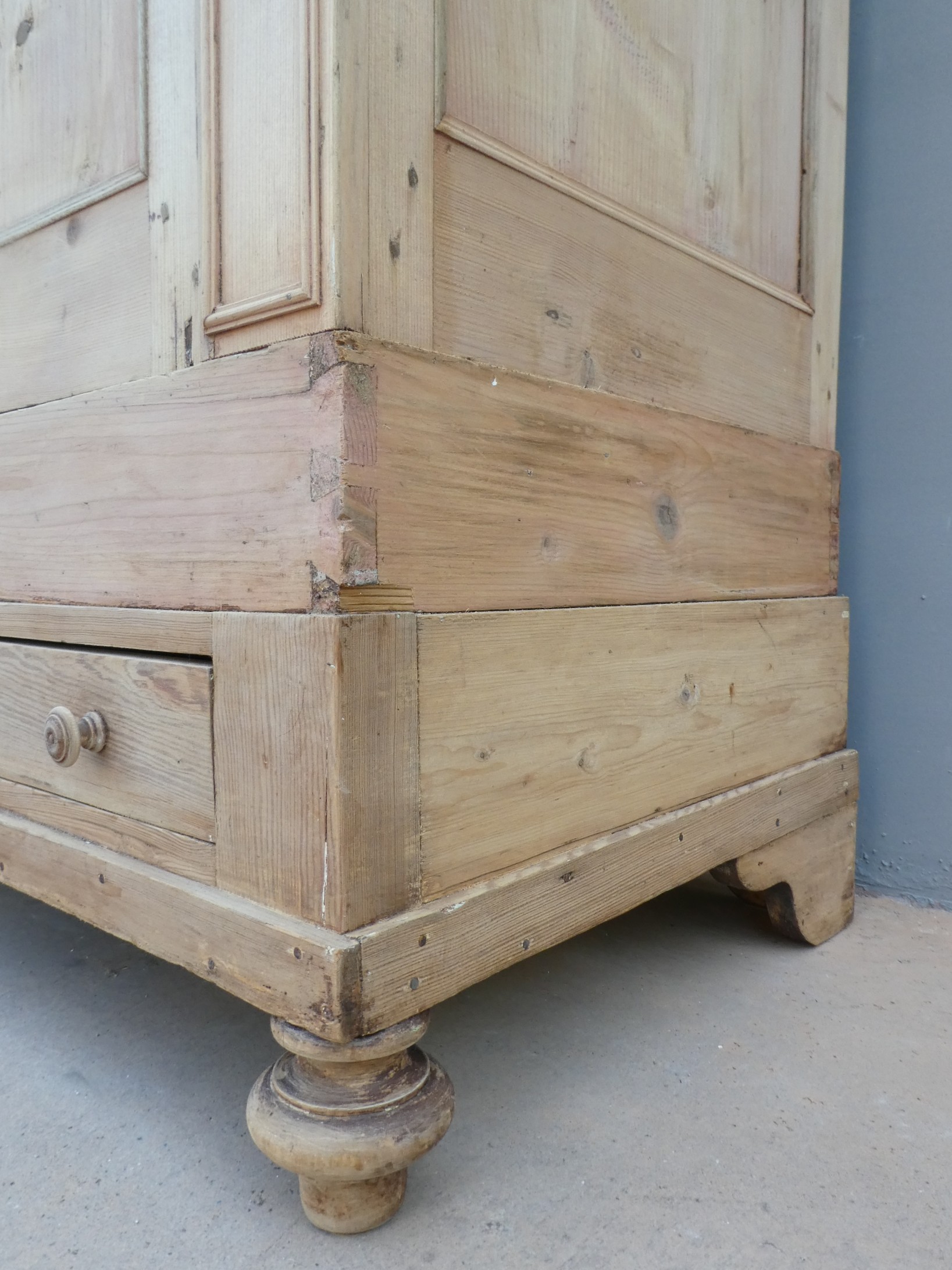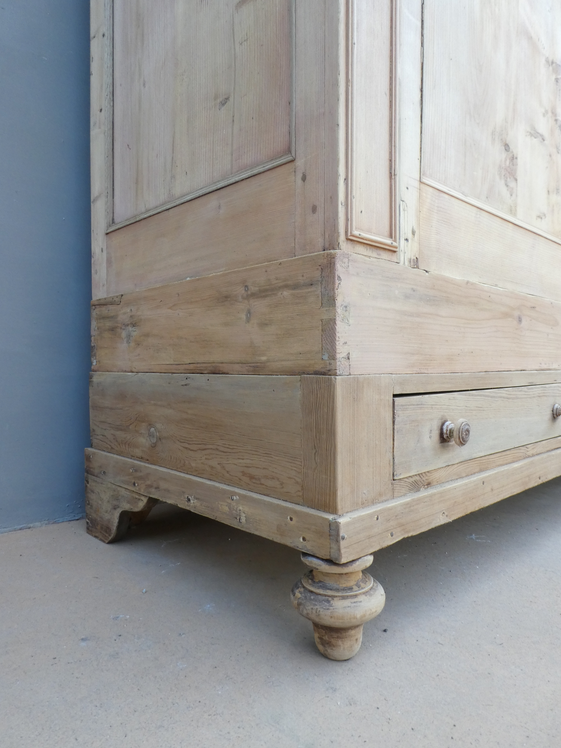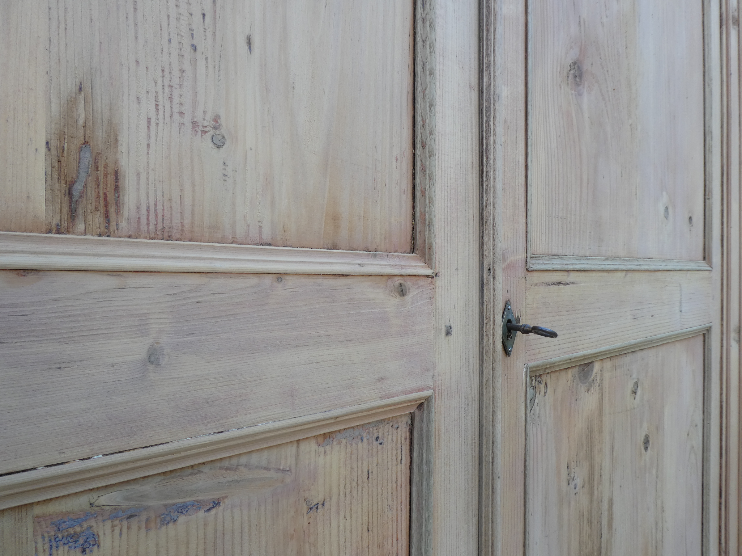 Armadio piemontese corredato da due ante e due cassetti frontali, realizzato in legno di abete ed appartenente d’epoca alla fine dell’800. La lineare e maestosa struttura conferisce una sobria eleganza. La ricerca di un decoro essenziale si riflette anche sui montanti, privi di elementi decorativi. All’interno dispone di una barra appendiabiti ed un ripiano. Interamente smontabile. Necessita di leggeri interventi di restauro e sono presenti piccoli fori di tarlo.