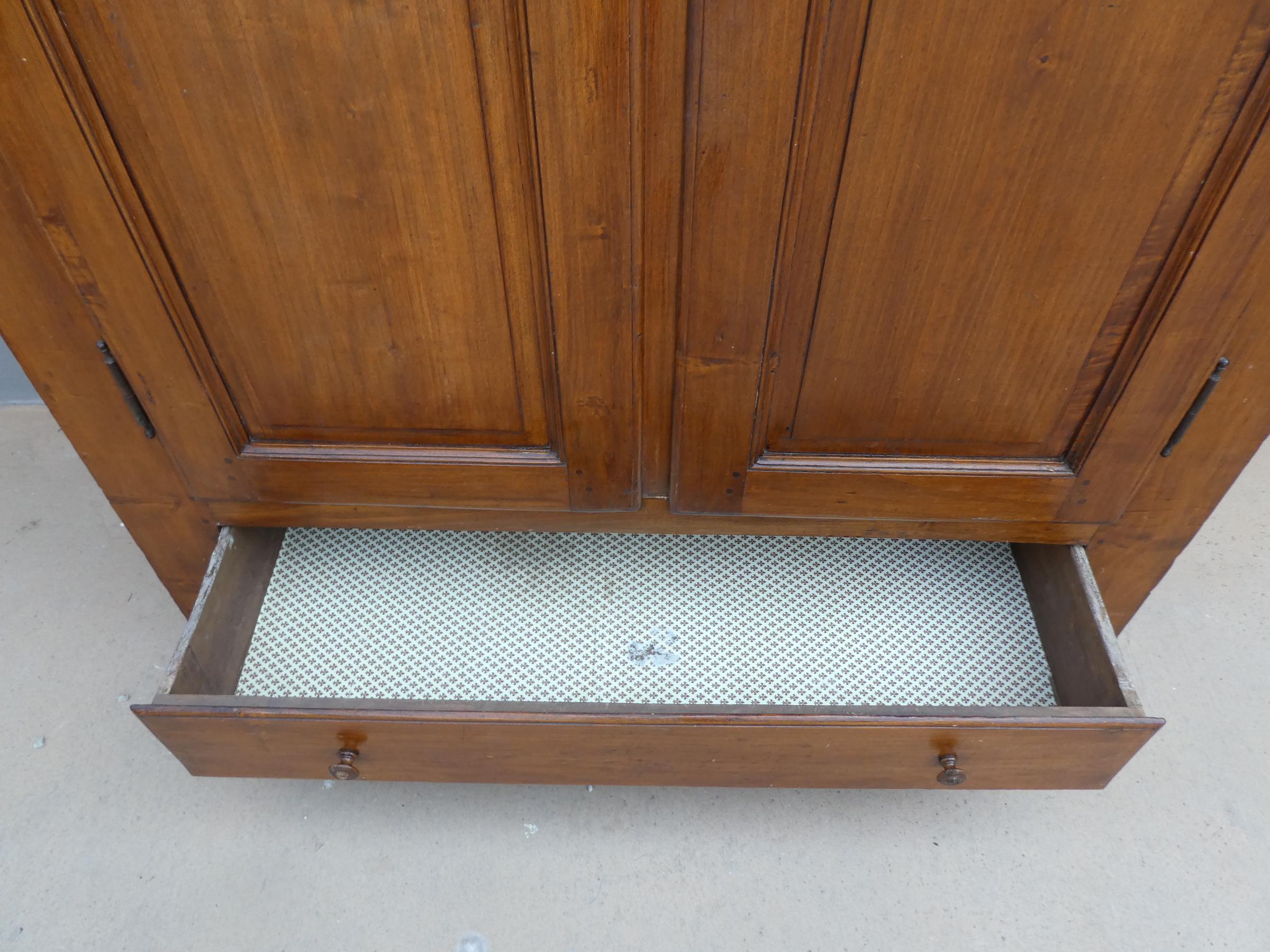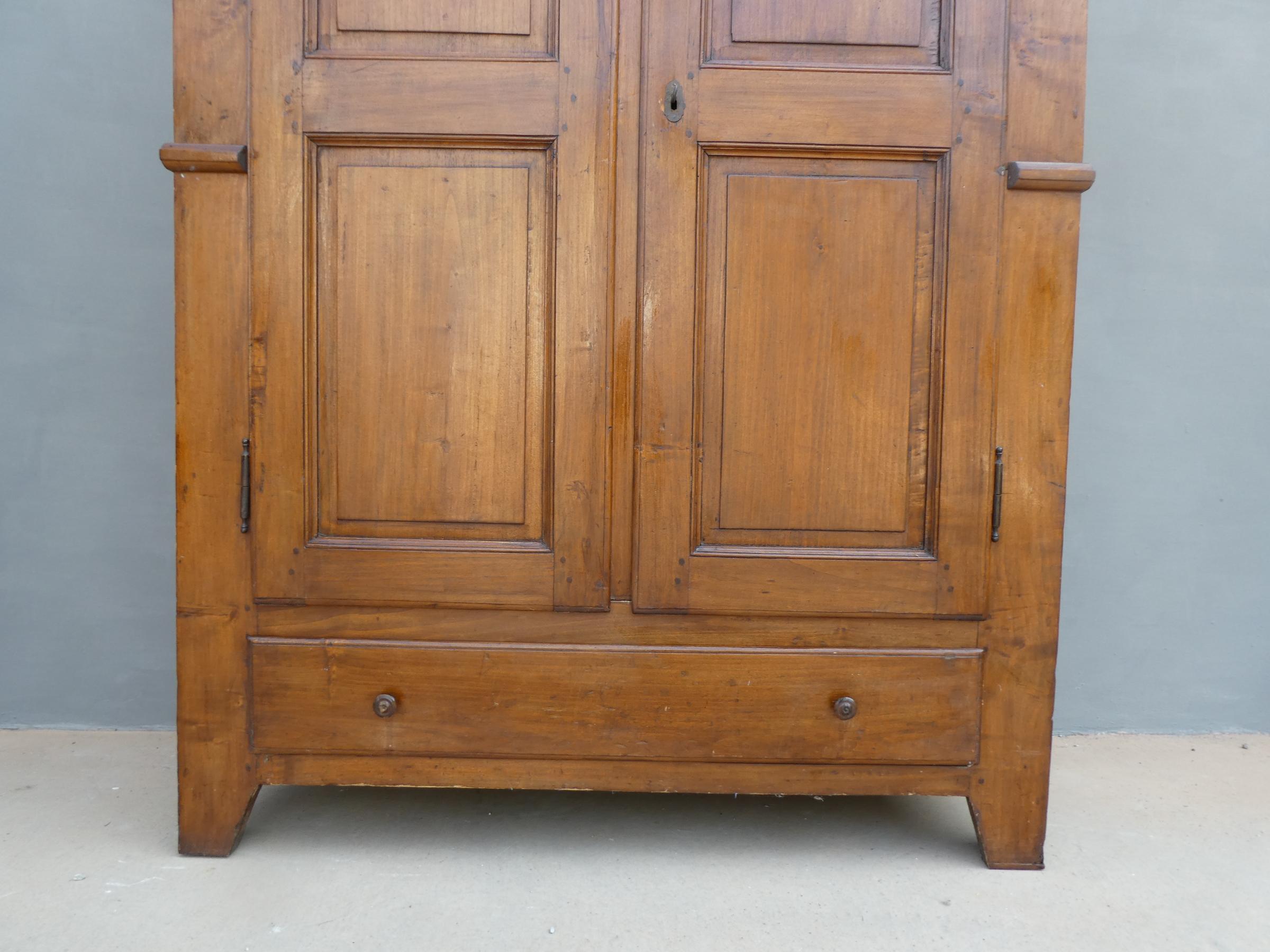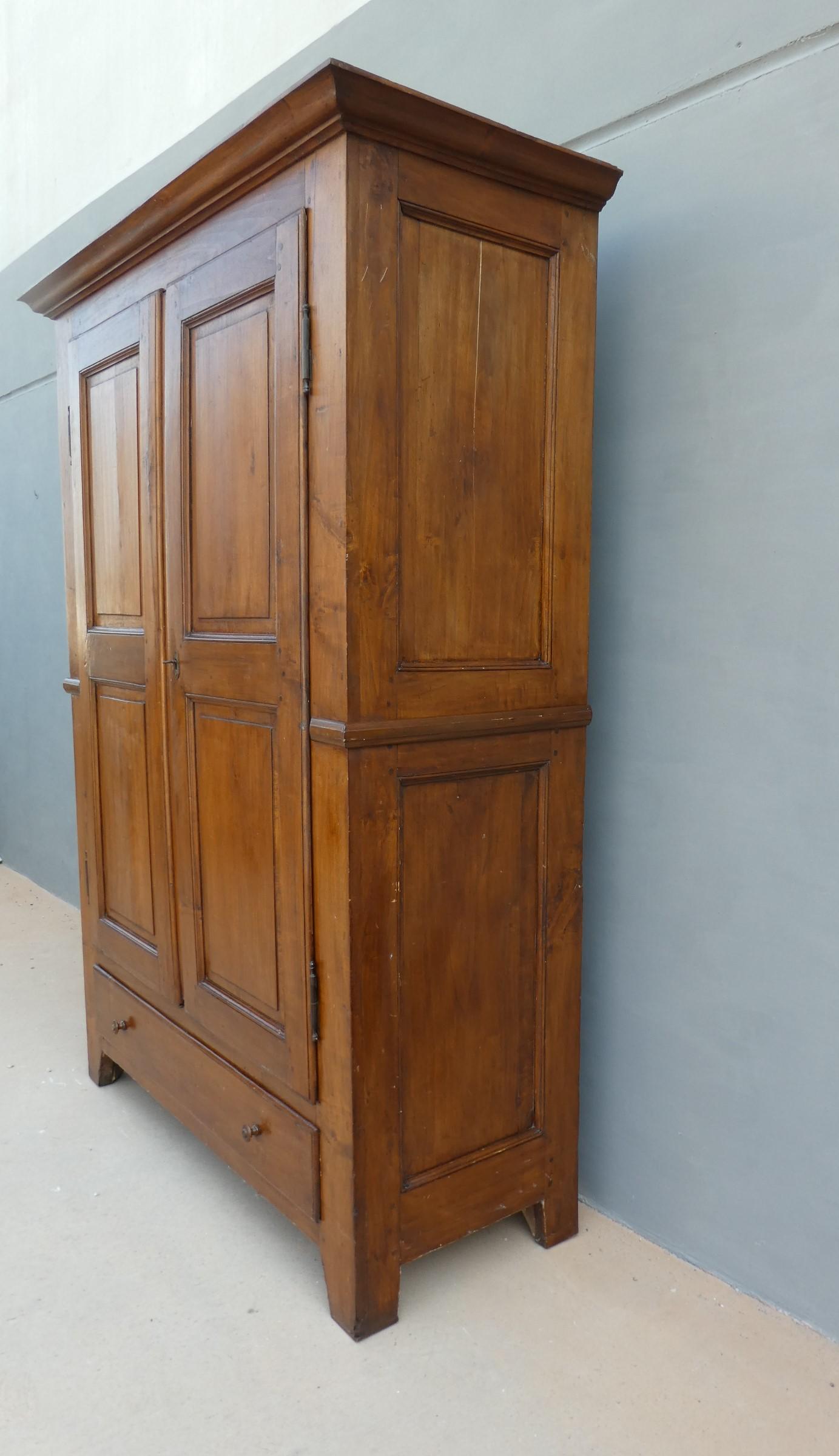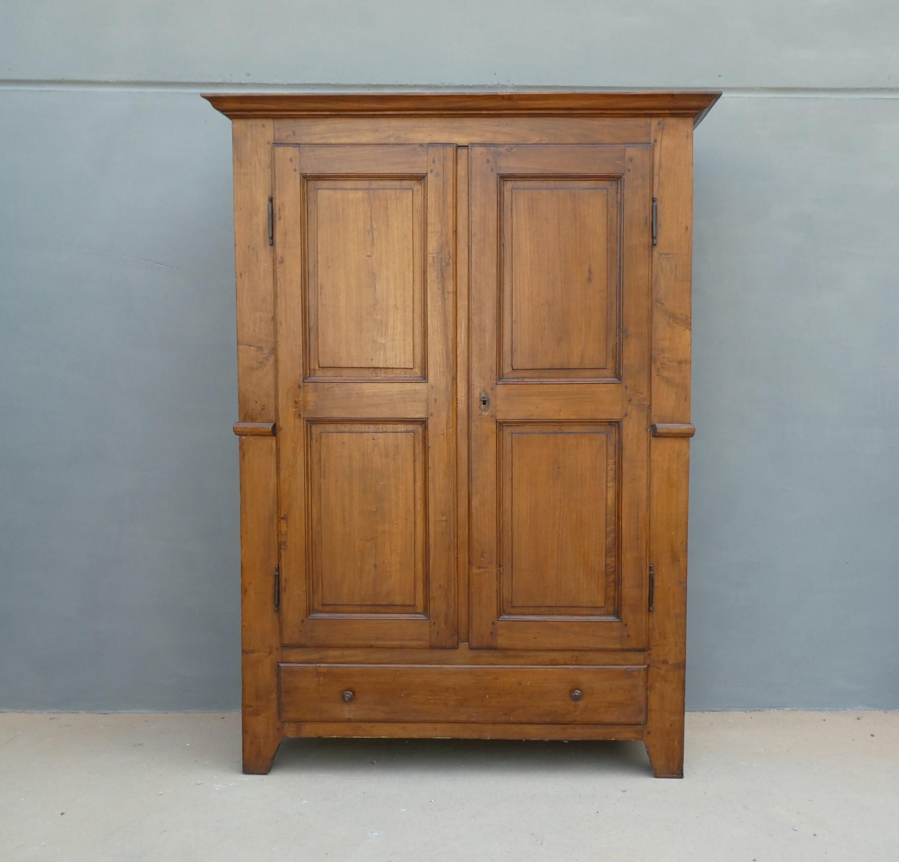 Armadio stipo piemontese corredato da due ante ed un cassetto frontale, realizzato in legno di pioppo ed appartenente d’epoca alla metà dell’800. La lineare struttura conferisce una sobria eleganza. La ricerca di un decoro essenziale si riflette anche sui montanti, privi di elementi decorativi. All’interno dispone di una barra appendiabiti. Divisibile in due corpi. Necessita di leggeri interventi di restauro e sono presenti alcuni fori di tarlo.