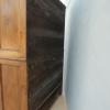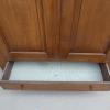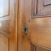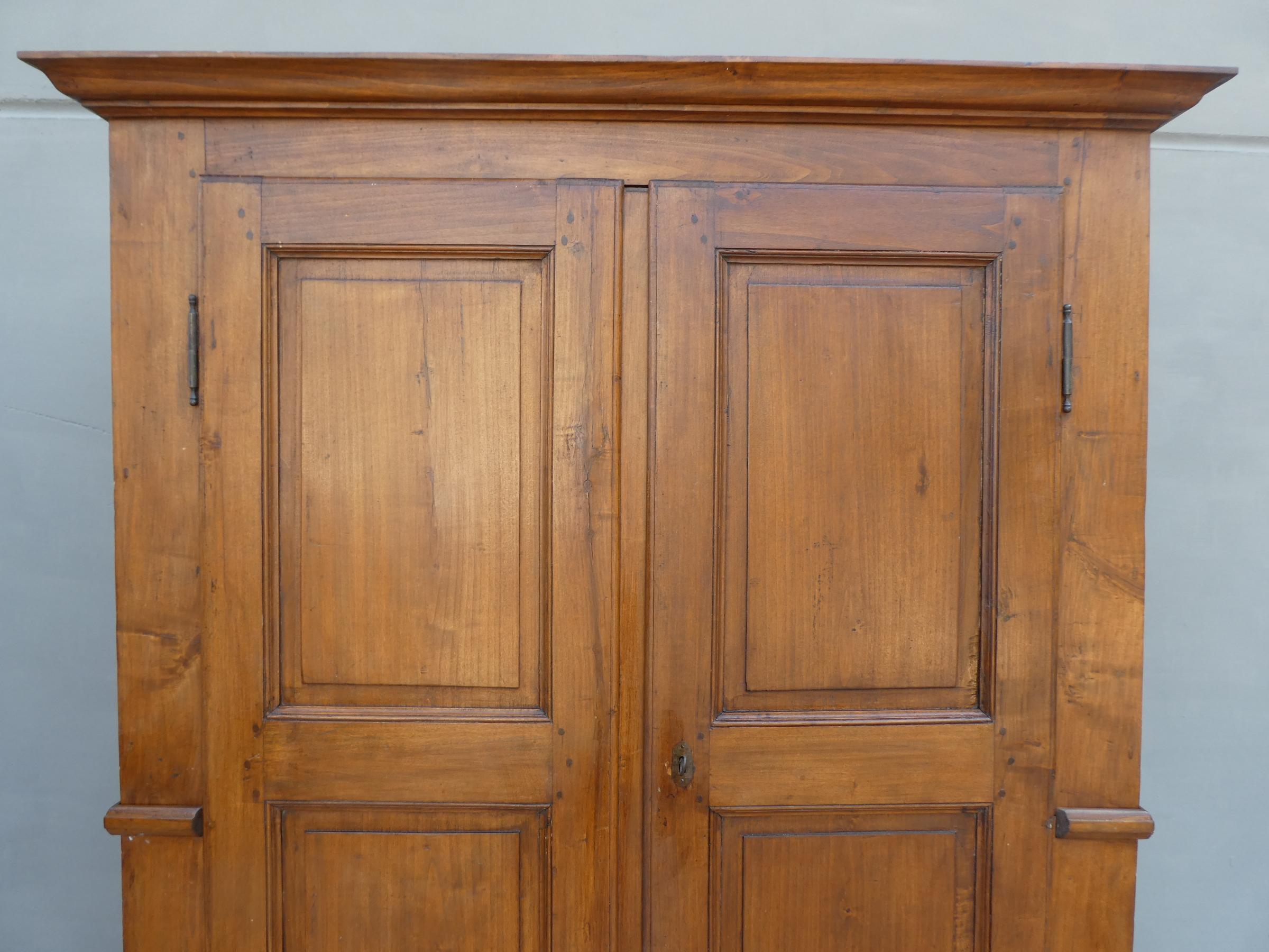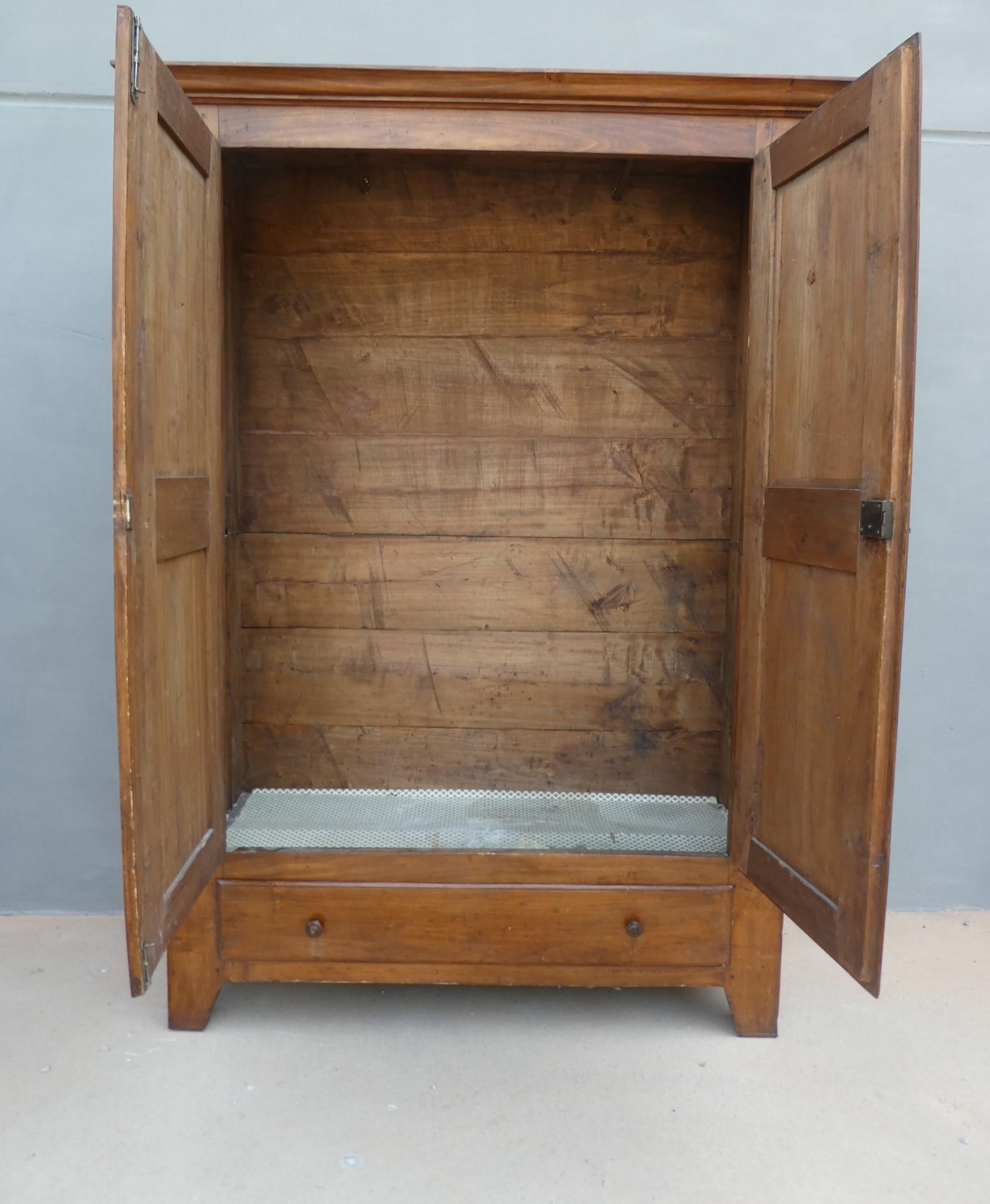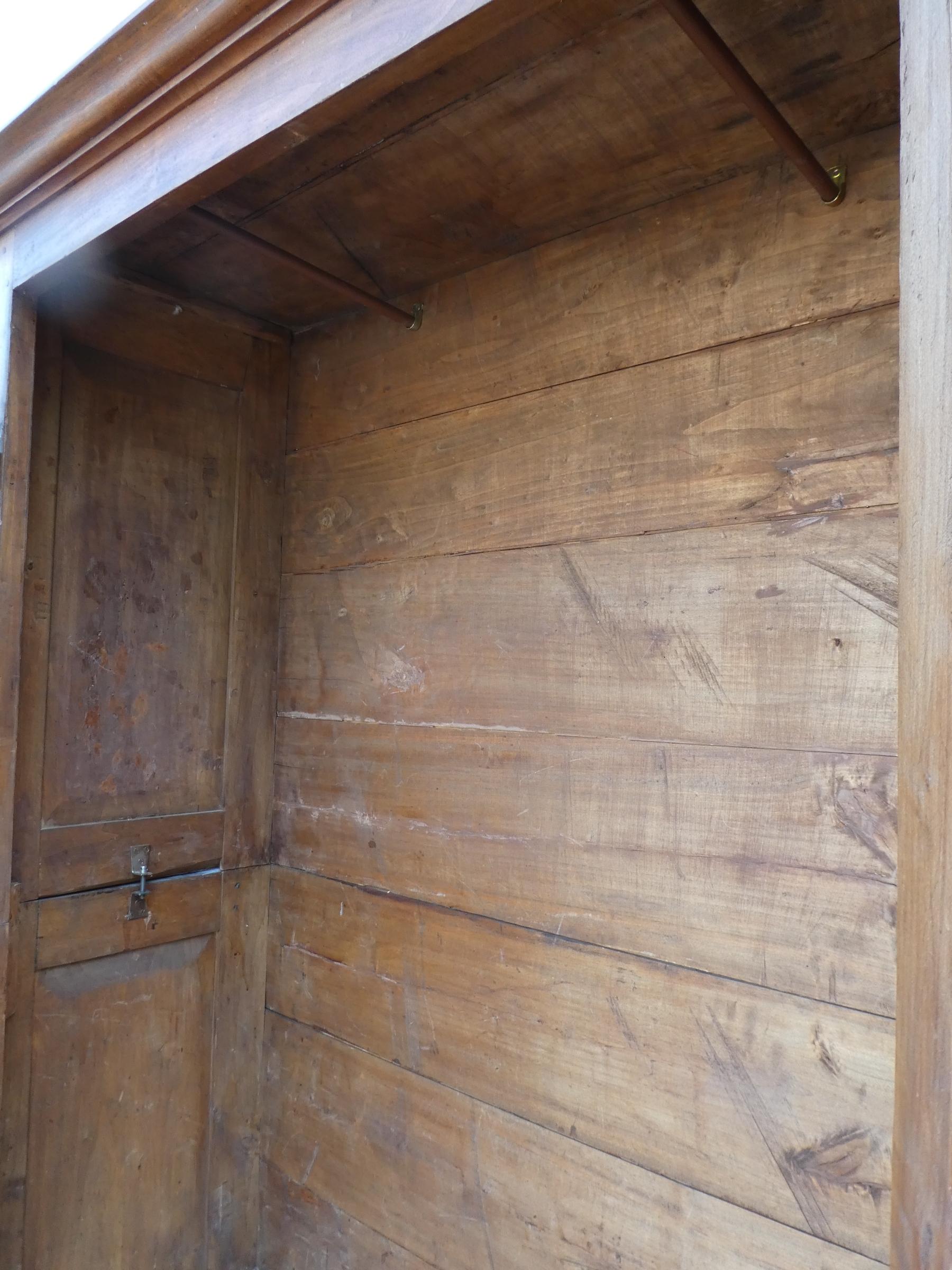 Armadio stipo piemontese corredato da due ante ed un cassetto frontale, realizzato in legno di pioppo ed appartenente d’epoca alla metà dell’800. La lineare struttura conferisce una sobria eleganza. La ricerca di un decoro essenziale si riflette anche sui montanti, privi di elementi decorativi. All’interno dispone di una barra appendiabiti. Divisibile in due corpi. Necessita di leggeri interventi di restauro e sono presenti alcuni fori di tarlo.