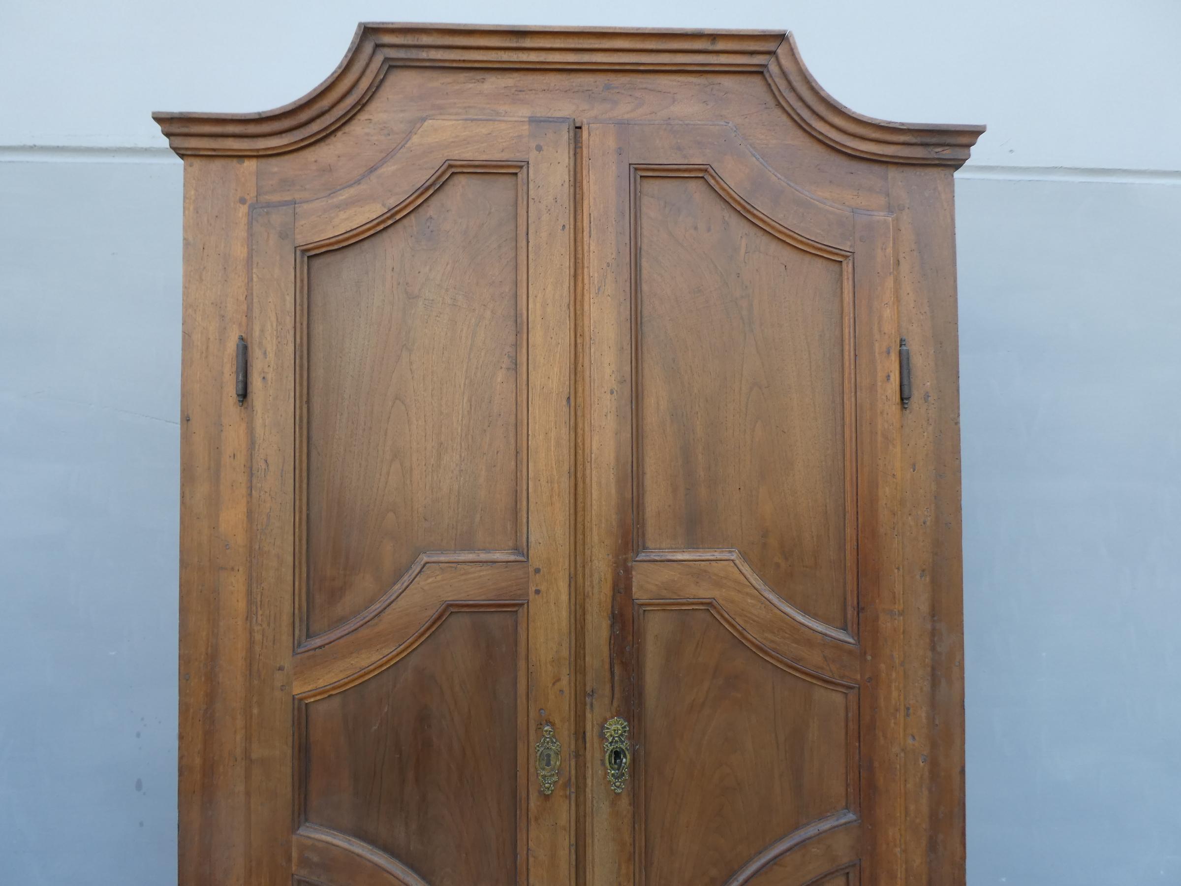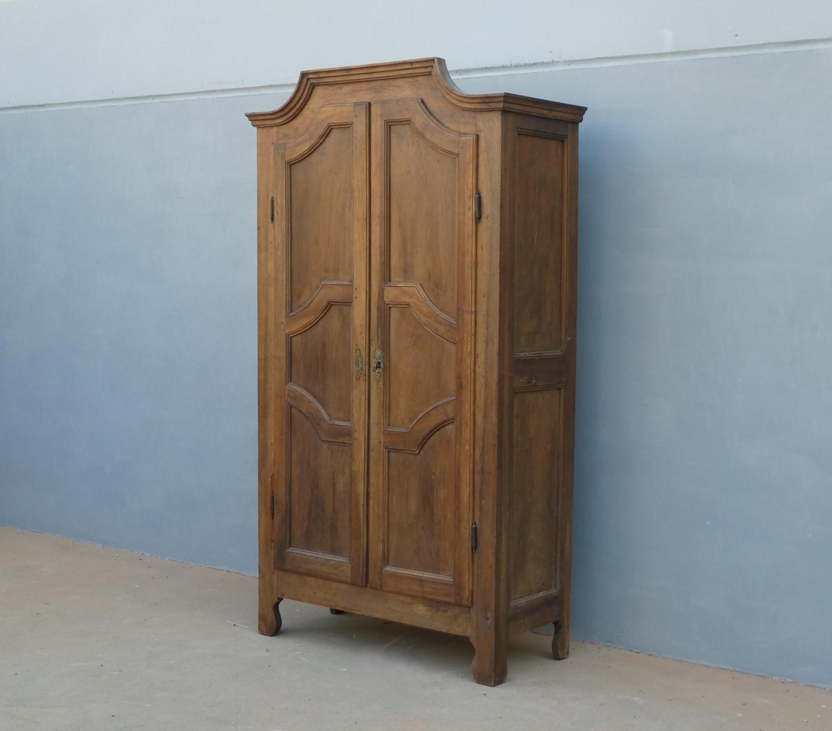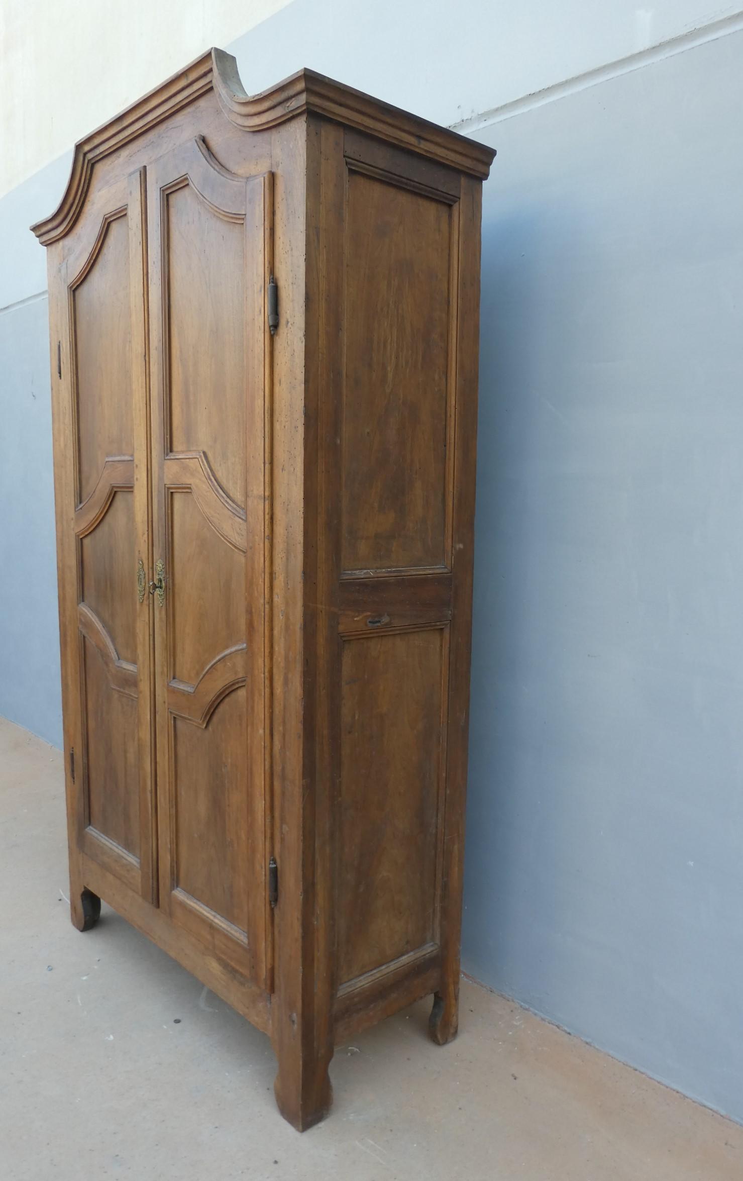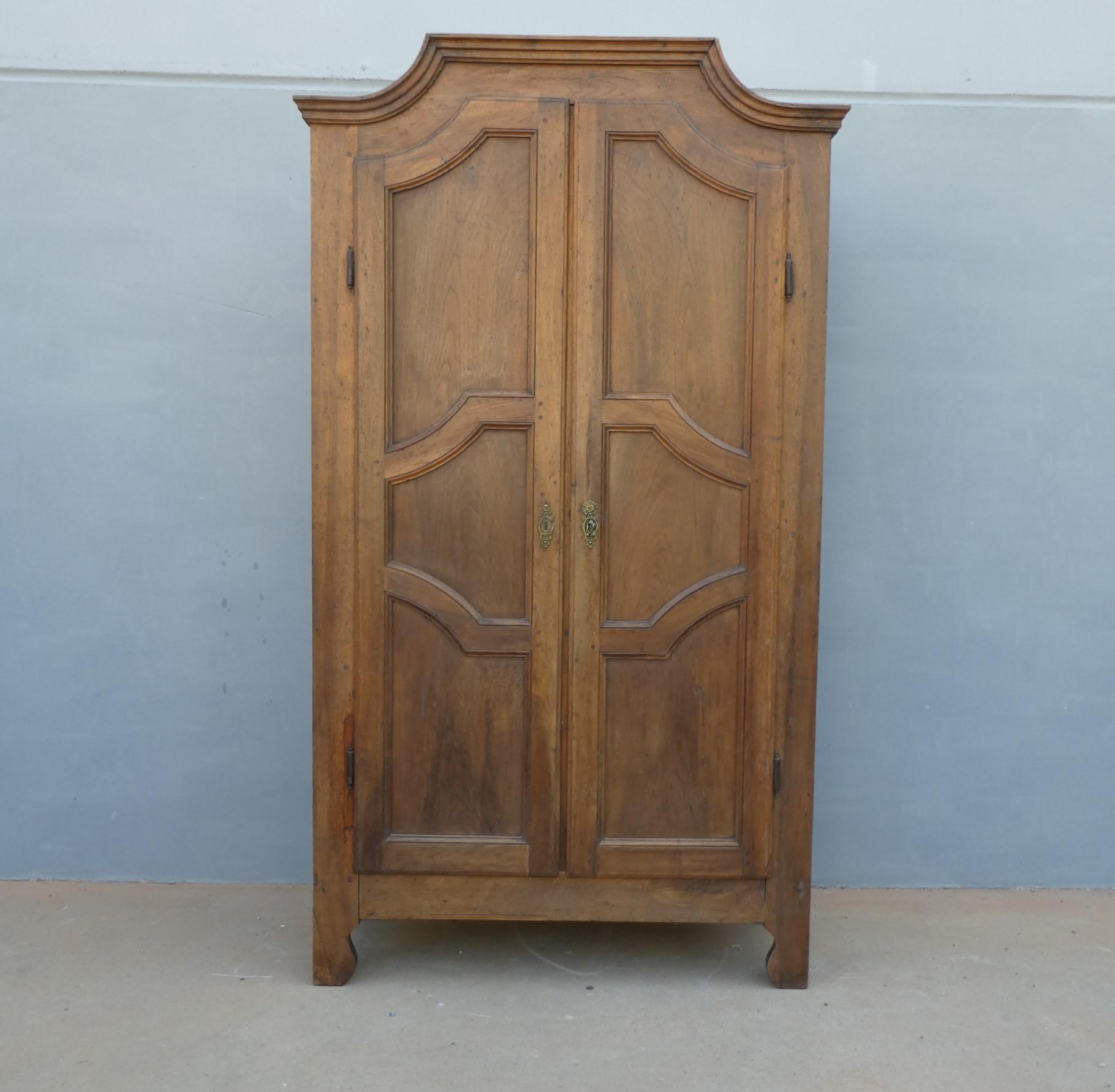 Armadio piemontese centinato dotato di due ante frontali, realizzato in legno massello di noce ed appartenente d’epoca ai primi dell’800. Semplice ed armonioso nella linea, è caratterizzato da una cornice mossa, elemento chiave di questo stile, e da due ante, contraddistinte da tre sinuosi pannelli. L’interno è fornito di un ripiano ed una barra appendiabiti. Non è smontabile. Necessita di alcuni interventi di restauro e sono presenti fori di tarlo – ha subito interventi nel corso del tempo.