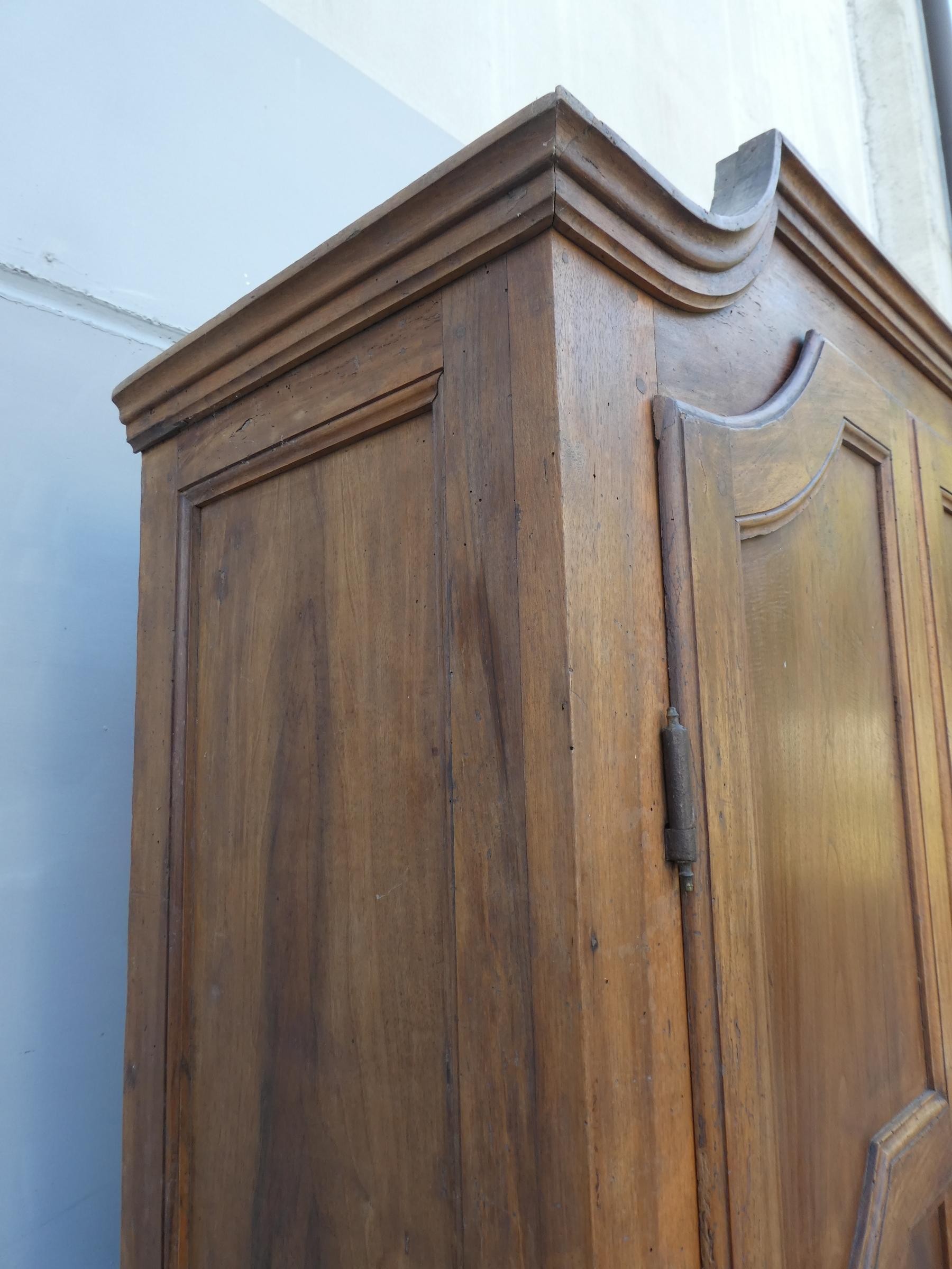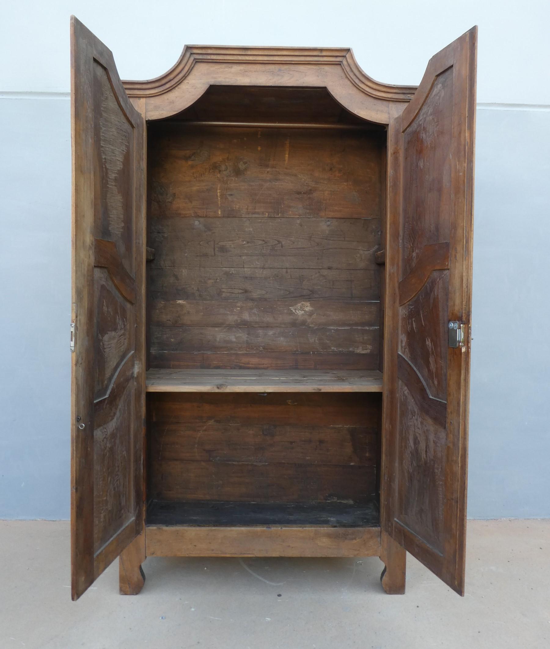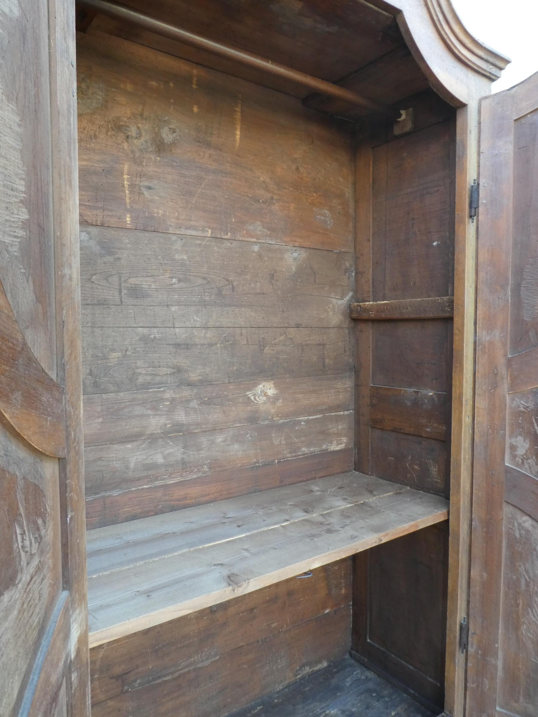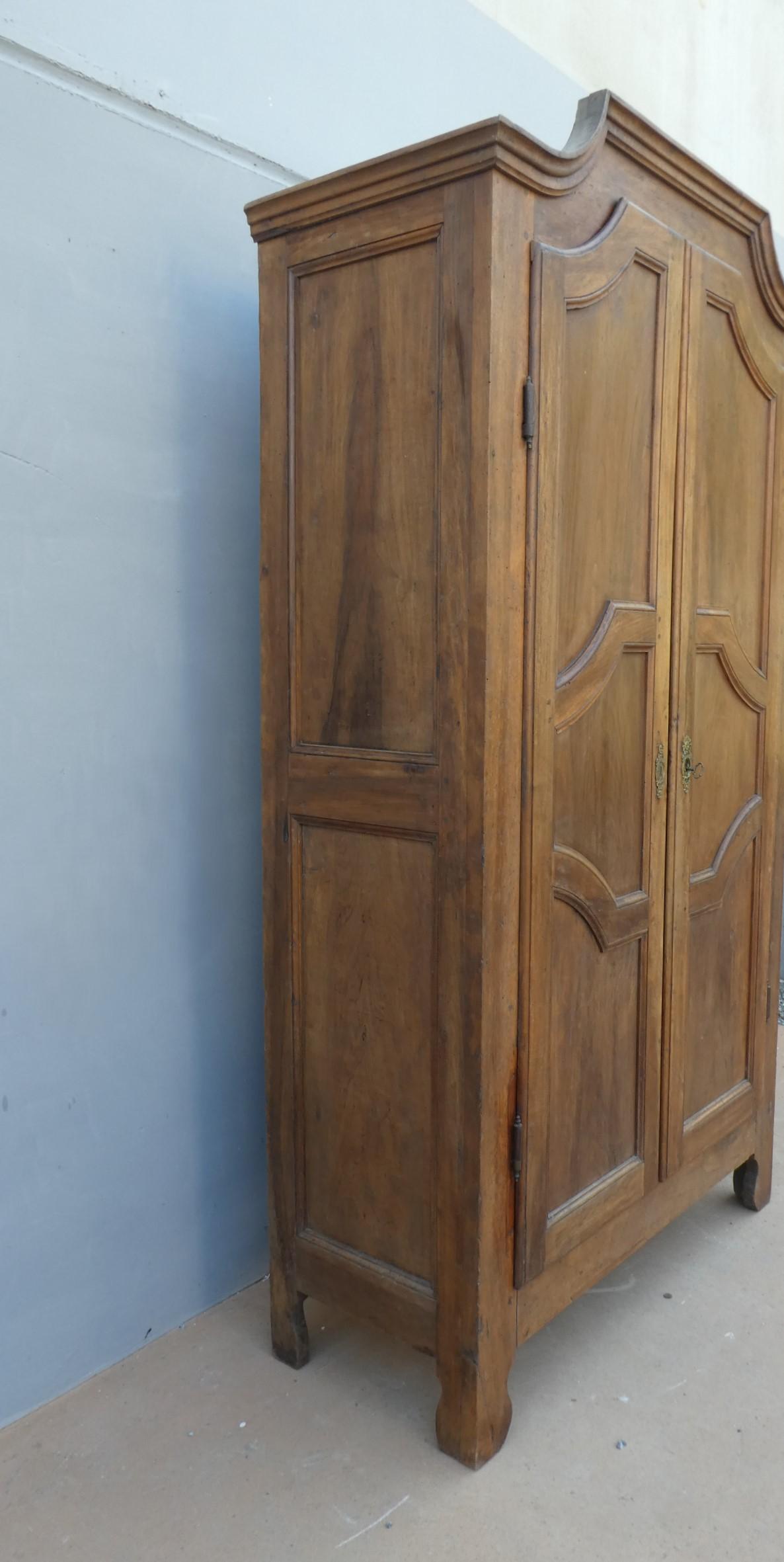 Armadio piemontese centinato dotato di due ante frontali, realizzato in legno massello di noce ed appartenente d’epoca ai primi dell’800. Semplice ed armonioso nella linea, è caratterizzato da una cornice mossa, elemento chiave di questo stile, e da due ante, contraddistinte da tre sinuosi pannelli. L’interno è fornito di un ripiano ed una barra appendiabiti. Non è smontabile. Necessita di alcuni interventi di restauro e sono presenti fori di tarlo – ha subito interventi nel corso del tempo.