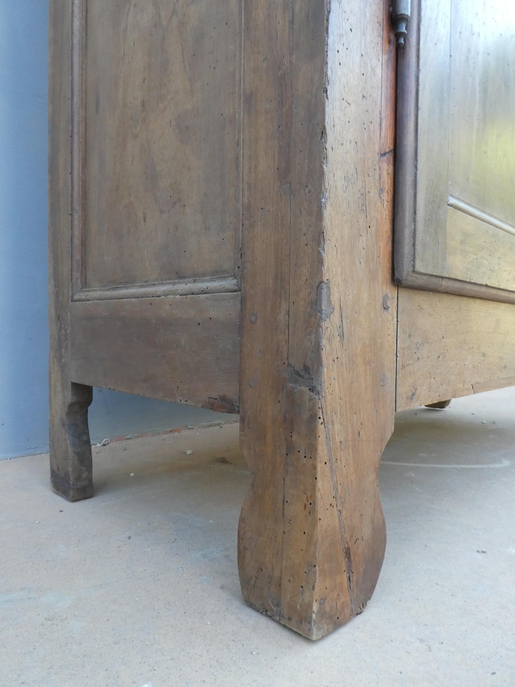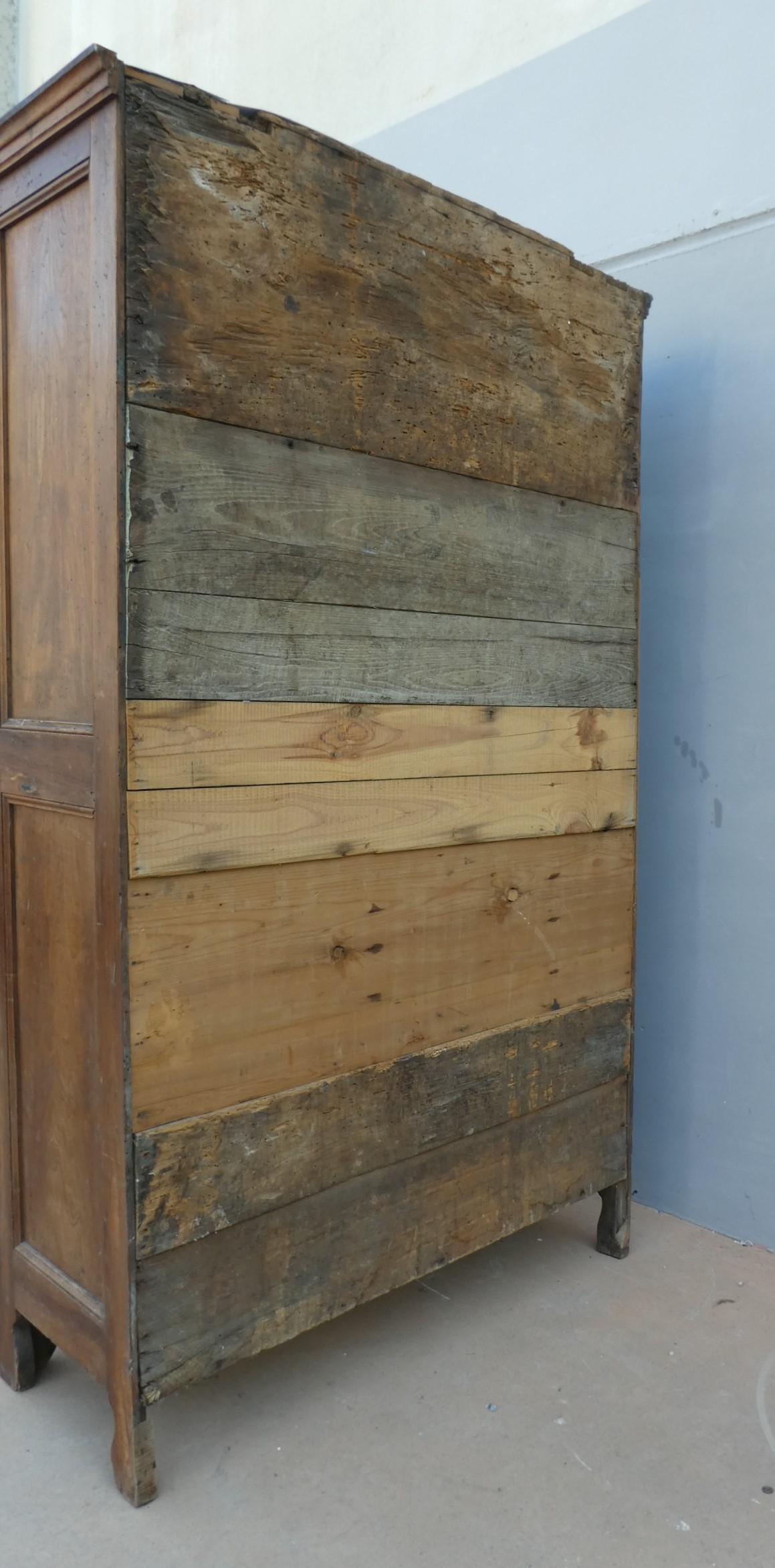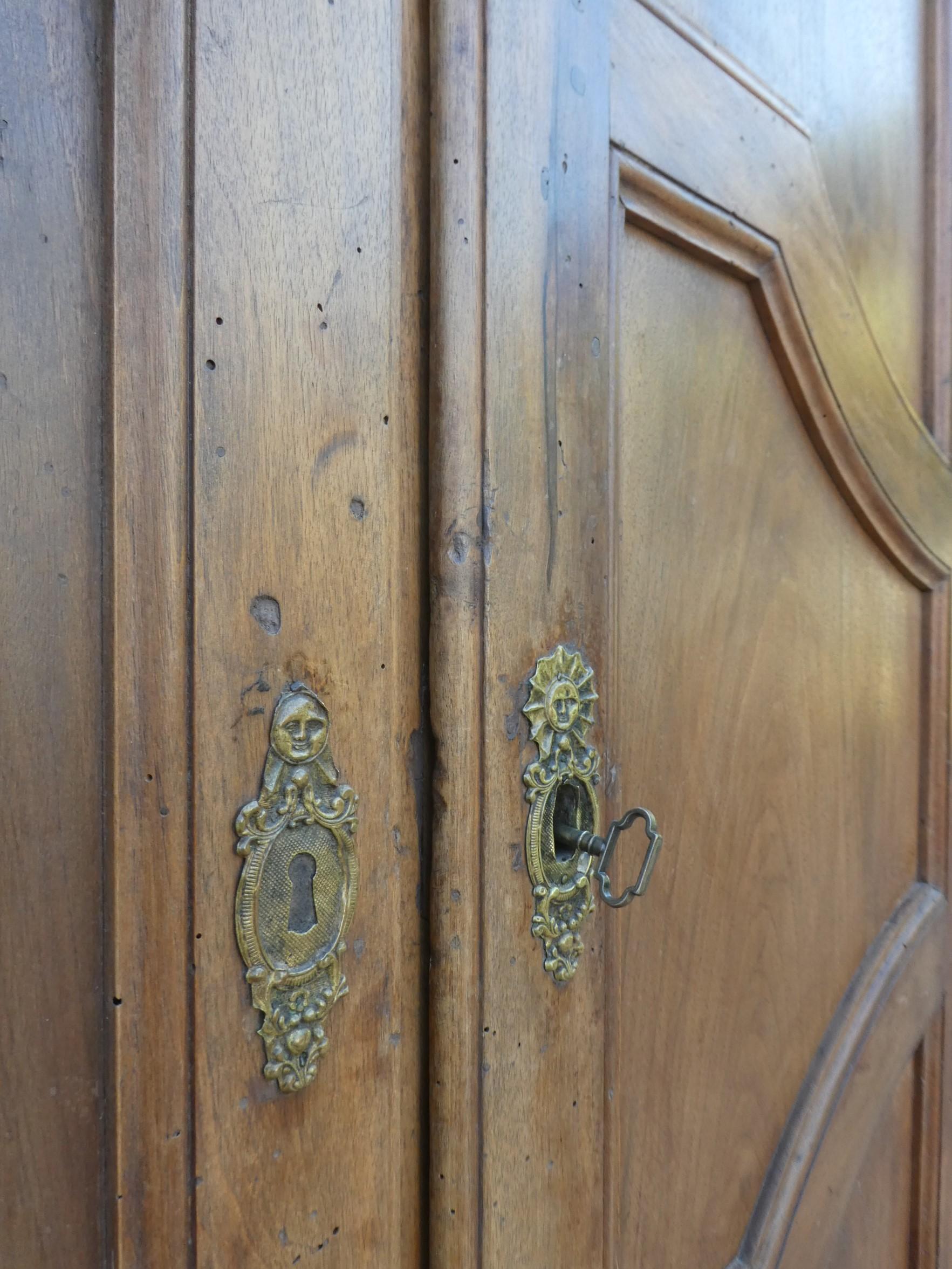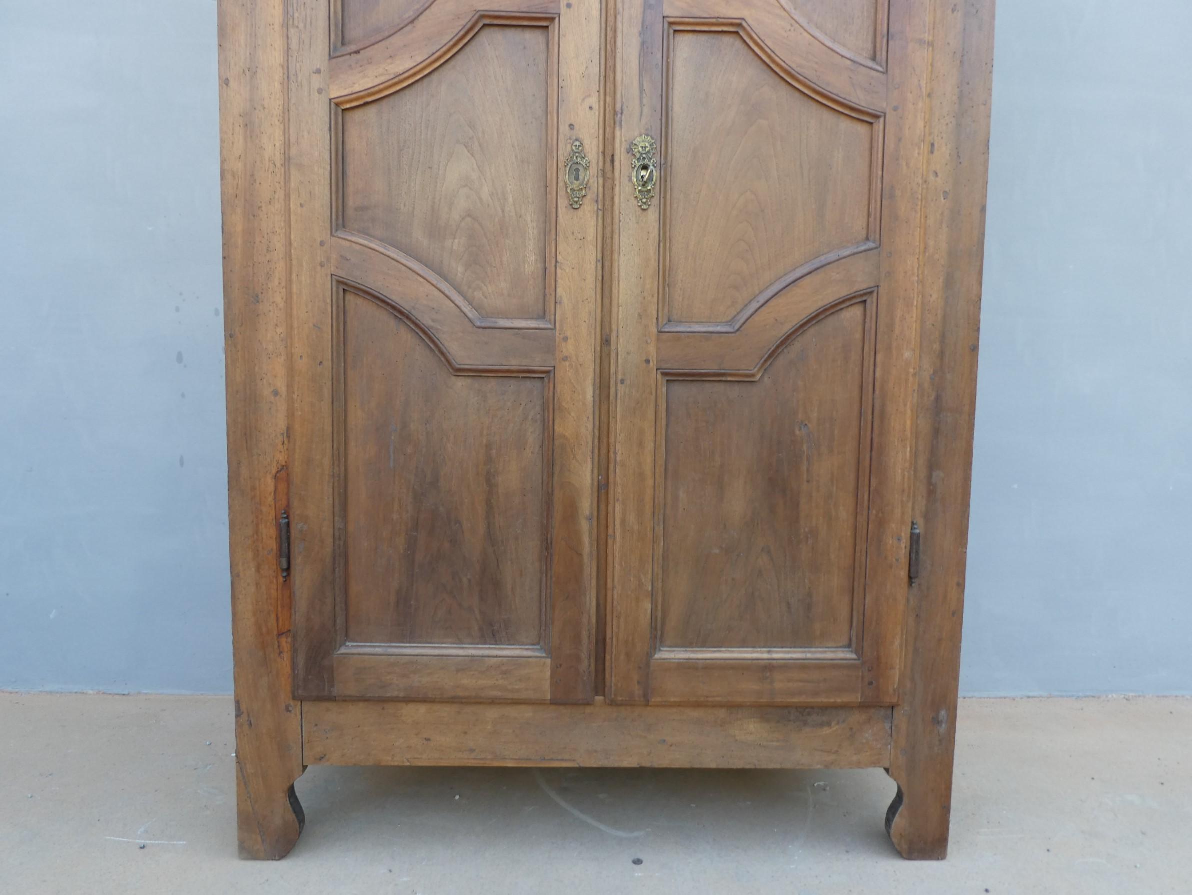 Armadio piemontese centinato dotato di due ante frontali, realizzato in legno massello di noce ed appartenente d’epoca ai primi dell’800. Semplice ed armonioso nella linea, è caratterizzato da una cornice mossa, elemento chiave di questo stile, e da due ante, contraddistinte da tre sinuosi pannelli. L’interno è fornito di un ripiano ed una barra appendiabiti. Non è smontabile. Necessita di alcuni interventi di restauro e sono presenti fori di tarlo – ha subito interventi nel corso del tempo.