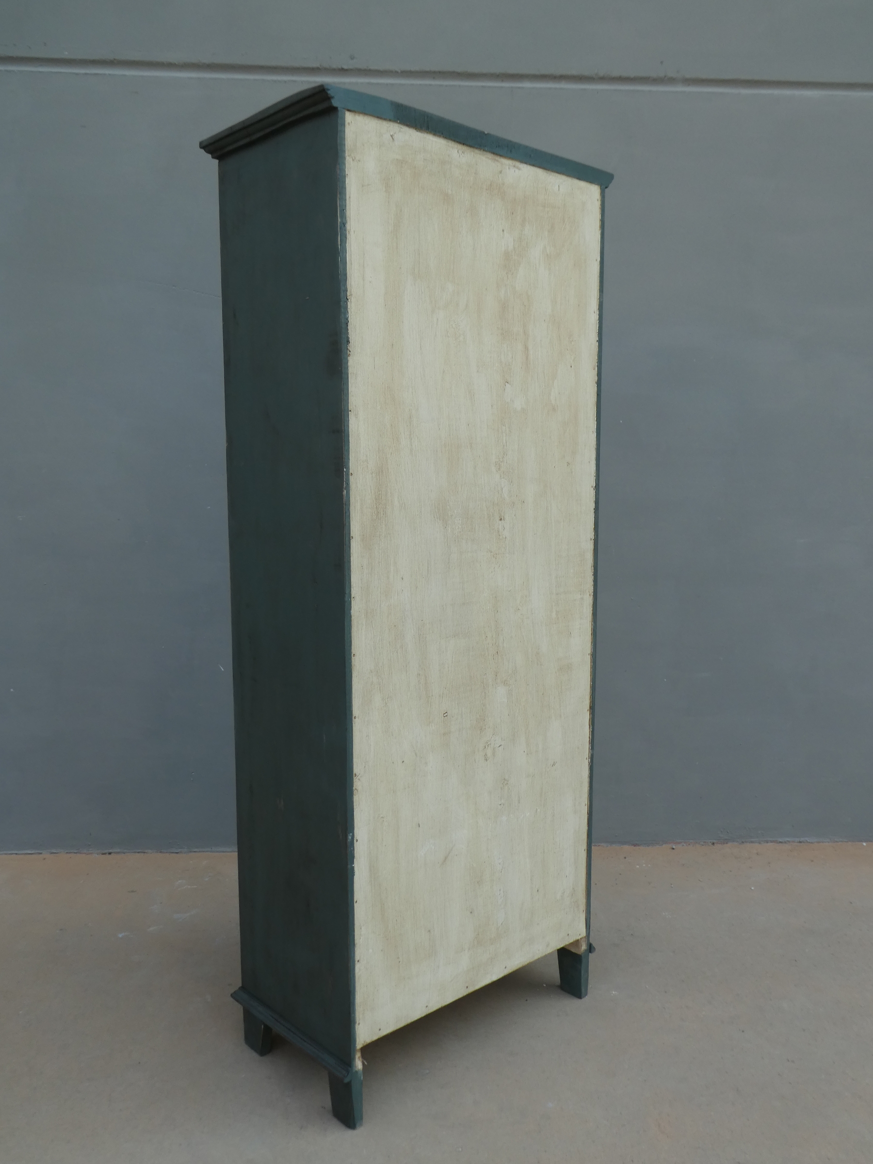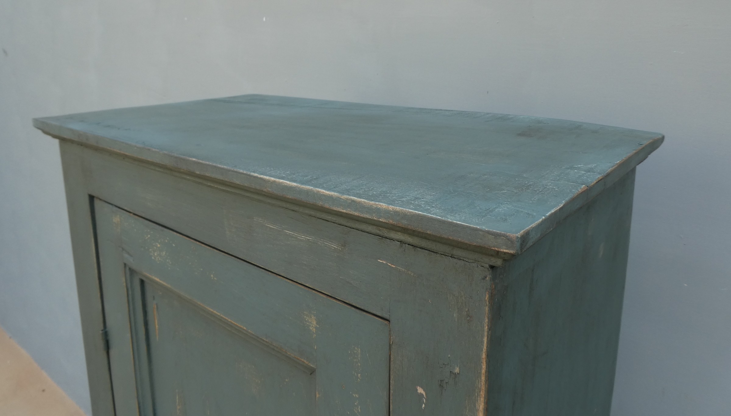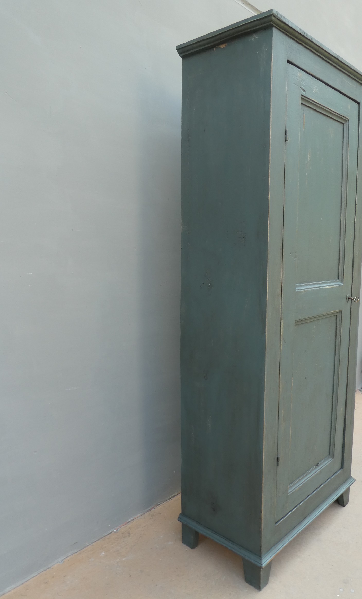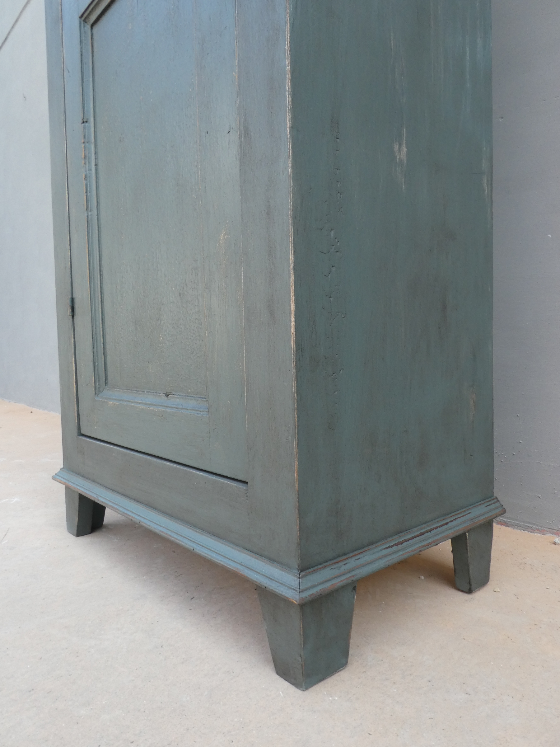 Armadio stipo bonnetiere colonna ad un’anta, laccato e rifinito con la tecnica “Shabby Chic” che prevede l’uso di colori più chiari in superficie e colori scuri che affiorano dopo il trattamento d’usura. Il mobile si presenta semplice e lineare, e vanta proporzioni armoniose e sapientemente equilibrate. La ricerca di un decoro essenziale si riflette anche sulla scelta dei montanti, privi di elementi decorativi. All’interno dispone di due ripiani. Recente costruzione con legno vecchio/nuovo.
