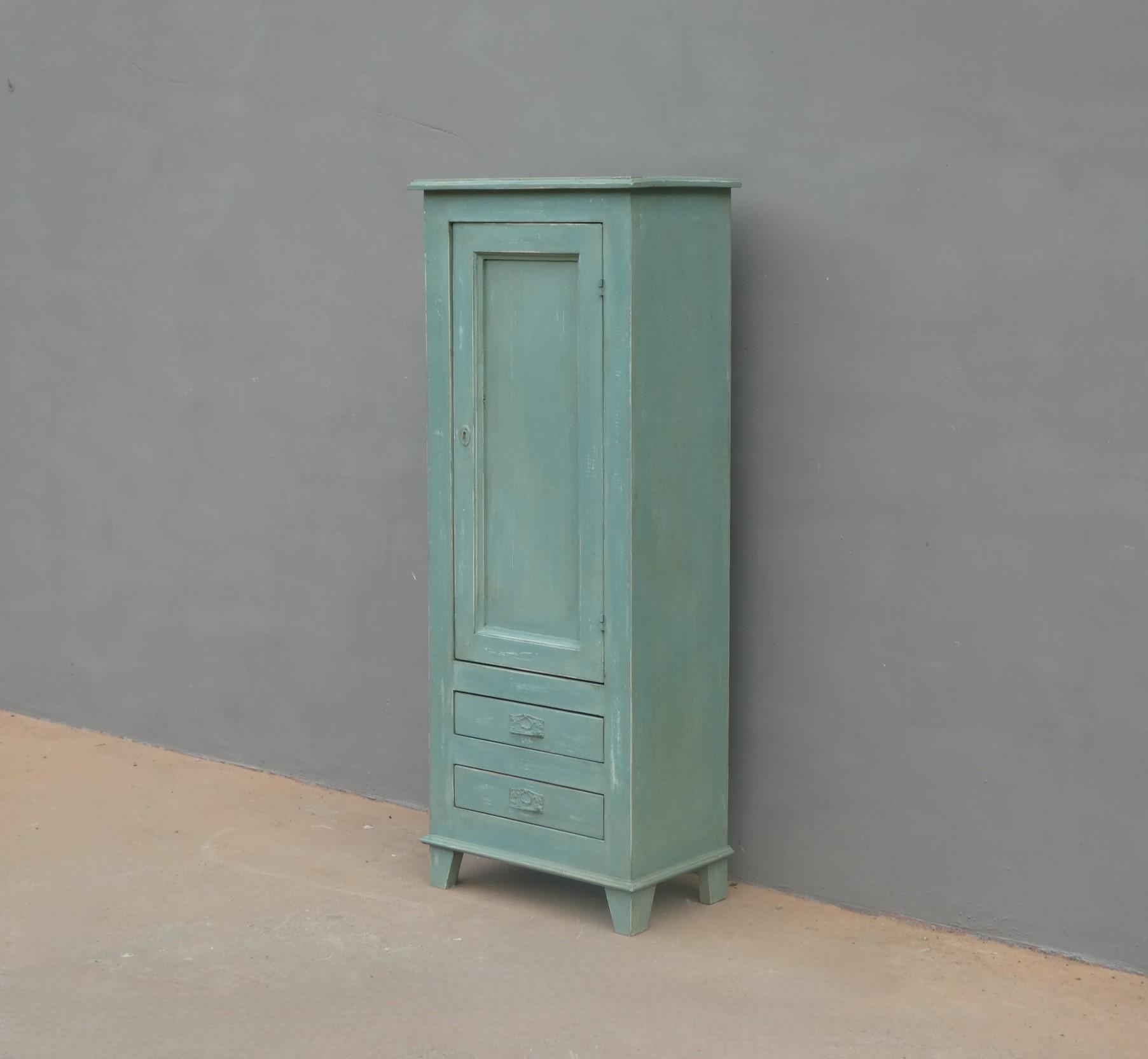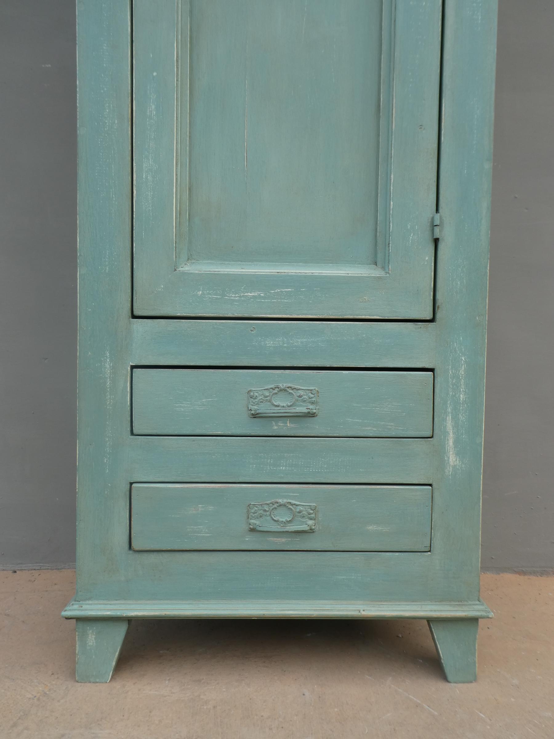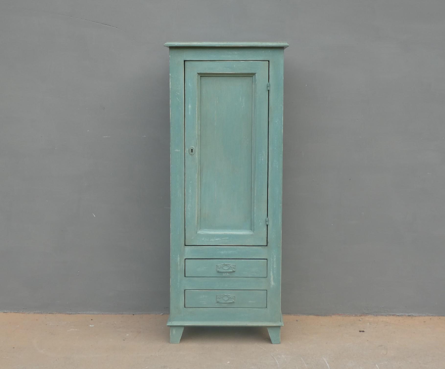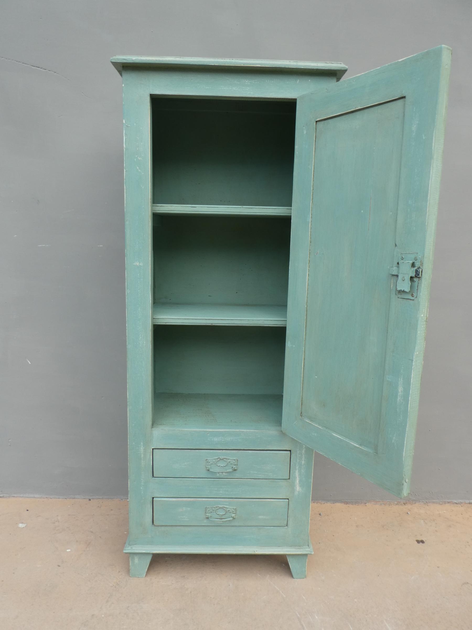 Armadio stipo bonnetiere colonna dispensa dotata di un’antina frontale e due cassetti, laccato e rifinito con la tecnica “Shabby Chic” che prevede l’uso di colori chiari in superficie e colori più scuri che affiorano dopo il trattamento d’usura. Il mobile si presenta semplice e lineare, e vanta proporzioni armoniose e sapientemente equilibrate. La ricerca di un decoro essenziale si riflette anche sulla scelta dei montanti, privi di elementi decorativi. All’interno dispone di due ripiani. Sano di struttura – recente costruzione con legno vecchio e legno nuovo.