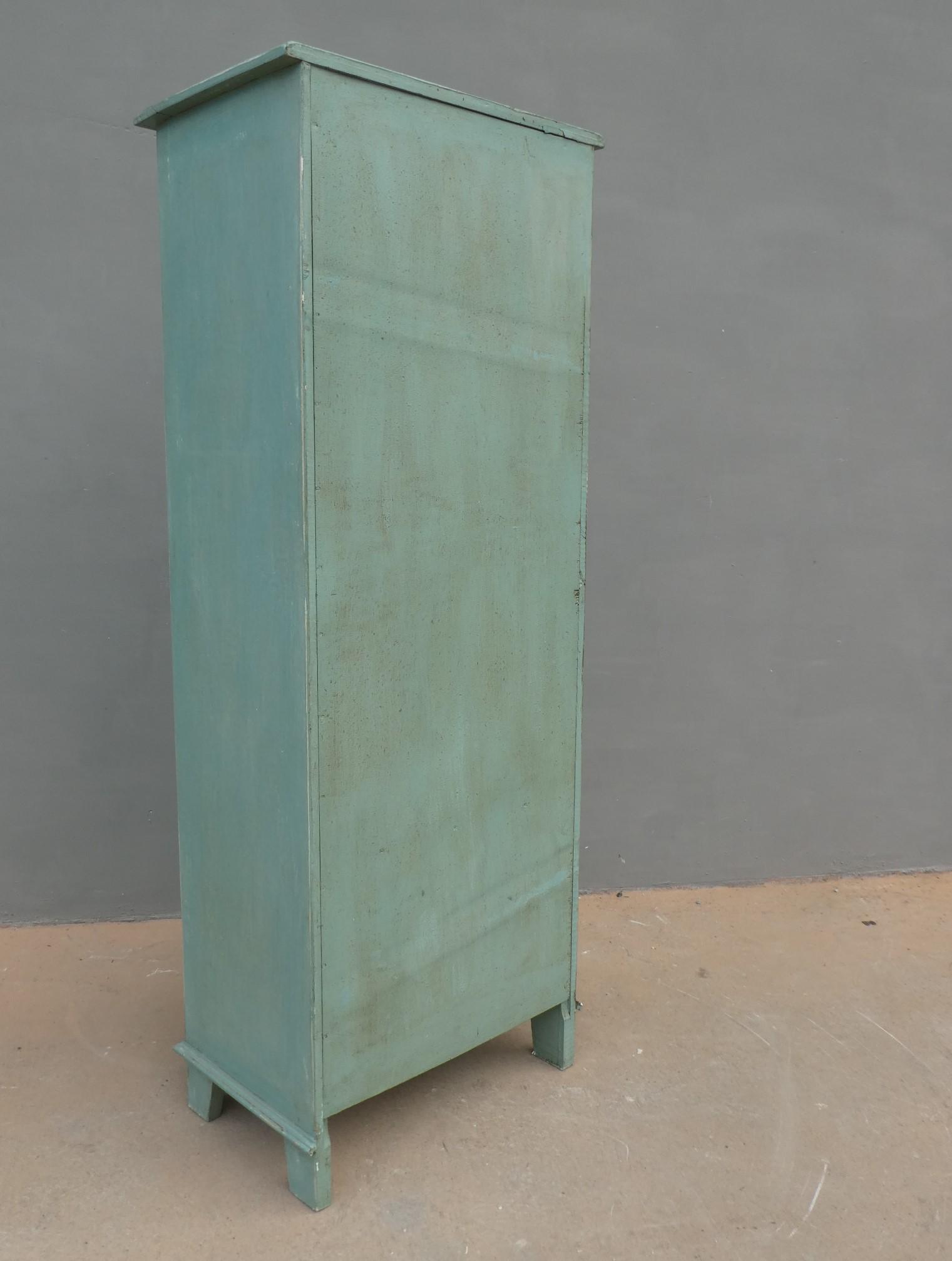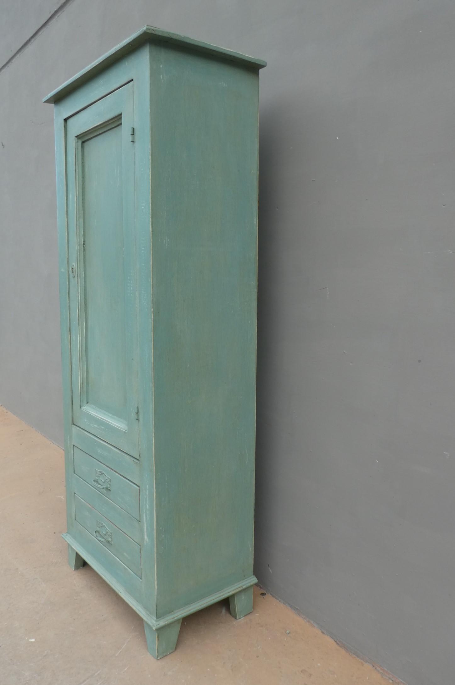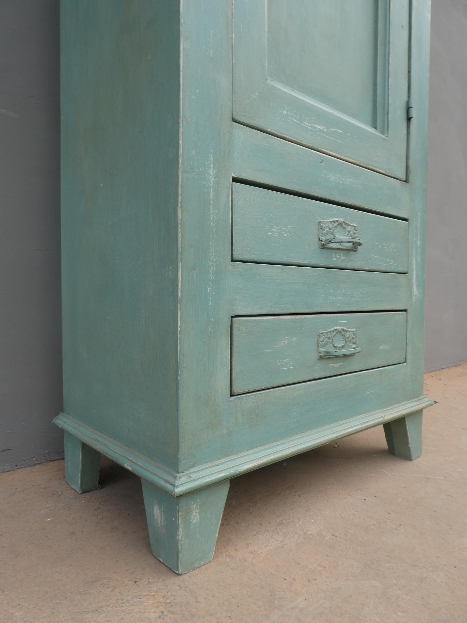Armadio stipo bonnetiere colonna dispensa dotata di un’antina frontale e due cassetti, laccato e rifinito con la tecnica “Shabby Chic” che prevede l’uso di colori chiari in superficie e colori più scuri che affiorano dopo il trattamento d’usura. Il mobile si presenta semplice e lineare, e vanta proporzioni armoniose e sapientemente equilibrate. La ricerca di un decoro essenziale si riflette anche sulla scelta dei montanti, privi di elementi decorativi. All’interno dispone di due ripiani. Sano di struttura – recente costruzione con legno vecchio e legno nuovo.