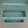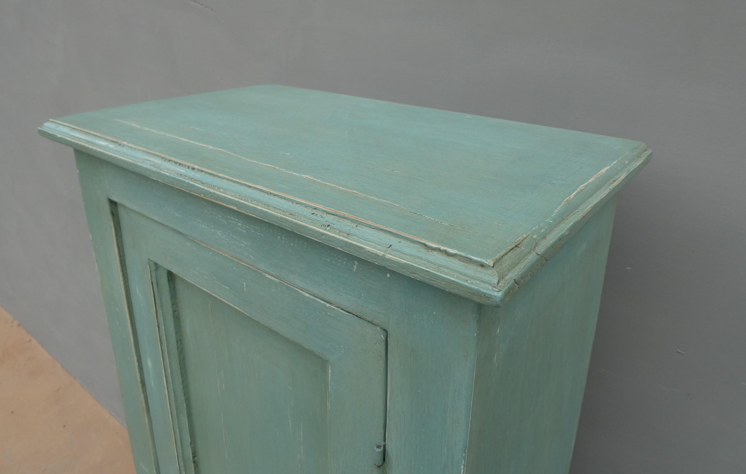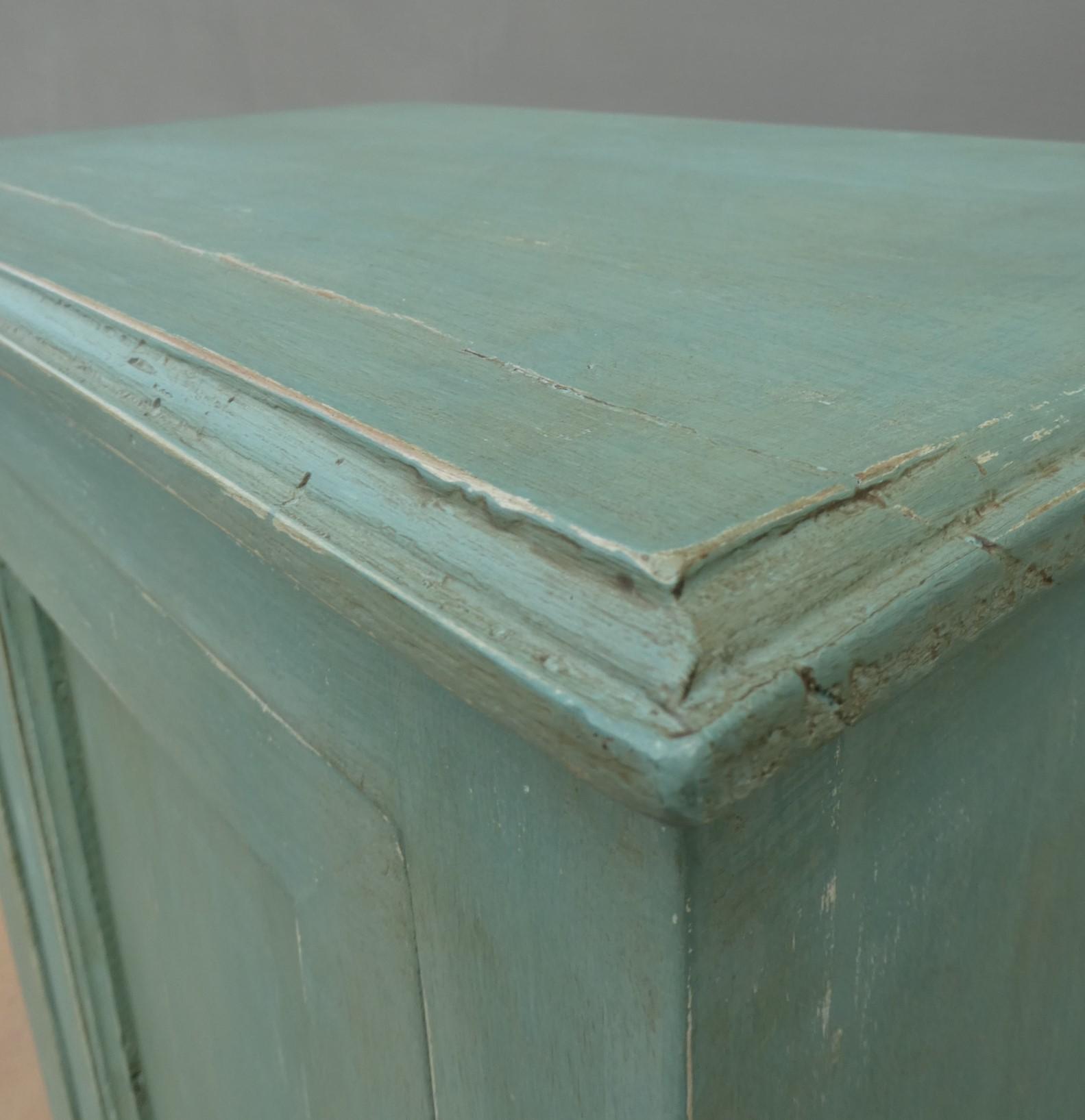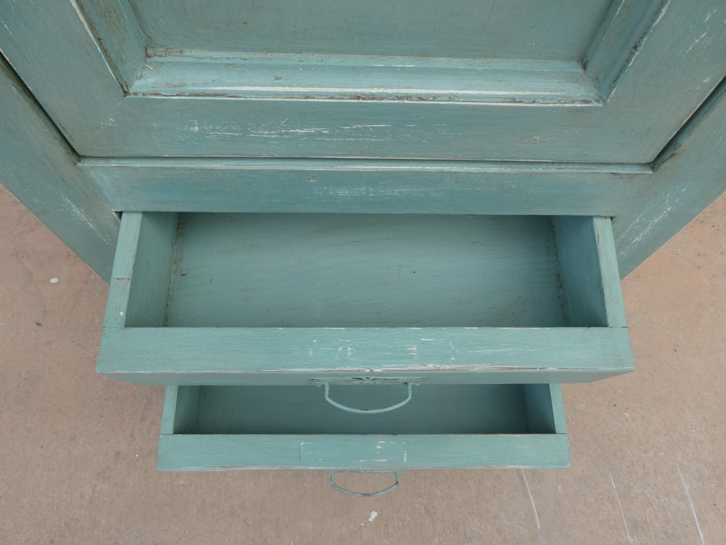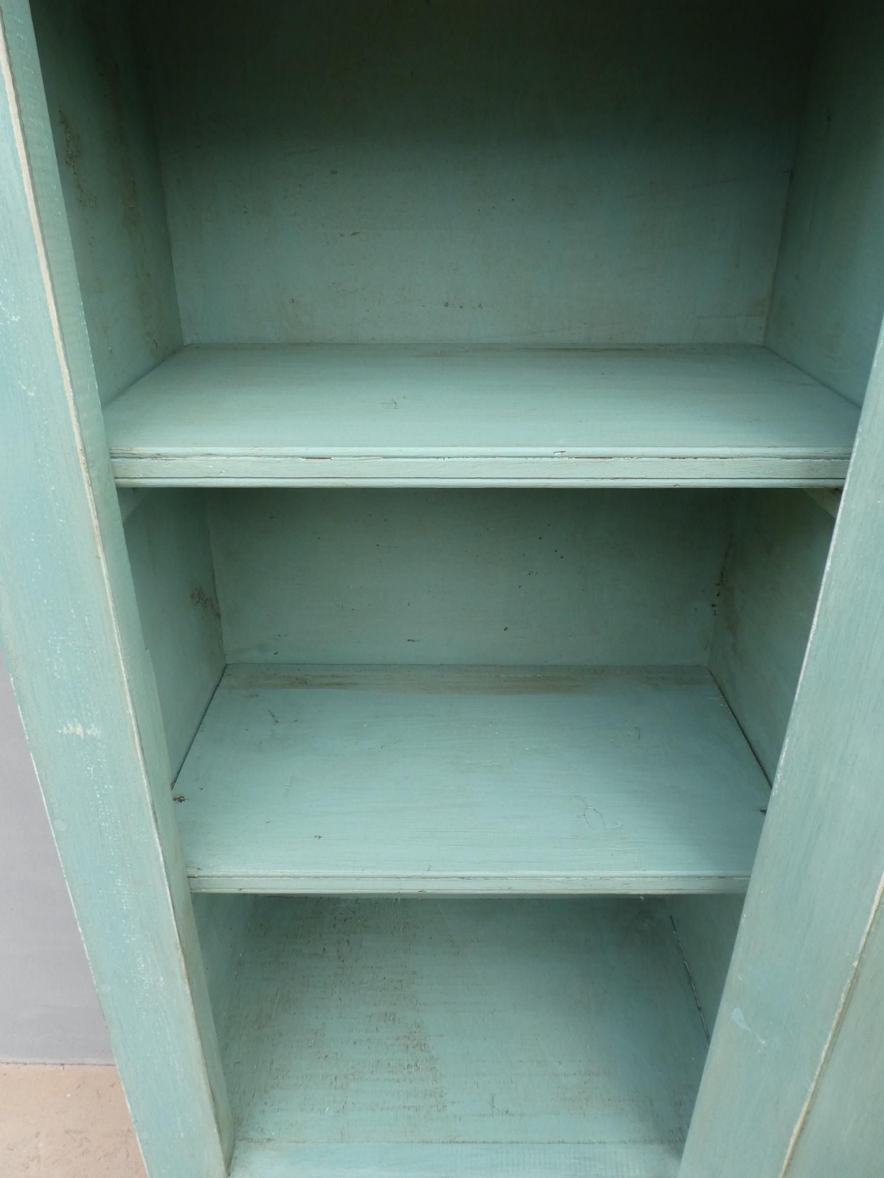 Armadio stipo bonnetiere colonna dispensa dotata di un’antina frontale e due cassetti, laccato e rifinito con la tecnica “Shabby Chic” che prevede l’uso di colori chiari in superficie e colori più scuri che affiorano dopo il trattamento d’usura. Il mobile si presenta semplice e lineare, e vanta proporzioni armoniose e sapientemente equilibrate. La ricerca di un decoro essenziale si riflette anche sulla scelta dei montanti, privi di elementi decorativi. All’interno dispone di due ripiani. Sano di struttura – recente costruzione con legno vecchio e legno nuovo.