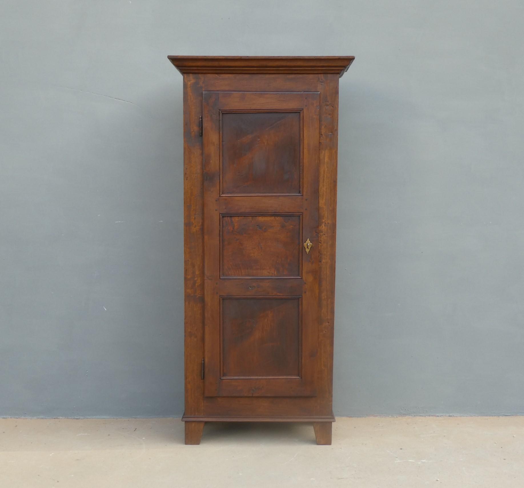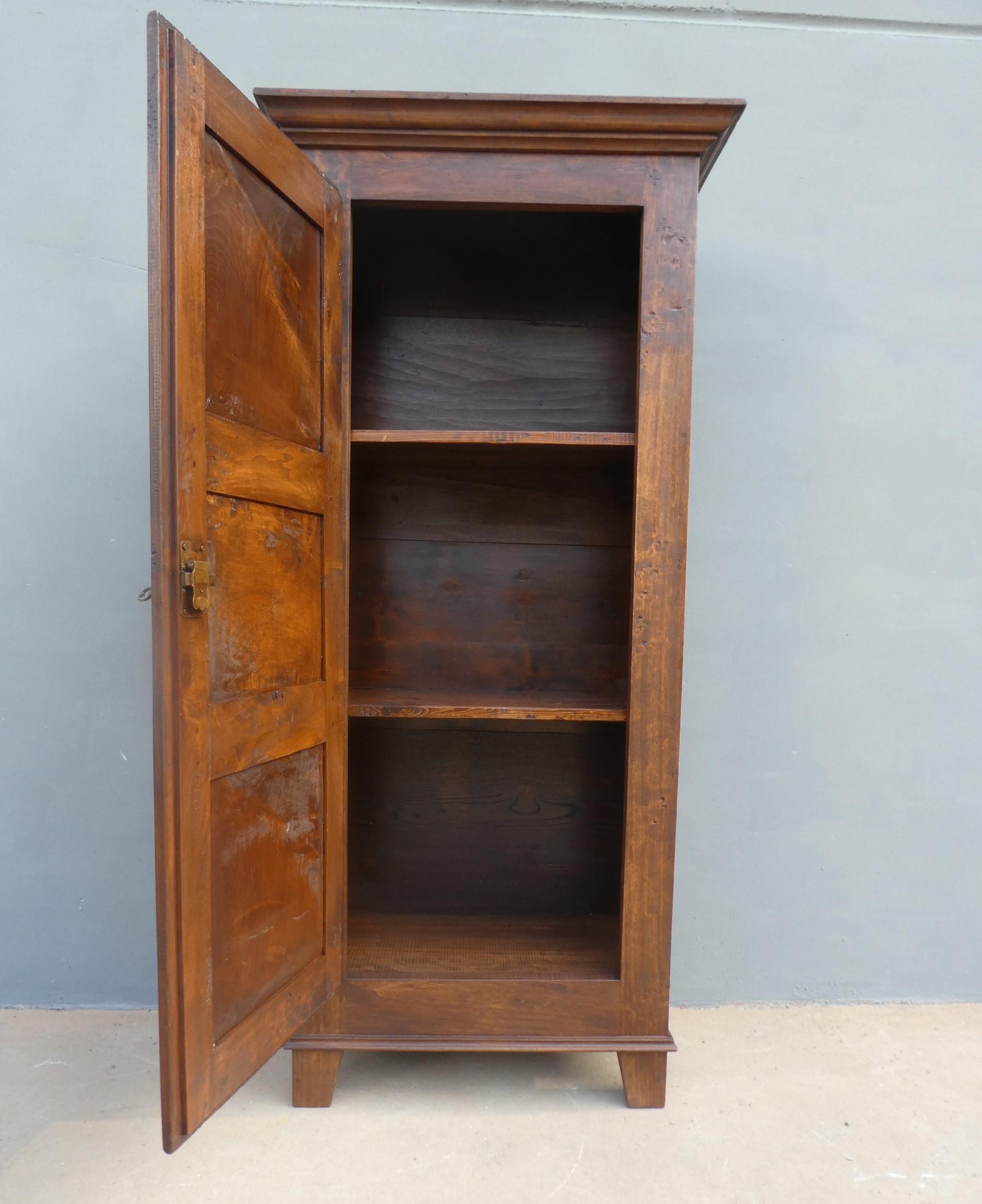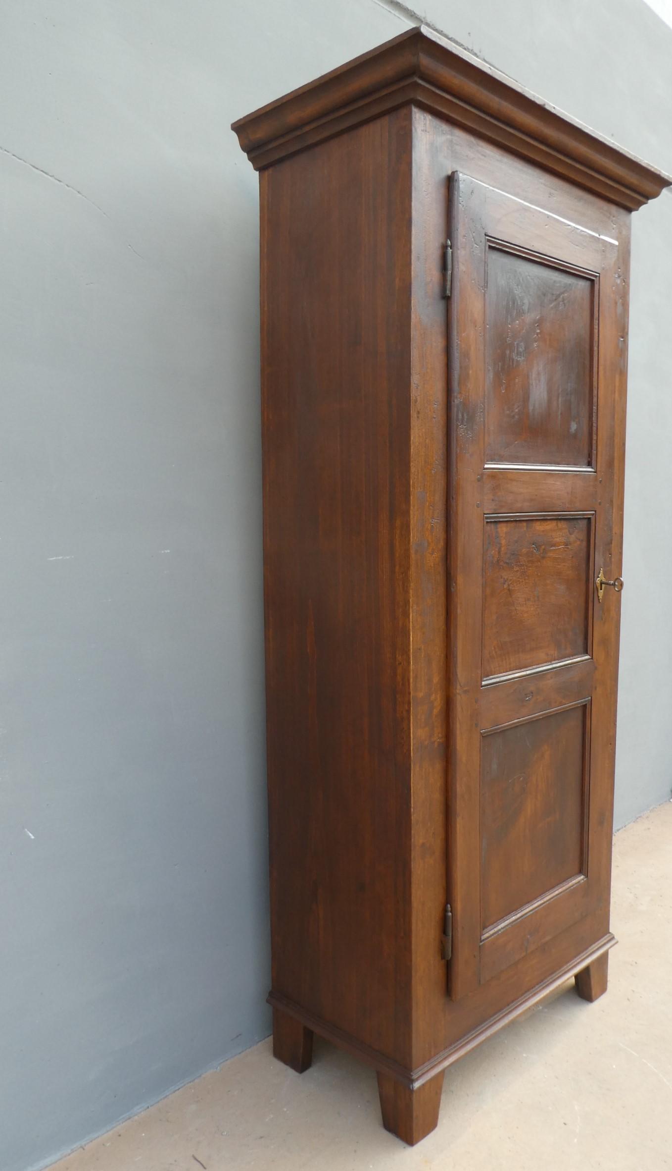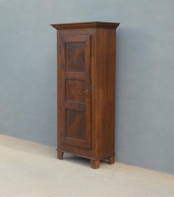 Armadio bonnetiere stipo colonna ad un’anta, realizzato in legno e dotato di due ripiani interni. Il mobile si presenta semplice e lineare, e vanta proporzioni sapientemente equilibrate. La ricerca di un decoro essenziale si riflette anche sulla scelta dei montanti, privi di elementi decorativi. Recente ricostruzione con legno vecchio e nuovo, sono presenti alcuni fori di tarlo.