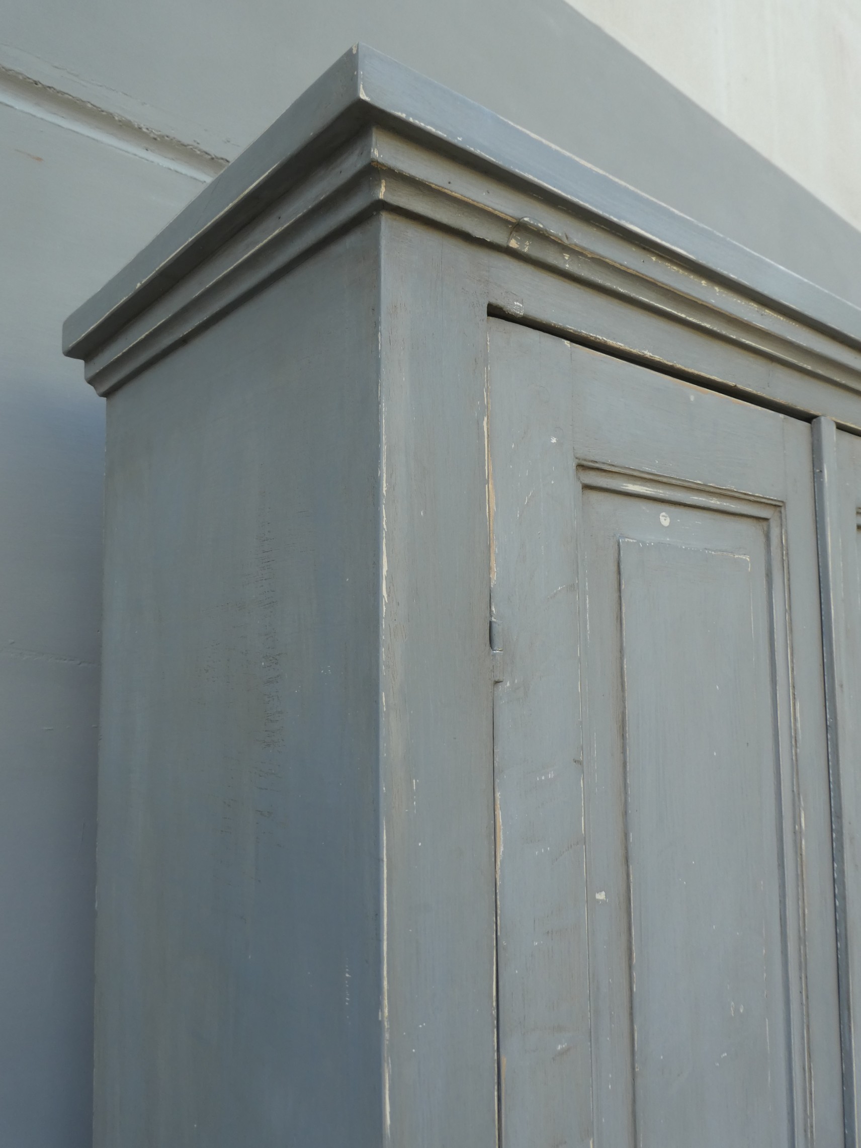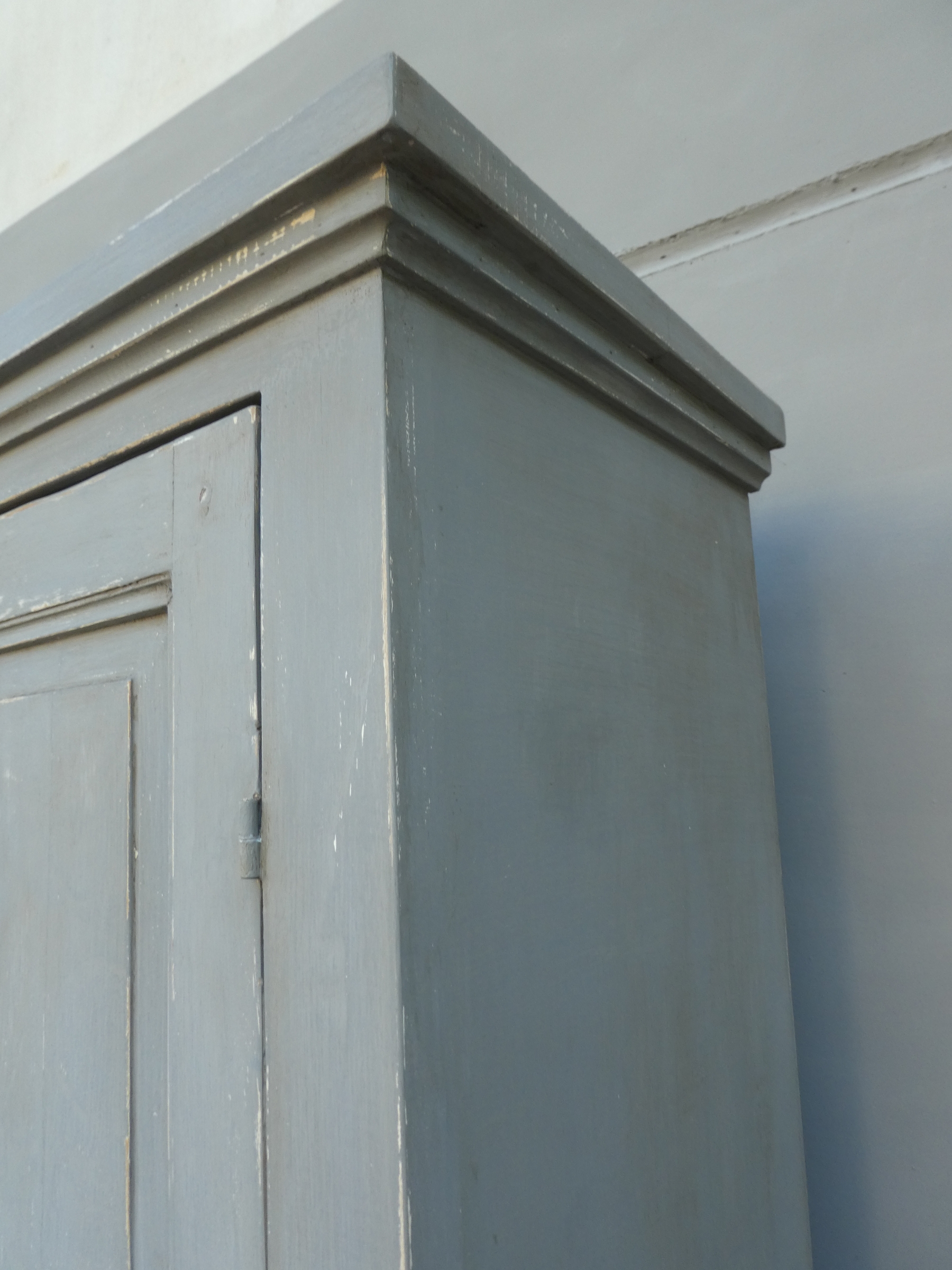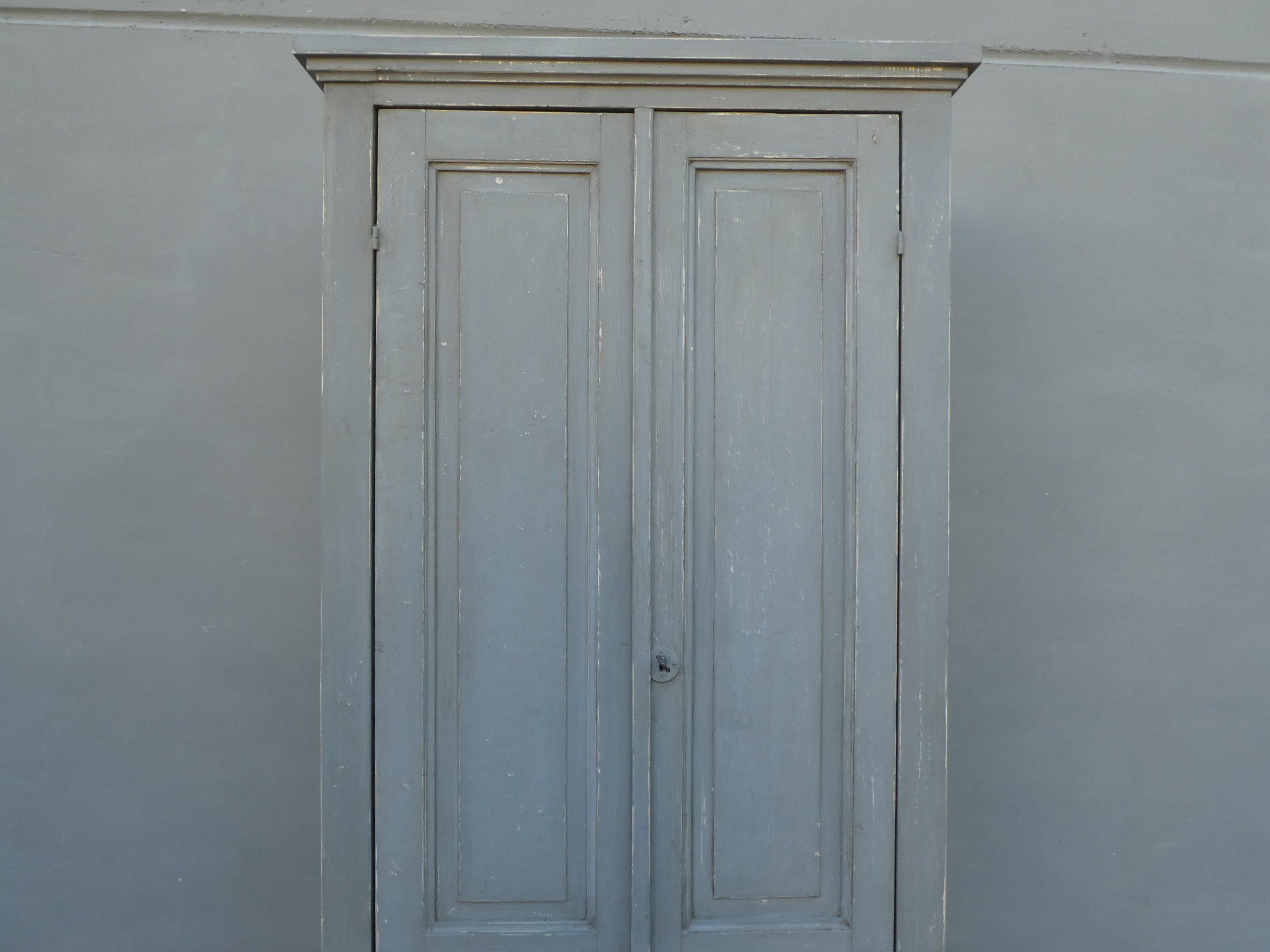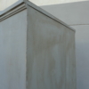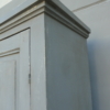 Armadio stipo dispensa a due ante, laccata e rifinita con la tecnica “Shabby Chic” che prevede l’uso di colori chiari in superificie e colori più scuri che affiorano dopo il trattamento d’usura. Il mobile si presenta semplice e lineare, e vanta proporzioni armoniose e sapientemente equilibrate. La ricerca di un decoro essenziale si riflette anche sulla scelta dei montanti, privi di elementi decorativi. All’interno dispone di tre ripiani. Recente ricostruzione con legno vecchio e legno nuovo.