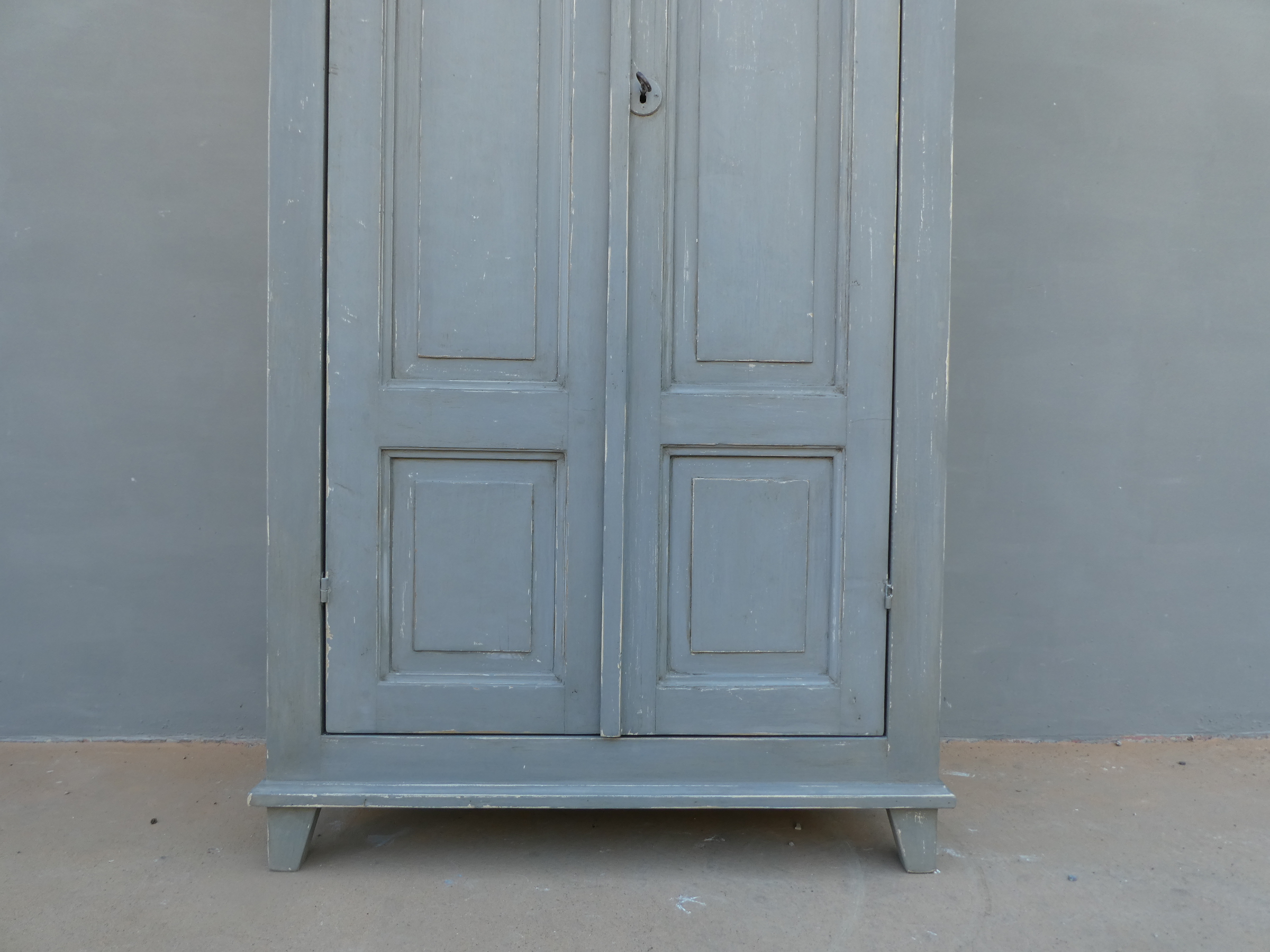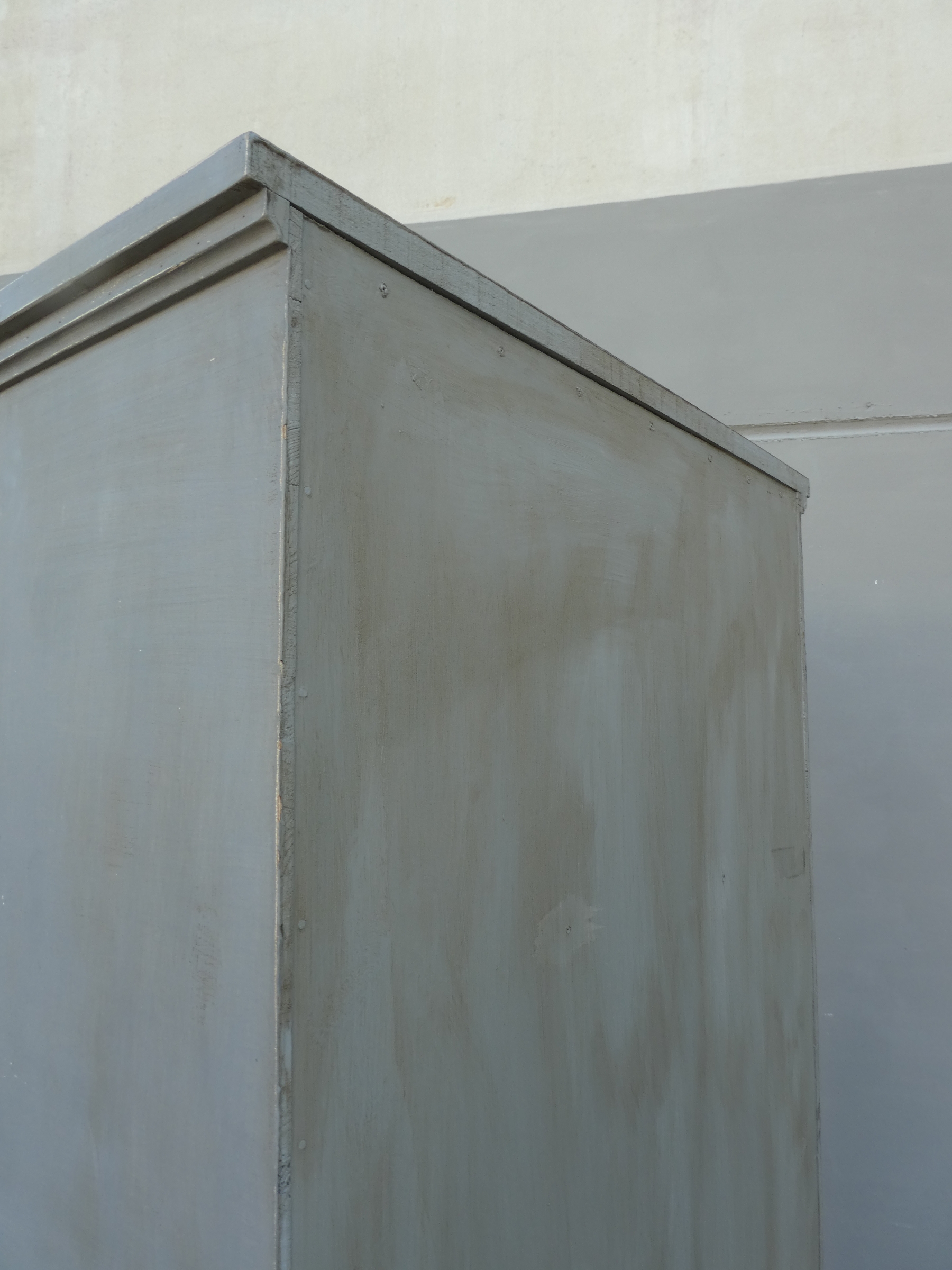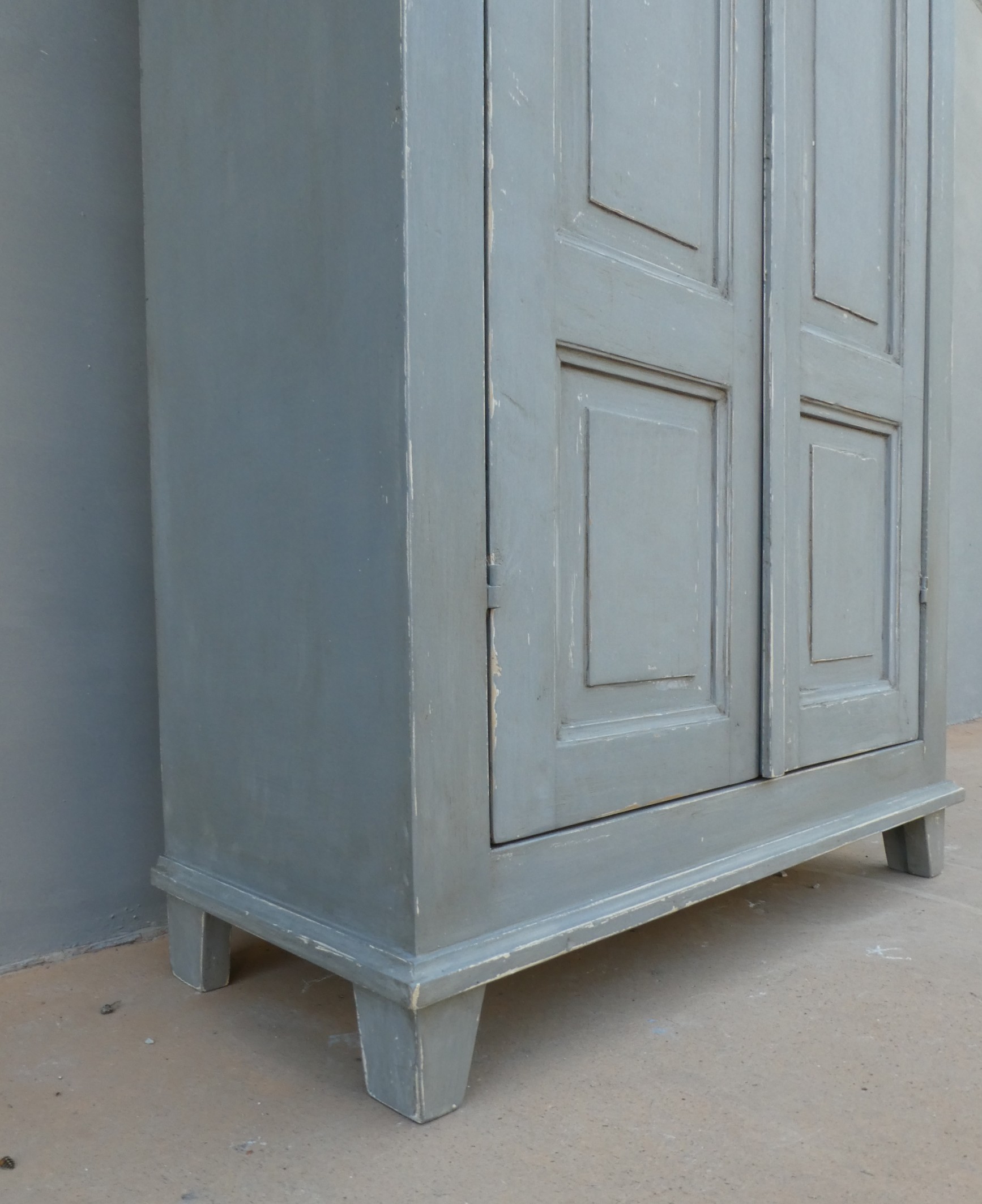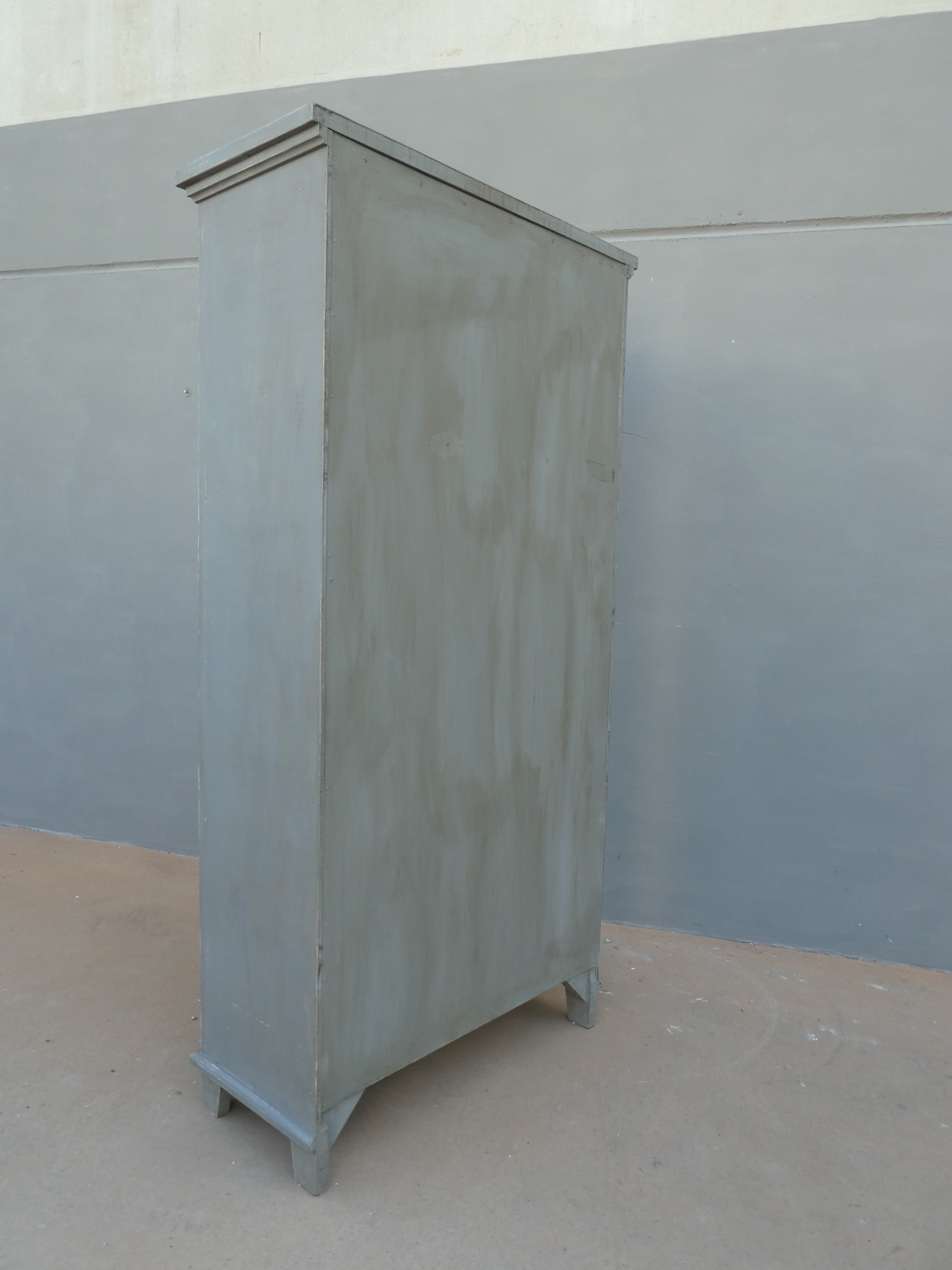 Armadio stipo dispensa a due ante, laccata e rifinita con la tecnica “Shabby Chic” che prevede l’uso di colori chiari in superificie e colori più scuri che affiorano dopo il trattamento d’usura. Il mobile si presenta semplice e lineare, e vanta proporzioni armoniose e sapientemente equilibrate. La ricerca di un decoro essenziale si riflette anche sulla scelta dei montanti, privi di elementi decorativi. All’interno dispone di tre ripiani. Recente ricostruzione con legno vecchio e legno nuovo.