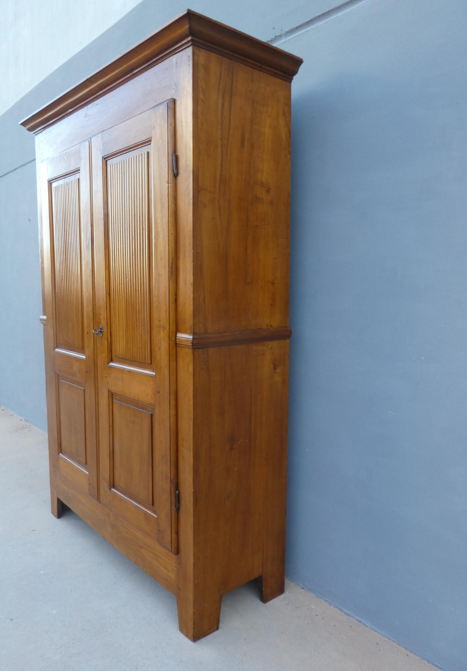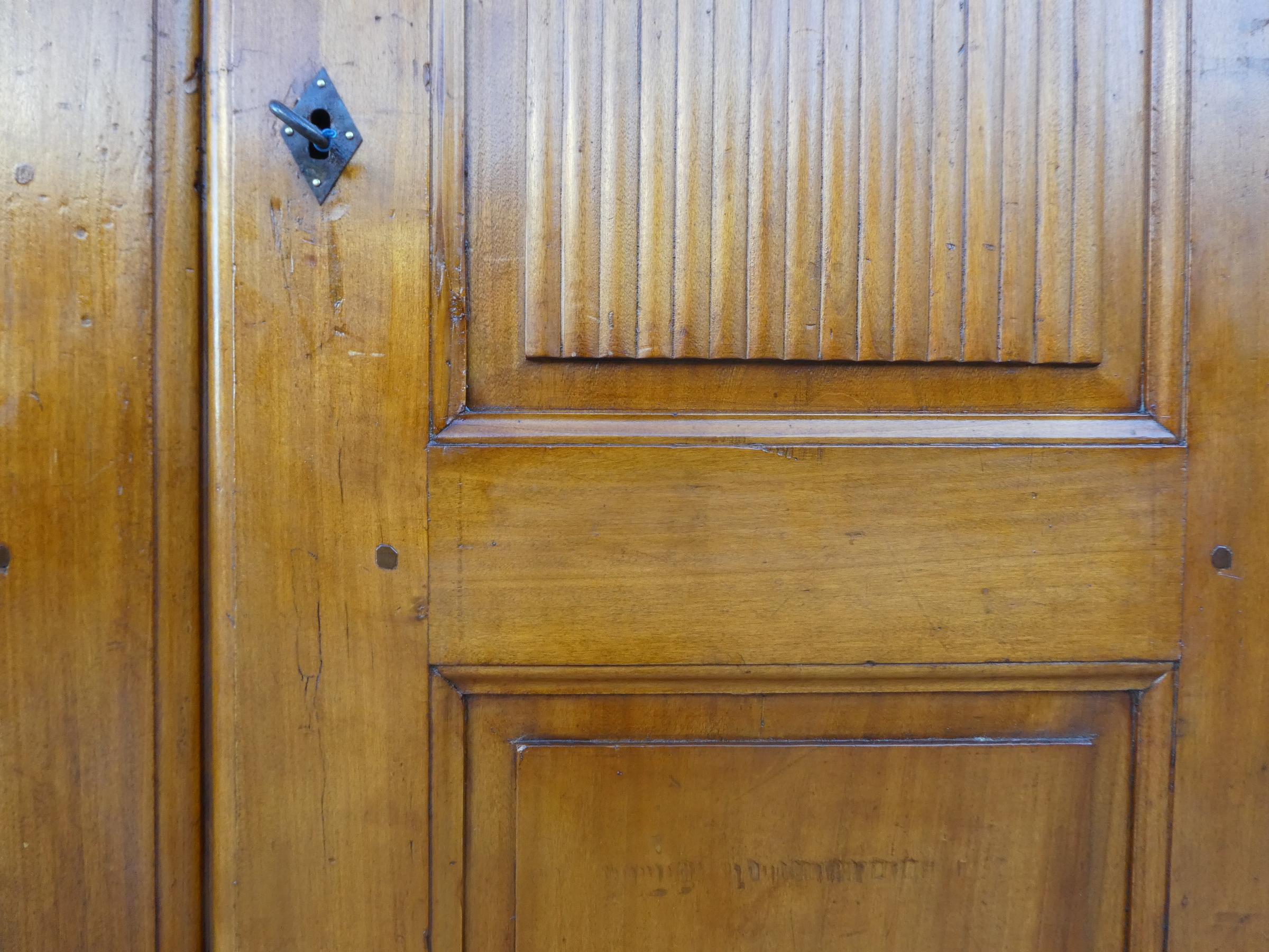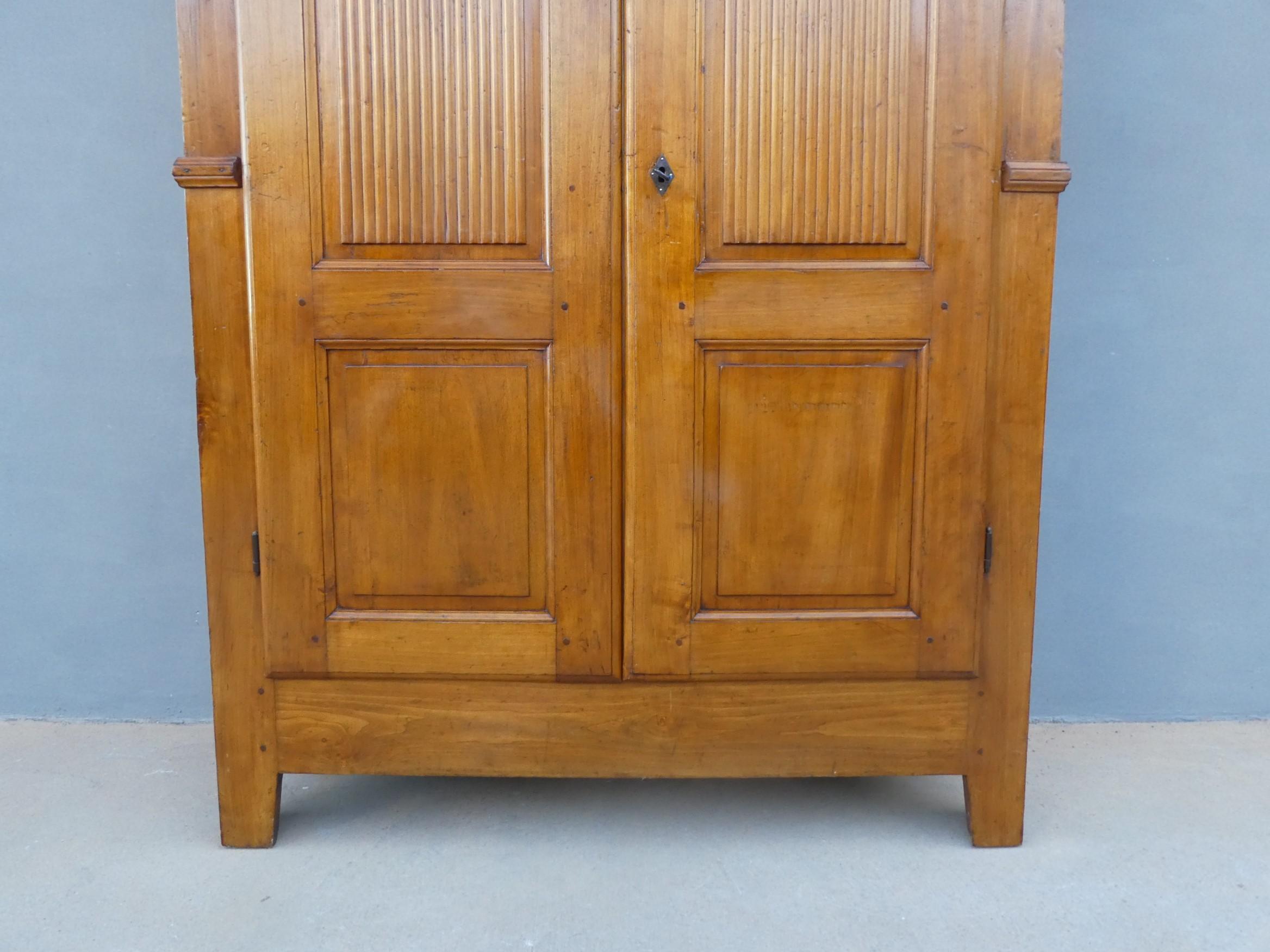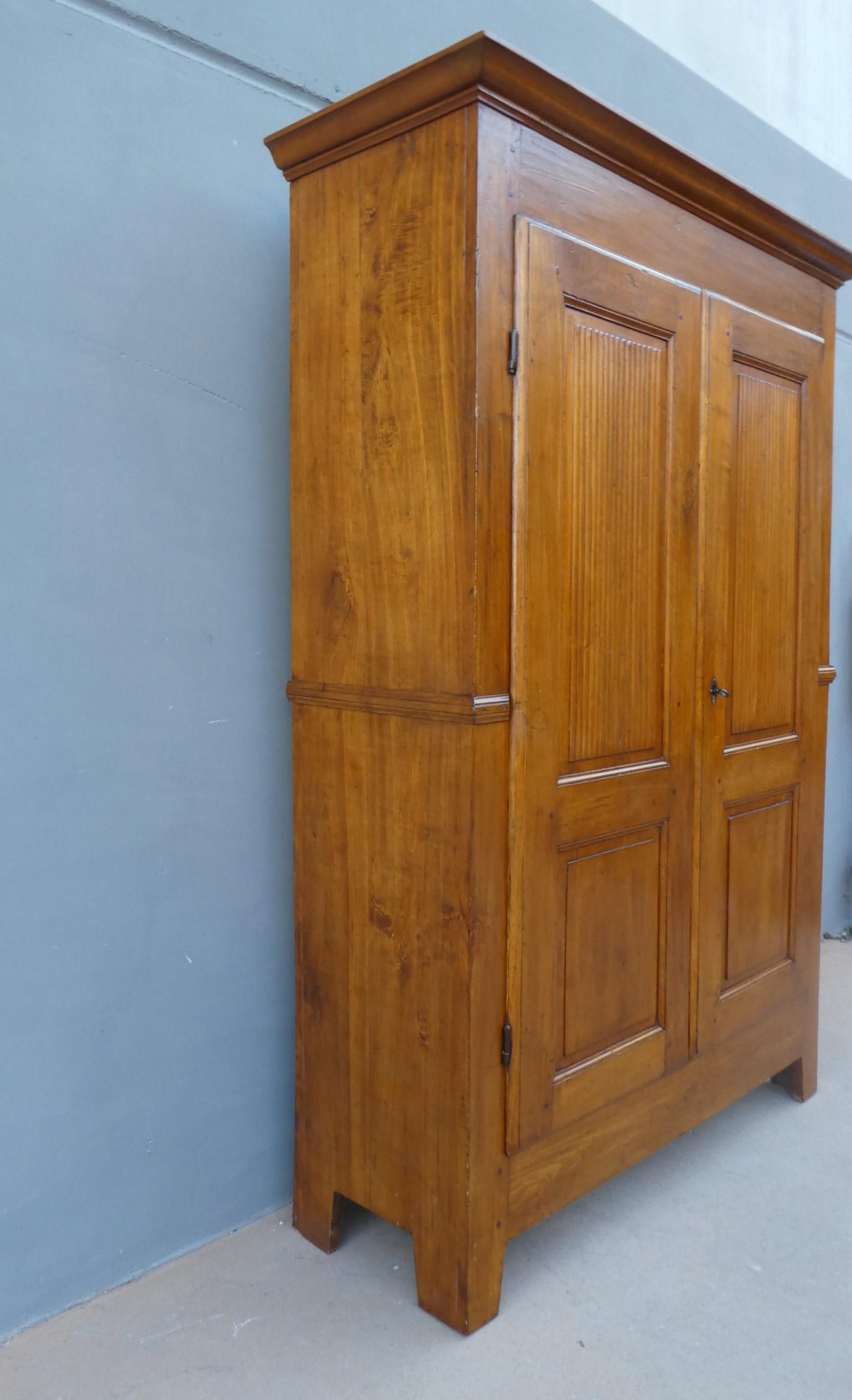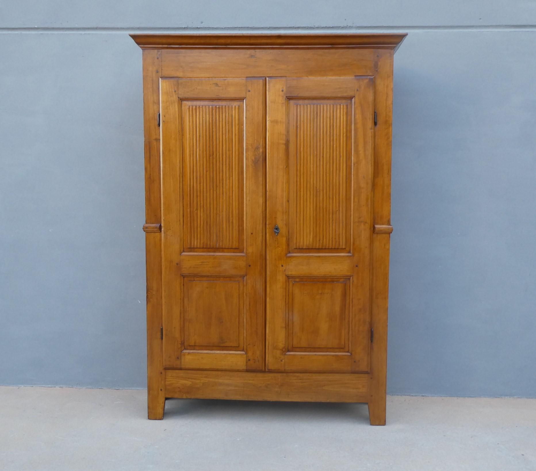 Antico armadio stipo corredato da due ante frontali, realizzato in legno di pioppo ed appartenente d’epoca alla metà dell’ 800. Il mobile si presenta semplice e lineare, e vanta proporzioni armoniose e sapientemente equilibrate. Ciò che lo contraddistingue è indubbiamente la basica lavorazione “grissinata” sui pannelli delle ante, caratteristica dello stile. Dispone di ripiani interni ed una barra appendiabiti laterale. Smontabile in due corpi. Necessita di leggeri interventi di restauro (foto).