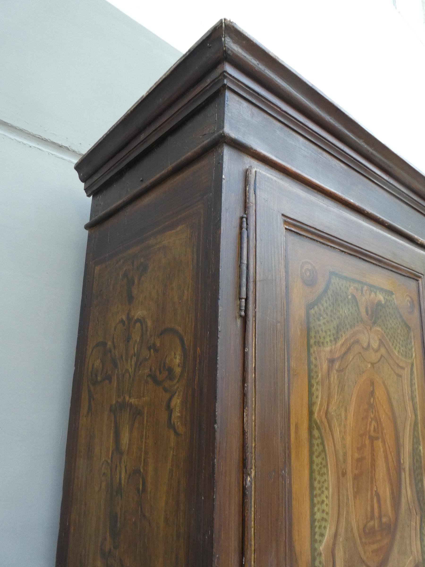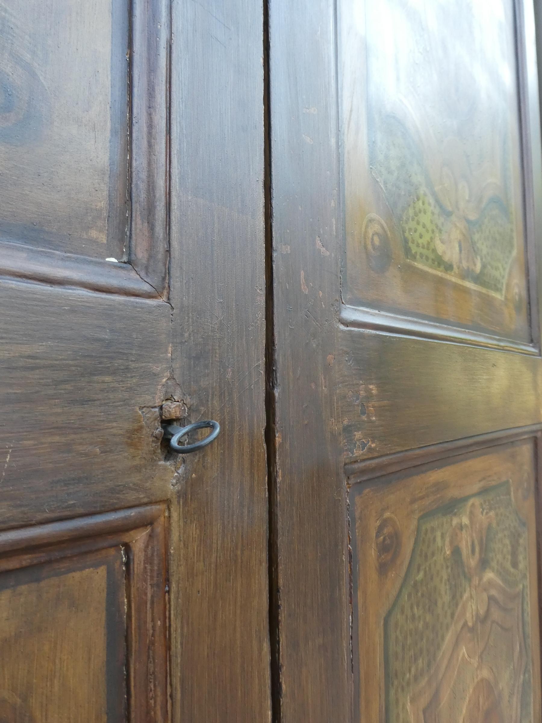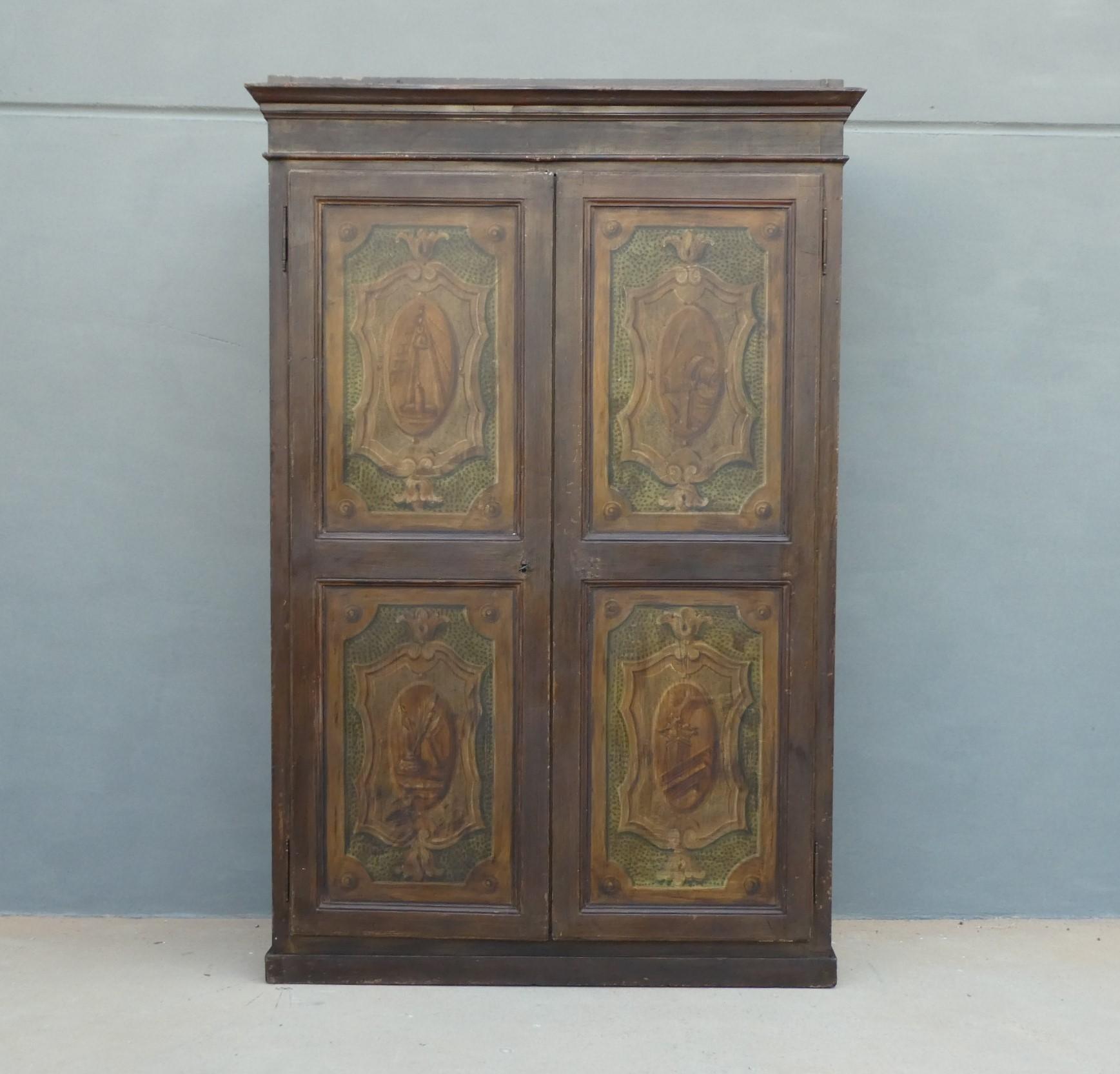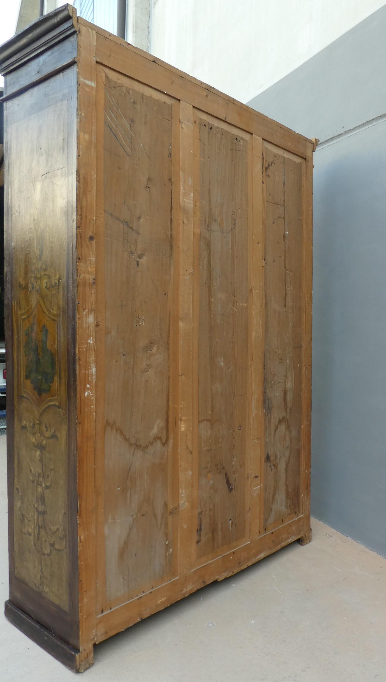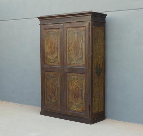 Armadio stipo corredato da due ante frontali ed appartenente d’epoca alla fine dell’800. Semplice ed essenziale nella linea, è arricchito da colorati dipinti che spiccano contrastanti sull’elegante superficie laccata che fa da sfondo. Necessita di qualche interventi di restauro (foto) – non è smontabile.