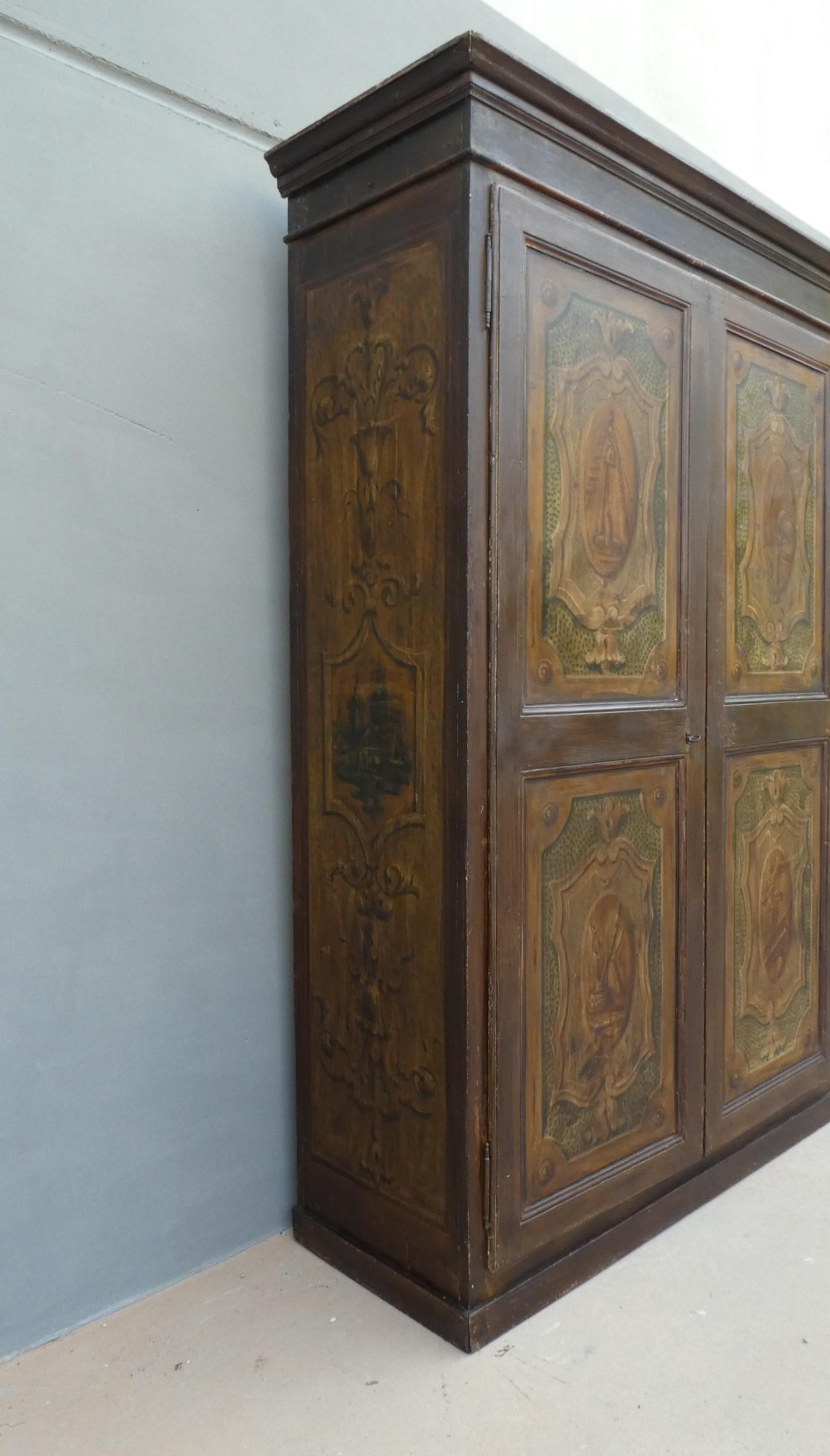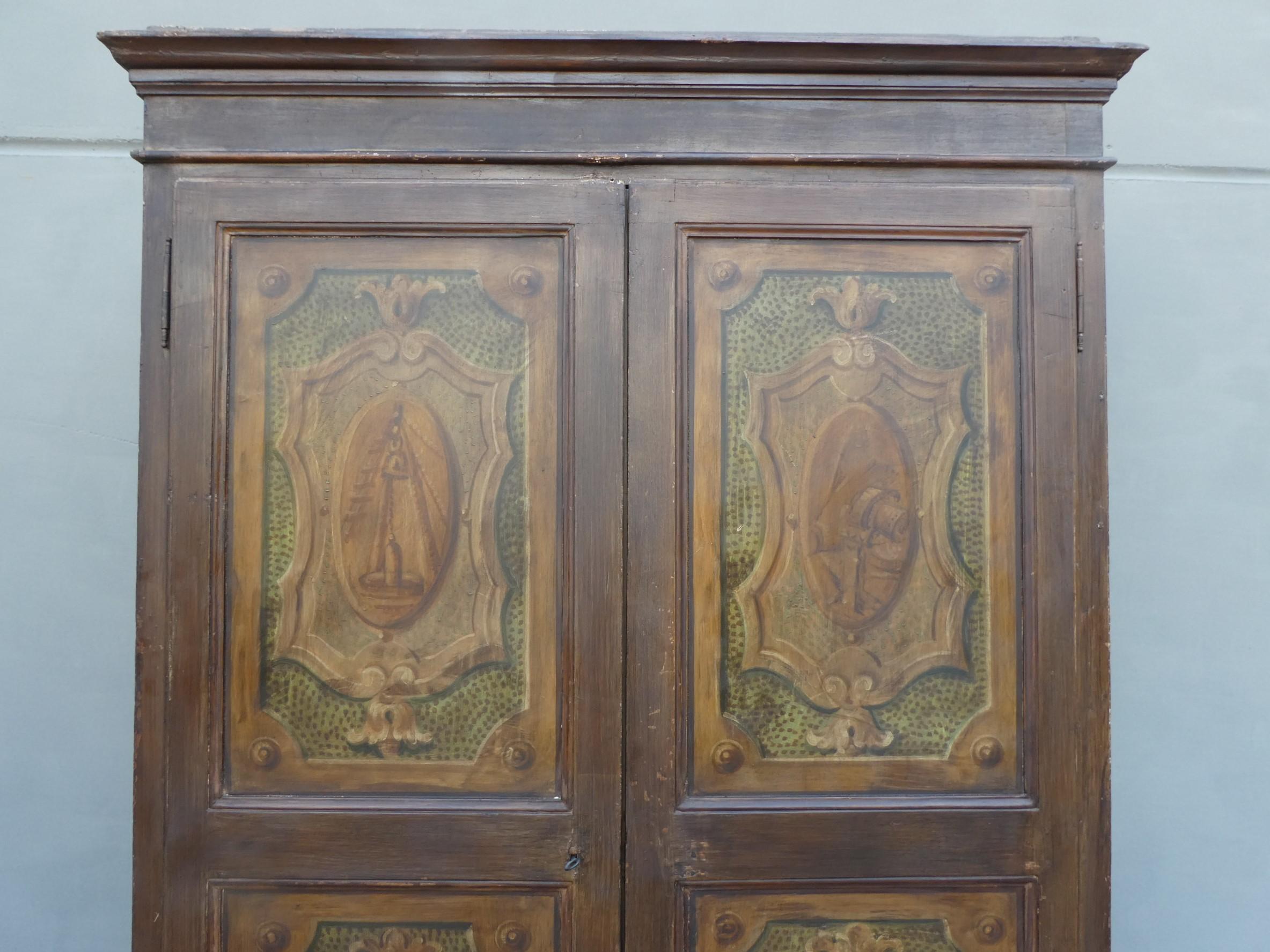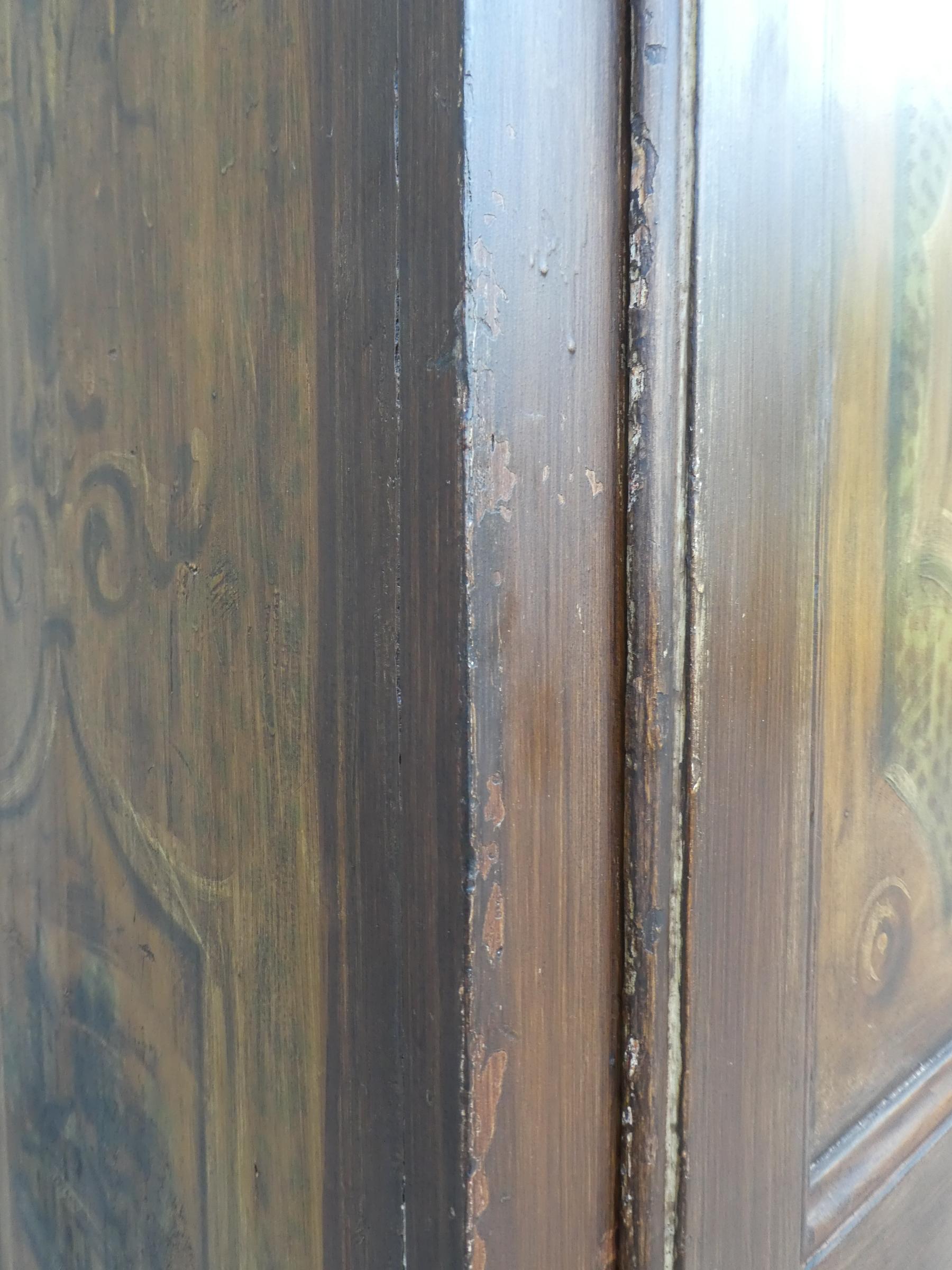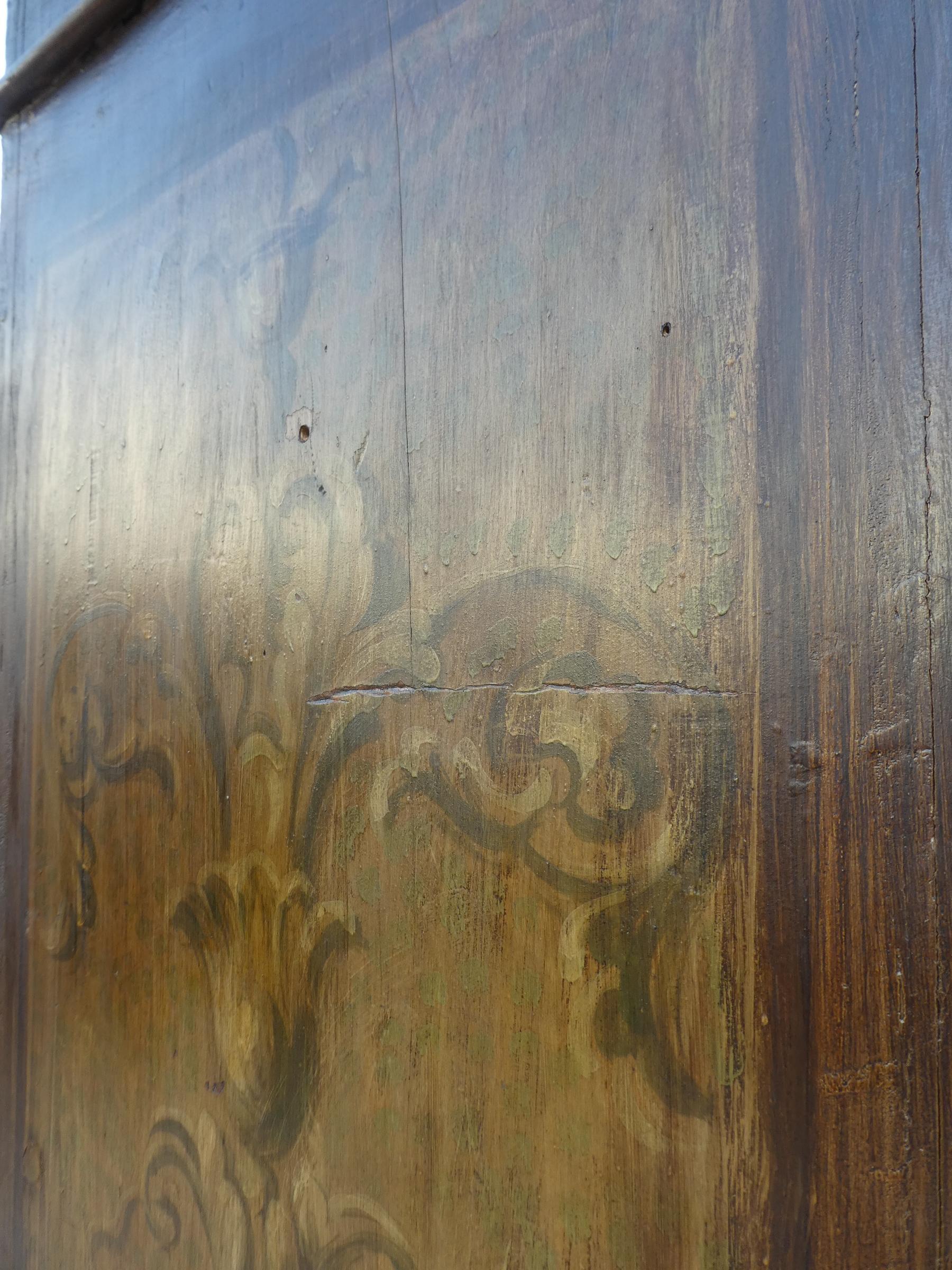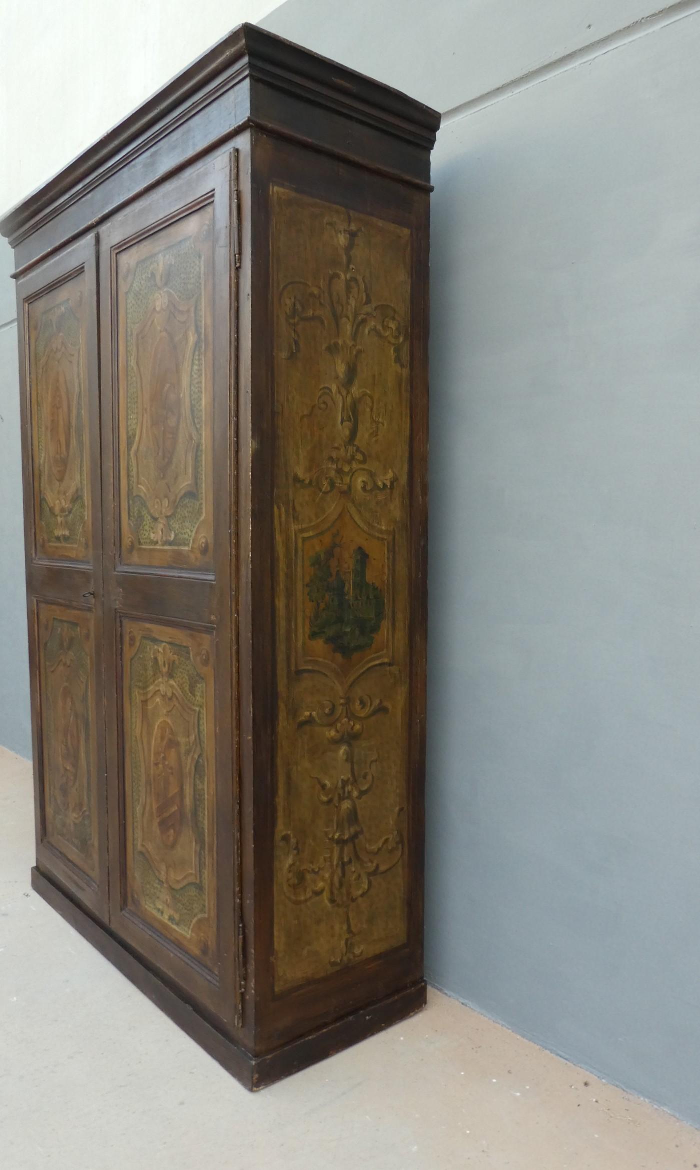 Armadio stipo corredato da due ante frontali ed appartenente d’epoca alla fine dell’800. Semplice ed essenziale nella linea, è arricchito da colorati dipinti che spiccano contrastanti sull’elegante superficie laccata che fa da sfondo. Necessita di qualche interventi di restauro (foto) – non è smontabile.