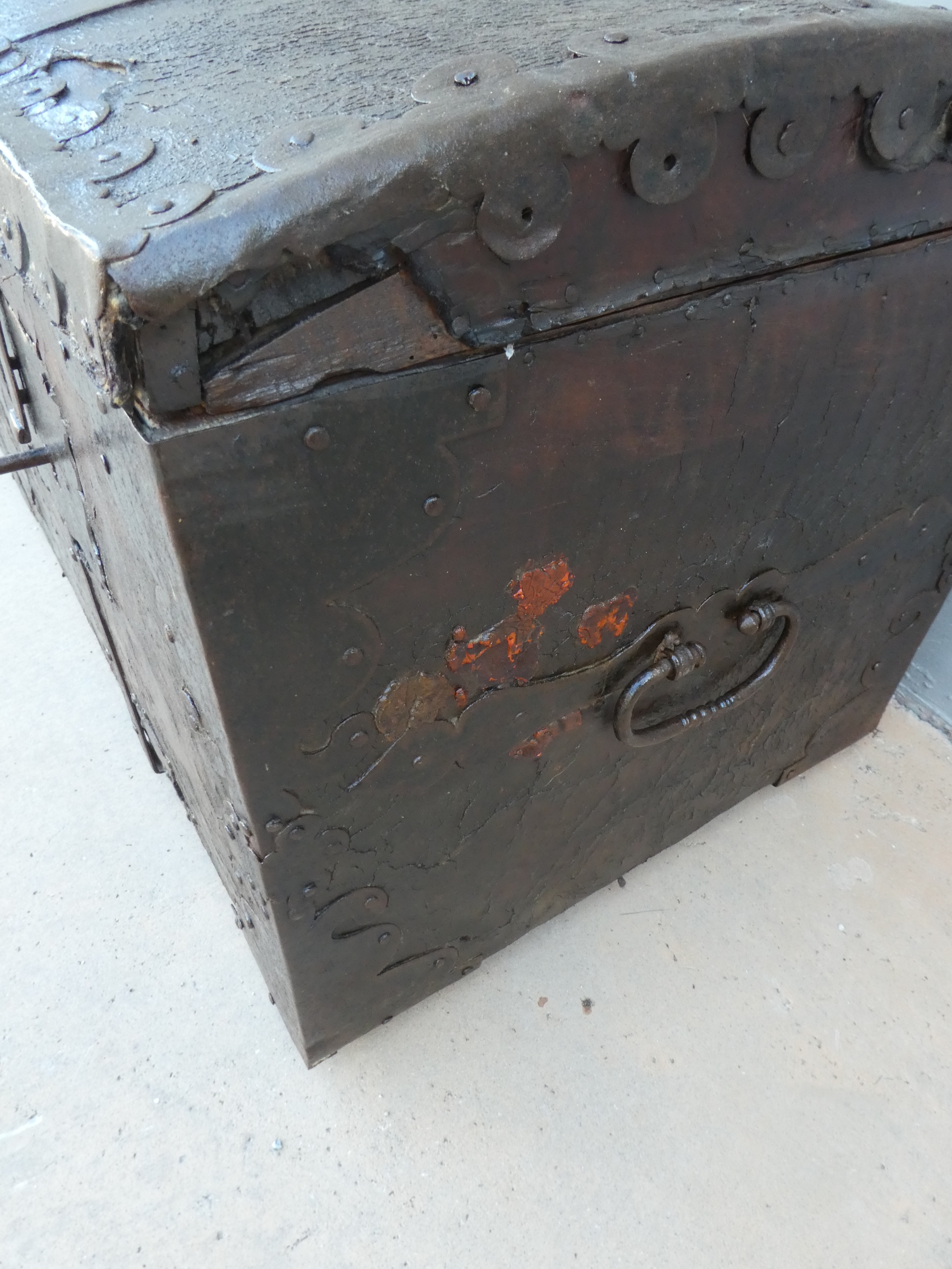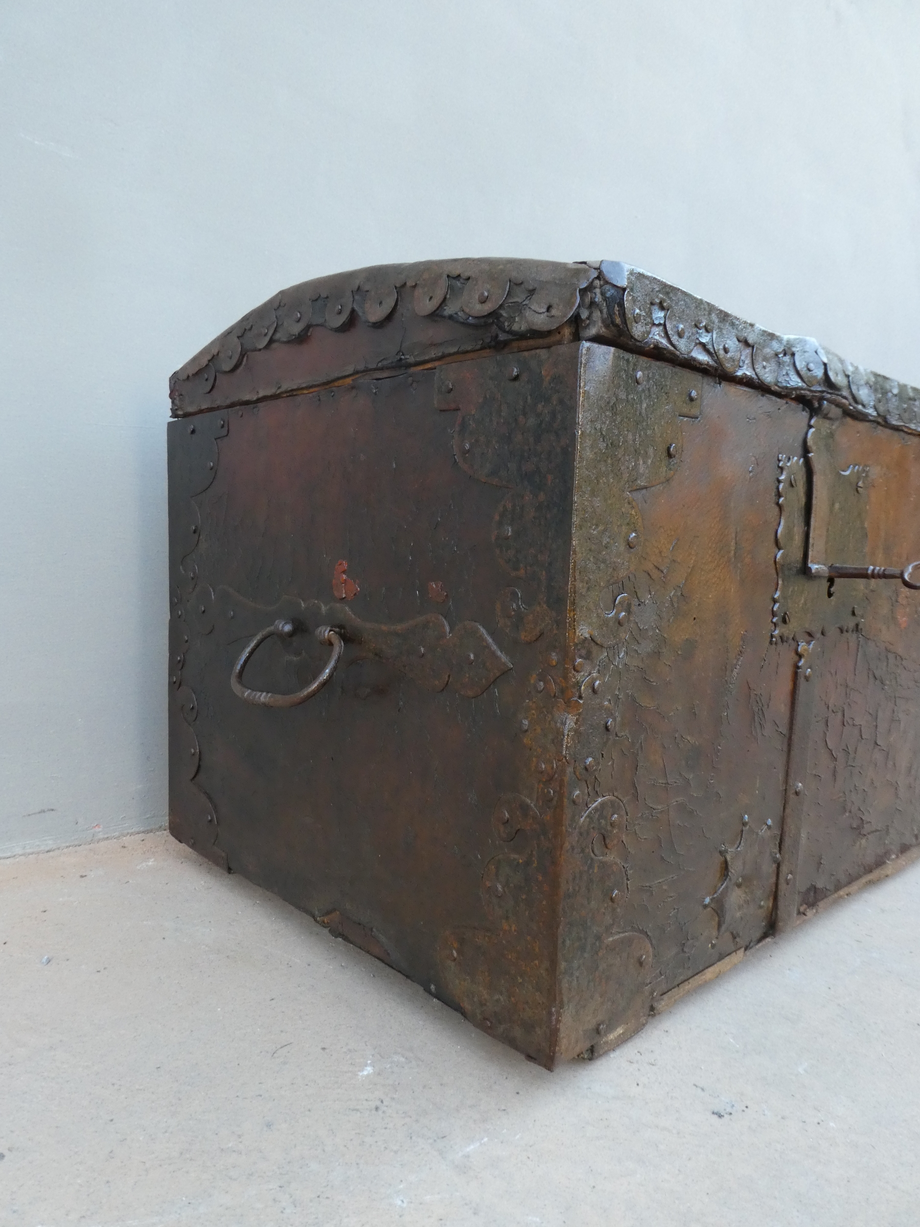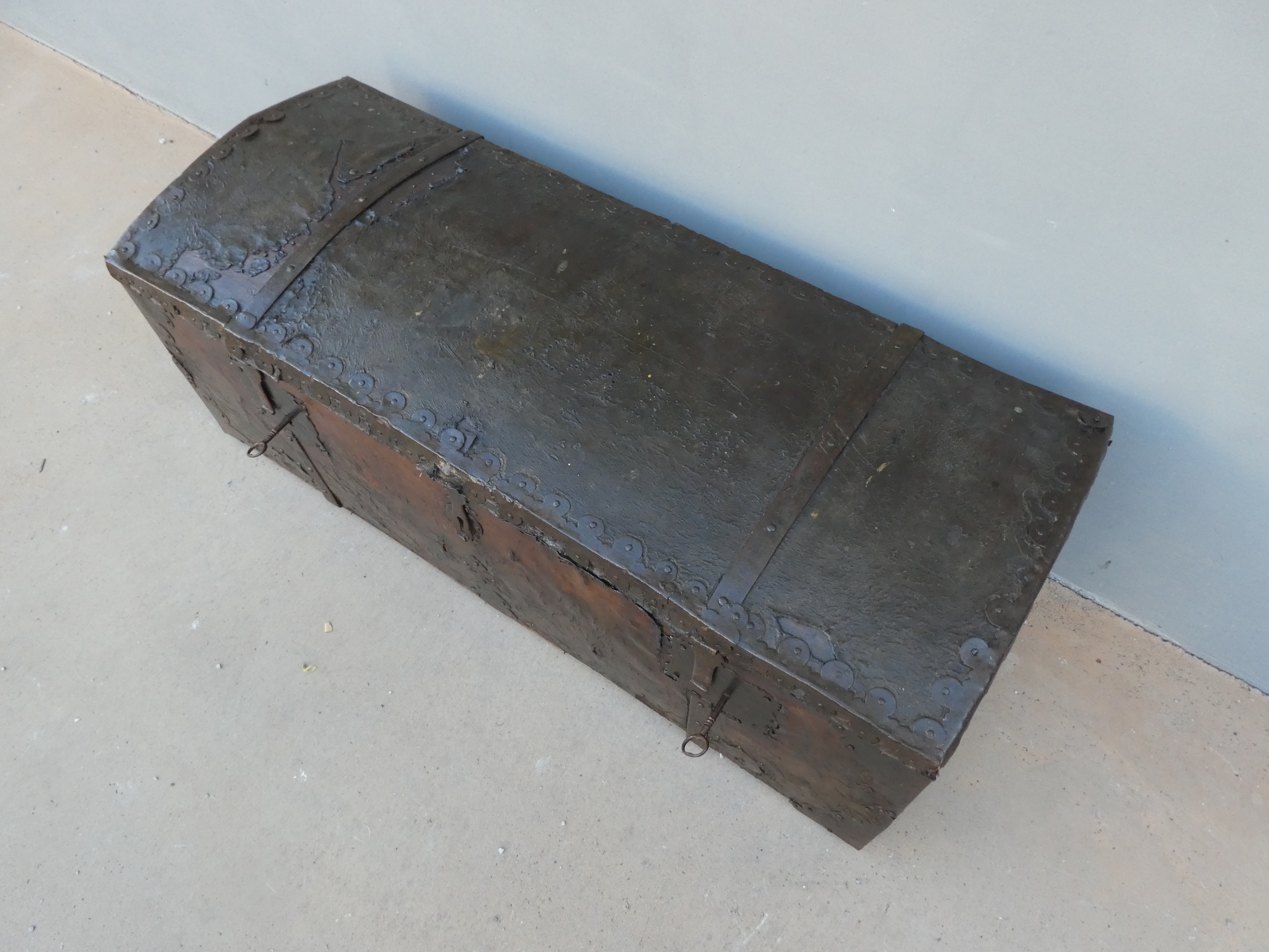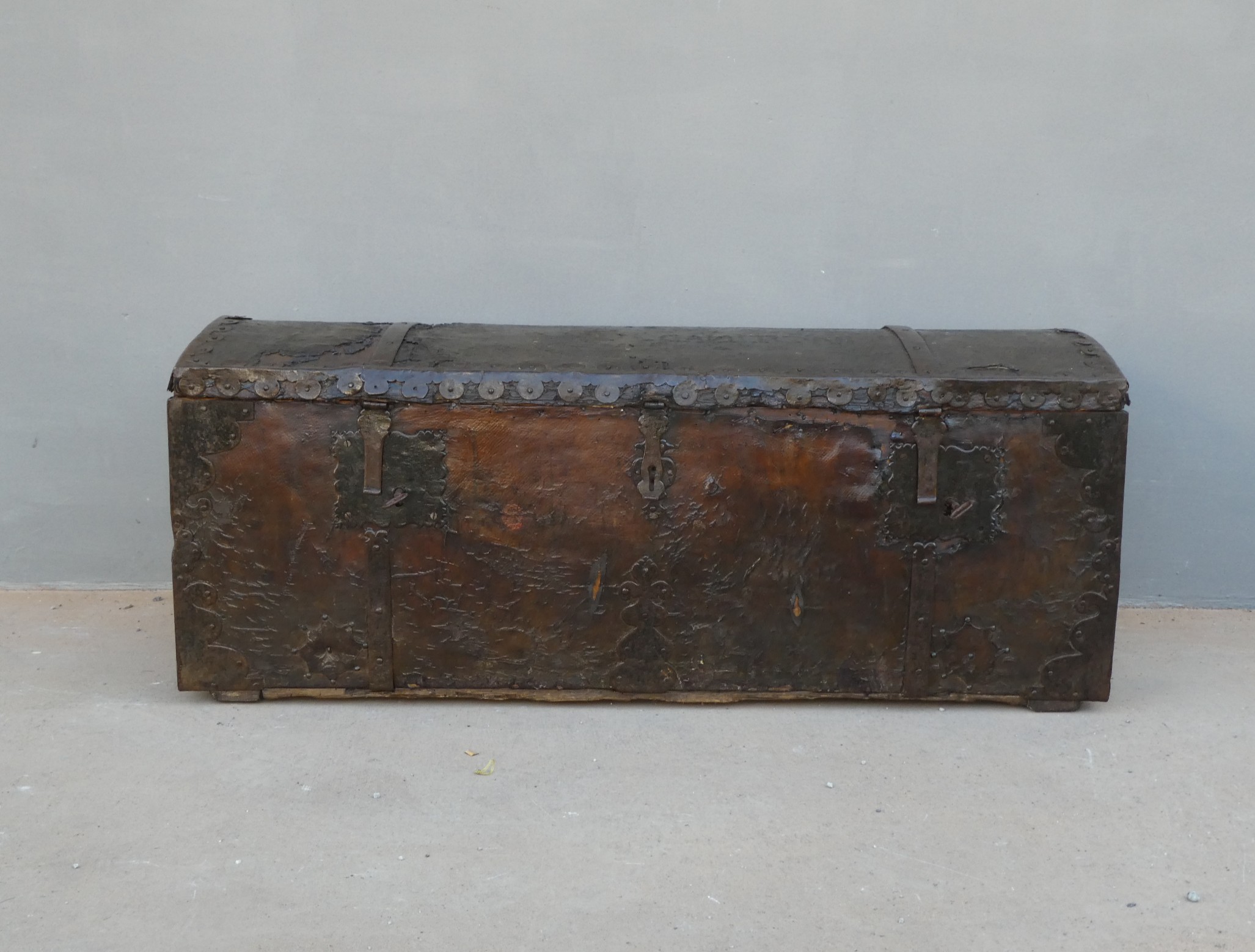 Baule cassapanca contenitore rivestito in pelle, dotato di un piano apribile e due maniglie laterali, epoca ‘800. Si propone come versatile ed esclusivo elemento d’arredo, capace di dar un tocco d’originalità a qualsiasi ambiente. Necessita di alcuni interventi di restauro (foto).