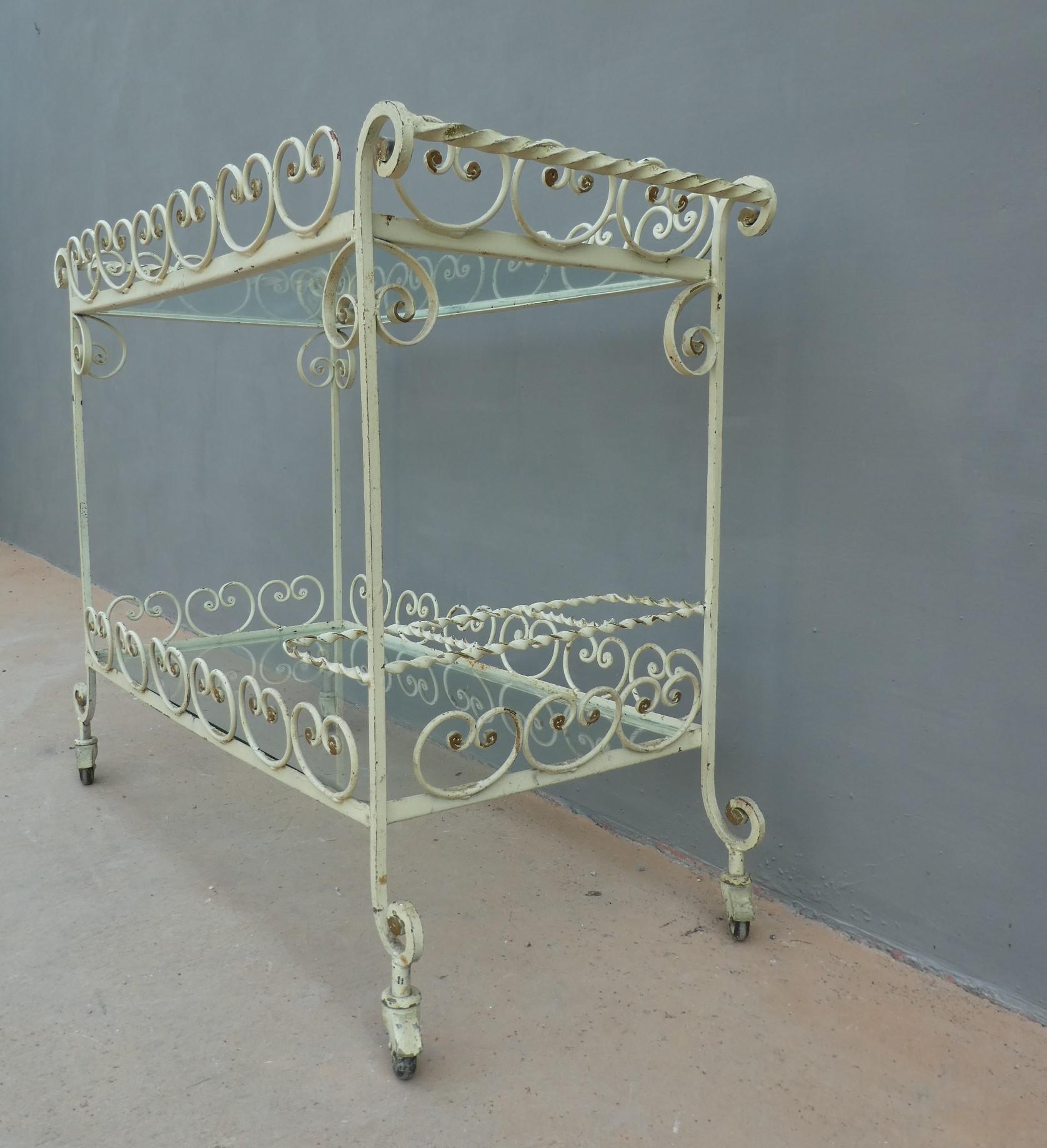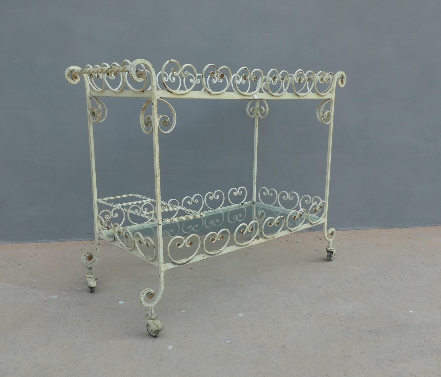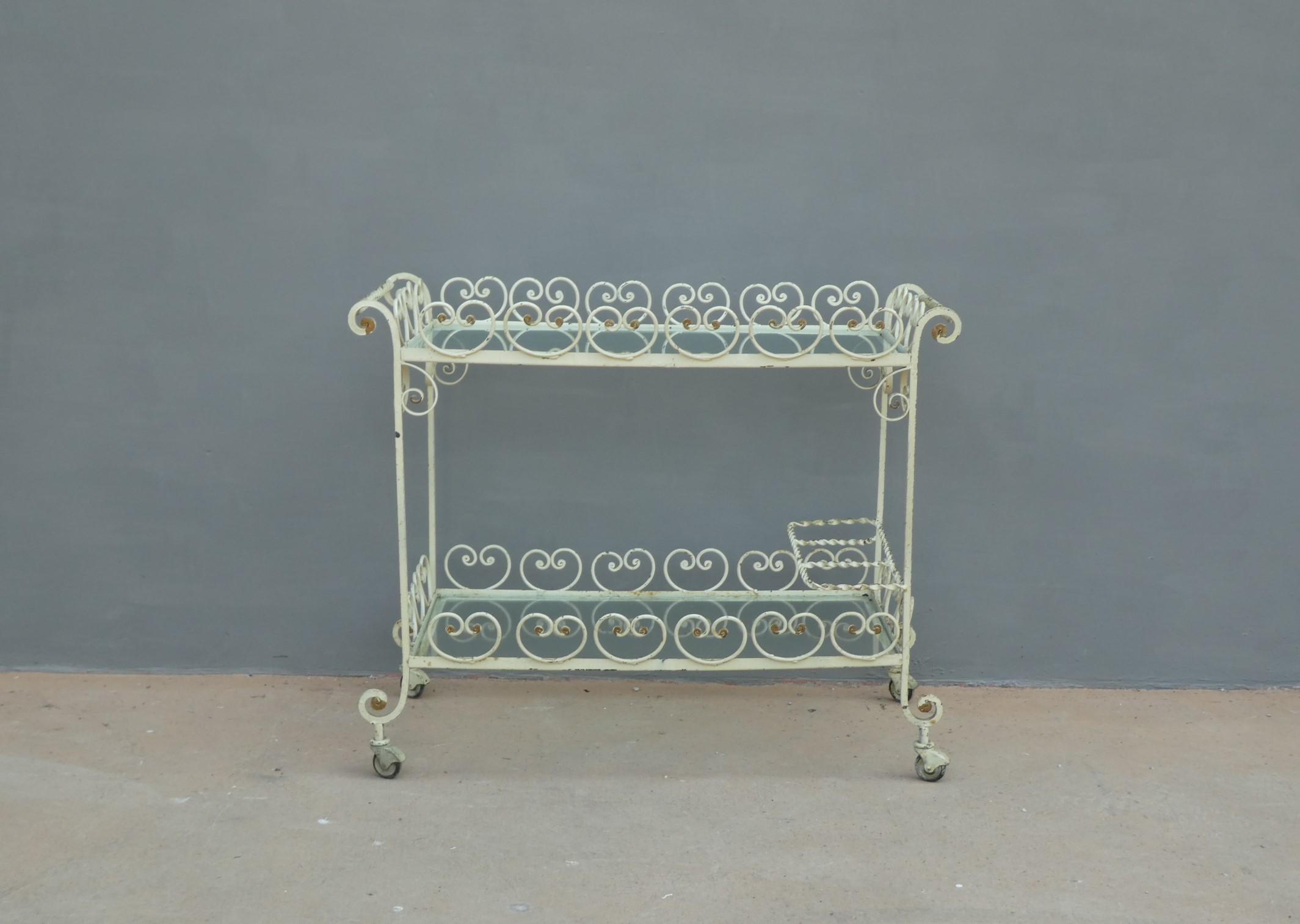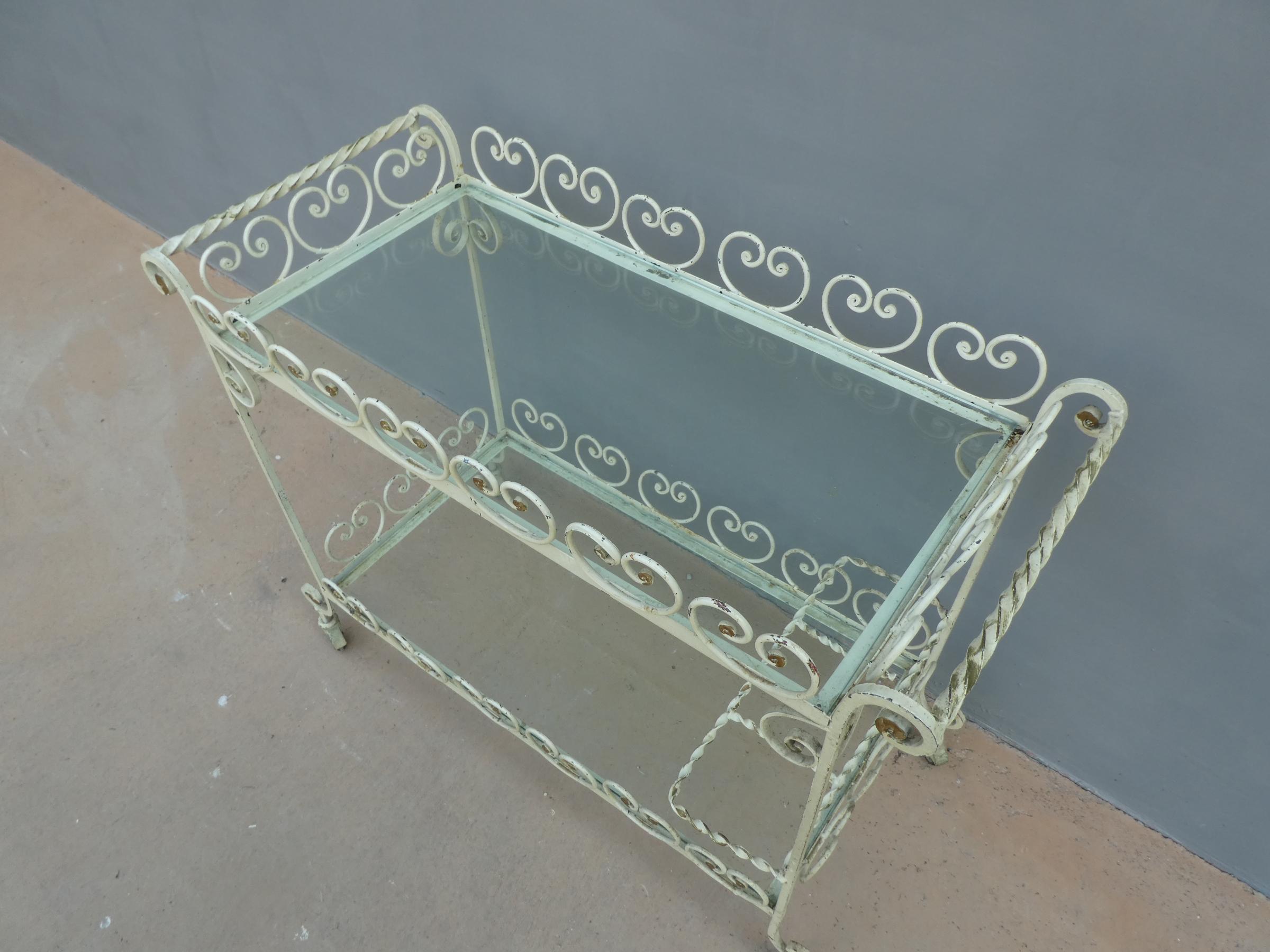 Tavolino rettangolare carrello portabevande con rotelle e doppio piano d’appoggio in vetro (removibile), adatto sia agli ambienti esterni che interni ed appartenente d’epoca alla metà del ‘900 – anni ‘60. Presenta qualche segno d’usura – il vetro è scheggiato in due diversi punti.