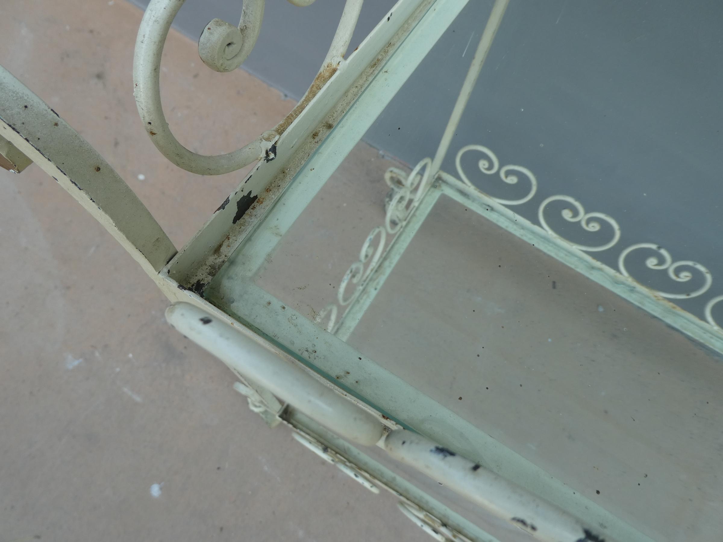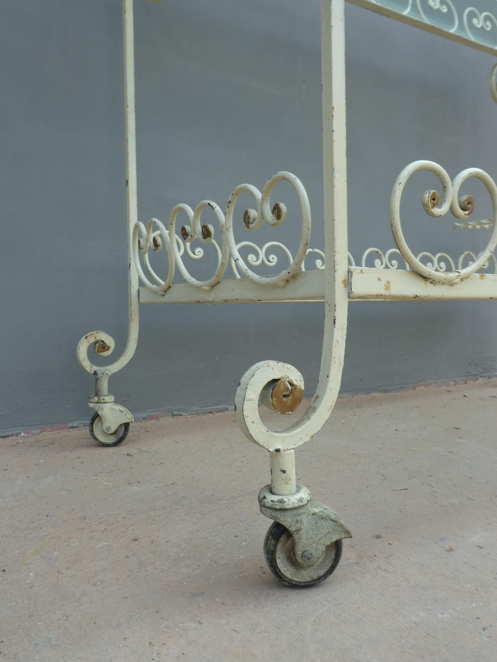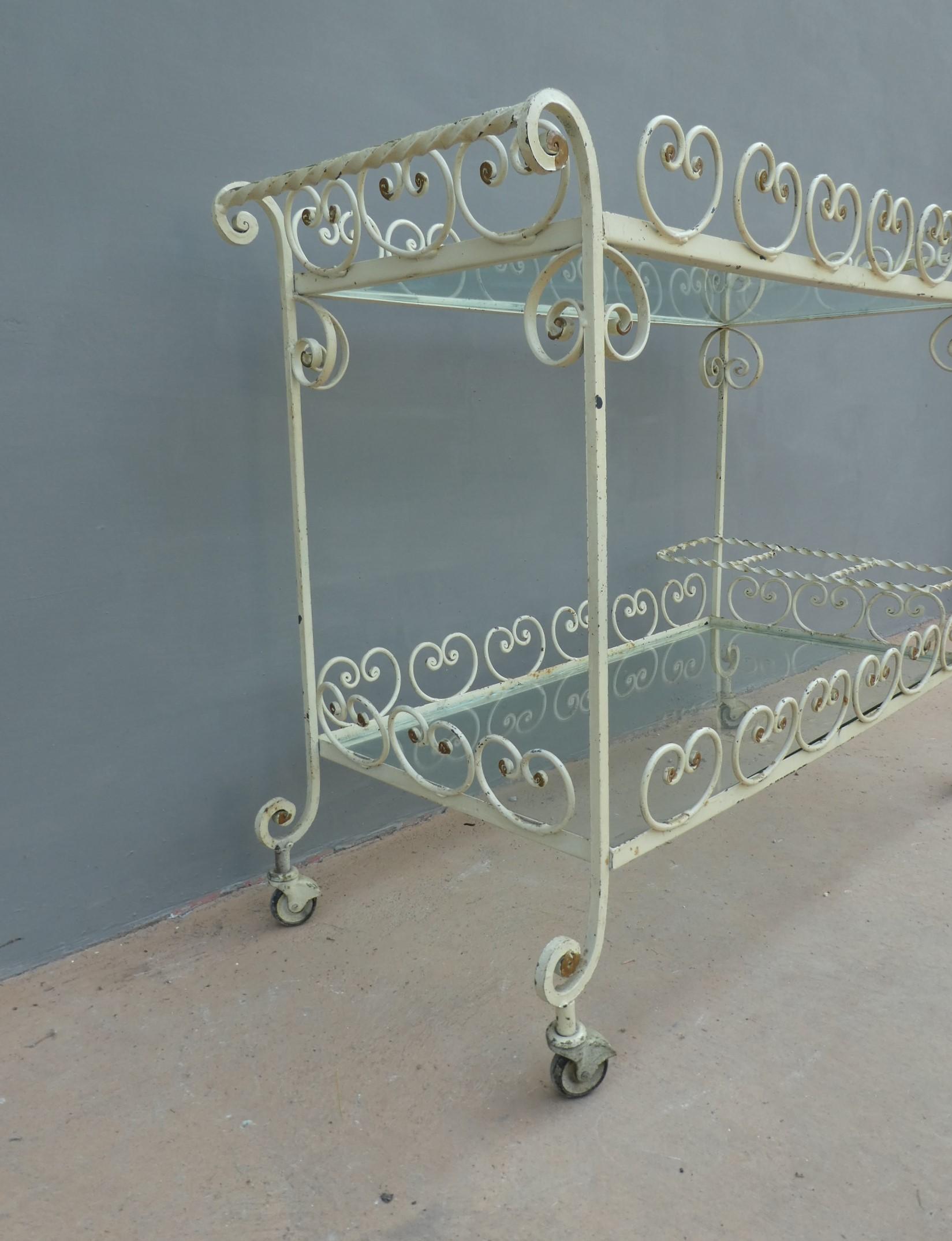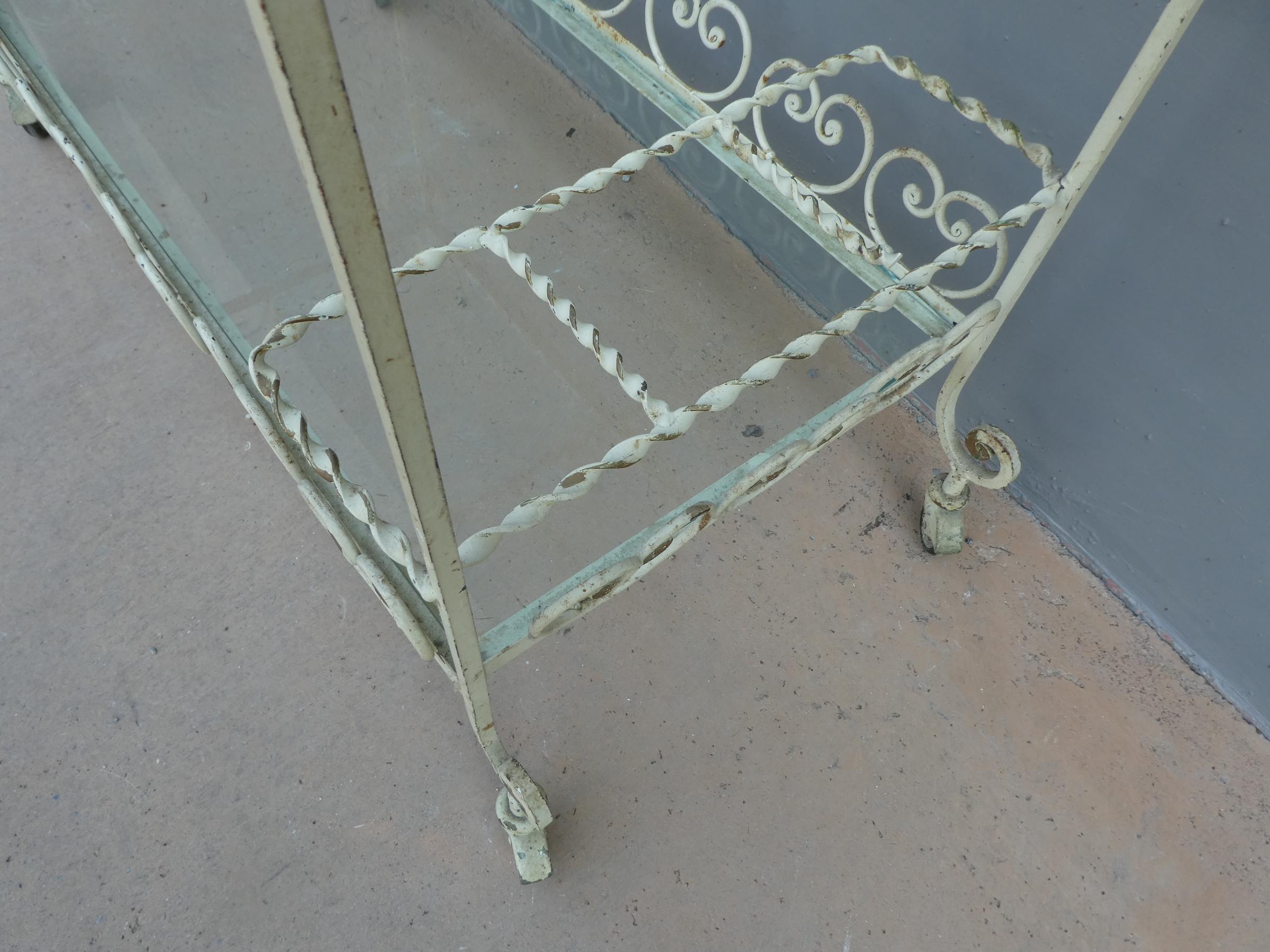Tavolino rettangolare carrello portabevande con rotelle e doppio piano d’appoggio in vetro (removibile), adatto sia agli ambienti esterni che interni ed appartenente d’epoca alla metà del ‘900 – anni ‘60. Presenta qualche segno d’usura – il vetro è scheggiato in due diversi punti.