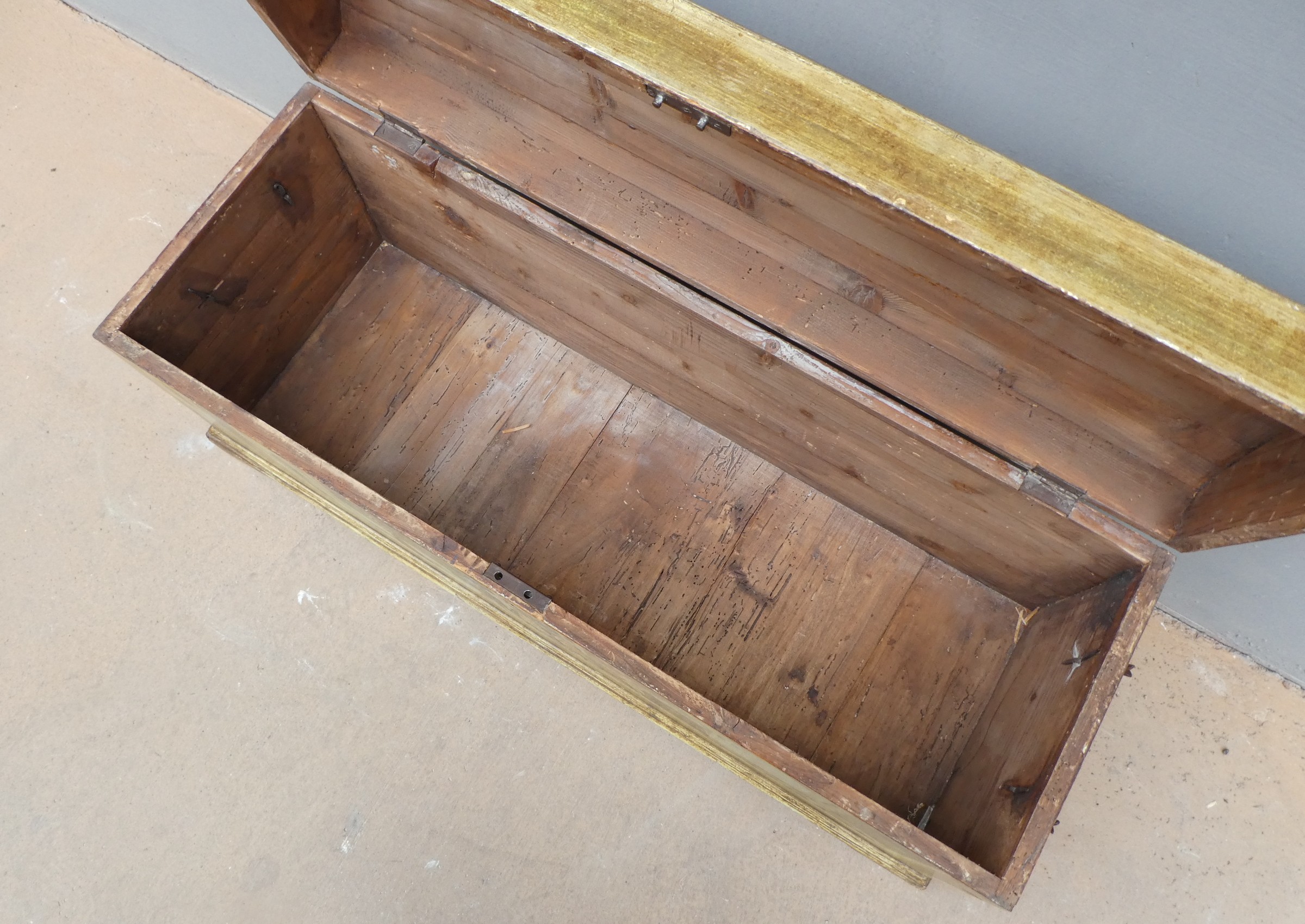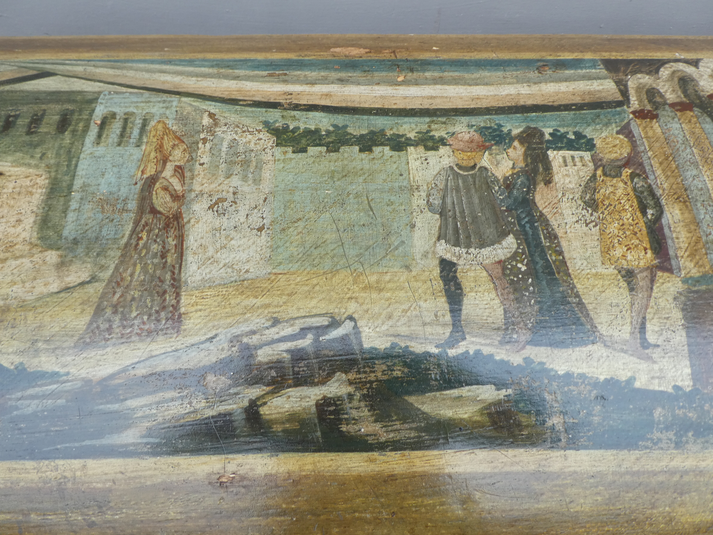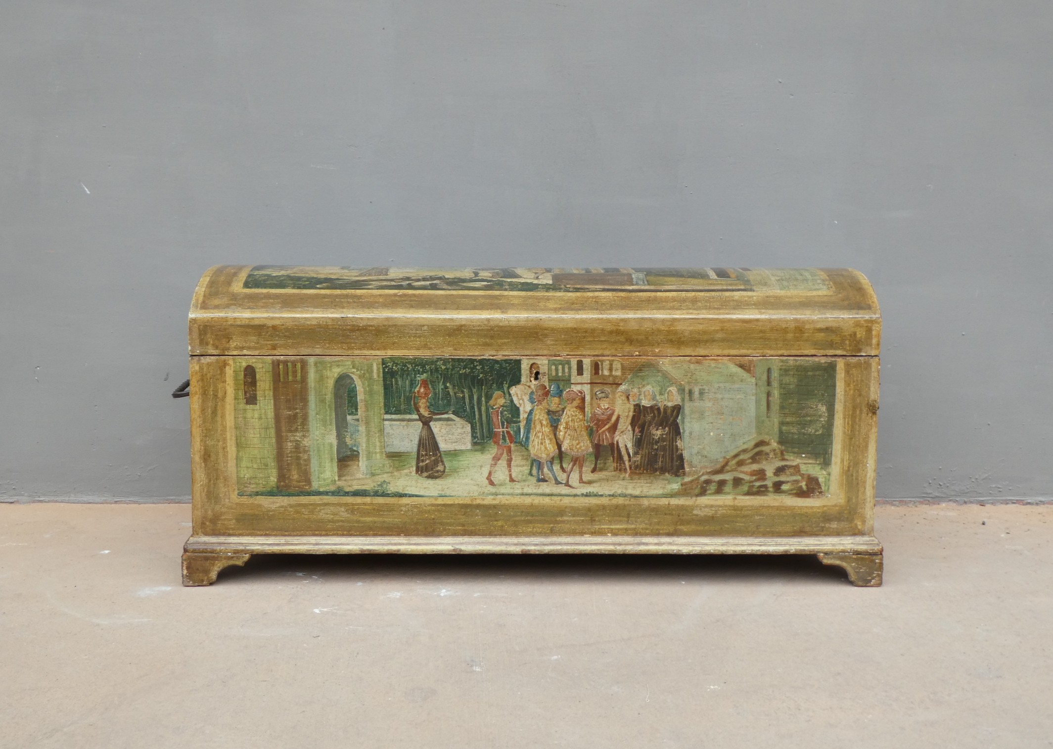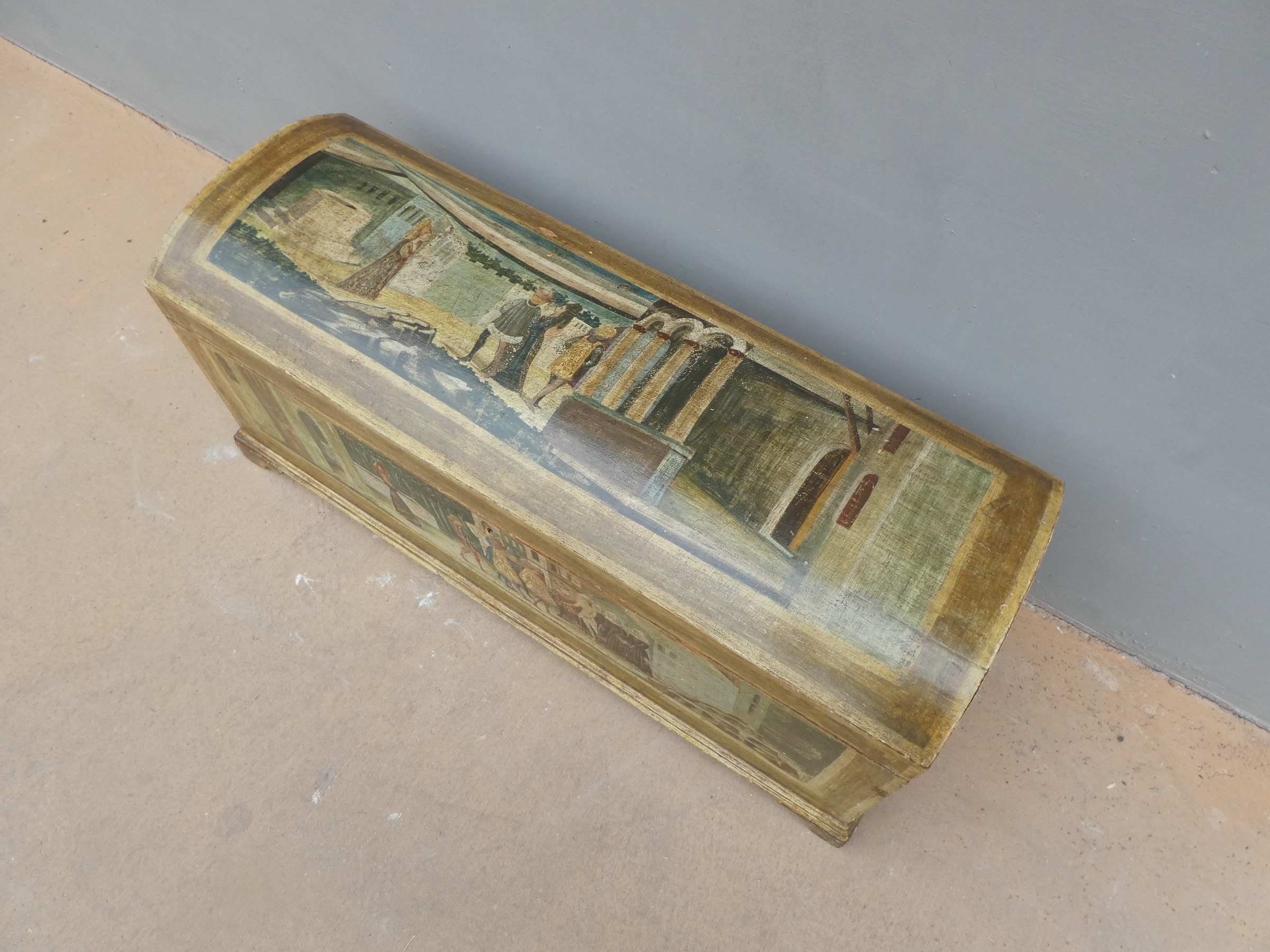 Cassapanca dipinta baule contenitore dotato di un piano apribile ed appartanente d’epoca alla metà del ‘900. Il mobile presenta una decorazione policroma con scene dipinte, che raffigurano figure in ambientazioni storiche o narrative. La presenza di maniglie laterali in ferro suggerisce la sua natura di mobile “trasportabile”. Presenta qualche segno d’usura – foto.