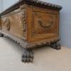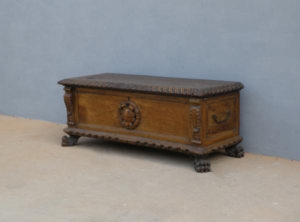 Cassapanca panca Barocca lombarda realizzata in legno massello di noce, dotata di due maniglie laterali ed appartenente d’epoca al XVII secolo. Solido e maestoso nella linea, il mobile ottiene il suo effetto decorativo grazie al gusto scultoreo degli intagli e all’uso di elementi decorativi, come la lavorazione centrale, caratteristica dello stile. Necessita d’interventi di restauro conservativo.
