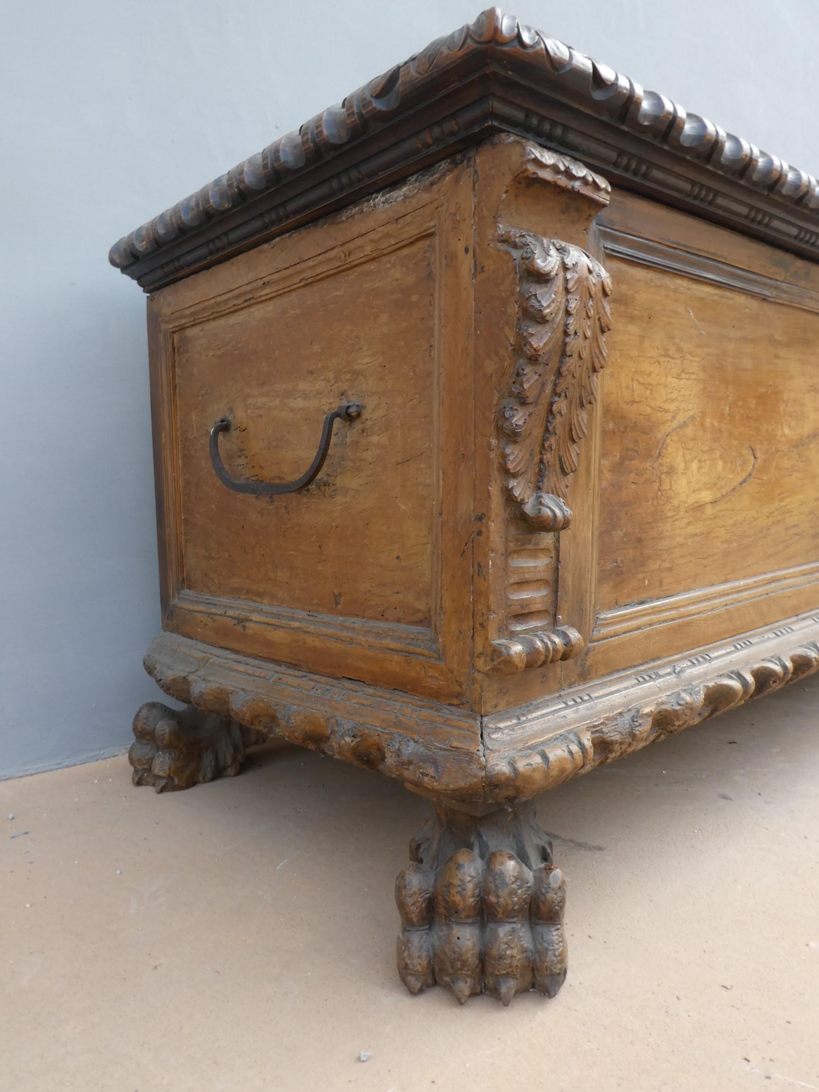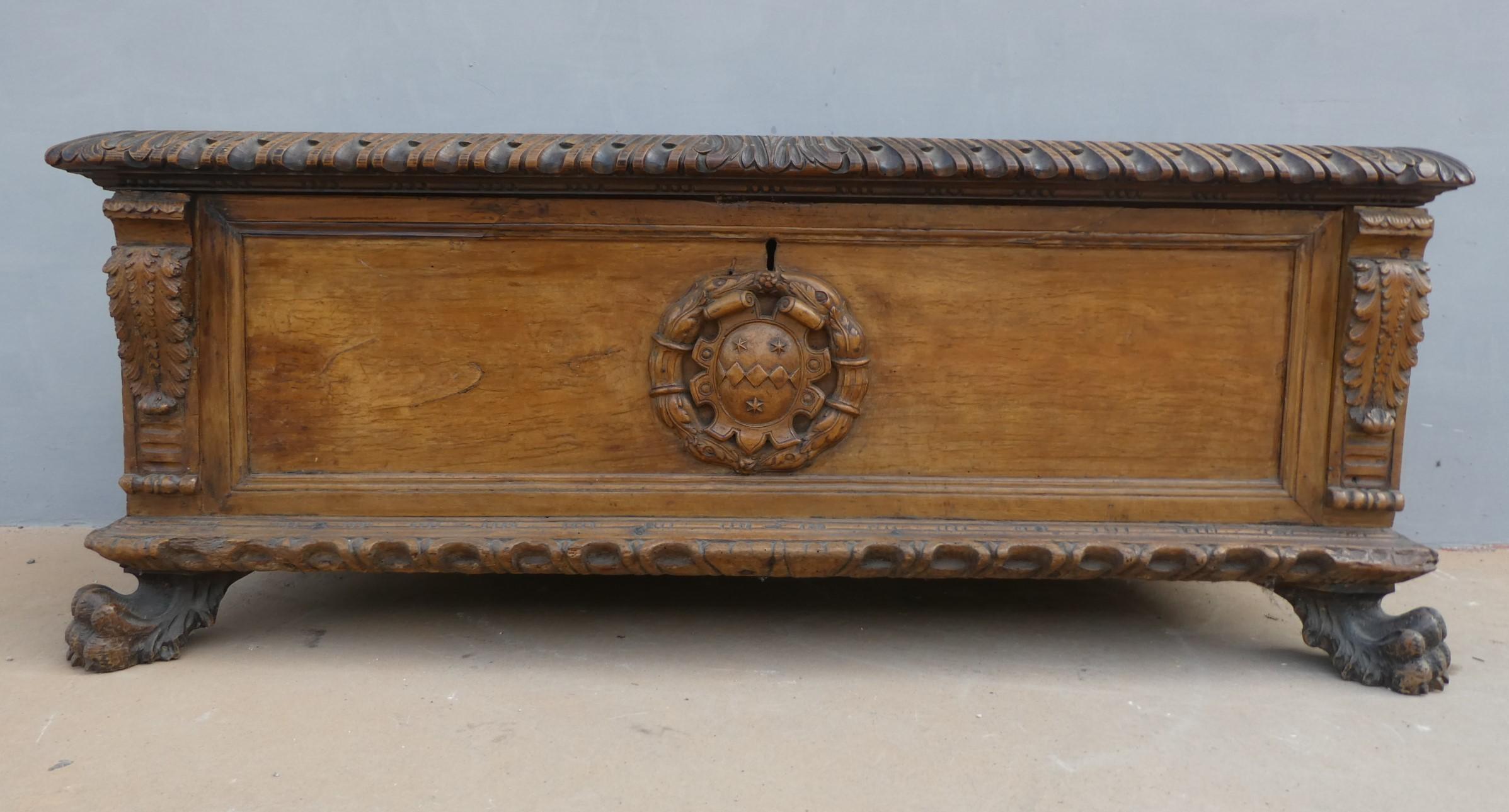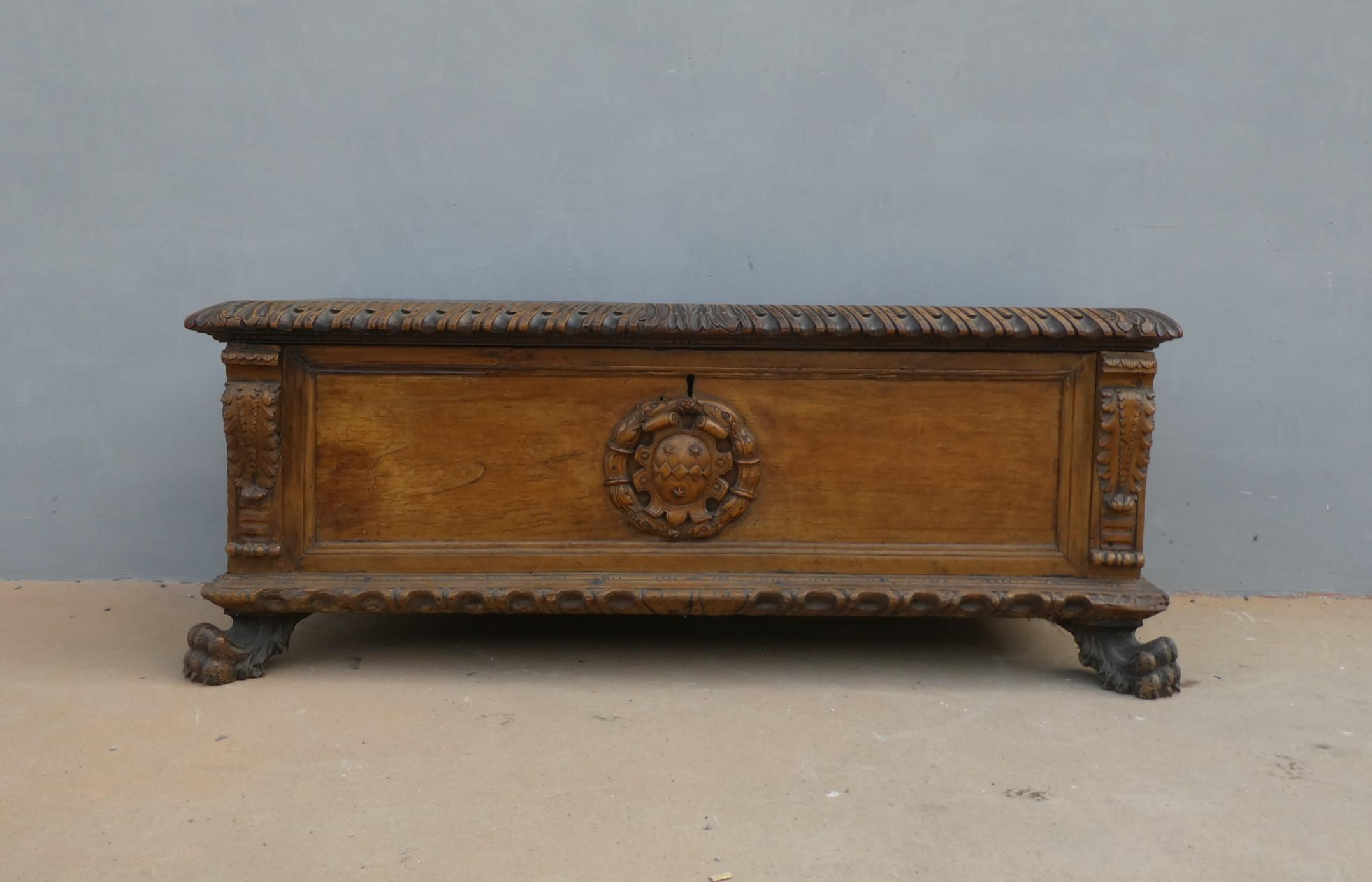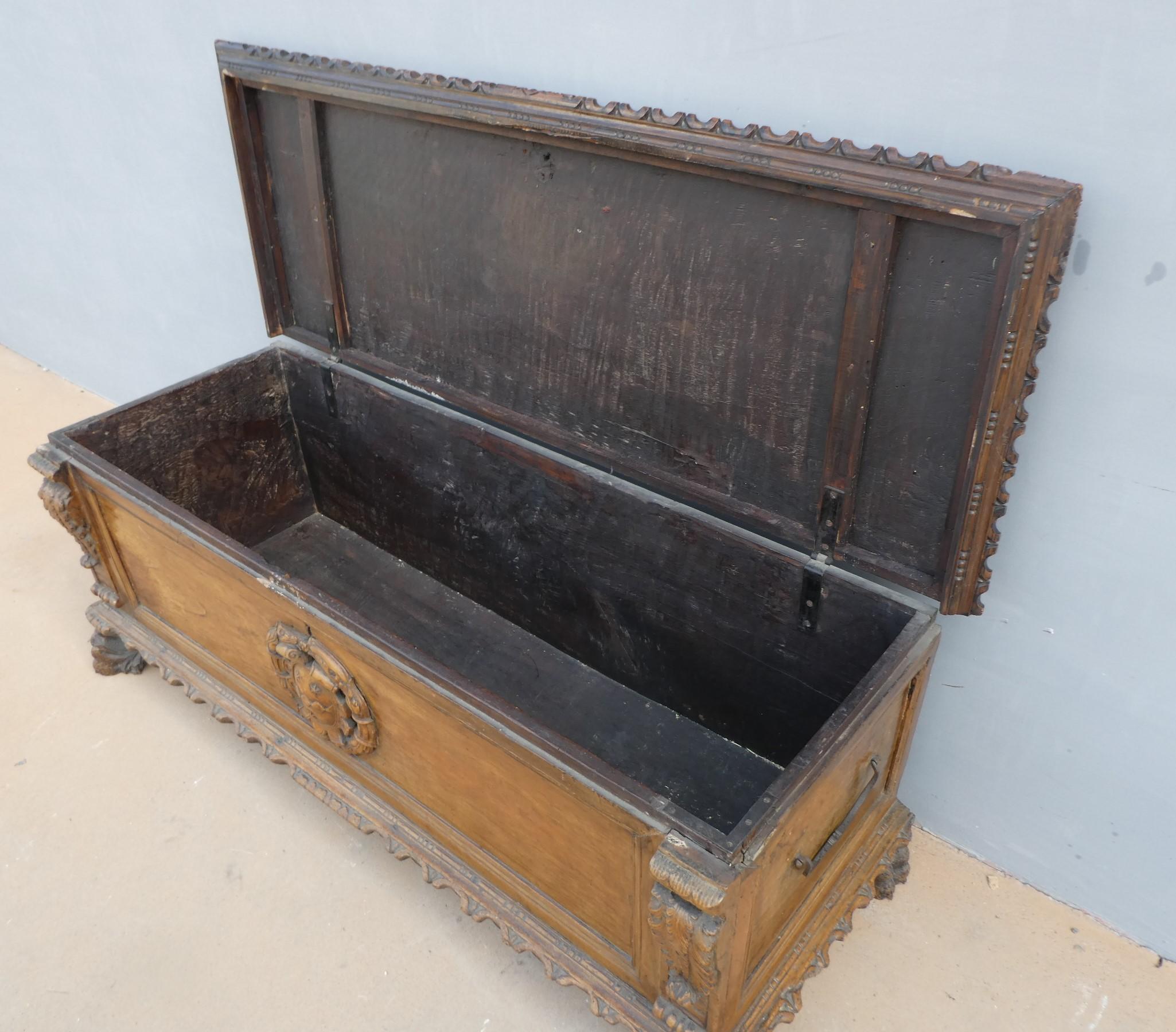 Cassapanca panca Barocca lombarda realizzata in legno massello di noce, dotata di due maniglie laterali ed appartenente d’epoca al XVII secolo. Solido e maestoso nella linea, il mobile ottiene il suo effetto decorativo grazie al gusto scultoreo degli intagli e all’uso di elementi decorativi, come la lavorazione centrale, caratteristica dello stile. Necessita d’interventi di restauro conservativo.