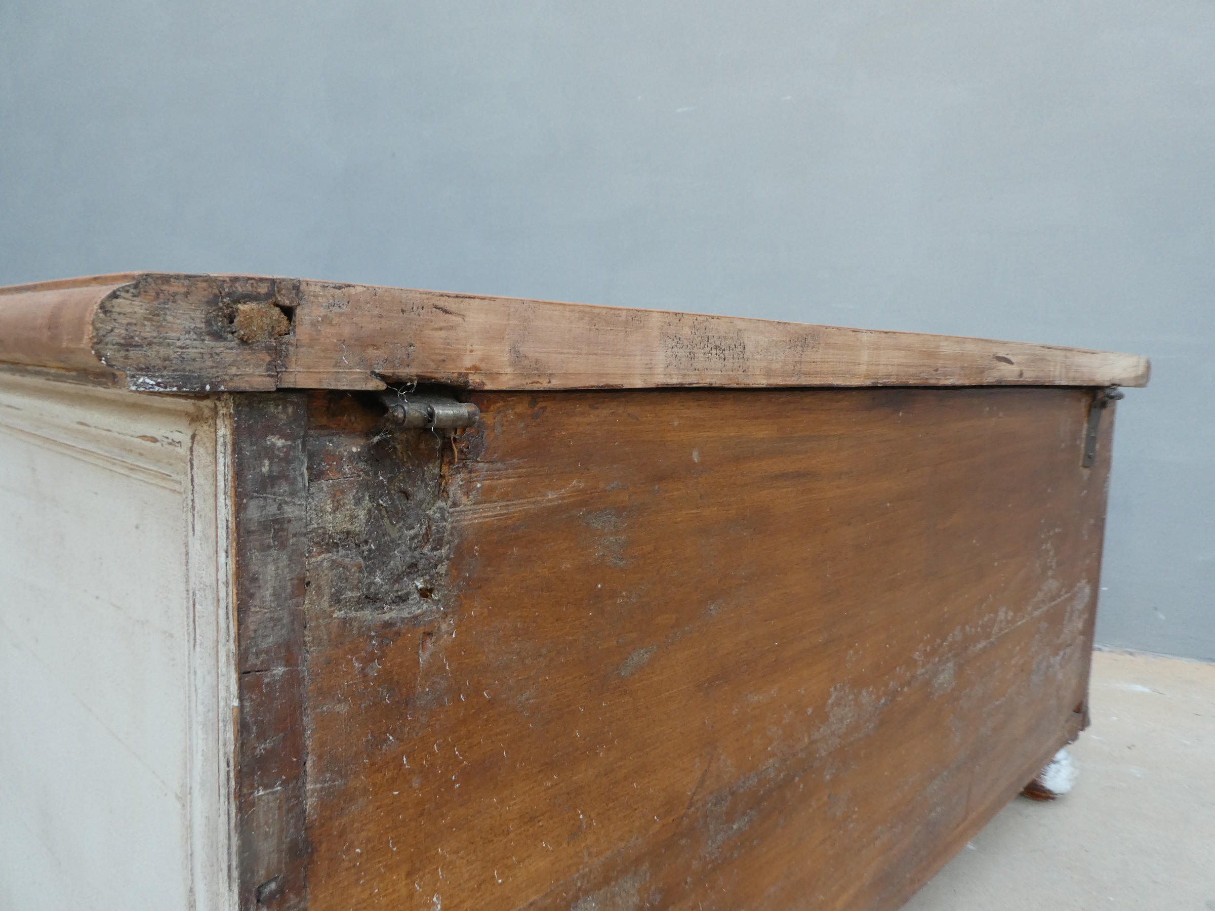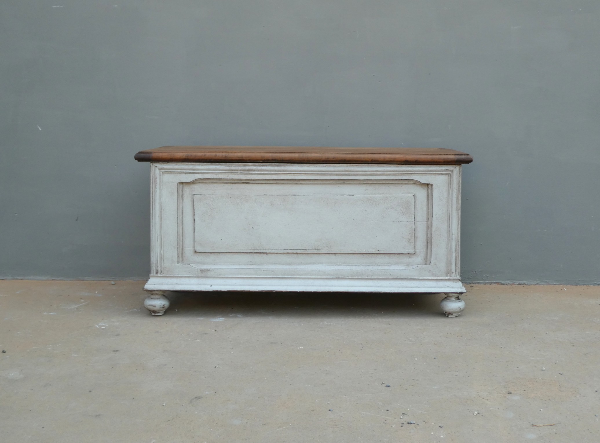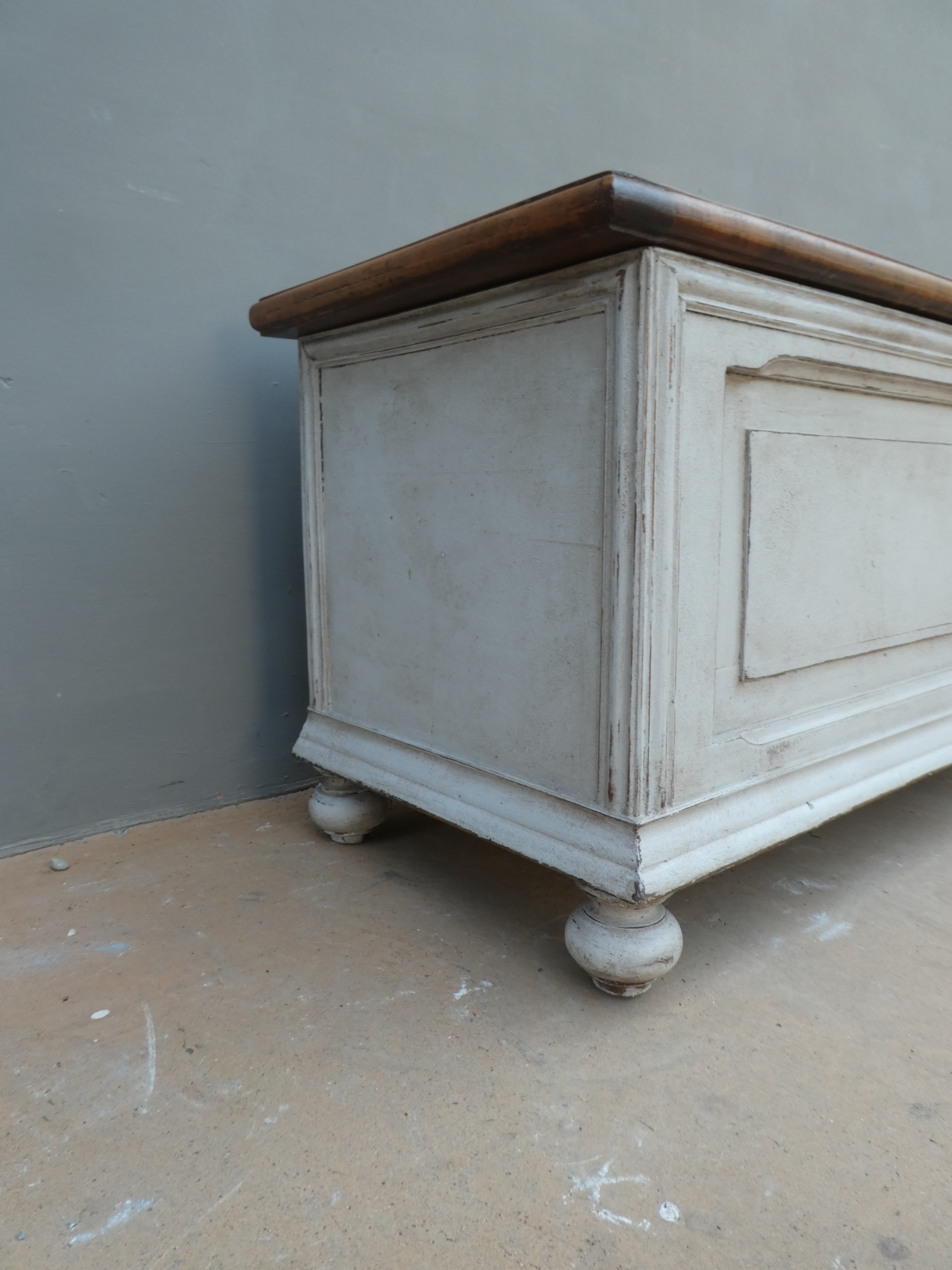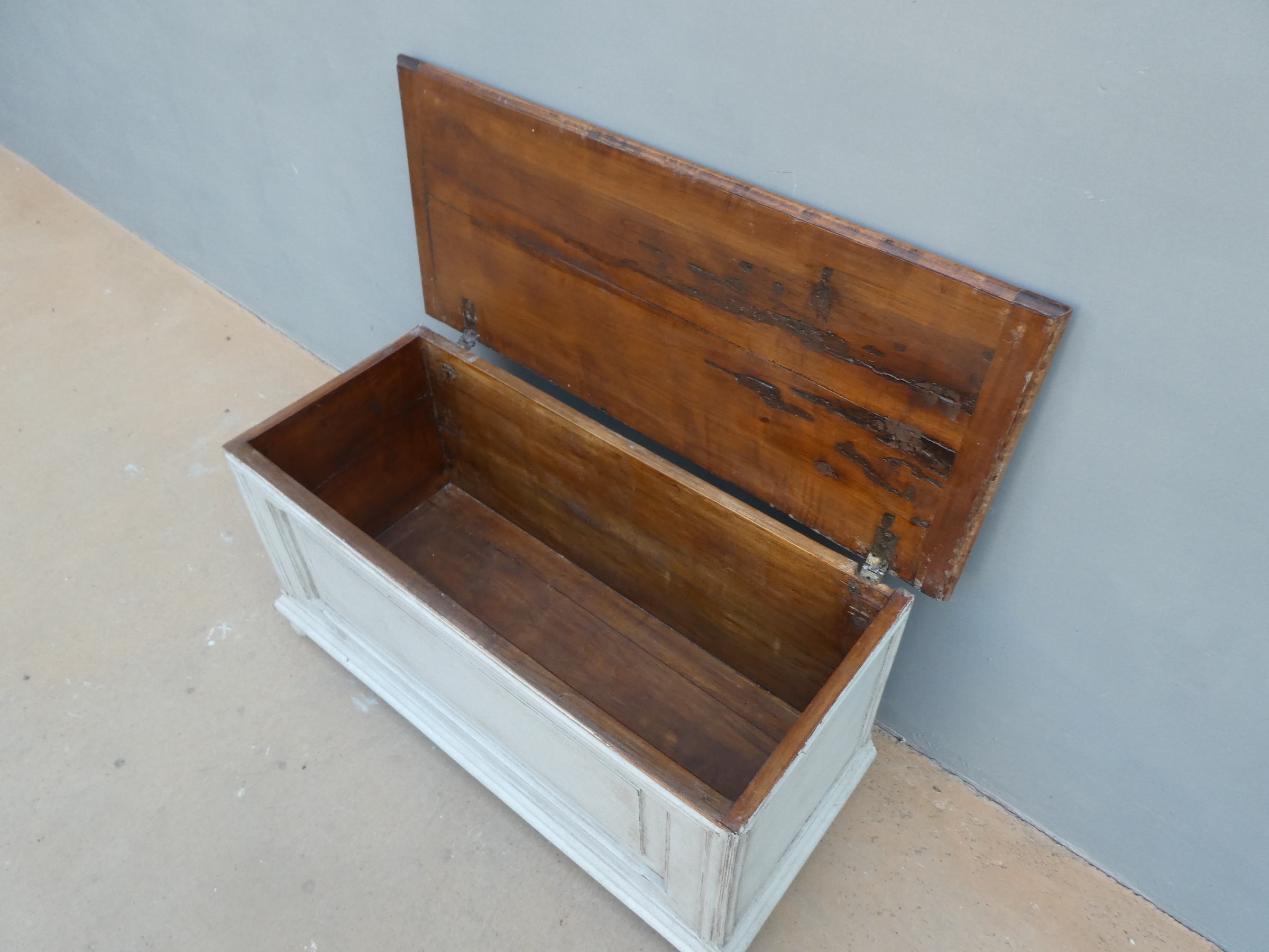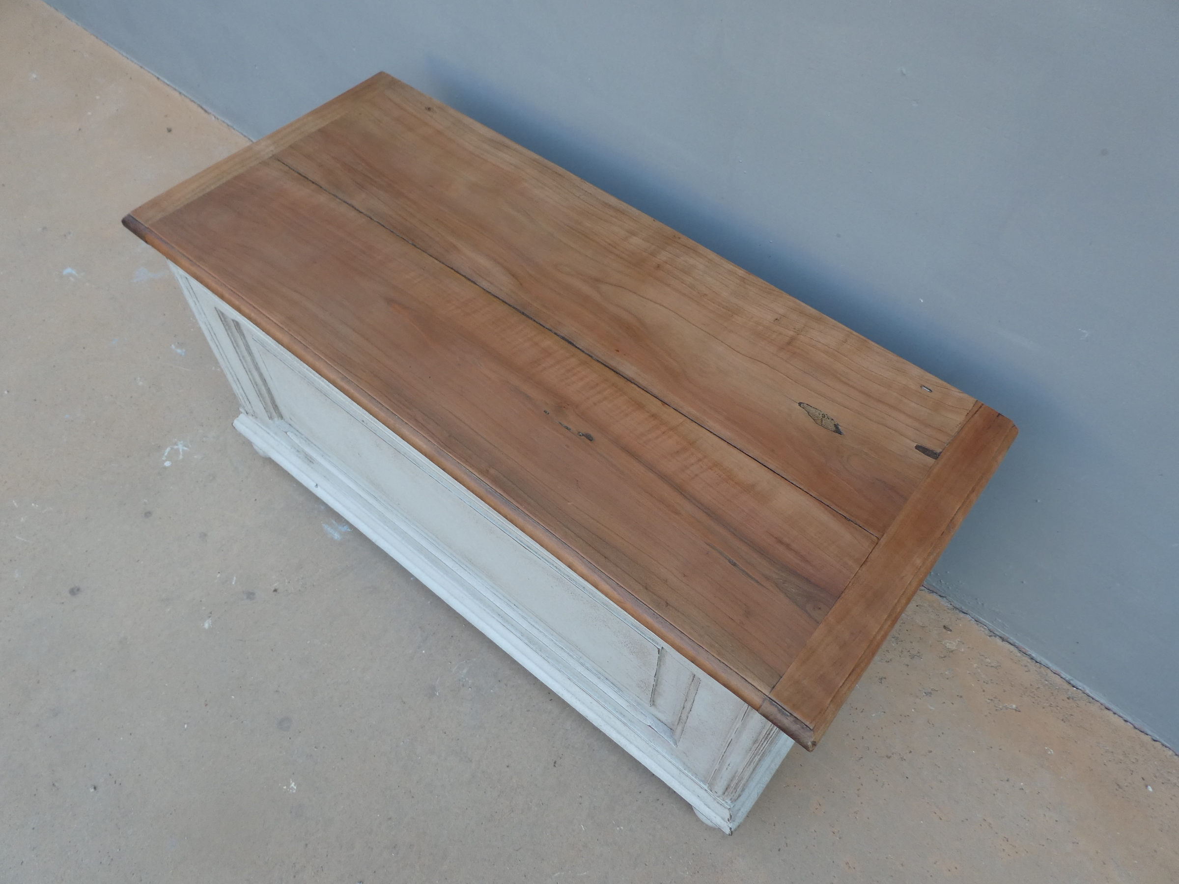 Cassapanca panca baule contenitore dotata di un piano apribile. Ciò che rende elegante ed originale questo mobile, è il contrasto creato dalla lacca chiara utilizzata per il corpo, rifinita con la tecnica “Shabby Chic”, con il piano in noce, lasciato a legno. Necessita di piccoli interventi di restauro – facoltativi. Epoca ‘900.