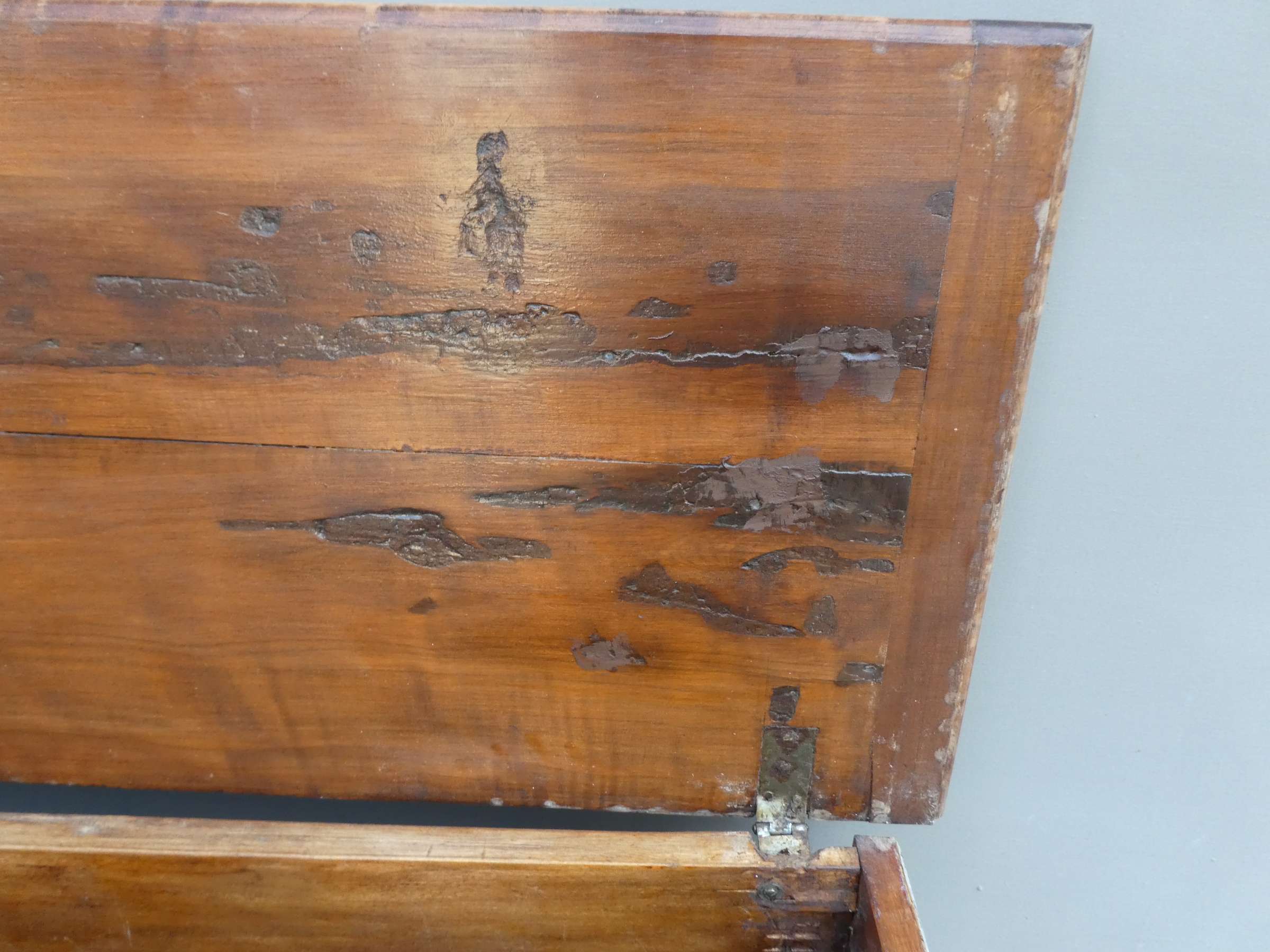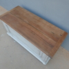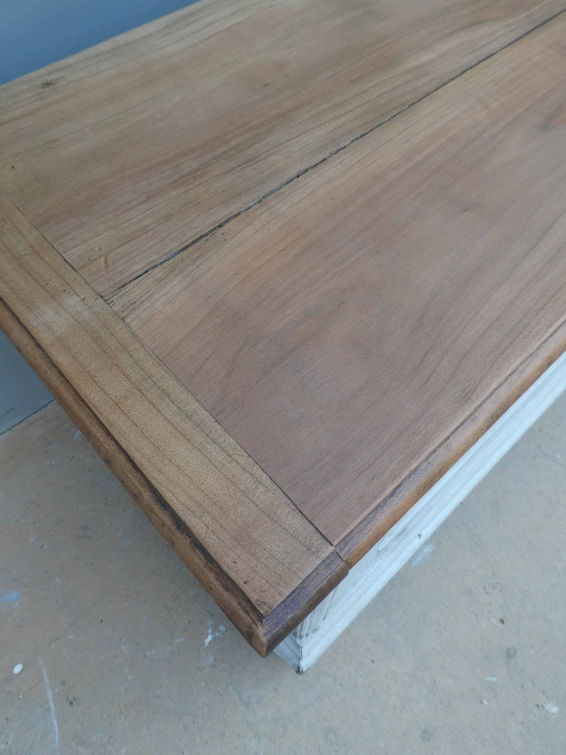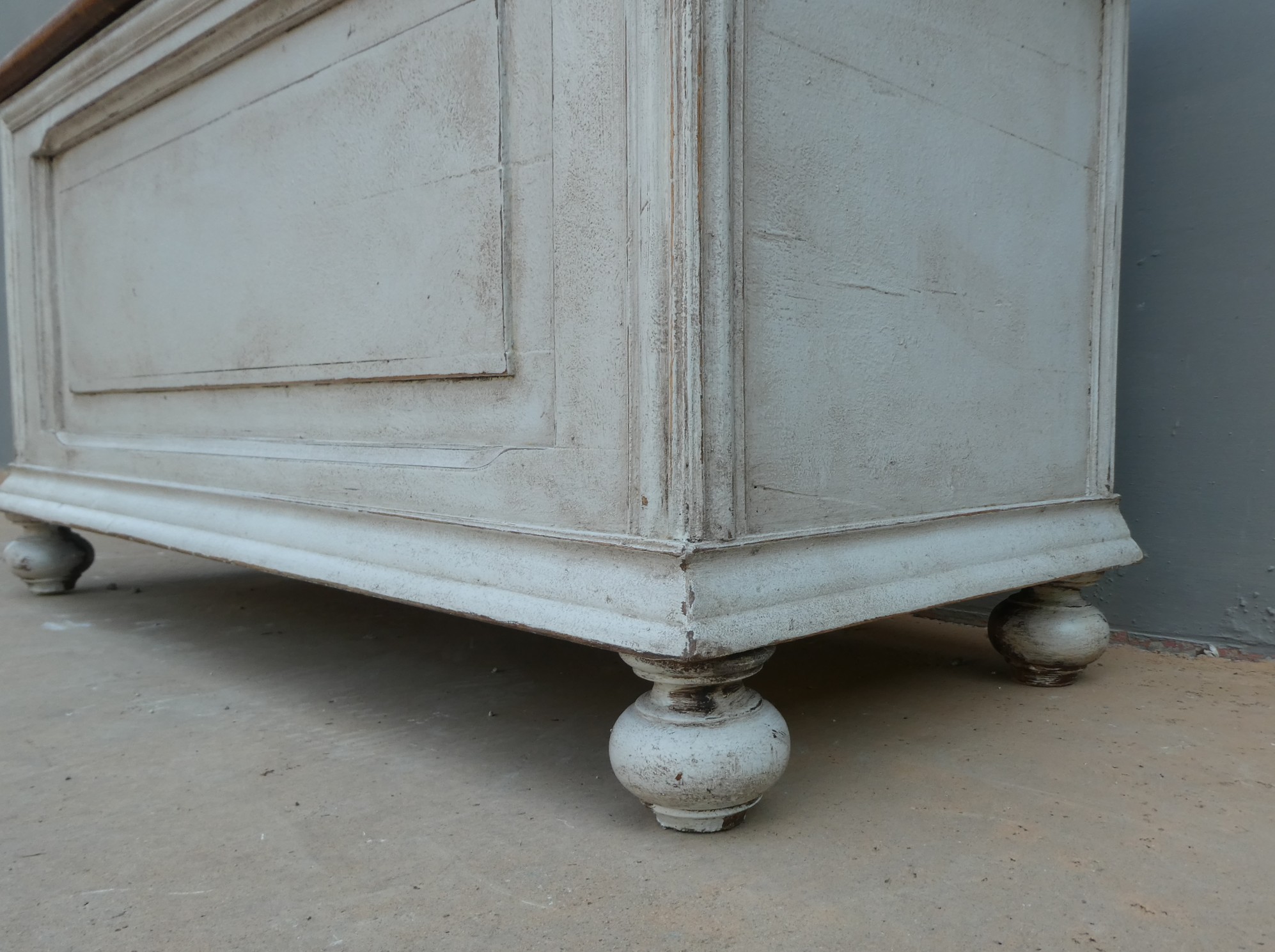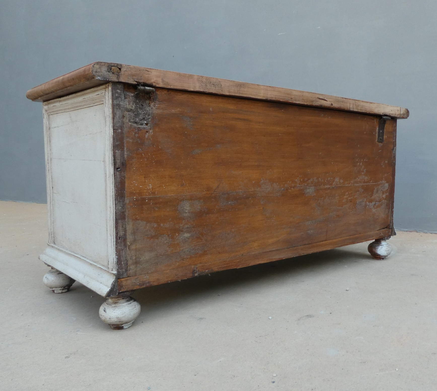 Cassapanca panca baule contenitore dotata di un piano apribile. Ciò che rende elegante ed originale questo mobile, è il contrasto creato dalla lacca chiara utilizzata per il corpo, rifinita con la tecnica “Shabby Chic”, con il piano in noce, lasciato a legno. Necessita di piccoli interventi di restauro – facoltativi. Epoca ‘900.