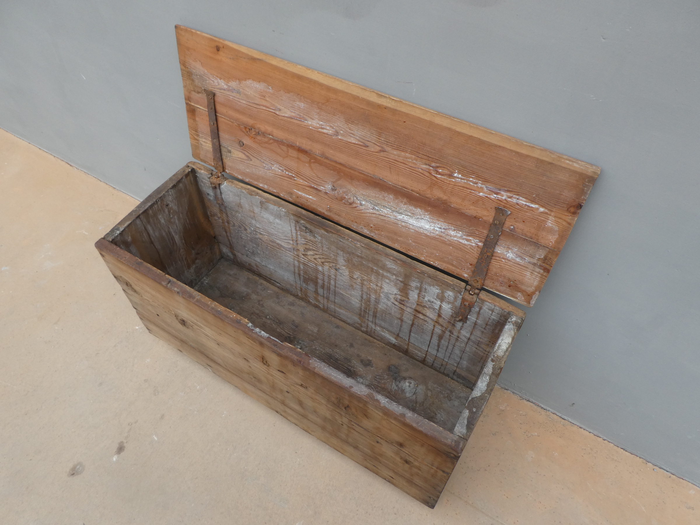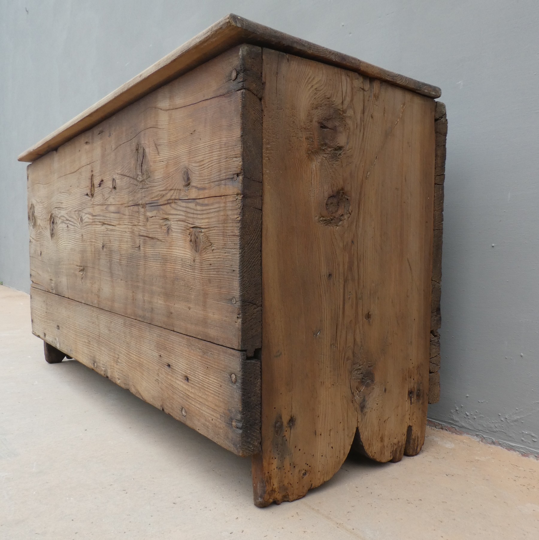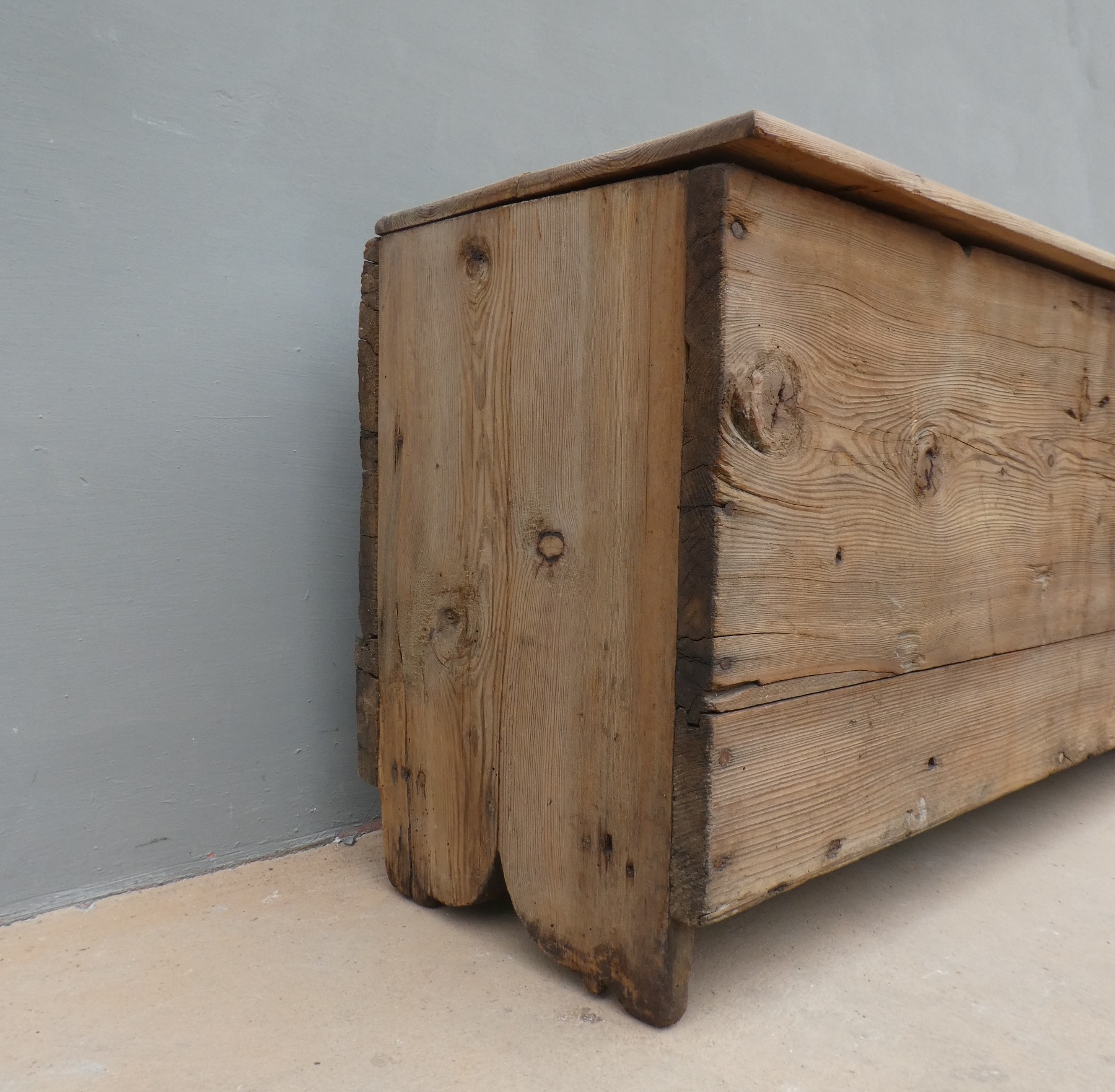 Cassapanca panca rustica mobile contenitore con piano apribile realizzata in legno massello di larice (piano non coevo) ed appartenente d’epoca alla fine dell’800. La semplice struttura conferisce una sobria eleganza. La ricerca di un decoro essenziale si riflette anche sui montanti, privi di elementi decorativi. Si presenta come un funzionale e versatile elemento d’arredo. Necessita di alcuni interventi di restauro (a propria discrezione), sono presenti i fori di tarlo.