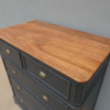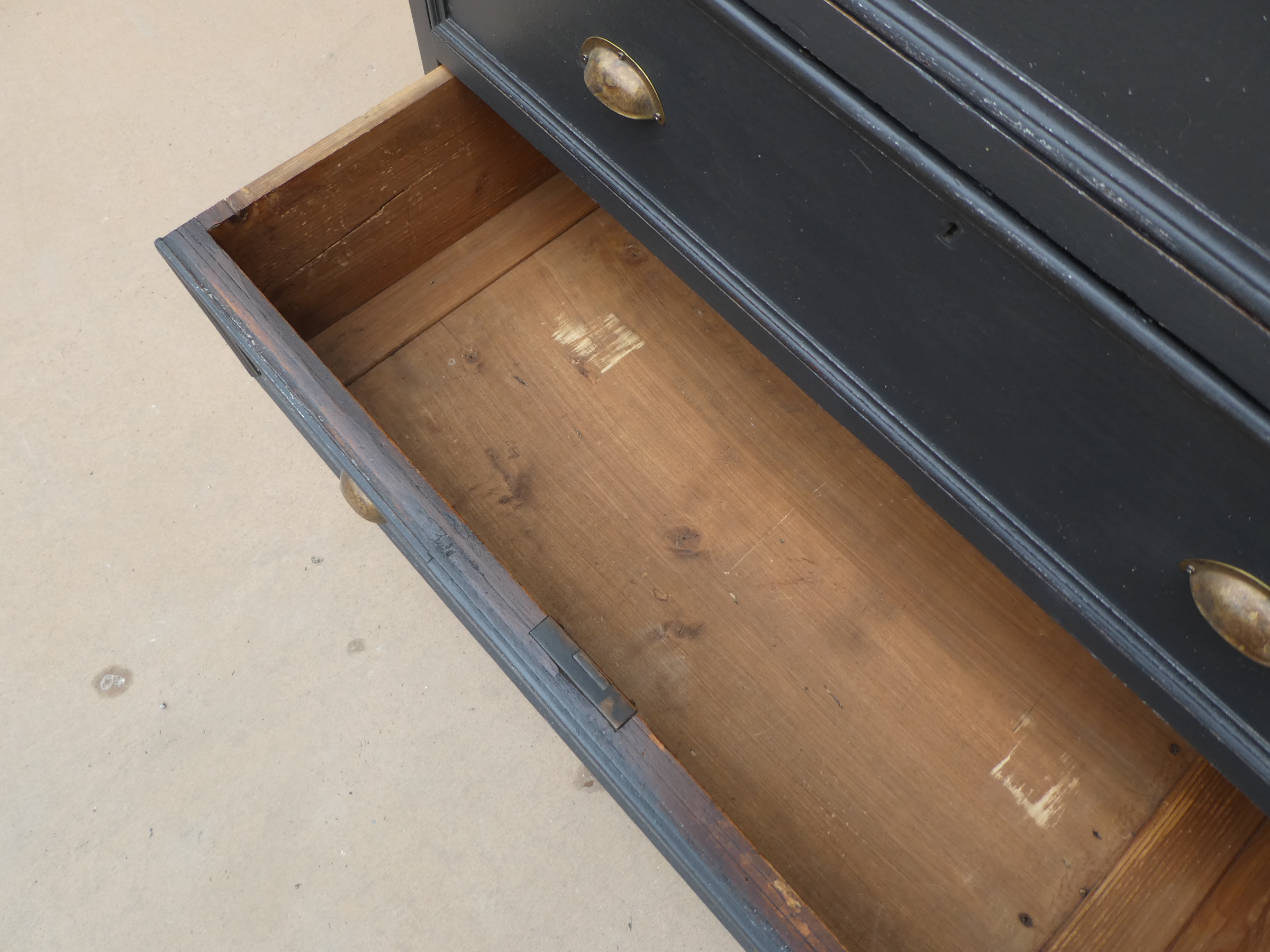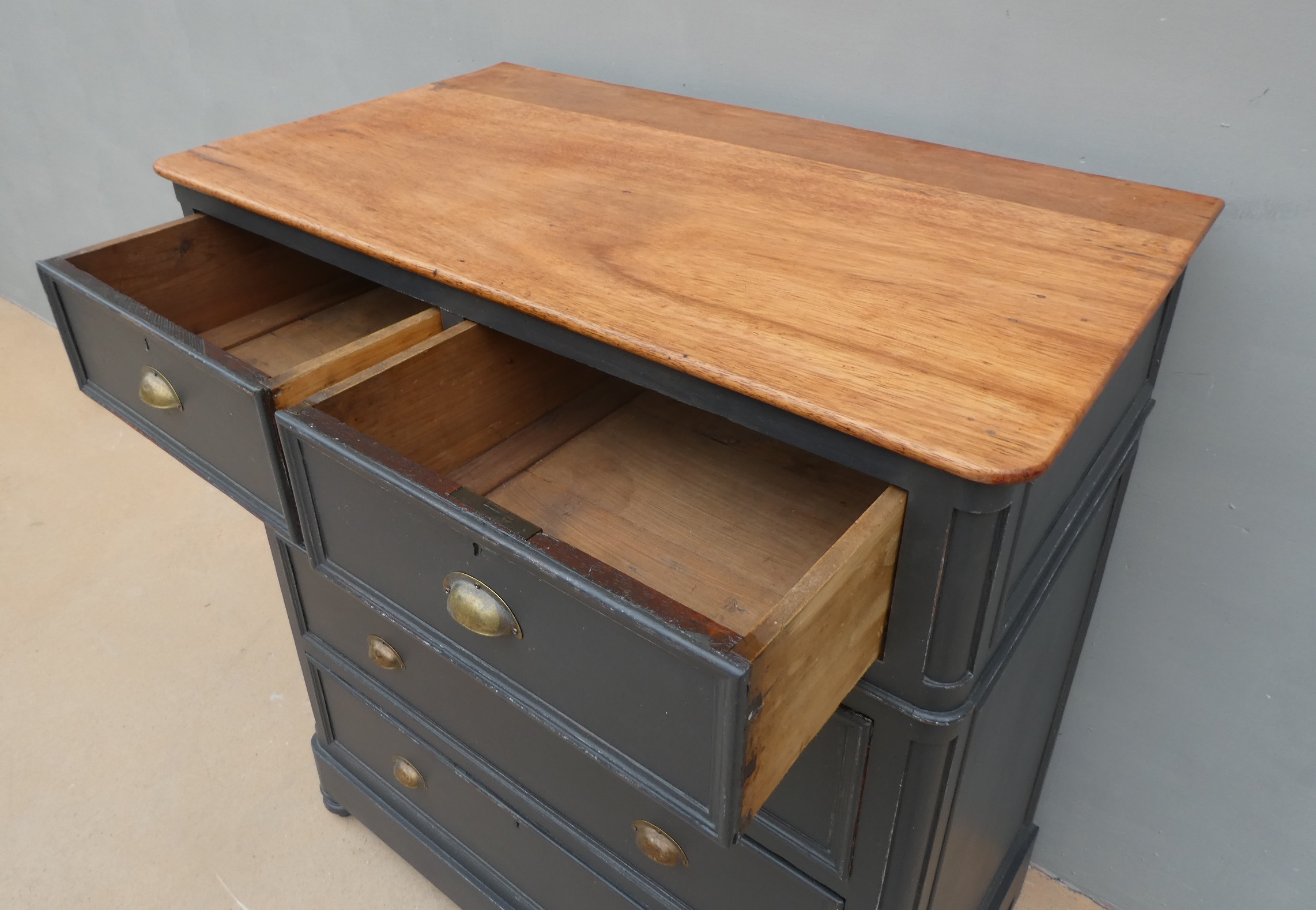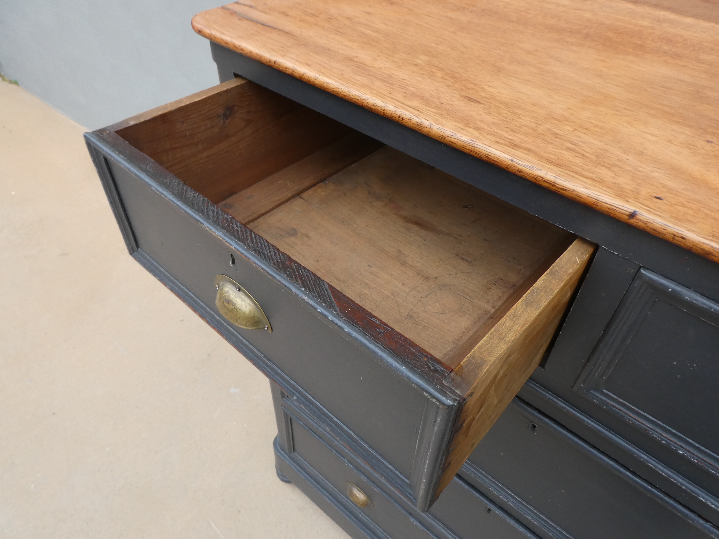 Cassettiera mobile cassettone dotata di 5 cassetti frontali di due diverse dimensioni, laccata e rifinita con la tecnica “Shabby Chic”. Ciò che rende elegante ed originale questo mobile è il contrasto creato dalla lacca scura utilizzata per il corpo, con il piano d’appoggio in mogano, lasciato a legno. Necessita di piccoli interventi di restauro (facoltativi). Epoca fine ‘800.