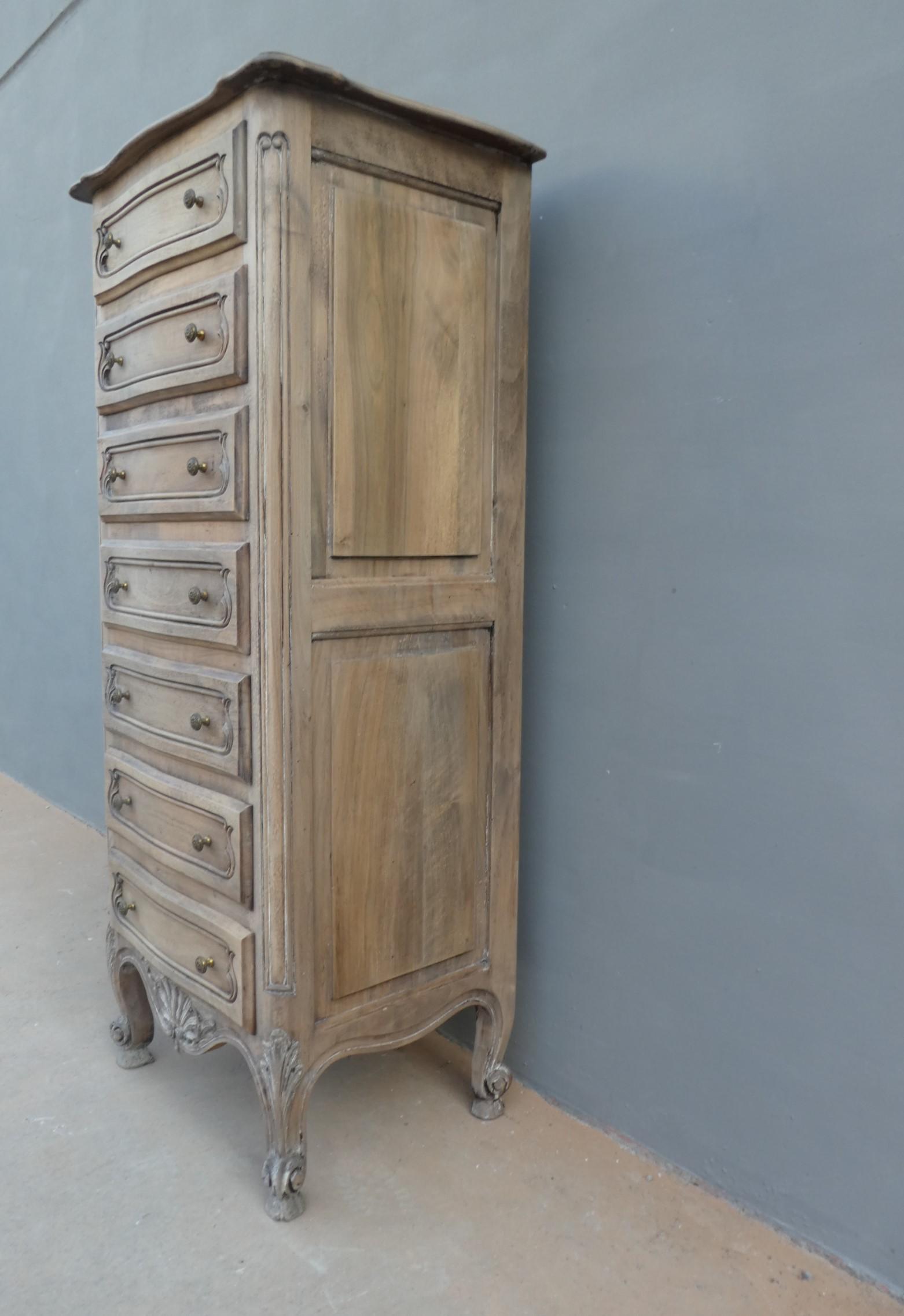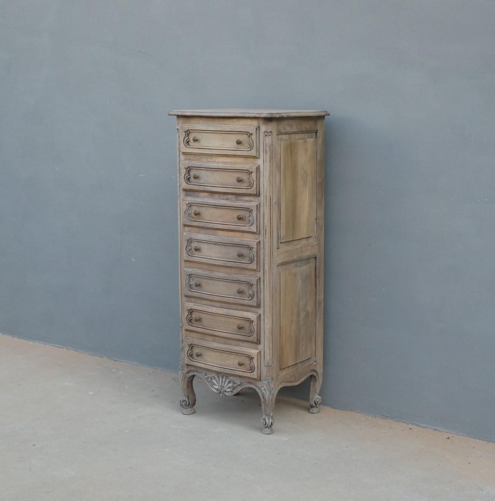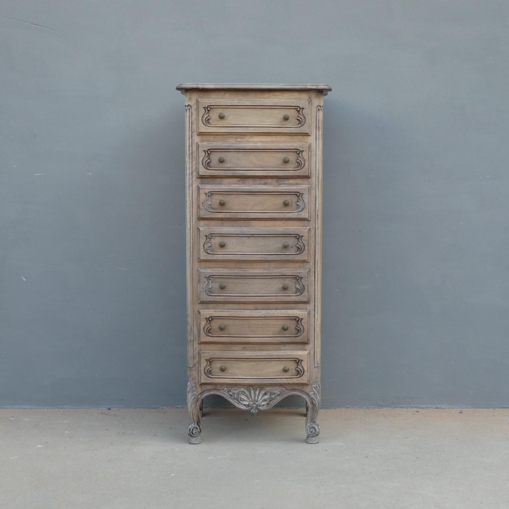 Cassettiera settimanale in legno di noce, stile provenzale francese, corredata da 7 cassetti frontali. La struttura si presenta solida ed armoniosa, e vanta proporzioni sapientemente equilibrate. Ciò che la impreziosisce è indubbiamente la scelta d’arricchire il corpo con delicati intagli, caratteristici dello stile. Necessita di leggeri interventi di restauro, sono presenti fori di tarlo. Dopo la sverniciatura, non è stata data alcuna finitura. Epoca metà ‘900.