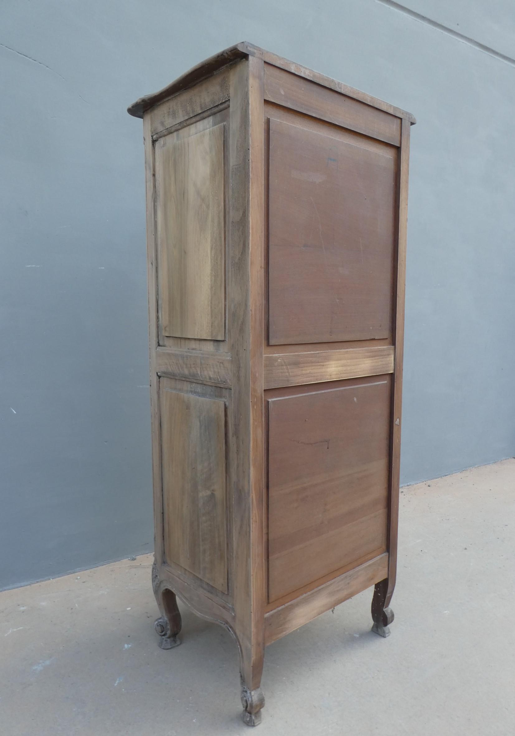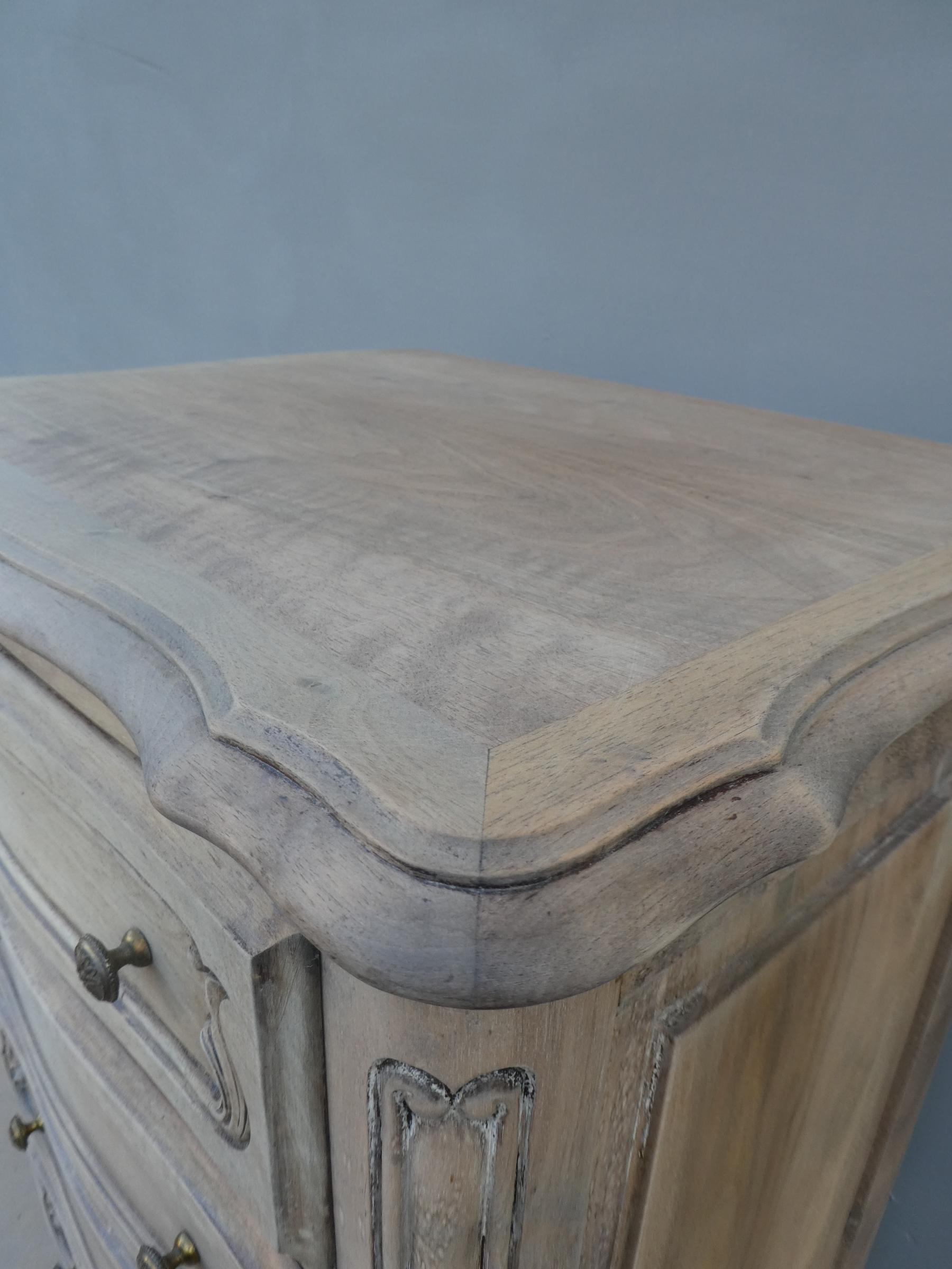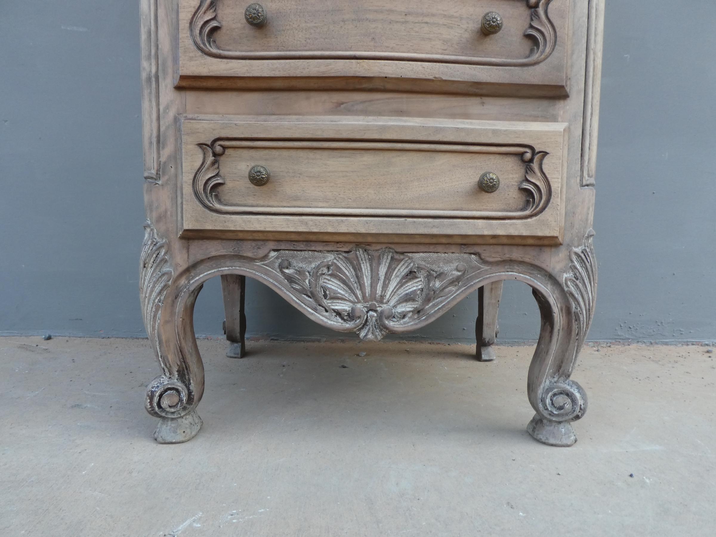Cassettiera settimanale in legno di noce, stile provenzale francese, corredata da 7 cassetti frontali. La struttura si presenta solida ed armoniosa, e vanta proporzioni sapientemente equilibrate. Ciò che la impreziosisce è indubbiamente la scelta d’arricchire il corpo con delicati intagli, caratteristici dello stile. Necessita di leggeri interventi di restauro, sono presenti fori di tarlo. Dopo la sverniciatura, non è stata data alcuna finitura. Epoca metà ‘900.
