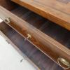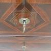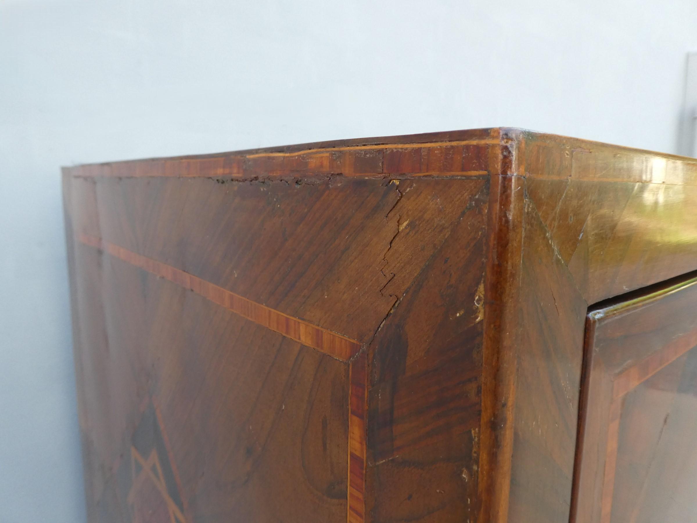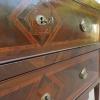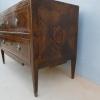 Antico comò cassettone napoletano Luigi XVI dotato di due cassetti frontali ed appartenente d’epoca ai primi dell’800. Semplice e lineare nella linea, il mobile ottiene il suo effetto decorativo grazie al forte contrasto tra il tono scuro della noce che fa da sfondo, con quello chiaro degli intarsi e i filetti ornamentali. Necessita di alcuni interventi di restauro (foto), sono presenti fori di tarlo.