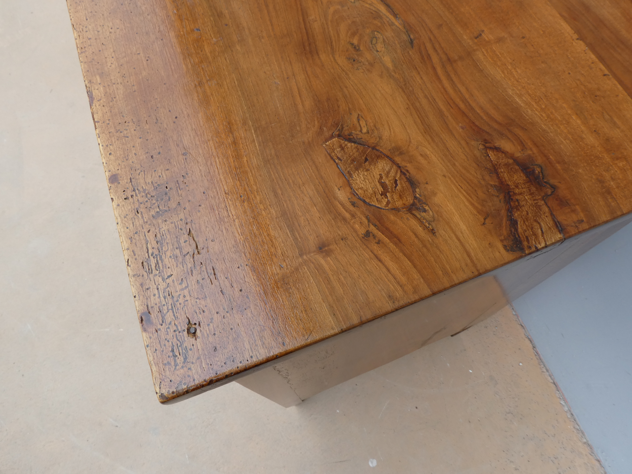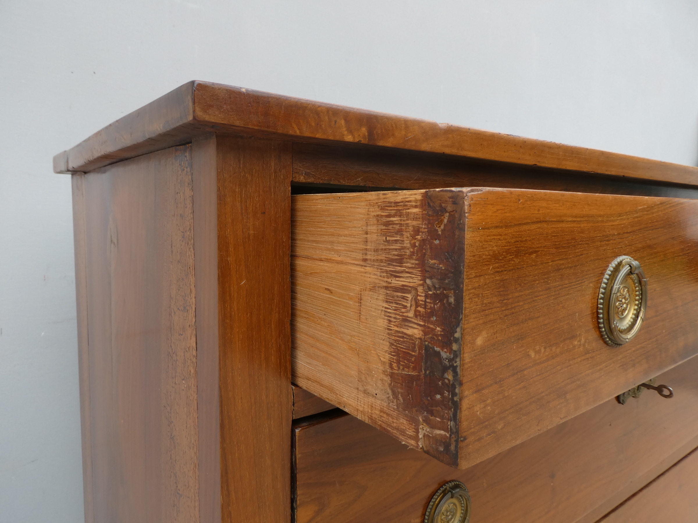 Comò cassettone Luigi XVI corredato da tre cassetti ed un piano d’appoggio in legno massello. L’essenziale struttura, sorretta dai caratteristici montanti rastremati verso il basso, conferisce una sobria eleganza. La ricerca di un decoro delicato si rispecchia sulla scelta d’utilizzare la noce; un’essenza nota e raffinata, caratterizzata da fitte venature di tonalità più scura. Necessita di alcuni interventi di restauro; sono presenti fori di tarlo. Epoca metà ‘800.