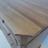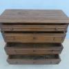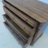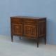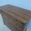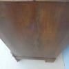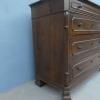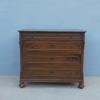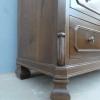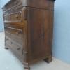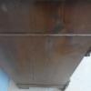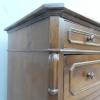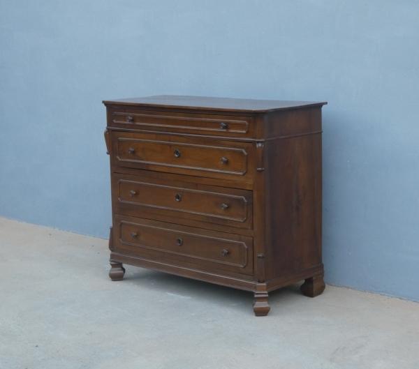 Comò cassettone dotato di un piano d’appoggio in legno (non coevo) e quattro cassetti frontali, appartenente d’epoca alla fine dell’800. La scantonata struttura si presenta semplice e lineare, e vanta proporzioni sapientemente equilibrate. La ricerca di un decoro delicato si rispecchia anche sulla scelta d’utilizzare la noce; un’essenza nota e raffinata, ricca di fitte venature di tonalità più scura. Necessita di leggeri interventi di restauro, presenta qualche foro di tarlo.