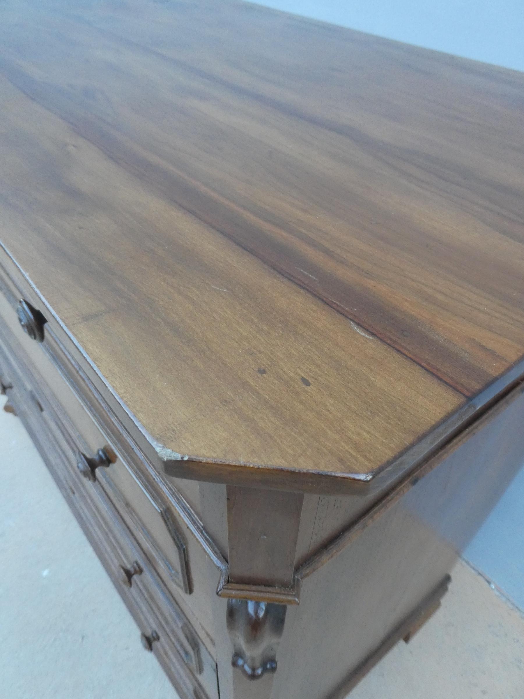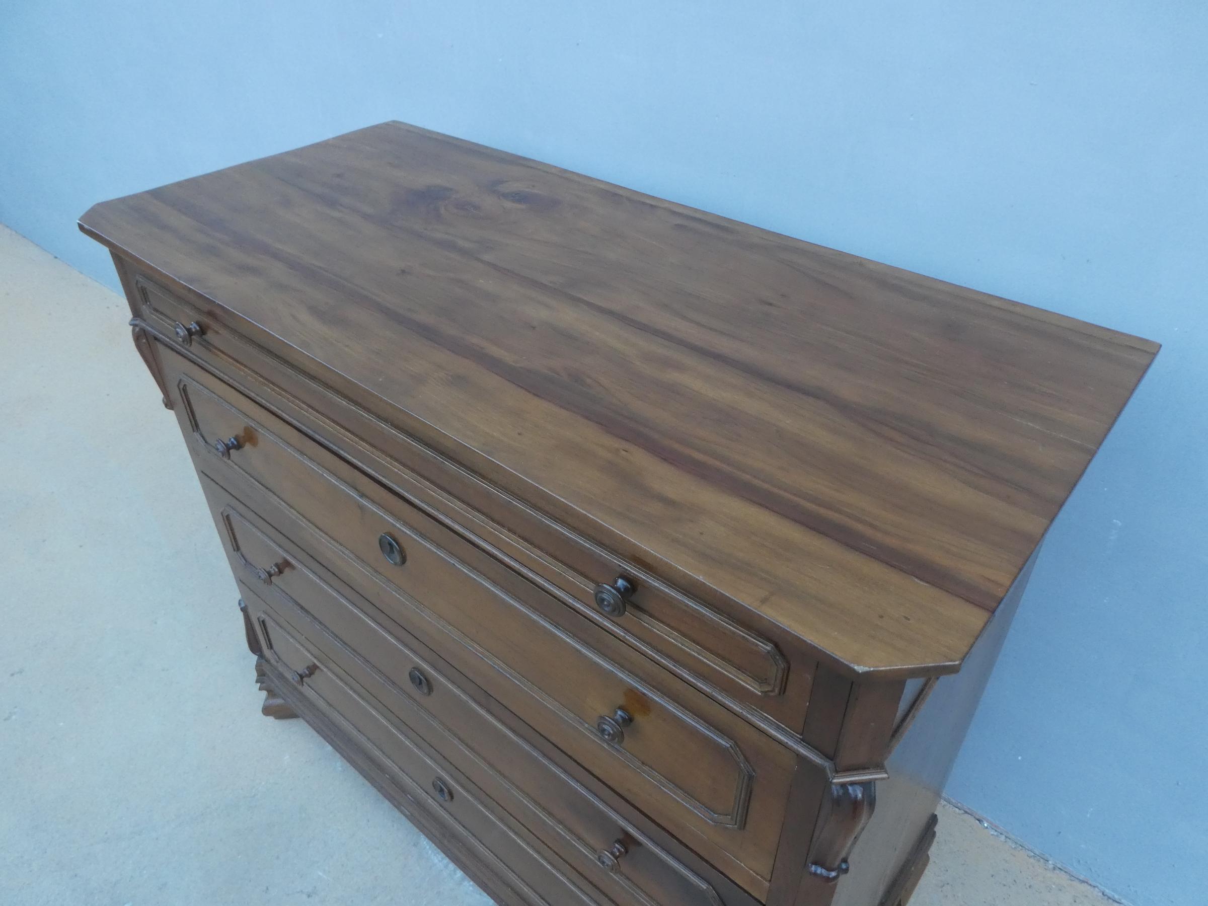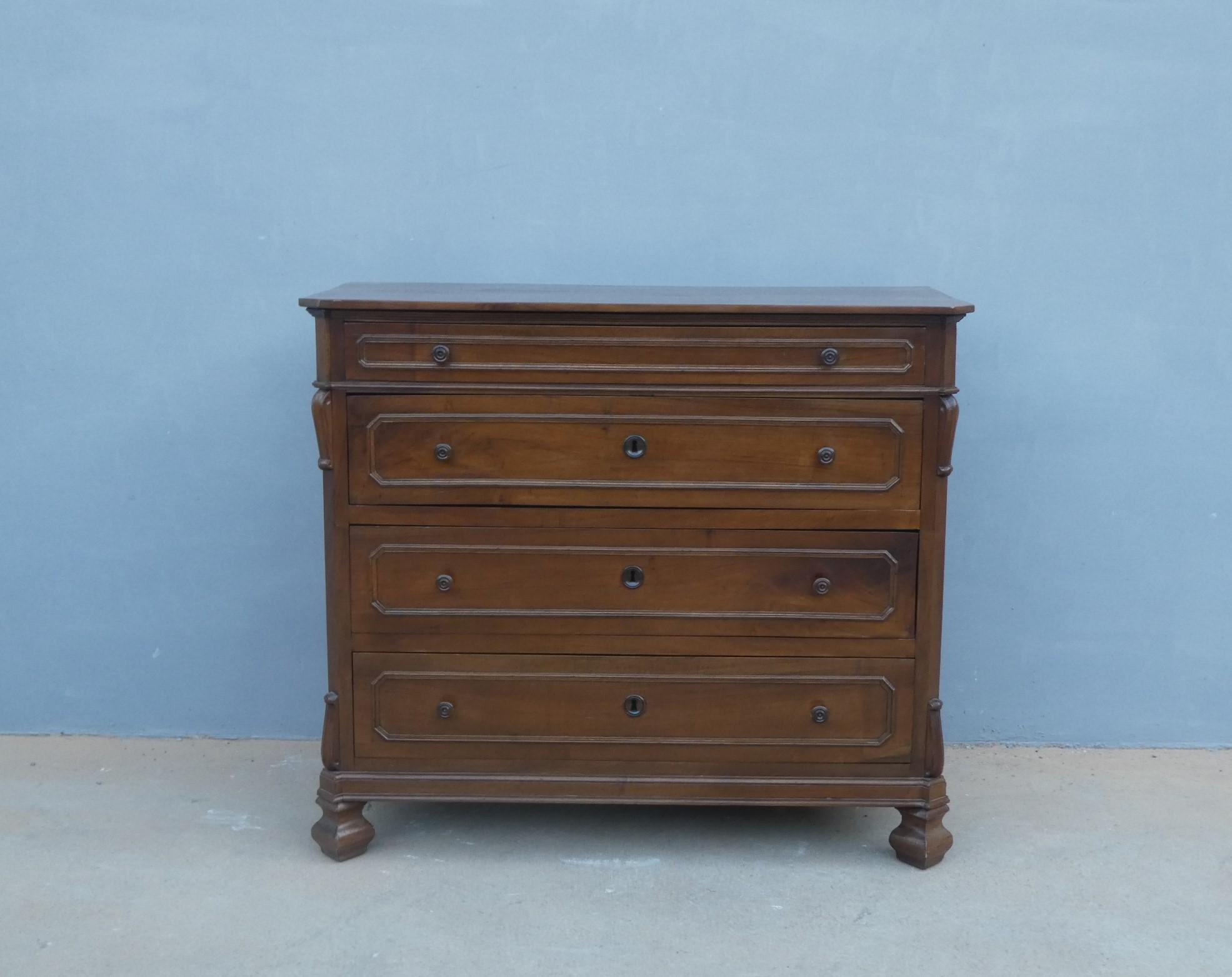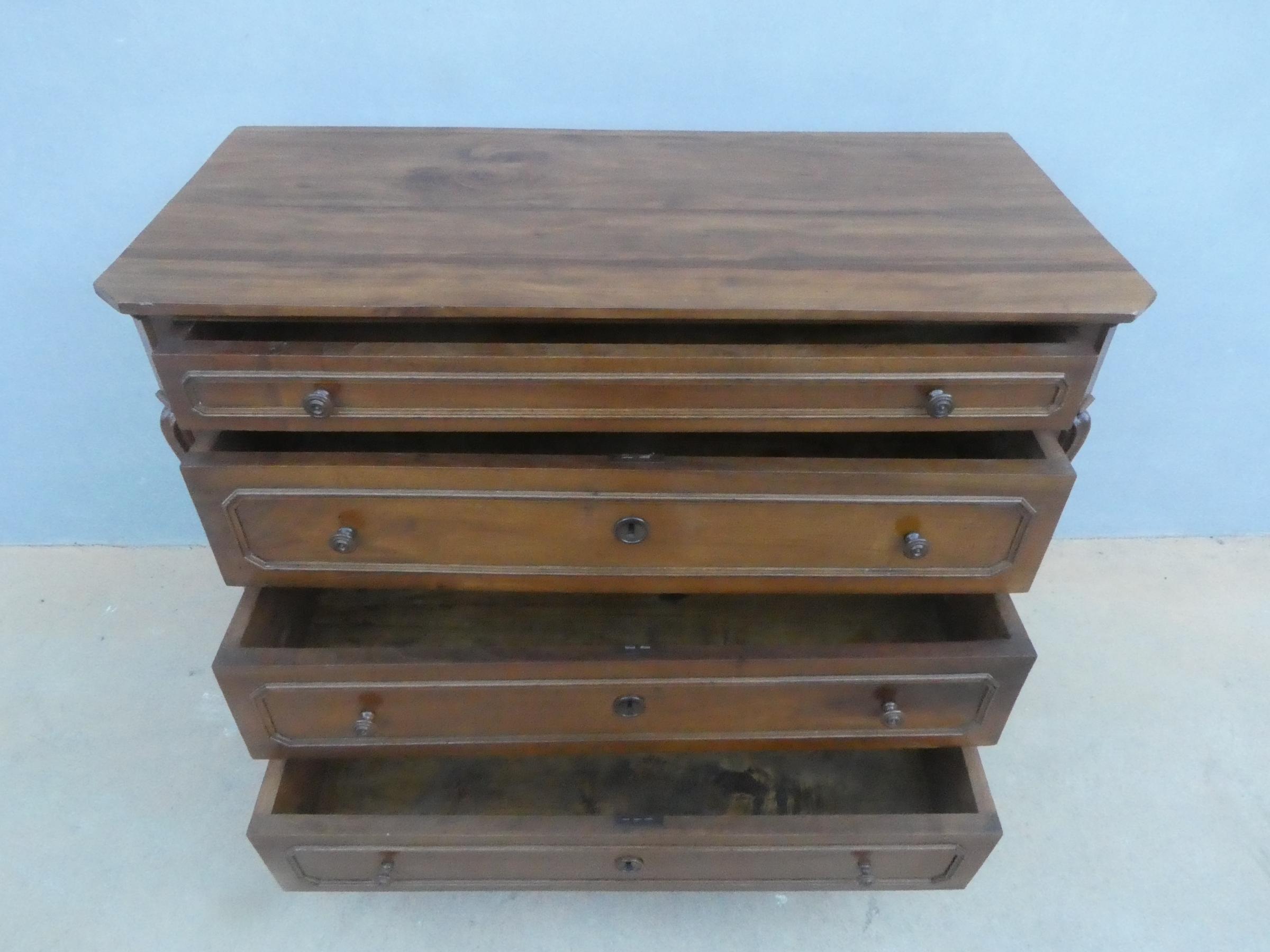 Comò cassettone dotato di un piano d’appoggio in legno (non coevo) e quattro cassetti frontali, appartenente d’epoca alla fine dell’800. La scantonata struttura si presenta semplice e lineare, e vanta proporzioni sapientemente equilibrate. La ricerca di un decoro delicato si rispecchia anche sulla scelta d’utilizzare la noce; un’essenza nota e raffinata, ricca di fitte venature di tonalità più scura. Necessita di leggeri interventi di restauro, presenta qualche foro di tarlo.