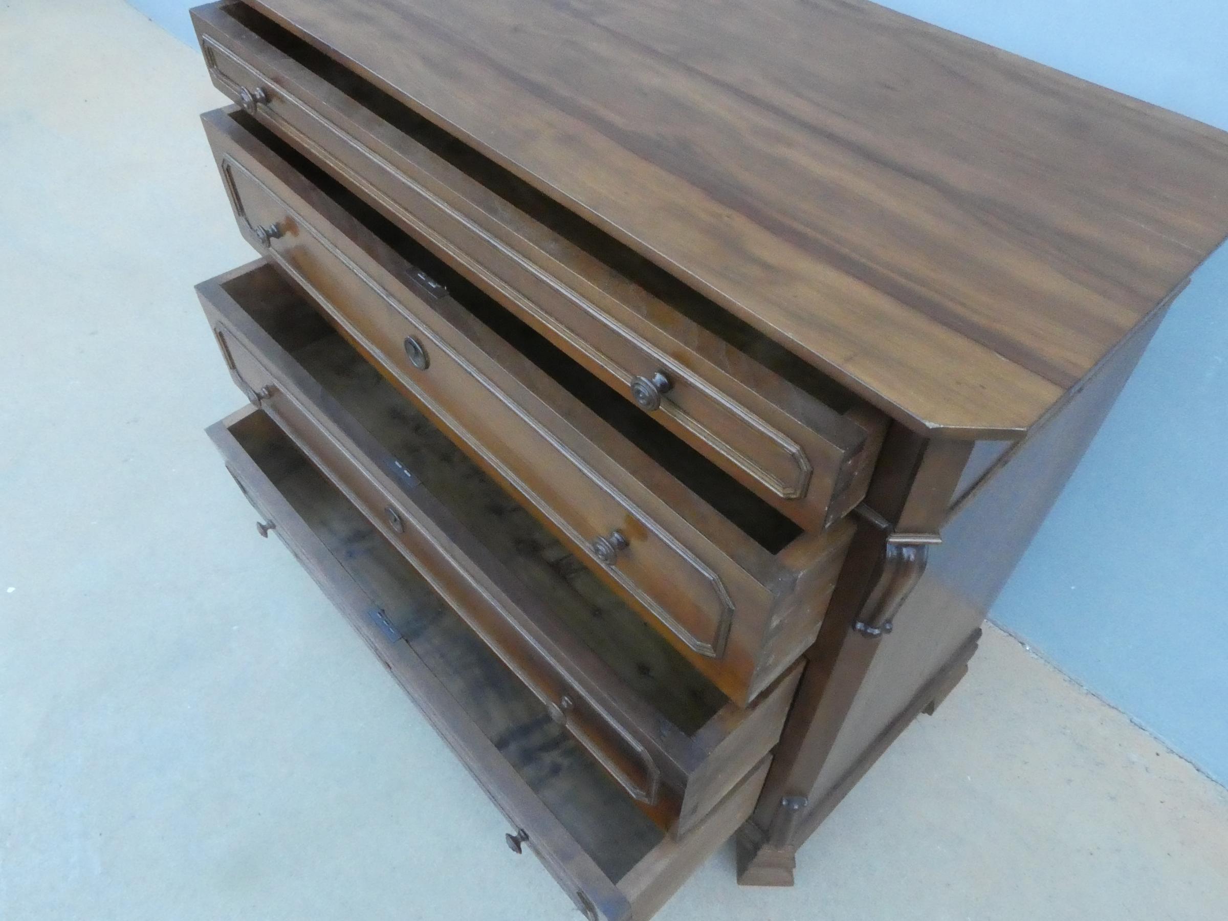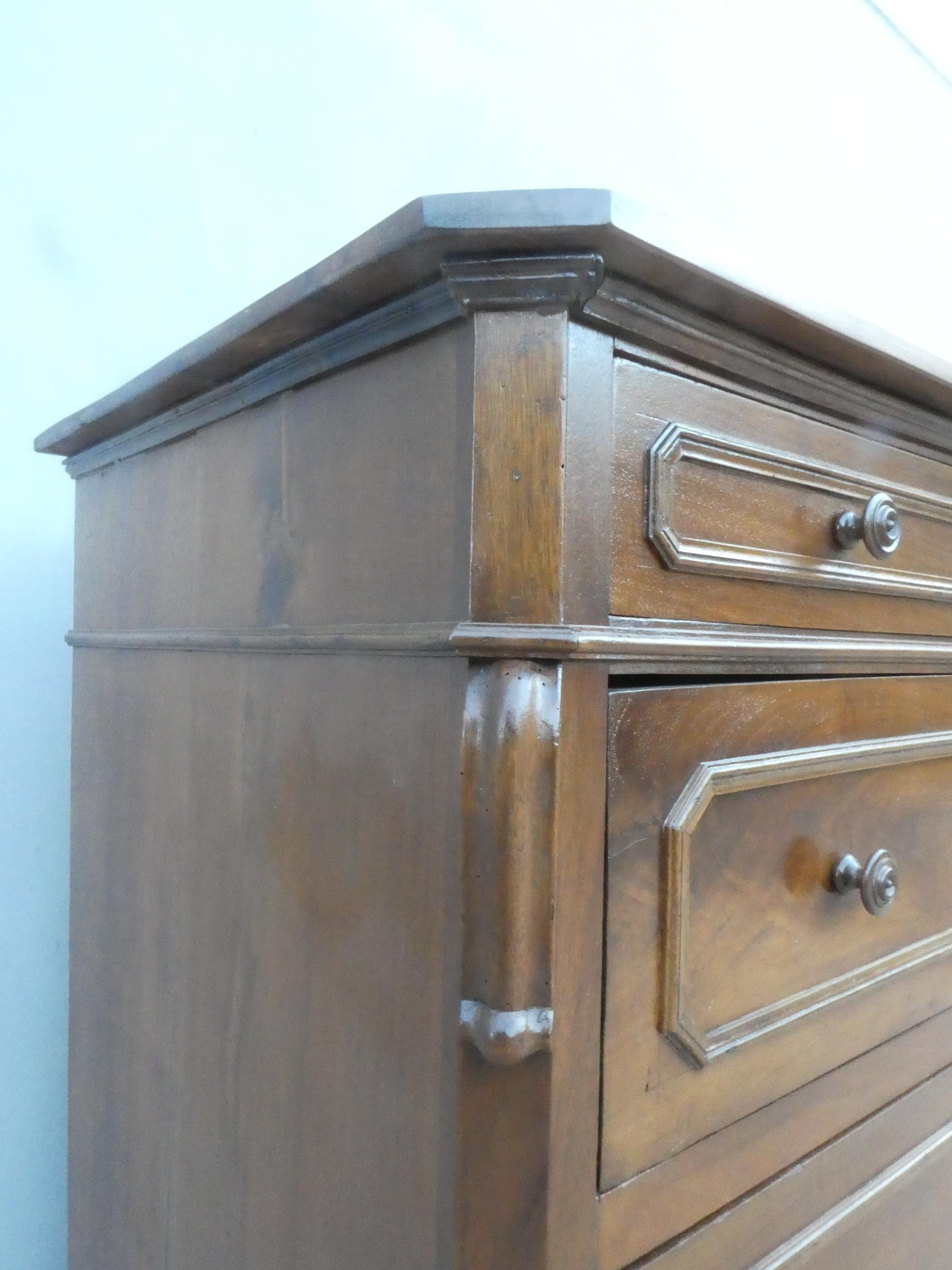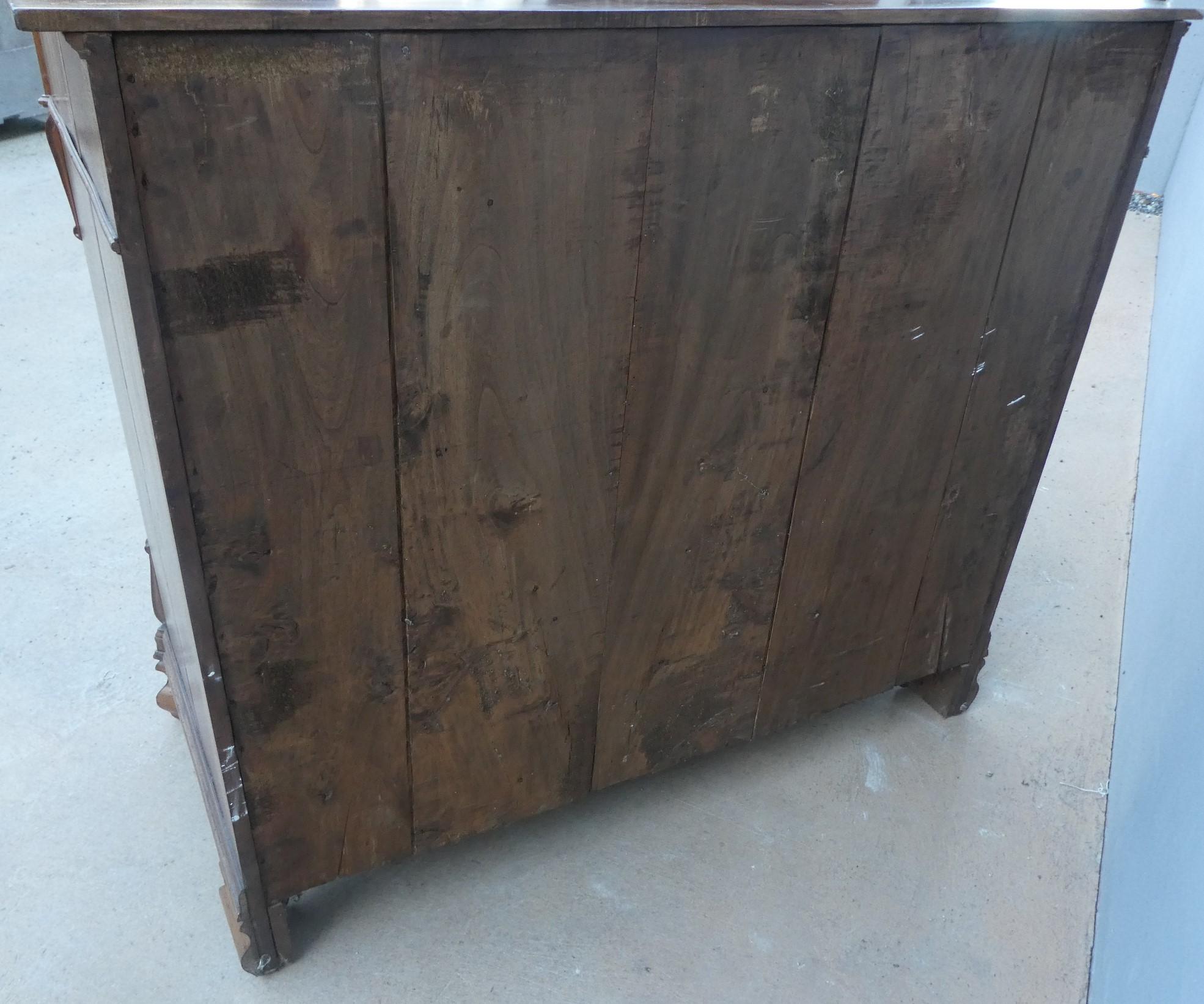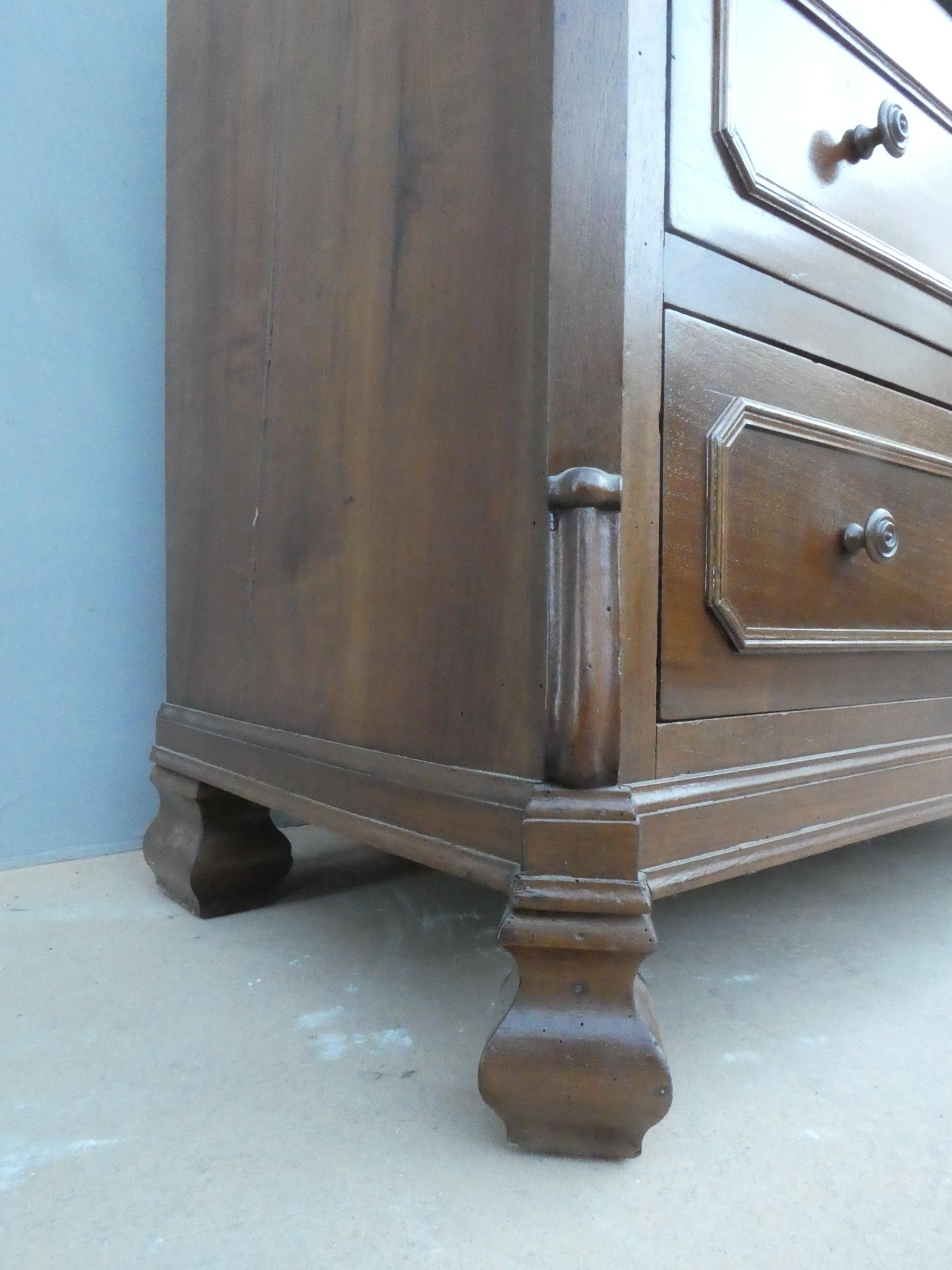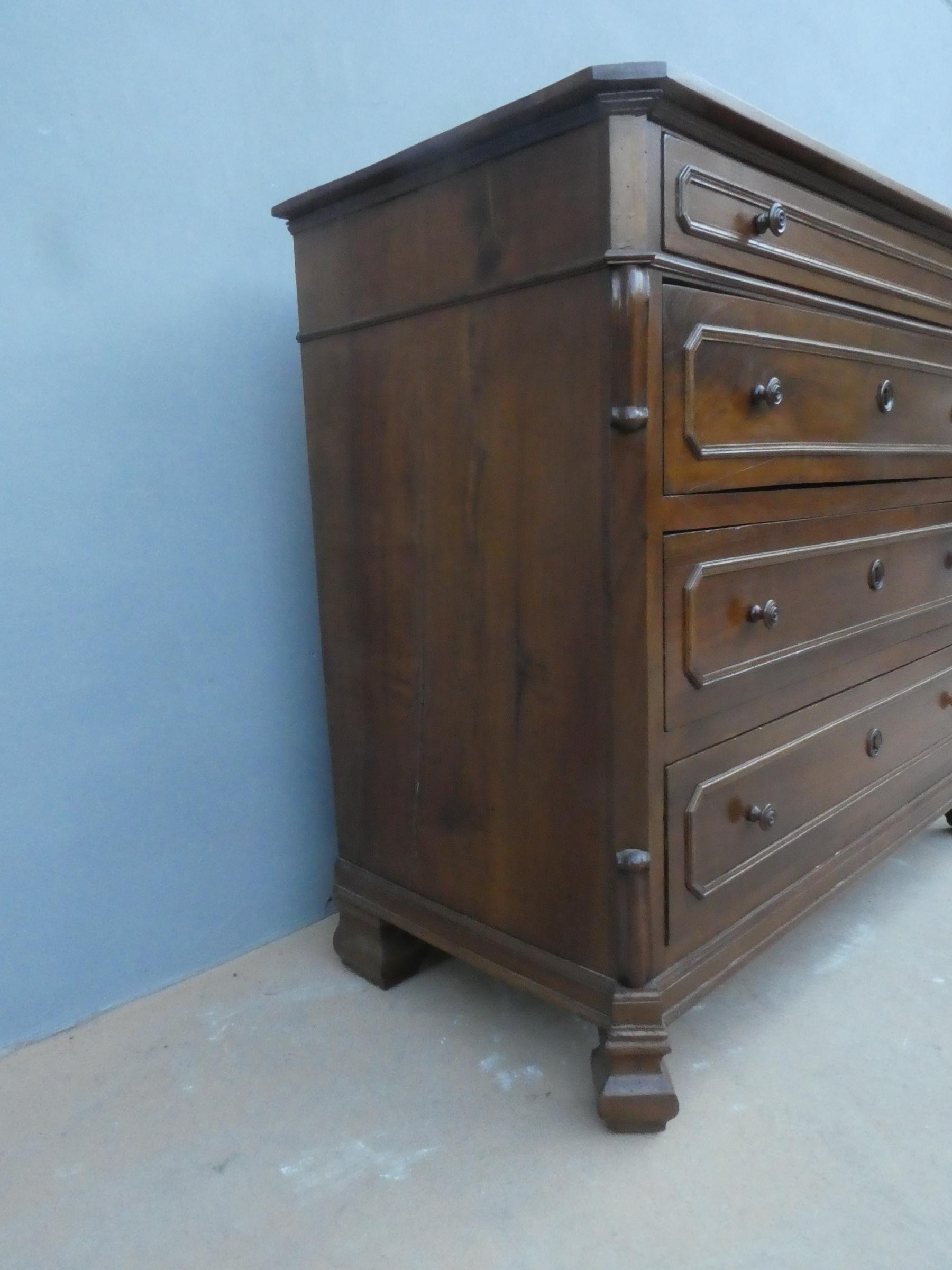 Comò cassettone dotato di un piano d’appoggio in legno (non coevo) e quattro cassetti frontali, appartenente d’epoca alla fine dell’800. La scantonata struttura si presenta semplice e lineare, e vanta proporzioni sapientemente equilibrate. La ricerca di un decoro delicato si rispecchia anche sulla scelta d’utilizzare la noce; un’essenza nota e raffinata, ricca di fitte venature di tonalità più scura. Necessita di leggeri interventi di restauro, presenta qualche foro di tarlo.