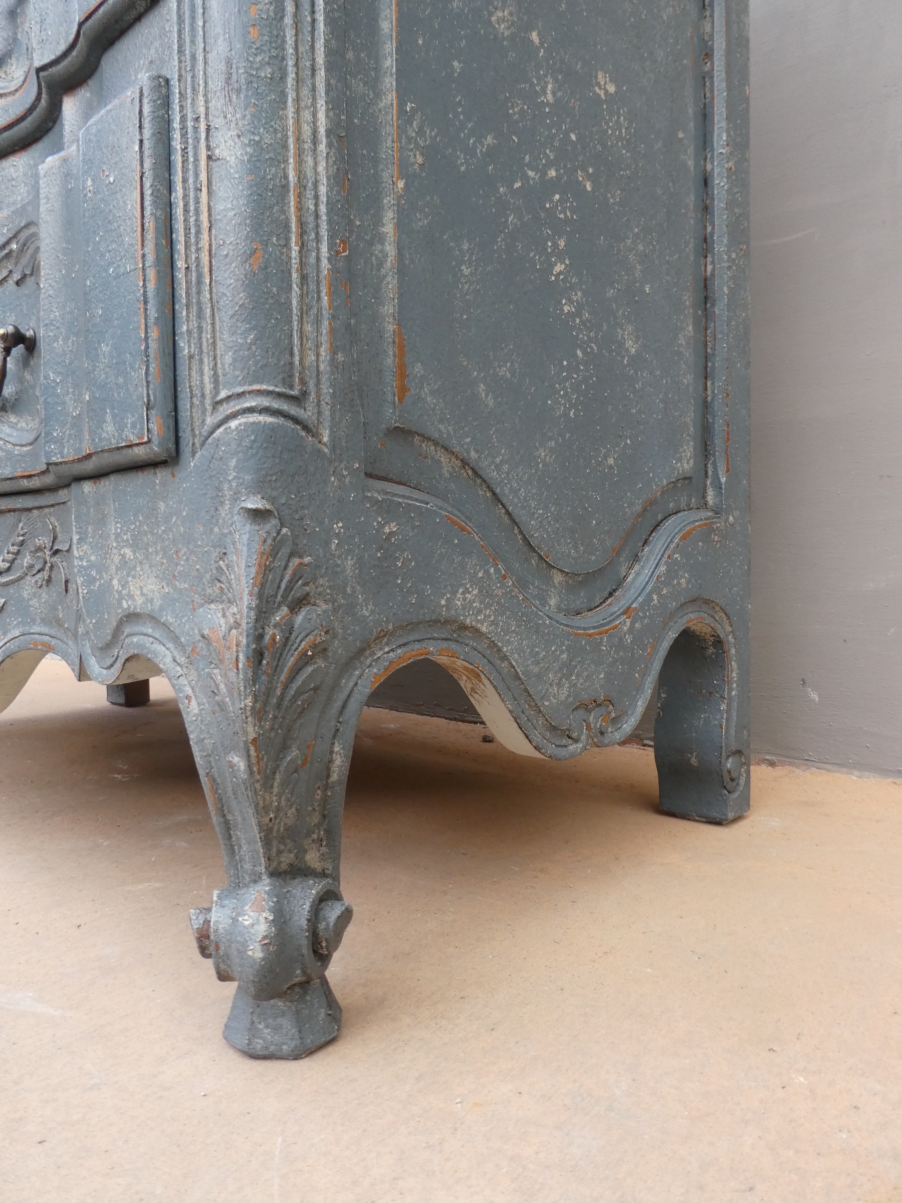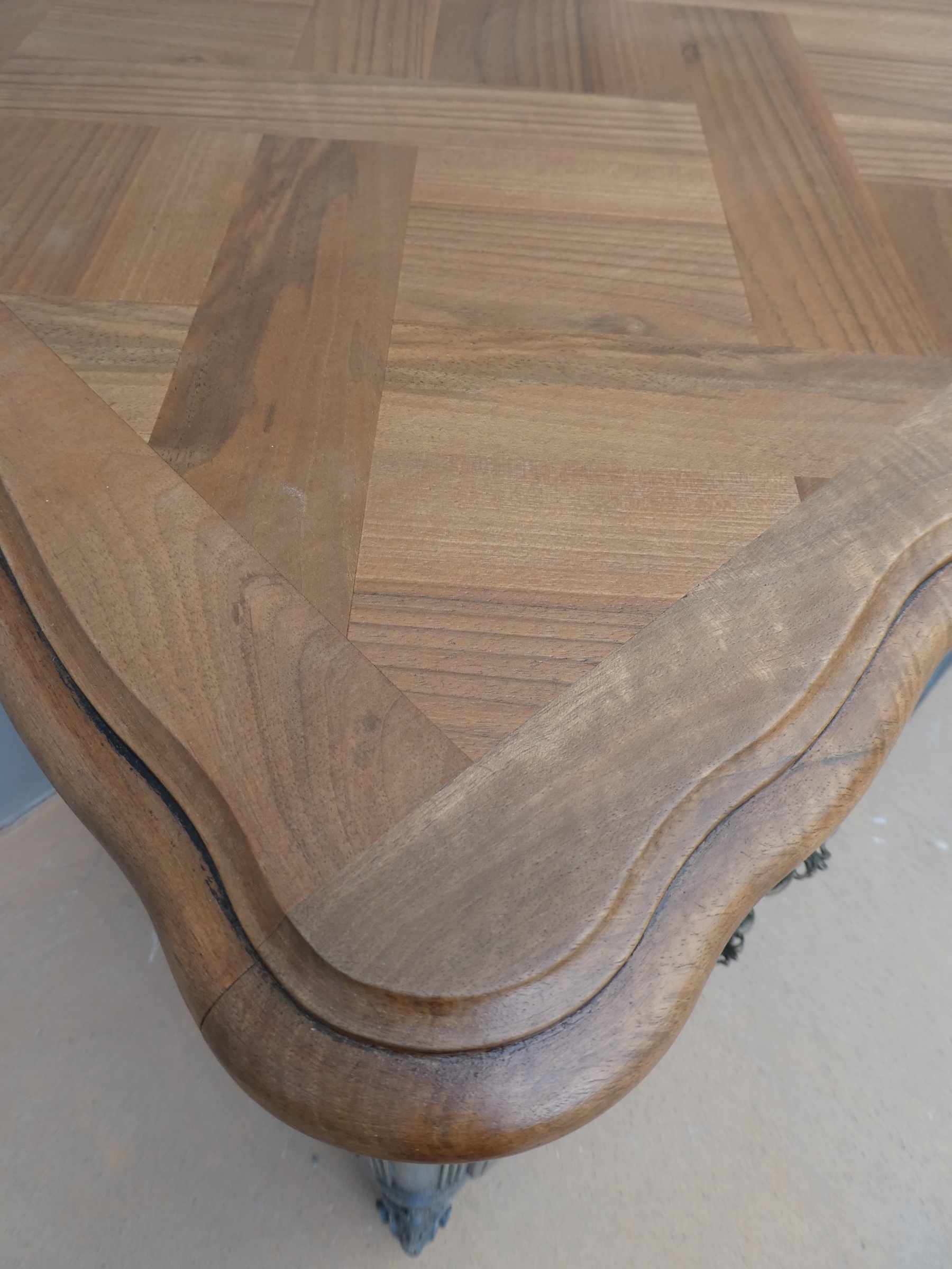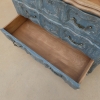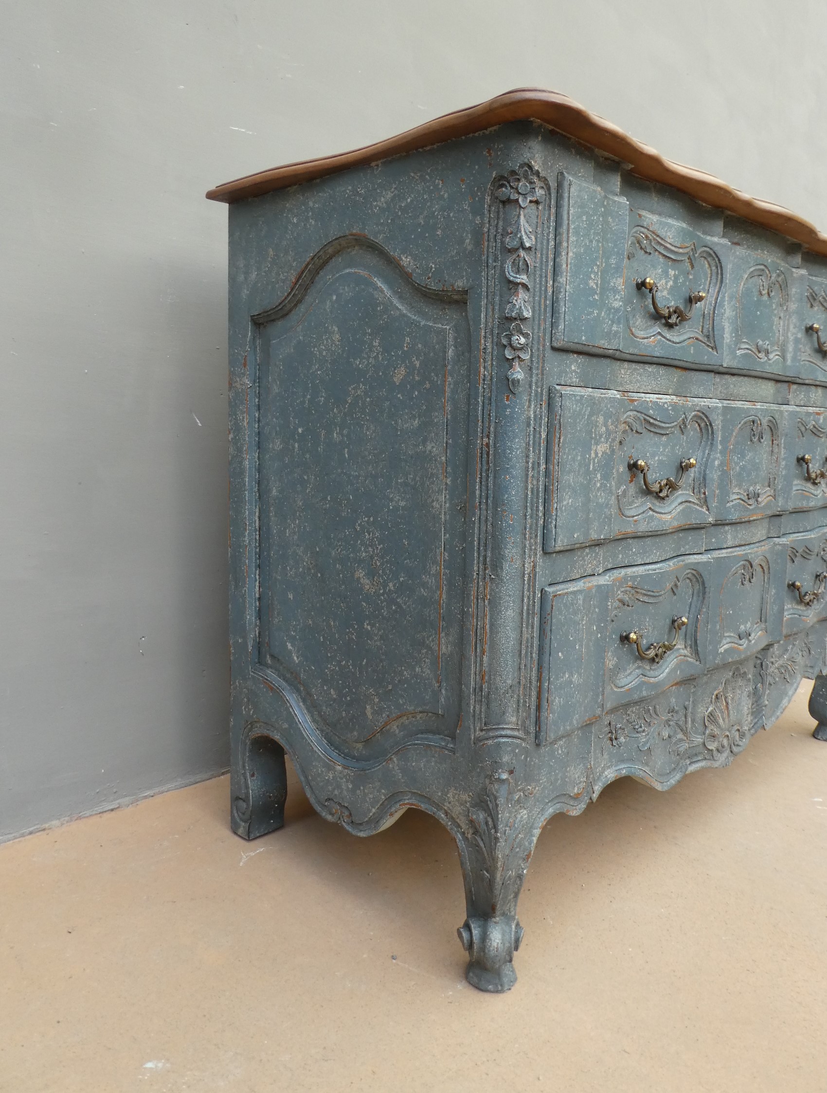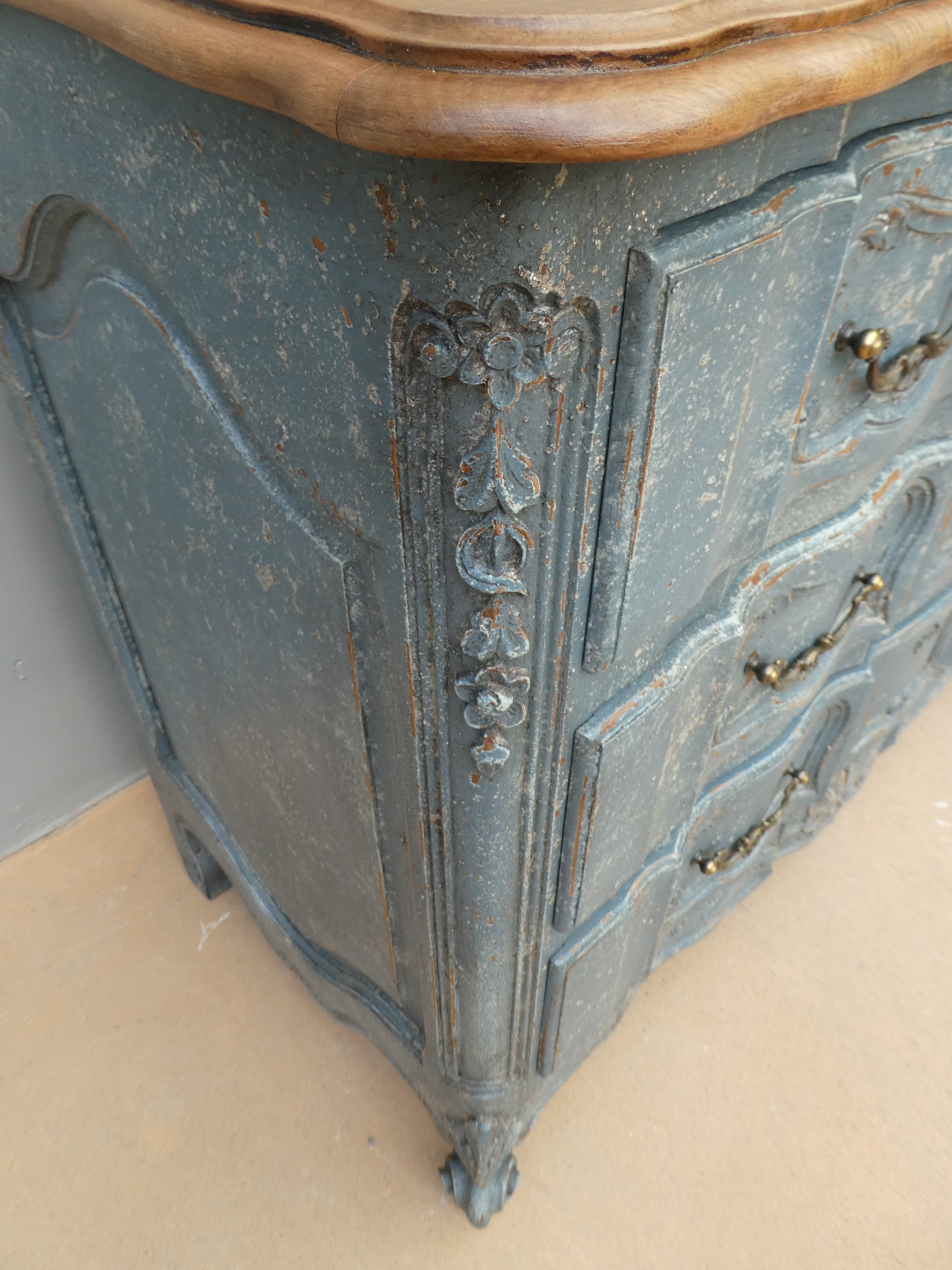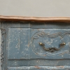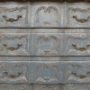 Comò cassettone dotato di tre cassetti frontali ed un piano d’appoggio parquettato in noce, laccato e rifinito con la tecnica “Shabby Chic”. La struttura si presenta elegante ed armoniosa, e vanta proporzioni sapientemente equilibrate. La ricerca di un decoro mirato si riflette, in particolar modo, sulla scelta d’impreziosire il corpo con delicati intagli, caratteristici del gusto provenzale. Epoca seconda metà ‘900.