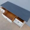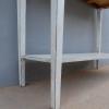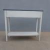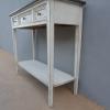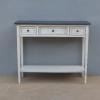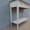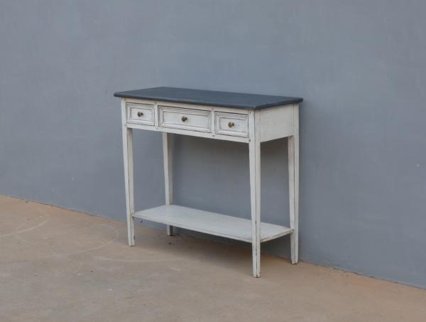 Console tavolino etager mobile da ingresso corredato da tre cassettini frontali ed un doppio piano d’appoggio, laccato e rifinito con la tecnica “Shabby Chic” Semplice e lineare nella linea, ciò che rende elegante ed originale questo mobiletto, oltre alle sue particolari dimensioni, è indubbiamente il contrasto creato dal colore chiaro utilizzato per il corpo, con il piano, laccato decisamente più scuro. Epoca seconda metà ‘900.