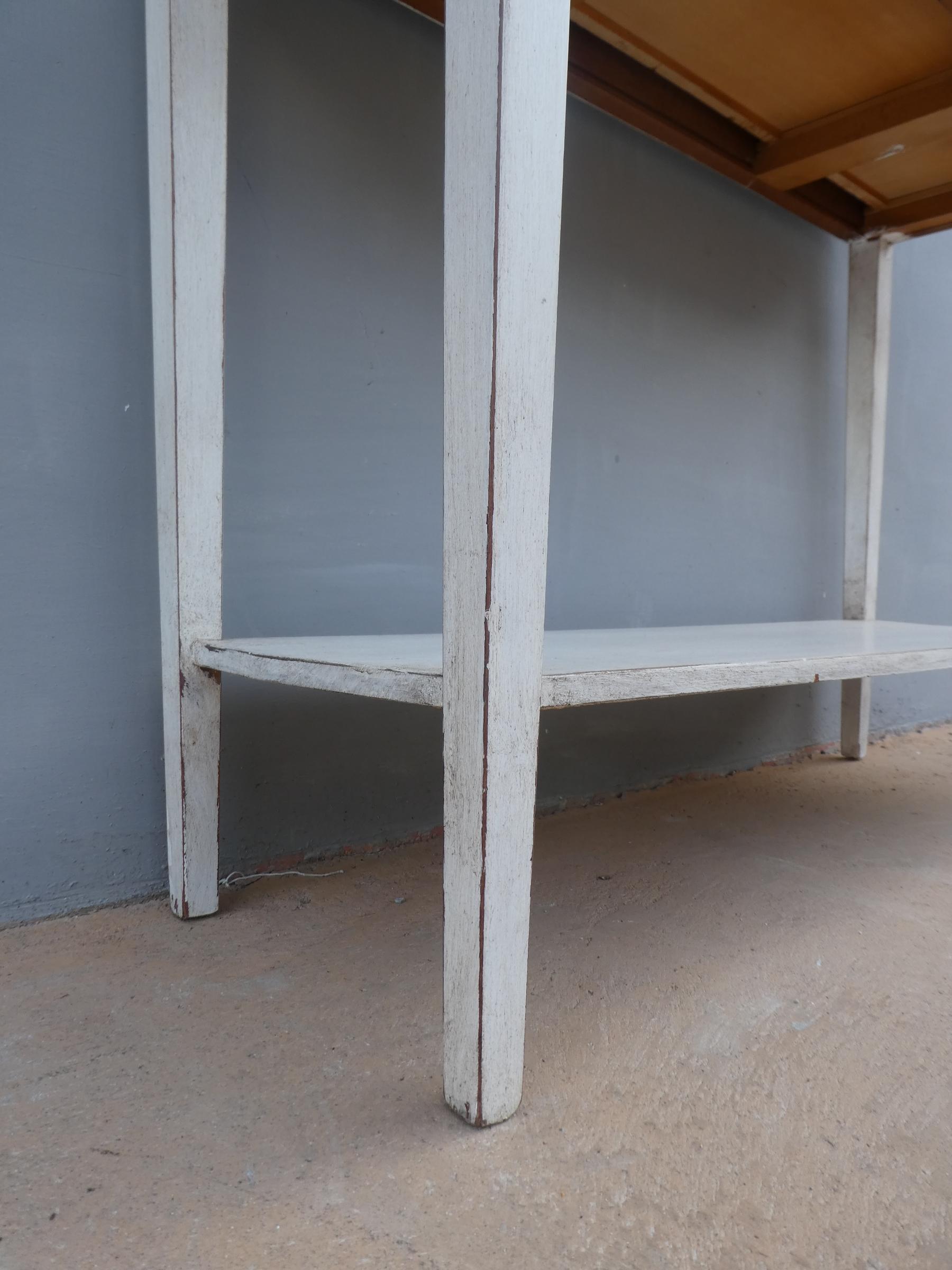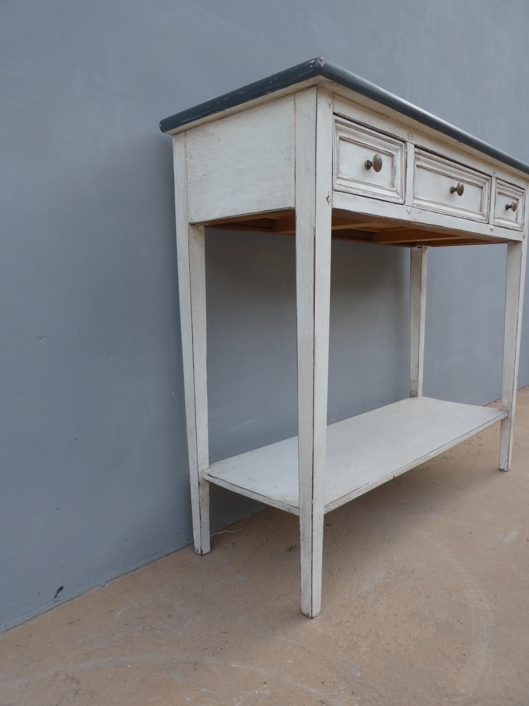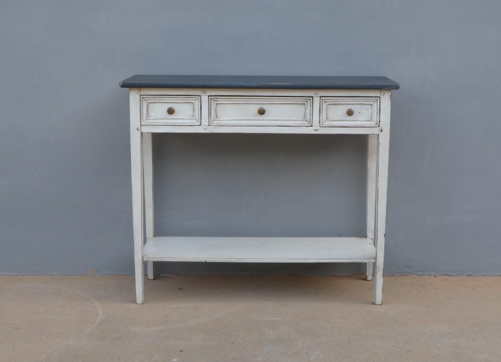Console tavolino etager mobile da ingresso corredato da tre cassettini frontali ed un doppio piano d’appoggio, laccato e rifinito con la tecnica “Shabby Chic” Semplice e lineare nella linea, ciò che rende elegante ed originale questo mobiletto, oltre alle sue particolari dimensioni, è indubbiamente il contrasto creato dal colore chiaro utilizzato per il corpo, con il piano, laccato decisamente più scuro. Epoca seconda metà ‘900.