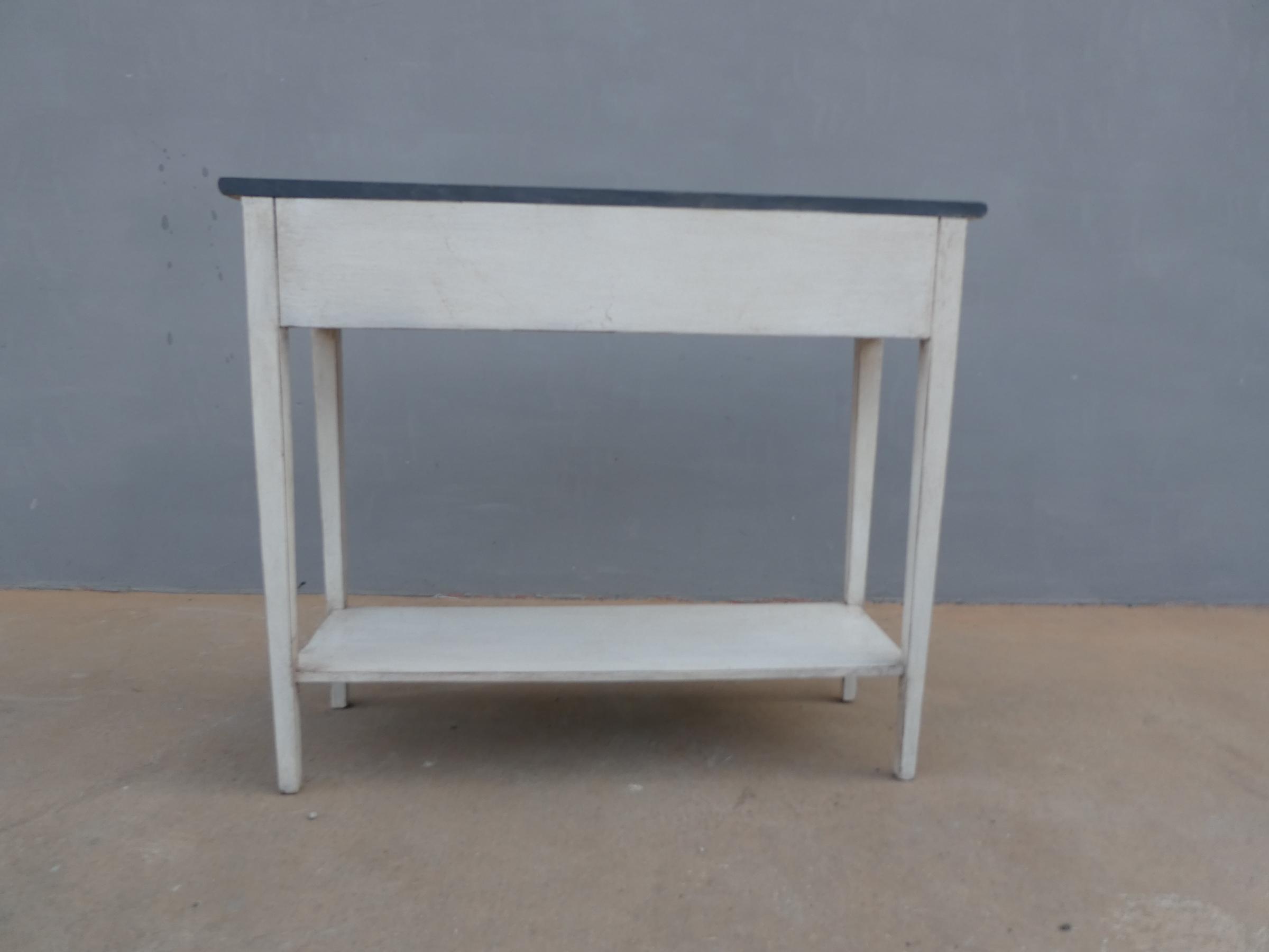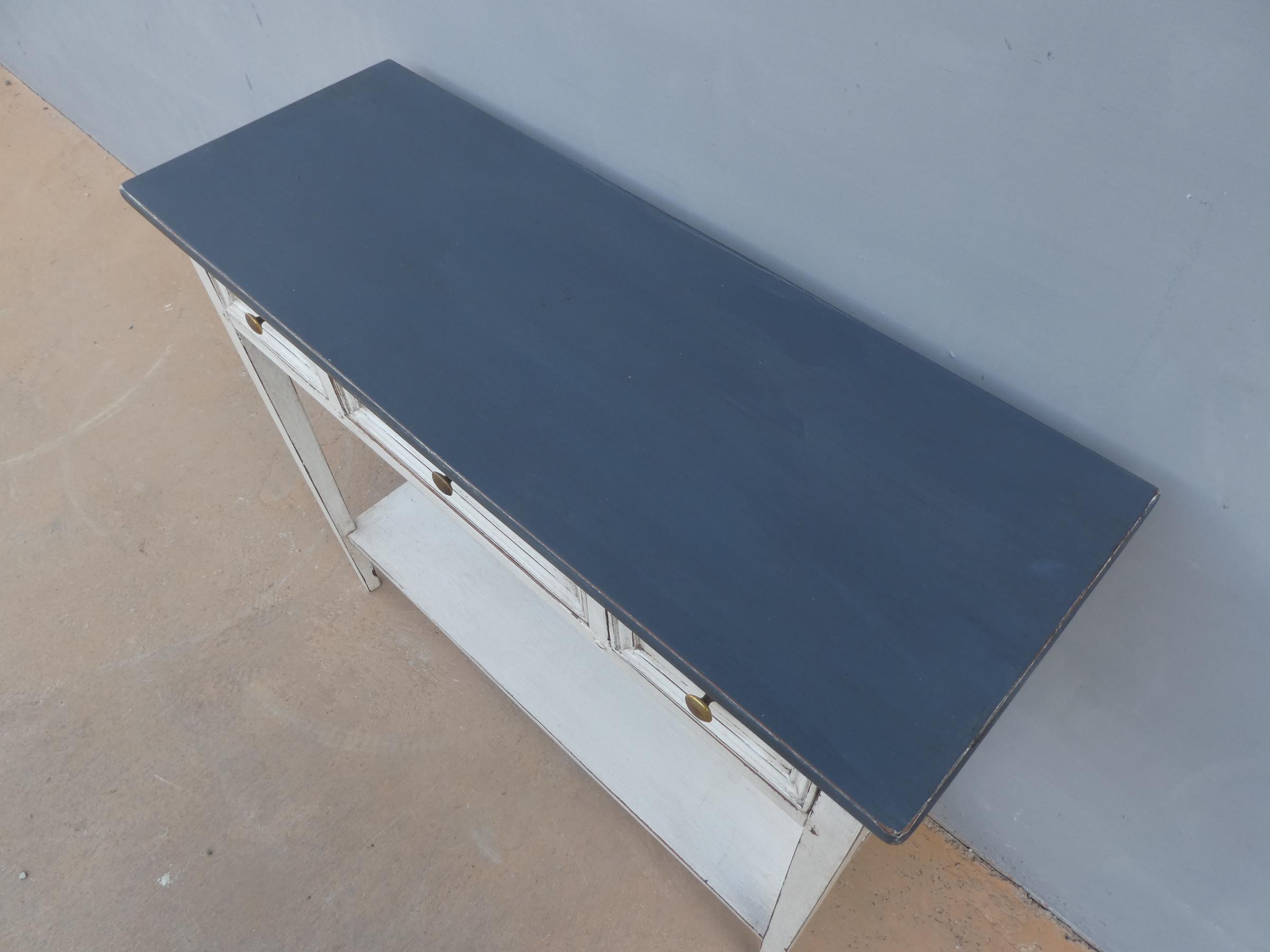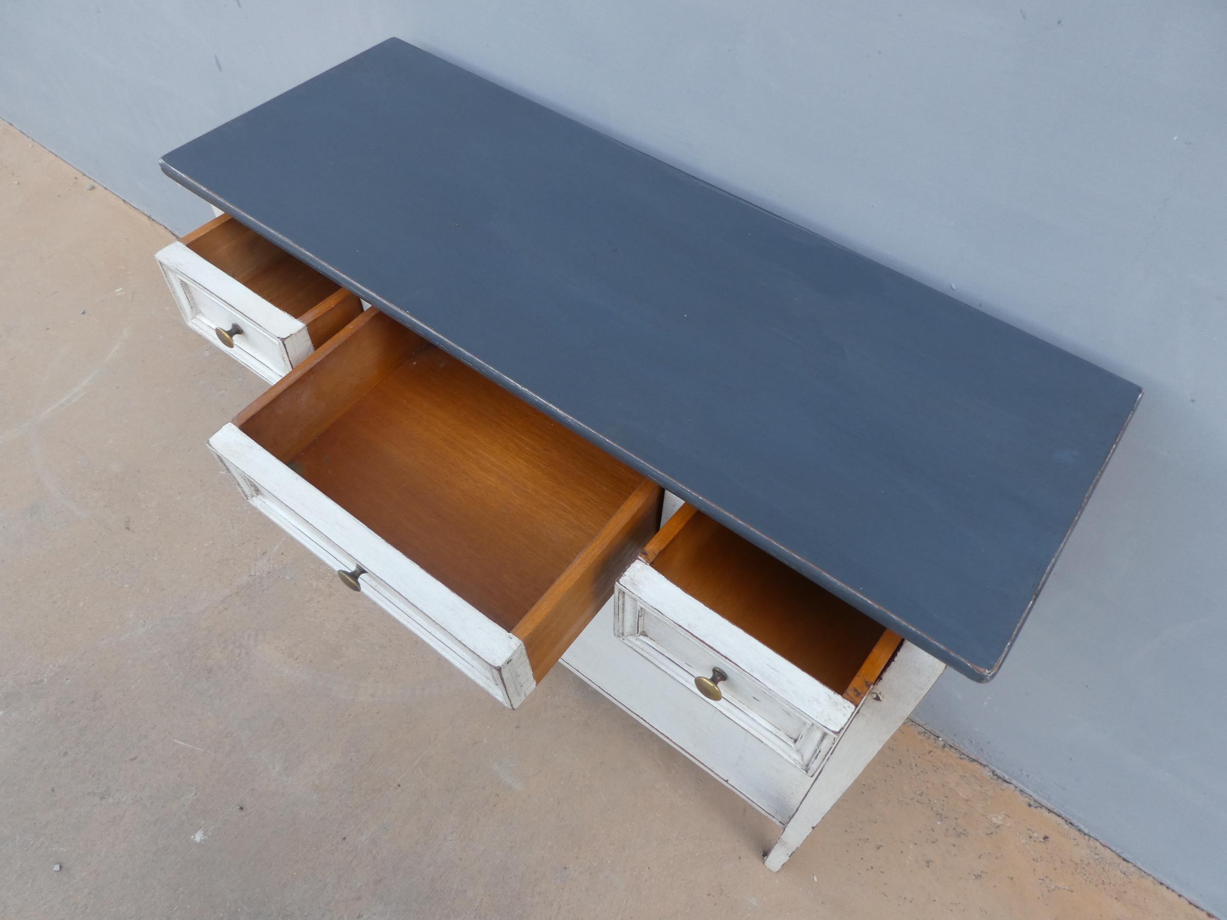 Console tavolino etager mobile da ingresso corredato da tre cassettini frontali ed un doppio piano d’appoggio, laccato e rifinito con la tecnica “Shabby Chic” Semplice e lineare nella linea, ciò che rende elegante ed originale questo mobiletto, oltre alle sue particolari dimensioni, è indubbiamente il contrasto creato dal colore chiaro utilizzato per il corpo, con il piano, laccato decisamente più scuro. Epoca seconda metà ‘900.