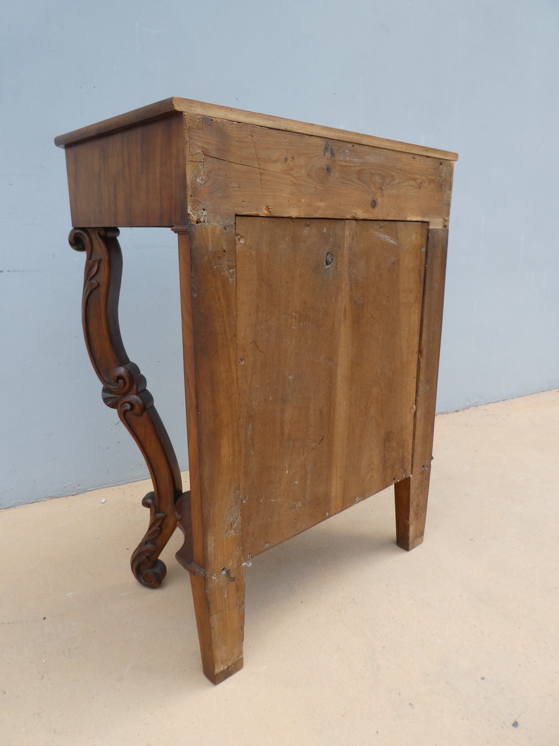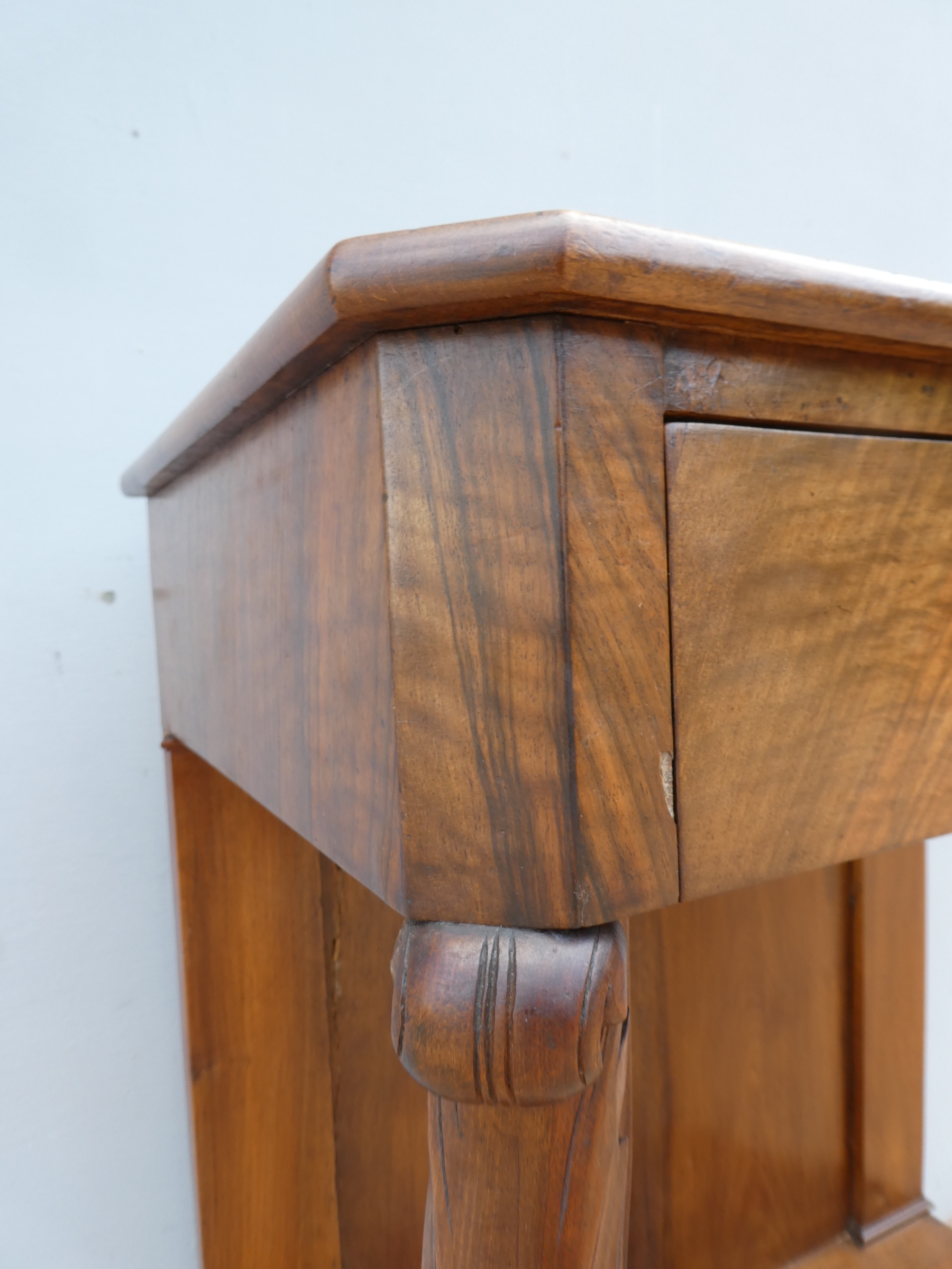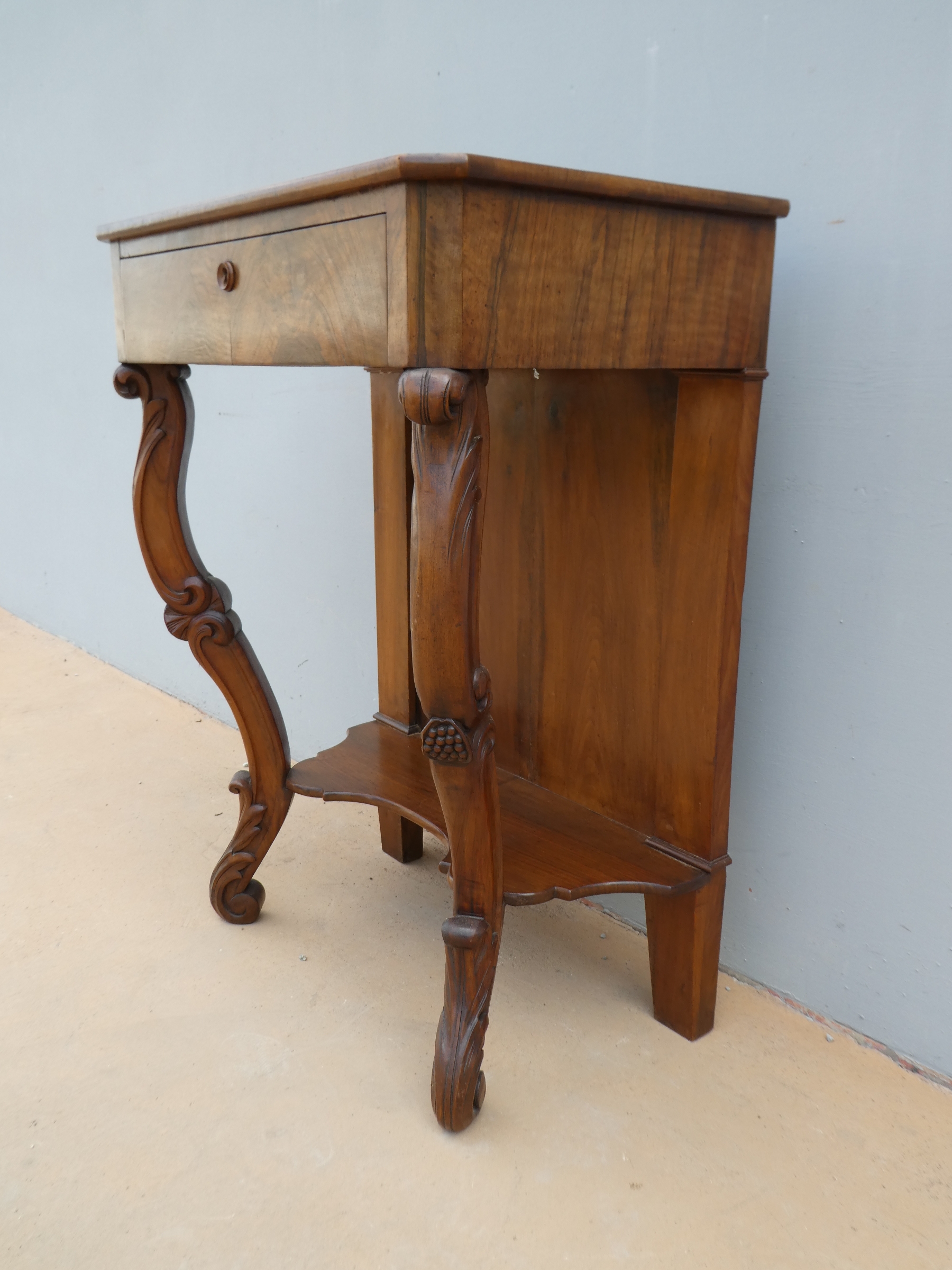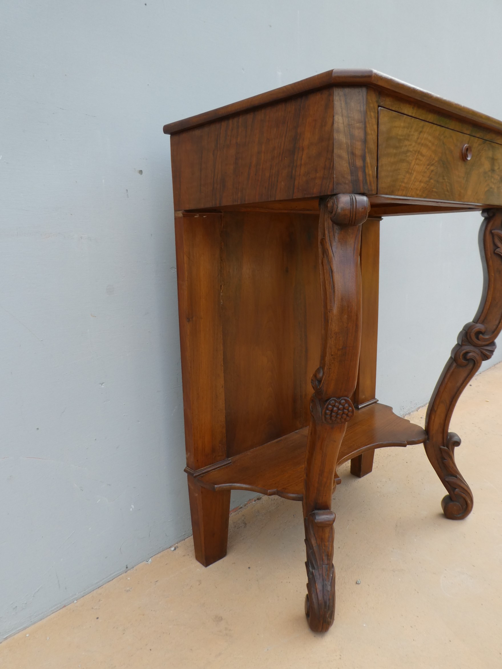 Console mobiletto da ingresso Carlo X con piano d’appoggio in legno, dotato di un cassetto frontale ed appartenente d’epoca alla seconda metà dell’800. La struttura si presenta semplice ed armoniosa, e vanta proporzioni contenute e sapientemente equilibrate. La ricerca di un decoro mirato si riflette anche sulla scelta d’utilizzare la noce; un’essenza nota e delicata, caratterizzata da fitte venature di tonalità più scura. Necessita di alcuni interventi di restauro; presenta fori di tarlo (principalmente sulla schiena).