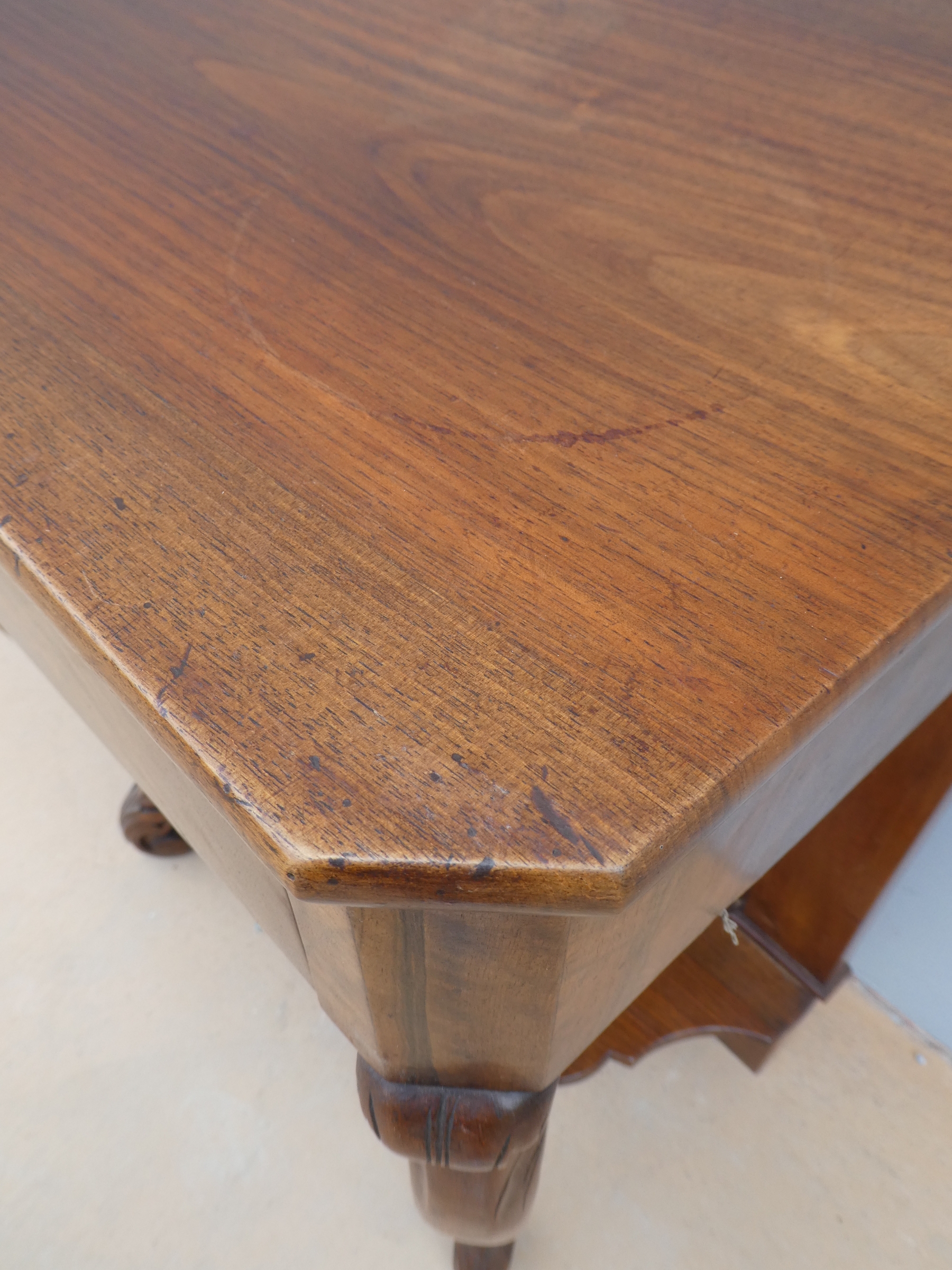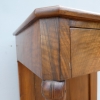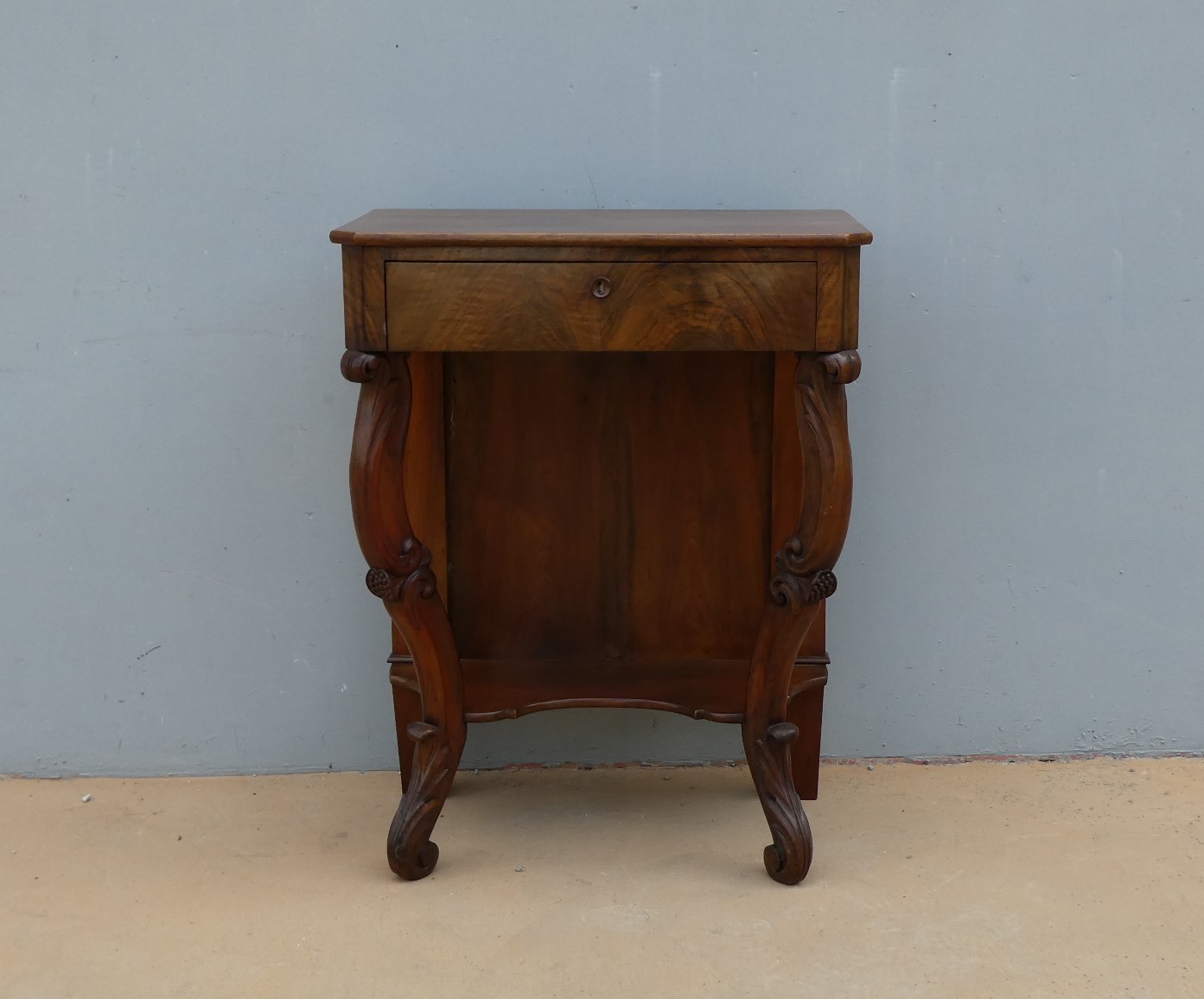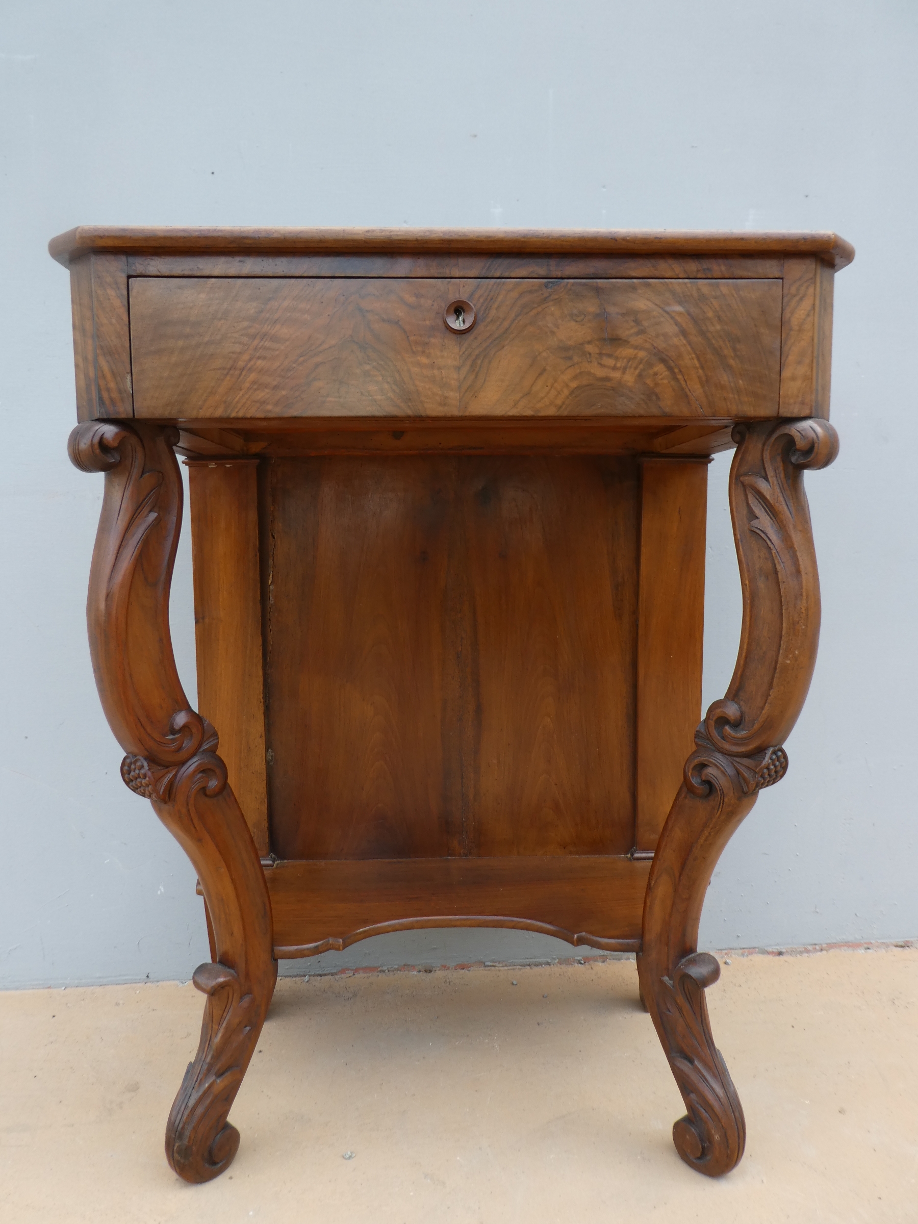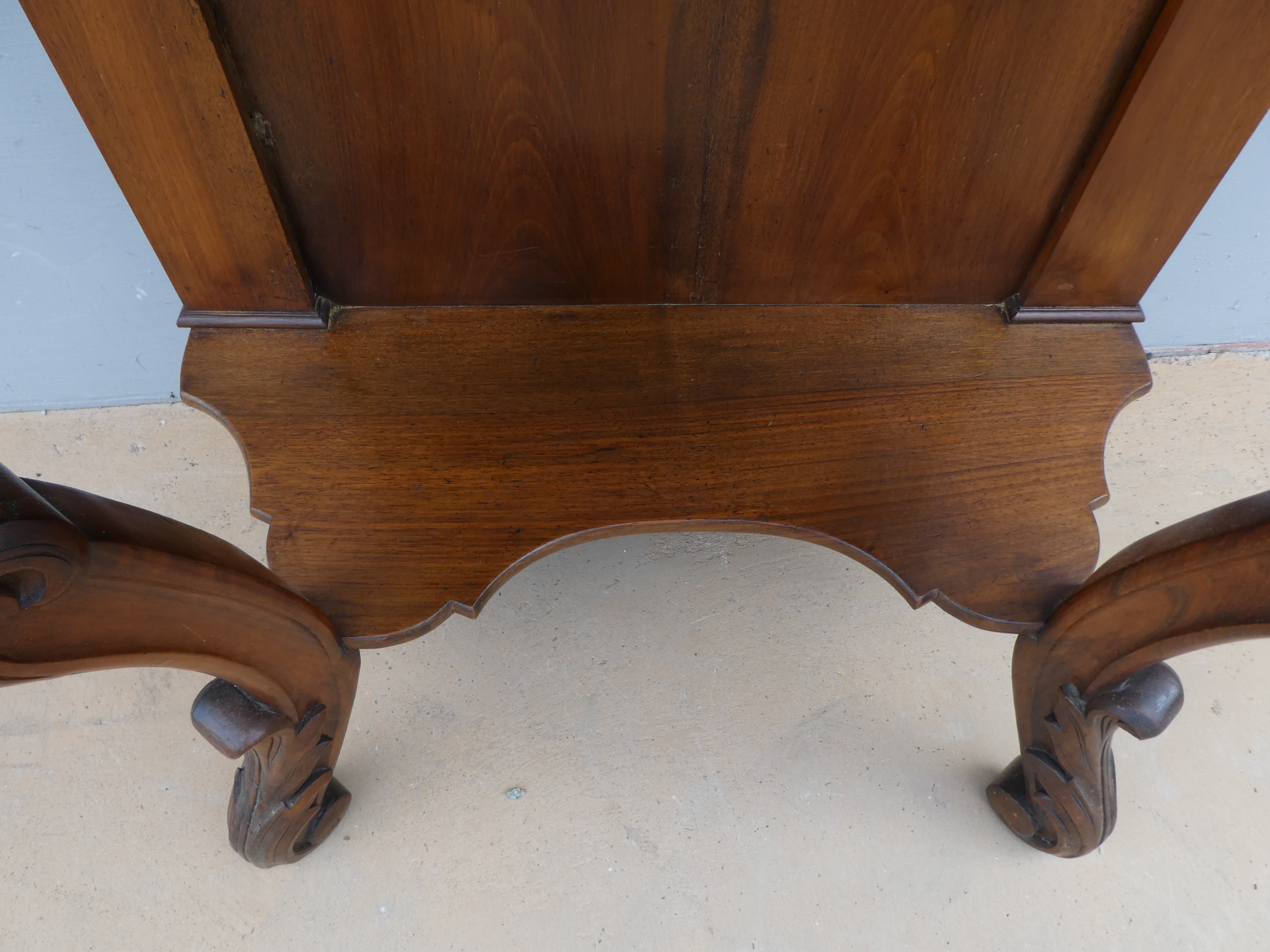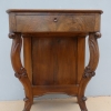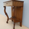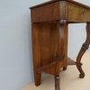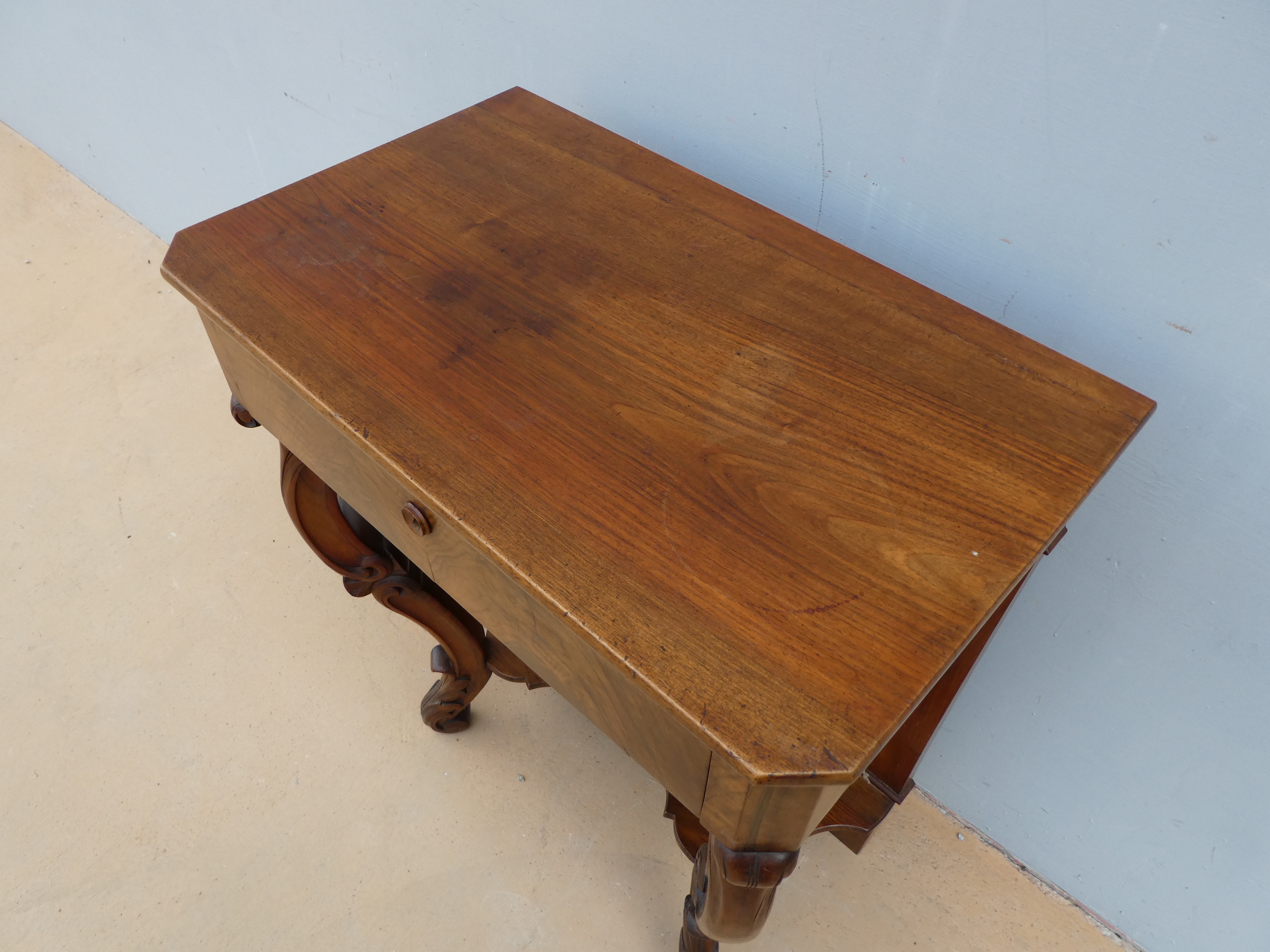 Console mobiletto da ingresso Carlo X con piano d’appoggio in legno, dotato di un cassetto frontale ed appartenente d’epoca alla seconda metà dell’800. La struttura si presenta semplice ed armoniosa, e vanta proporzioni contenute e sapientemente equilibrate. La ricerca di un decoro mirato si riflette anche sulla scelta d’utilizzare la noce; un’essenza nota e delicata, caratterizzata da fitte venature di tonalità più scura. Necessita di alcuni interventi di restauro; presenta fori di tarlo (principalmente sulla schiena).