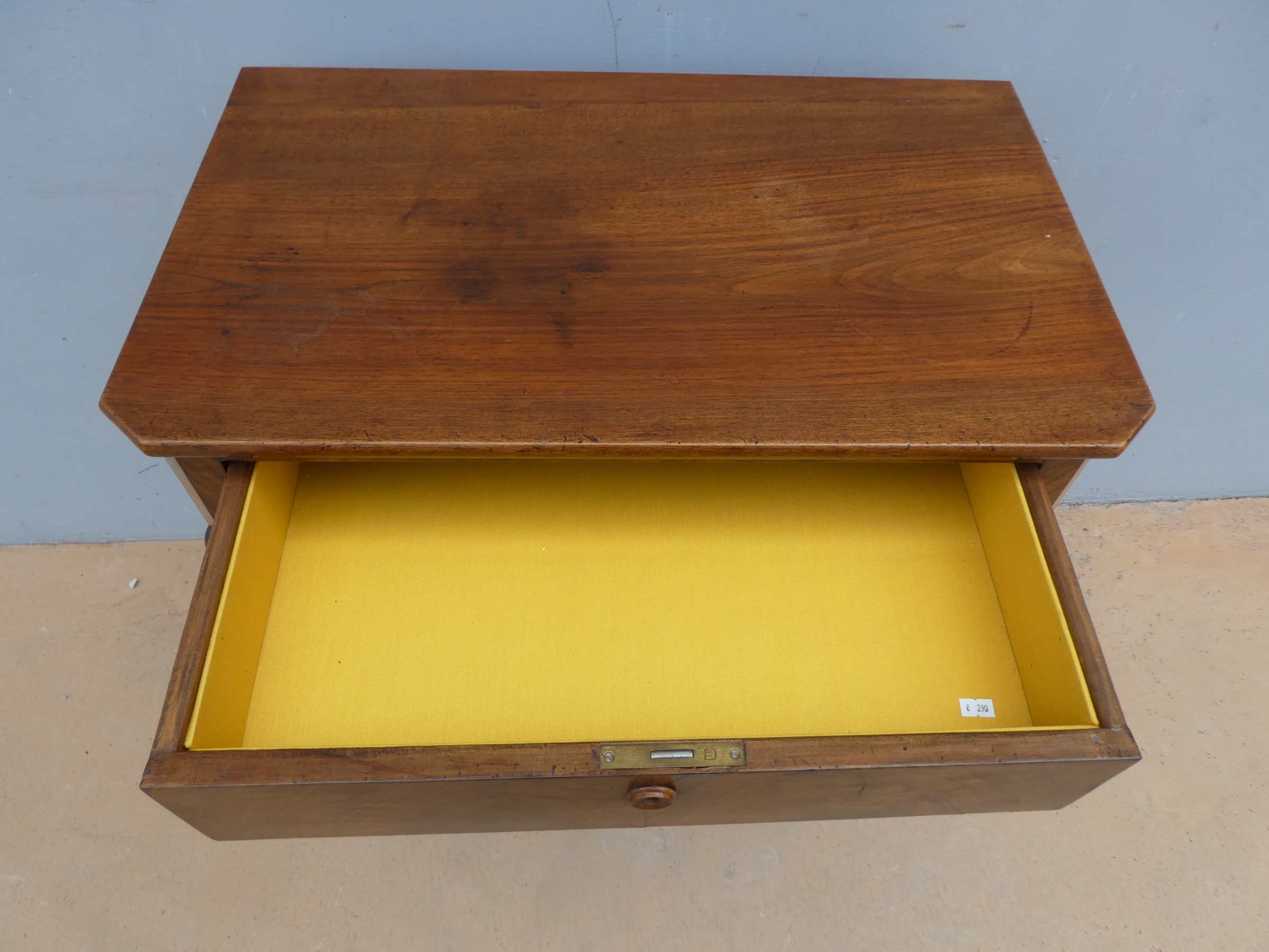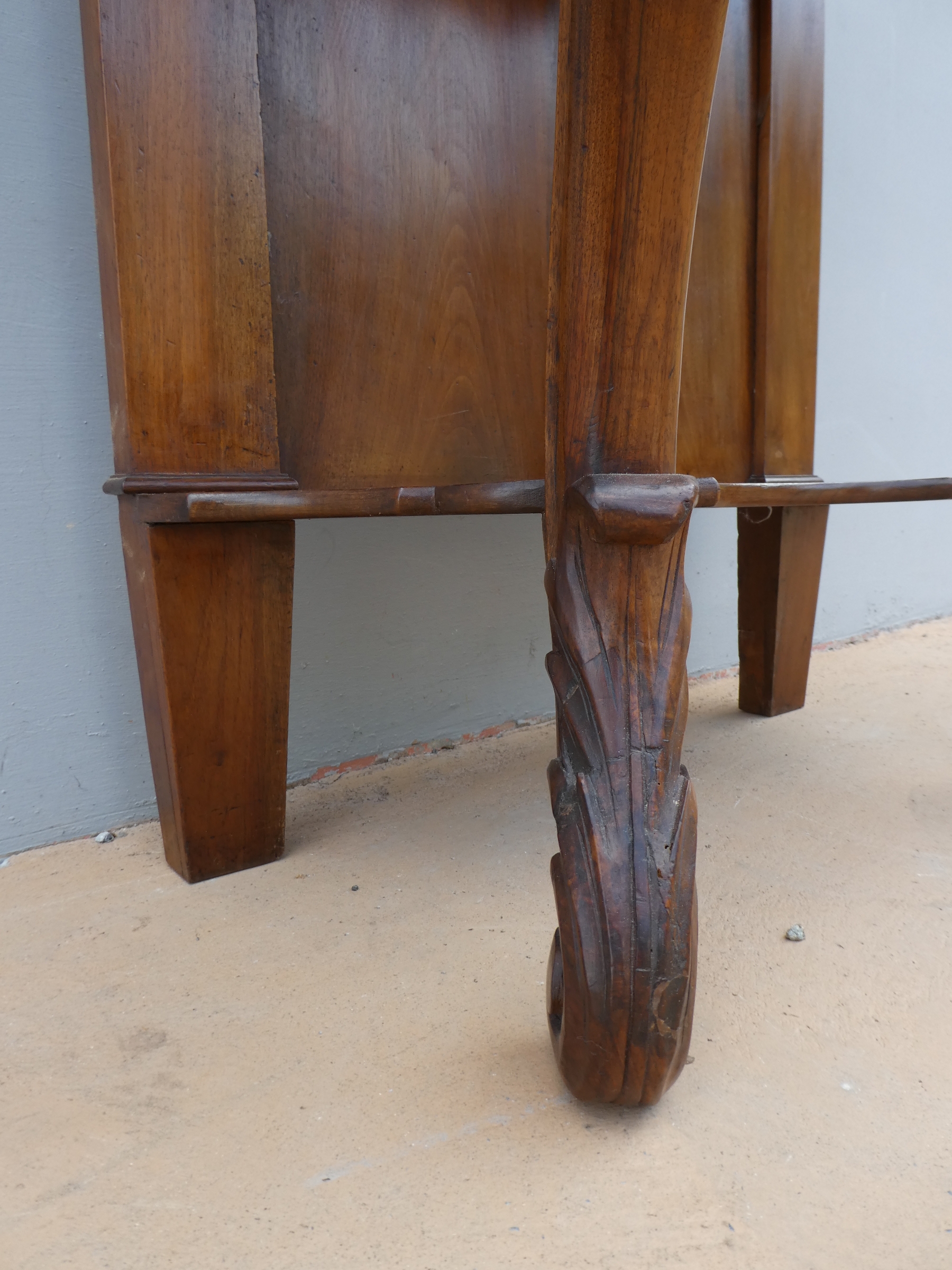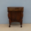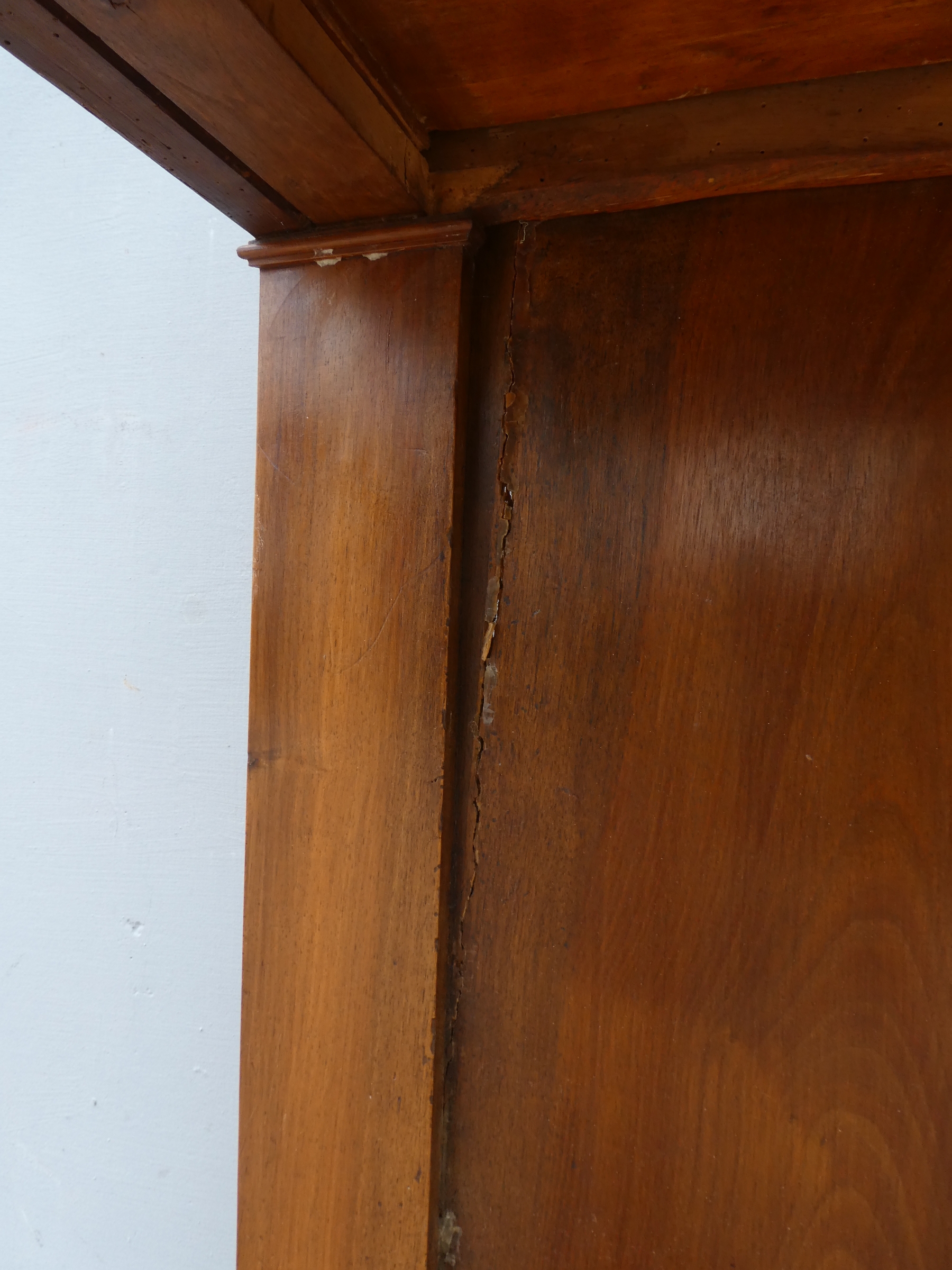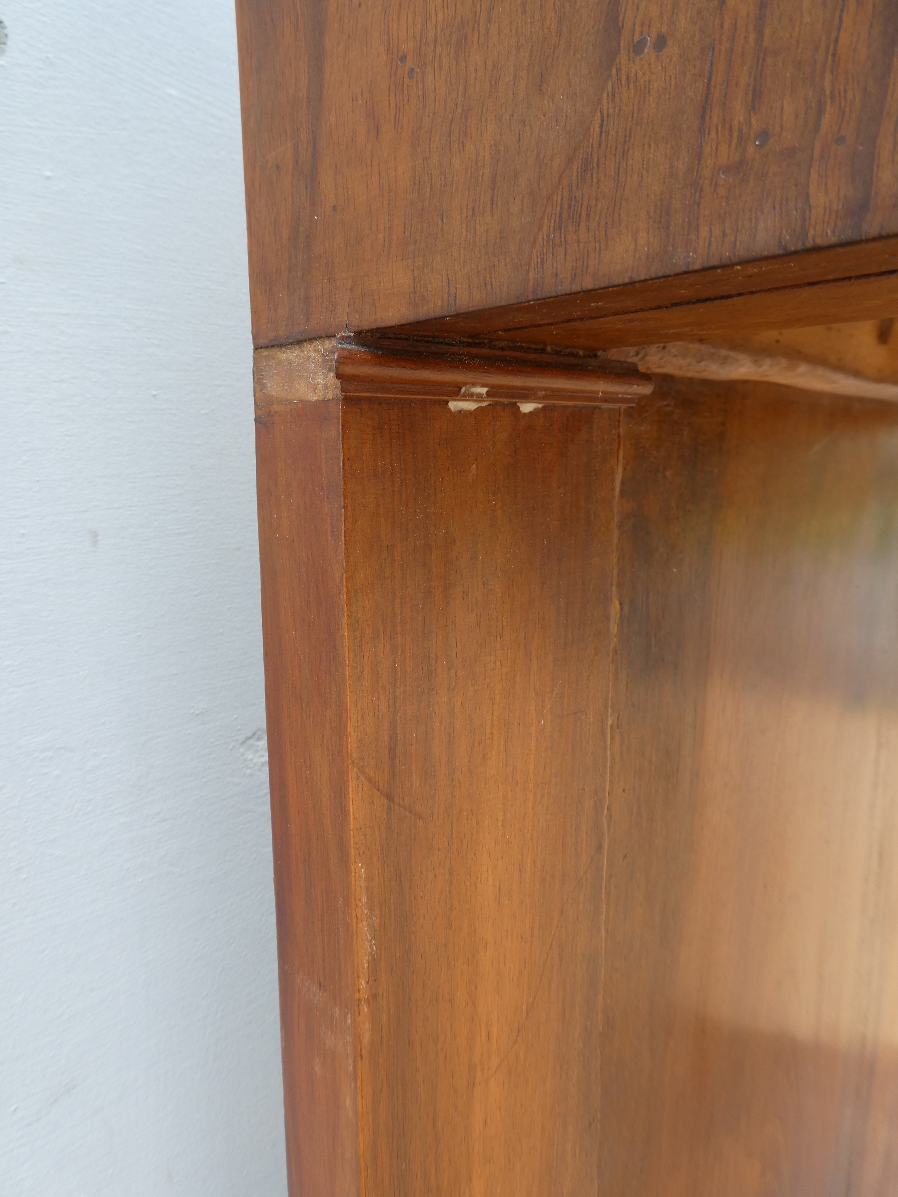 Console mobiletto da ingresso Carlo X con piano d’appoggio in legno, dotato di un cassetto frontale ed appartenente d’epoca alla seconda metà dell’800. La struttura si presenta semplice ed armoniosa, e vanta proporzioni contenute e sapientemente equilibrate. La ricerca di un decoro mirato si riflette anche sulla scelta d’utilizzare la noce; un’essenza nota e delicata, caratterizzata da fitte venature di tonalità più scura. Necessita di alcuni interventi di restauro; presenta fori di tarlo (principalmente sulla schiena).