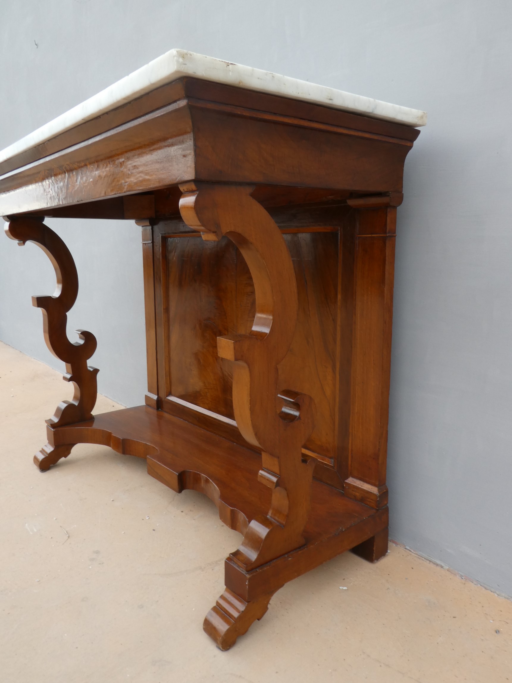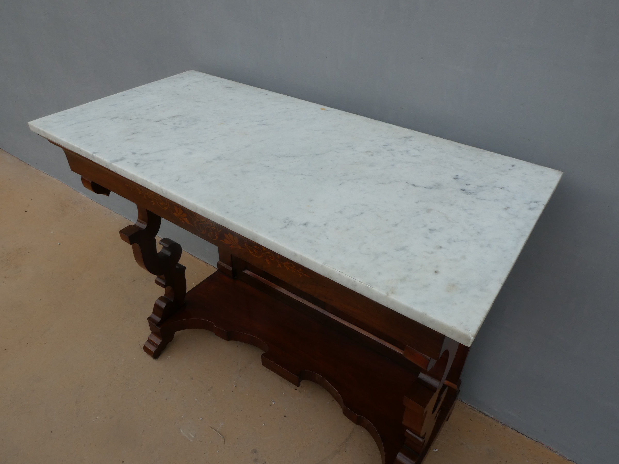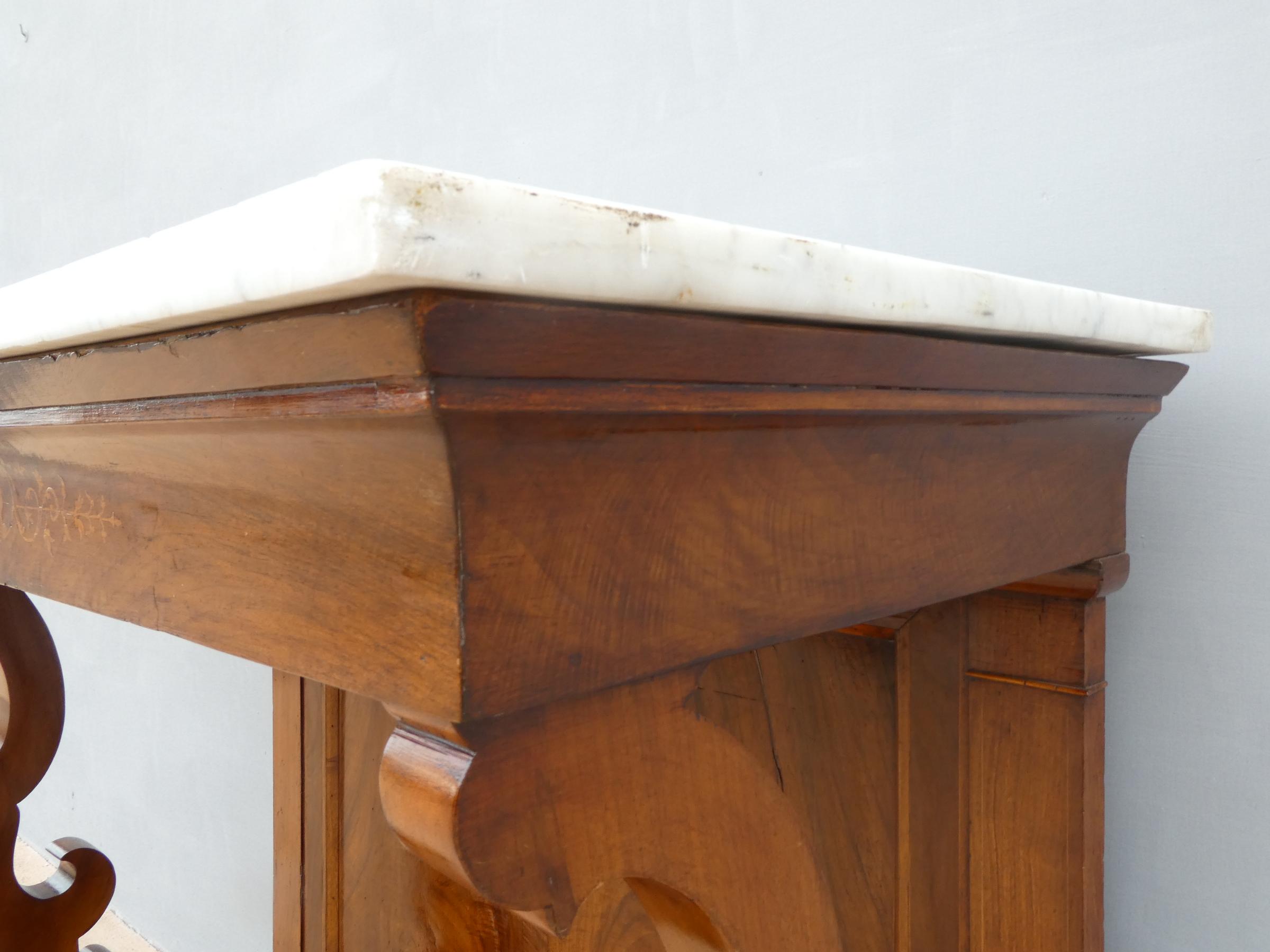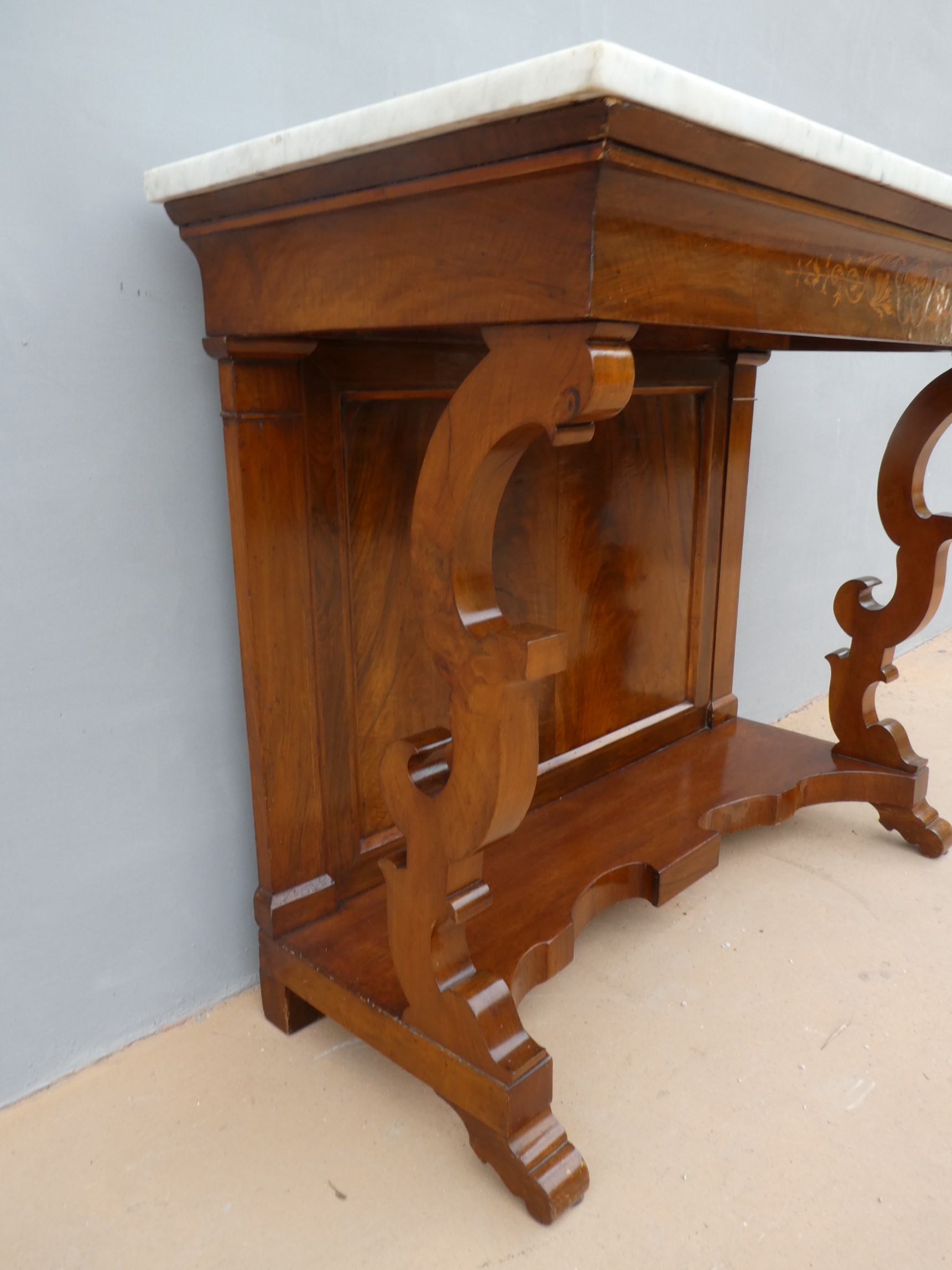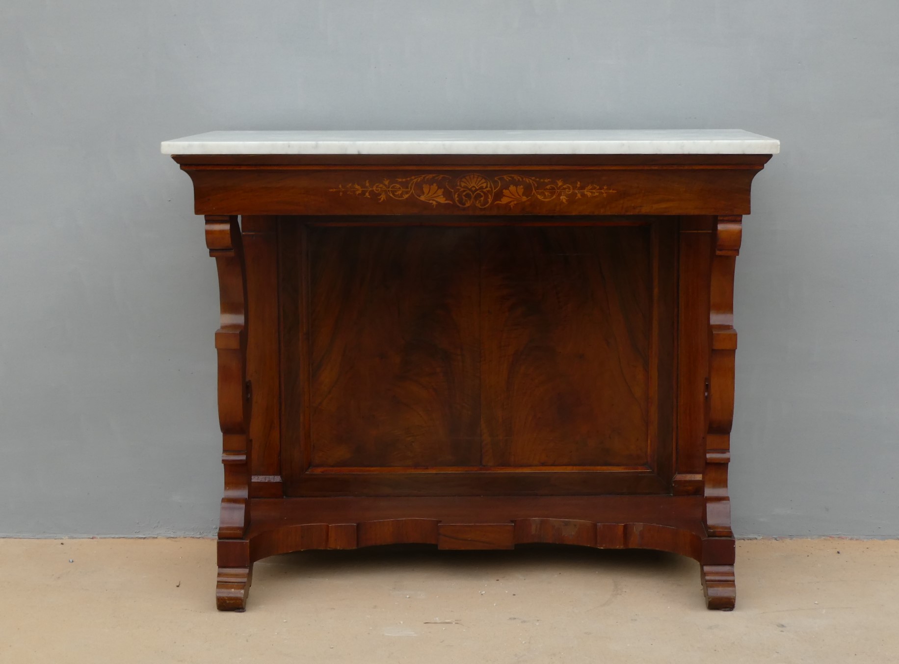 Console mobile d’appoggio ligure st.Carlo X, dotata di un piano d’appoggio in marmo ed appartenente d’epoca alla seconda metà dell’800. La struttura si presenta solida ed armoniosa, e vanta proporzioni sapientemente equilibrate. La ricerca di un decoro mirato si riflette anche sulla scelta d’impreziosire il corpo con delicati intarsi, che spiccano contrastanti sulla raffinata superficie in noce che fa da sfondo. Necessita di leggeri interventi di restauro.